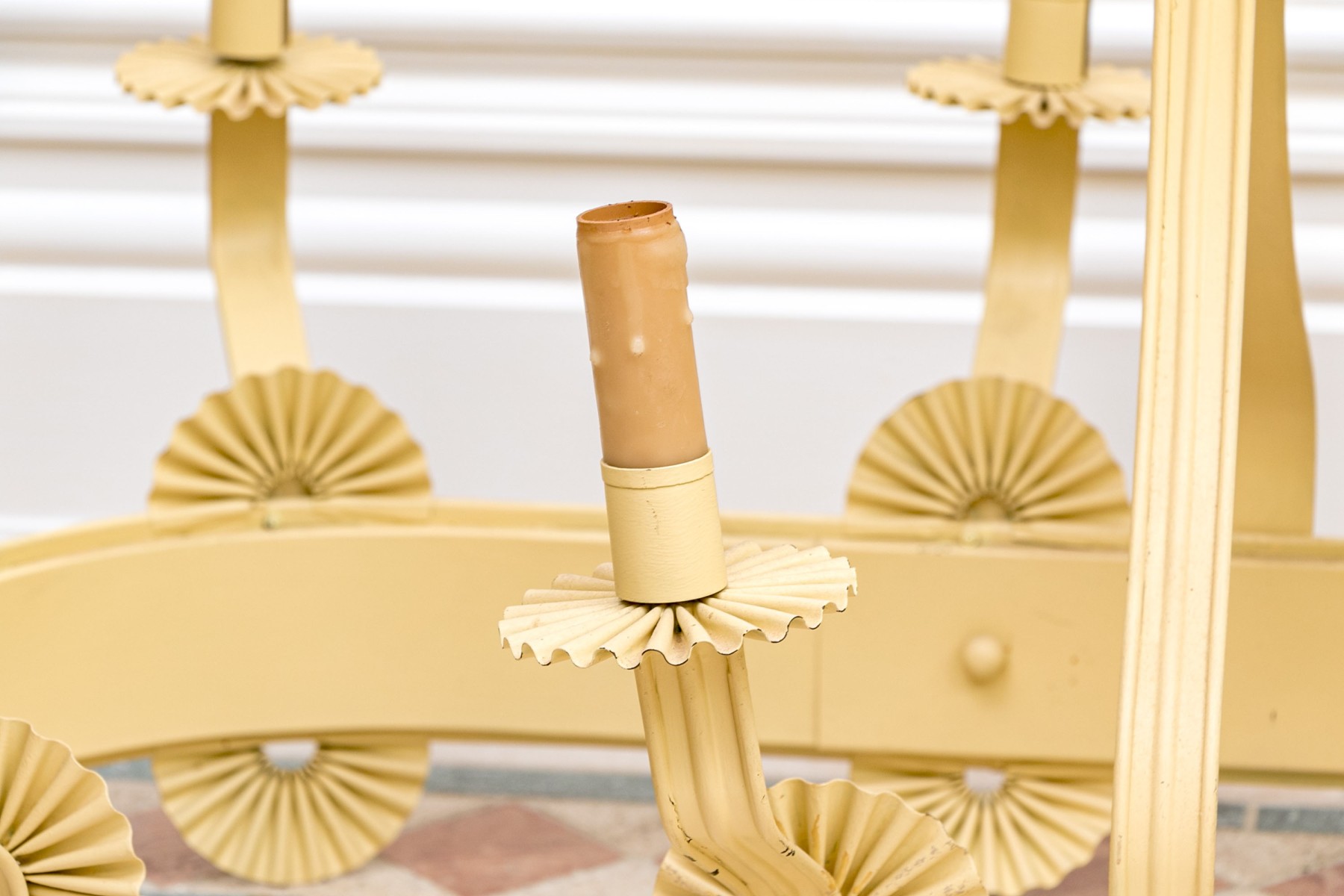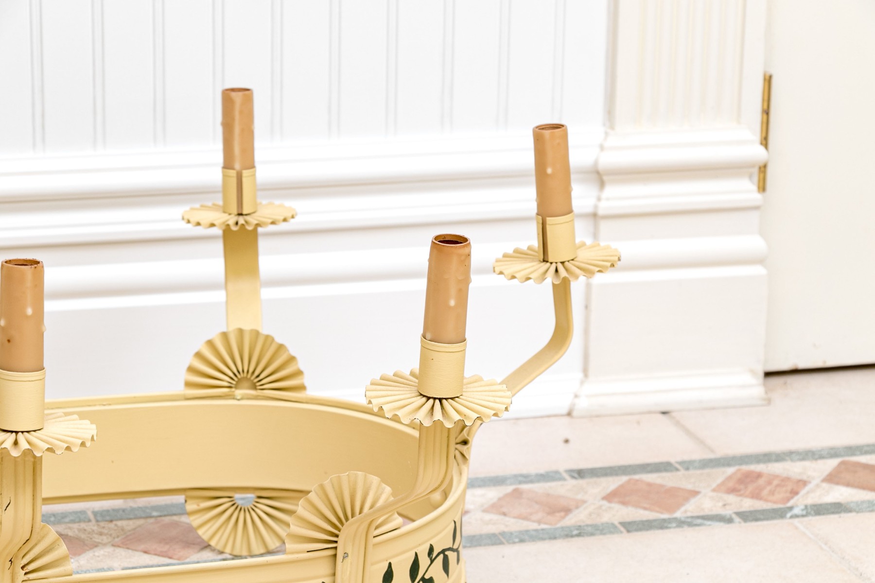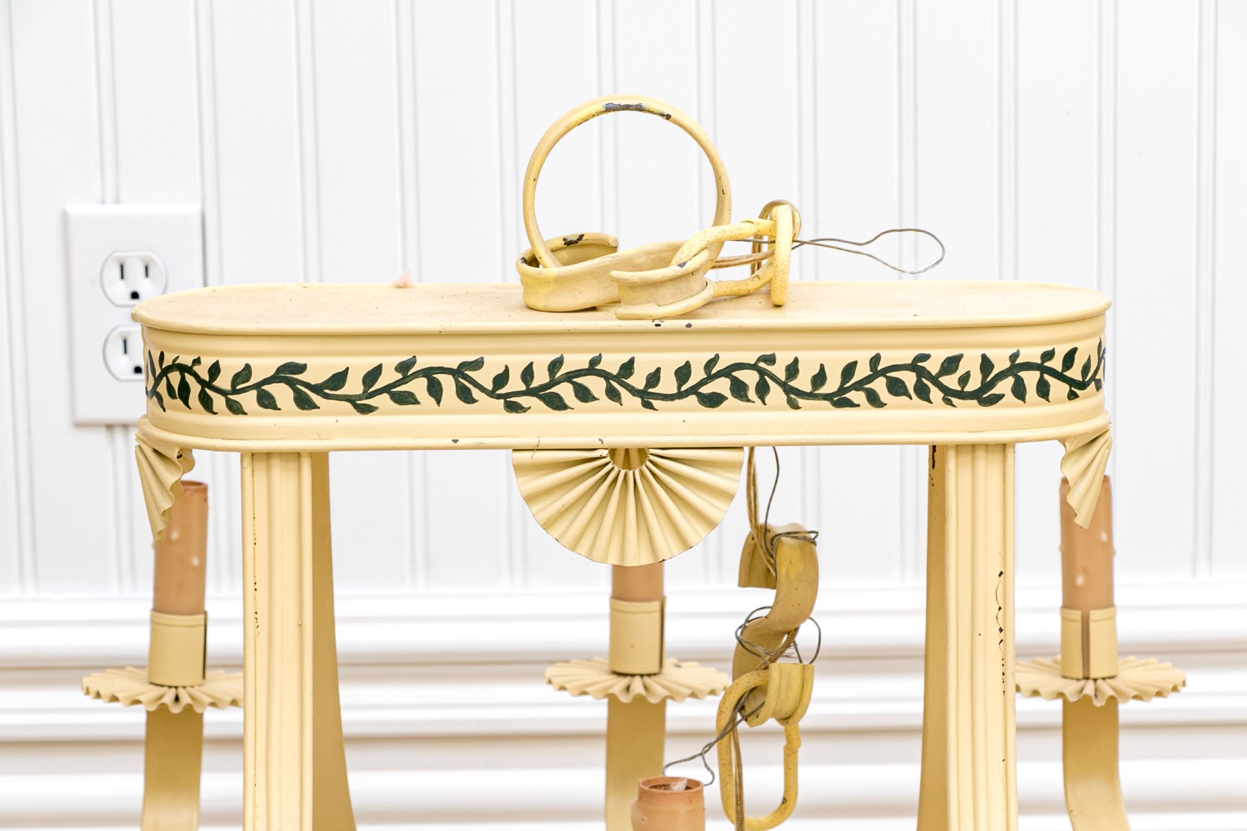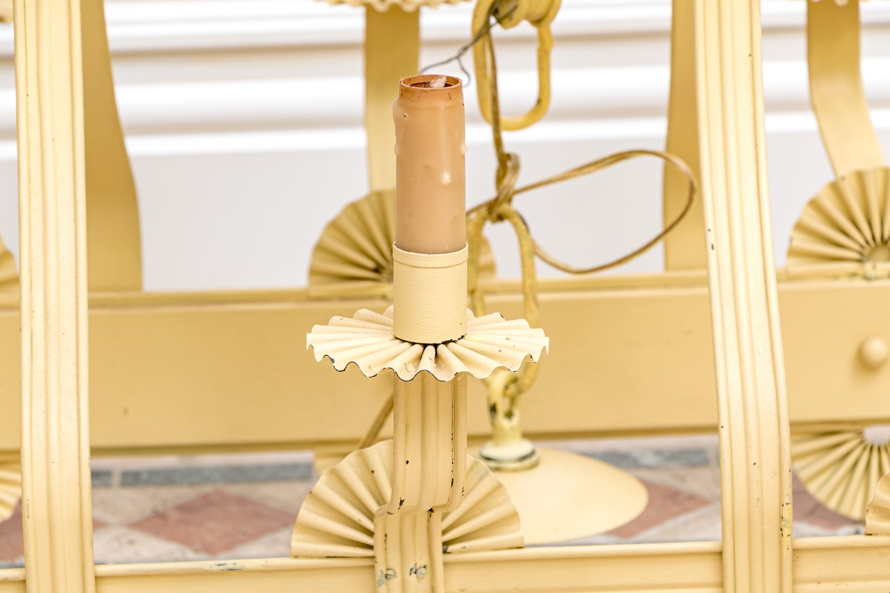 Condition: The chandelier exhibits signs of wear, with paint peeling, some losses, and a charming patina