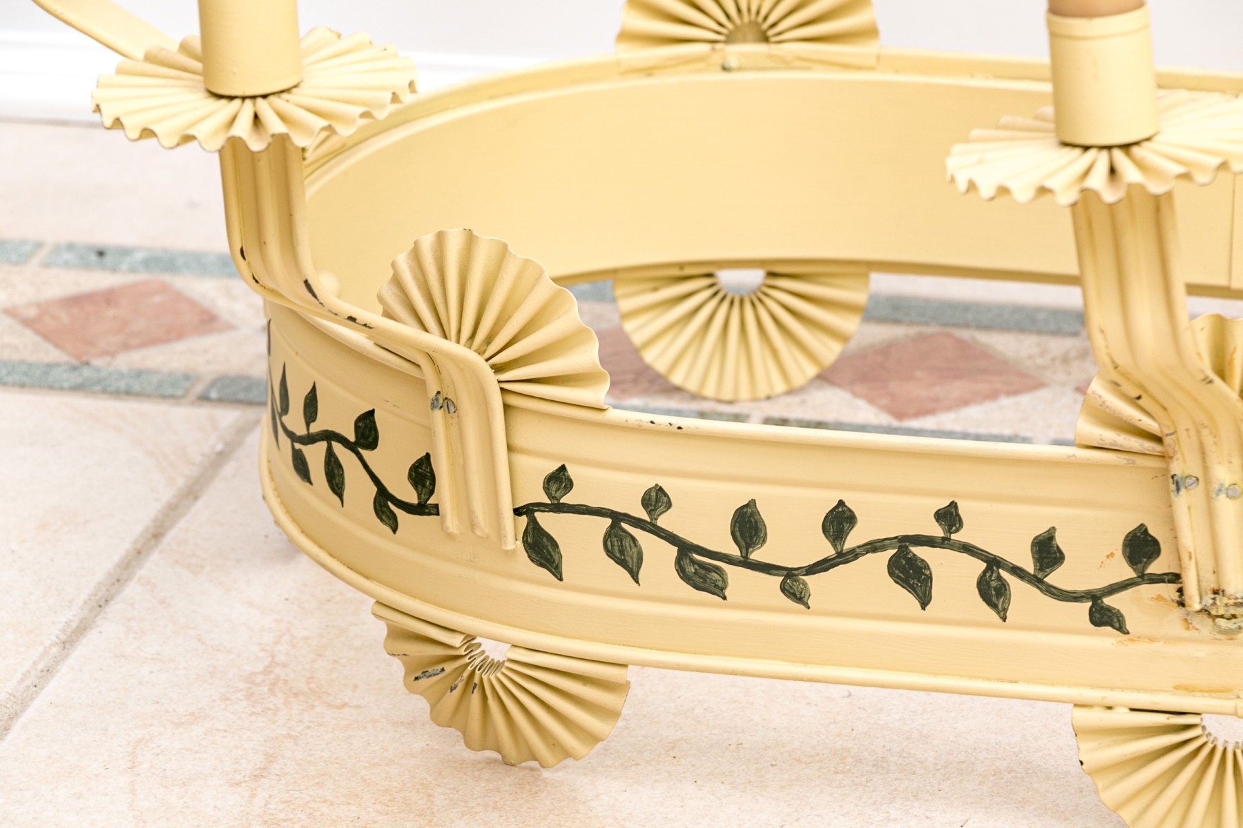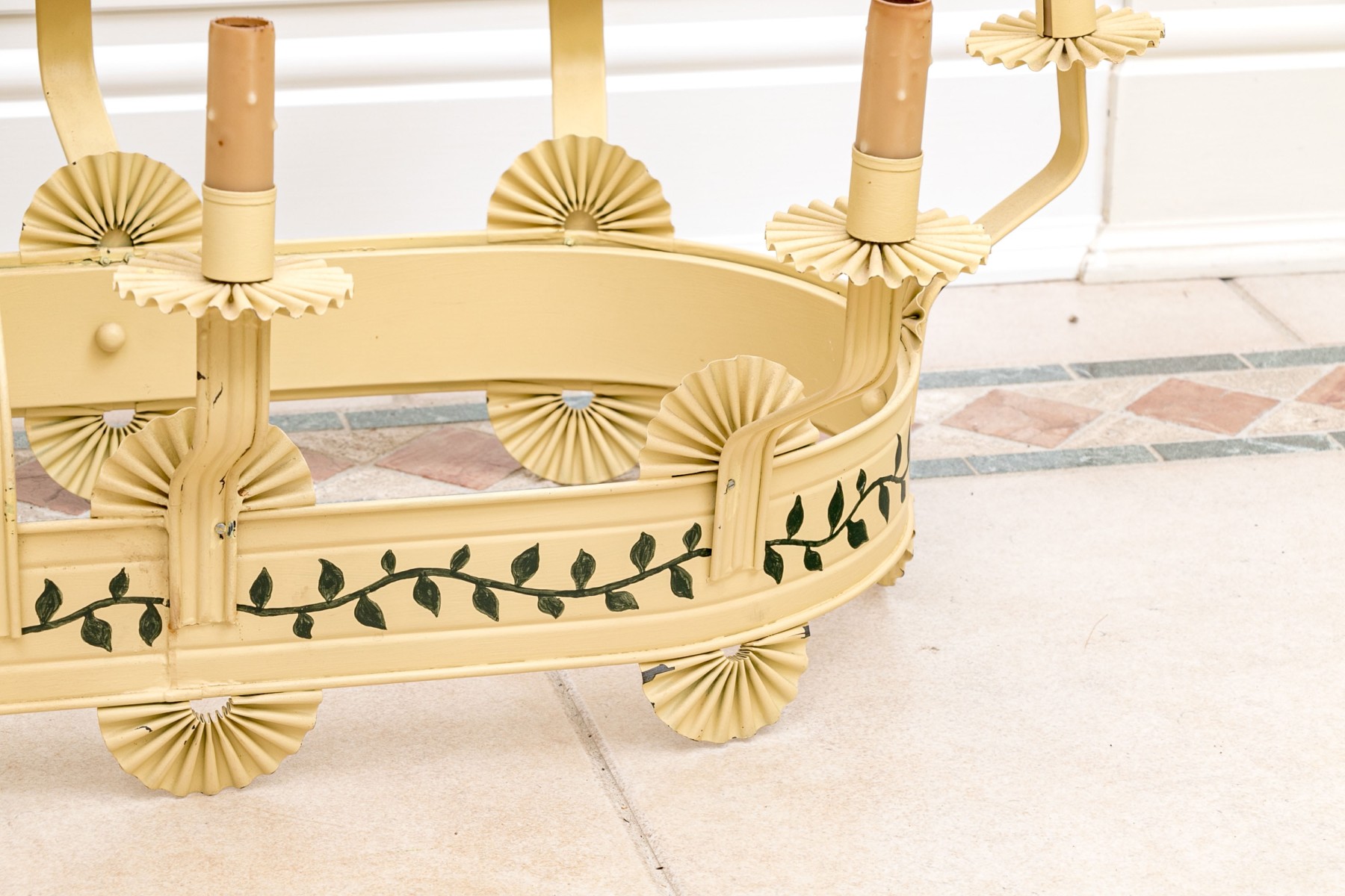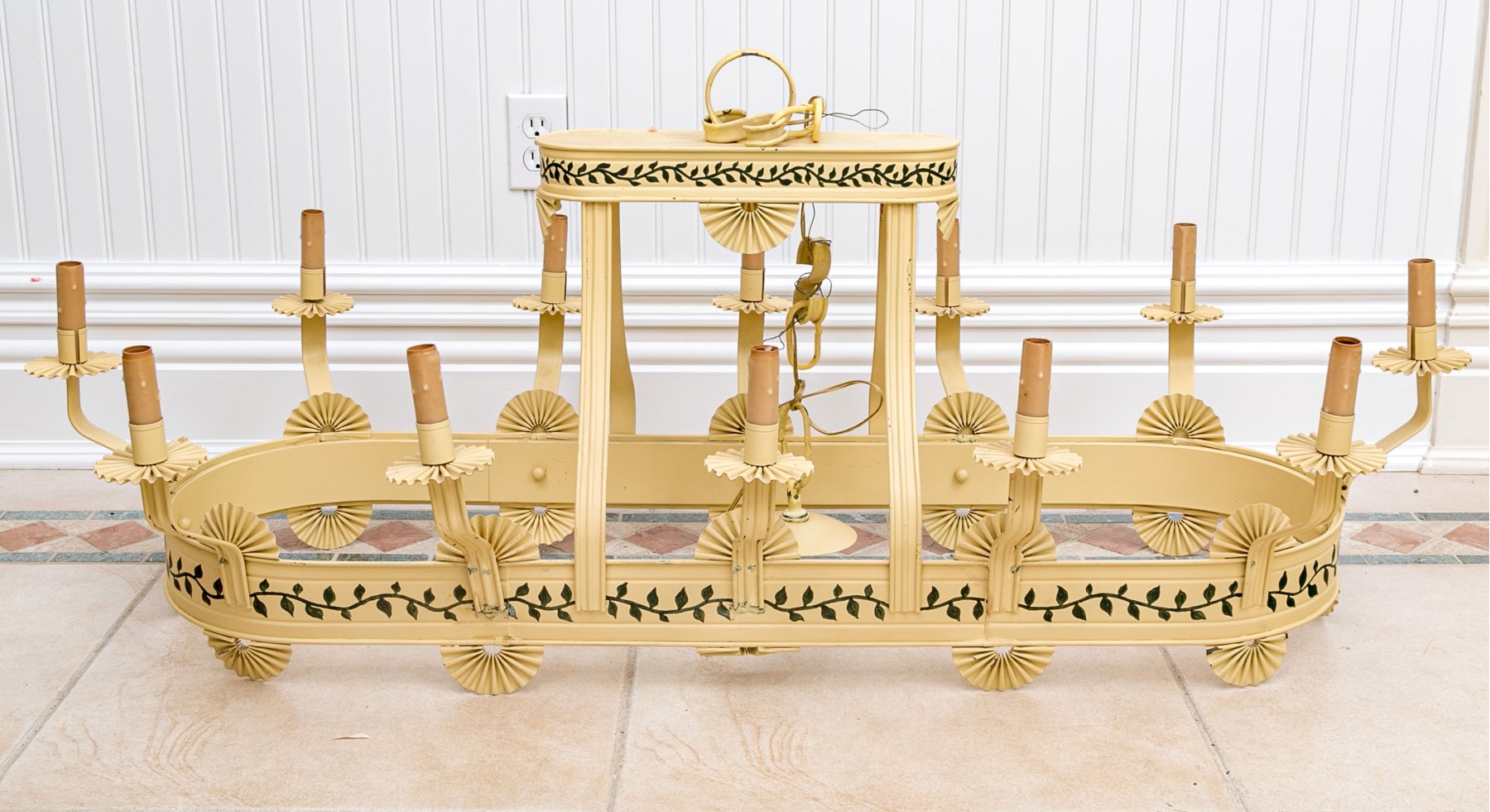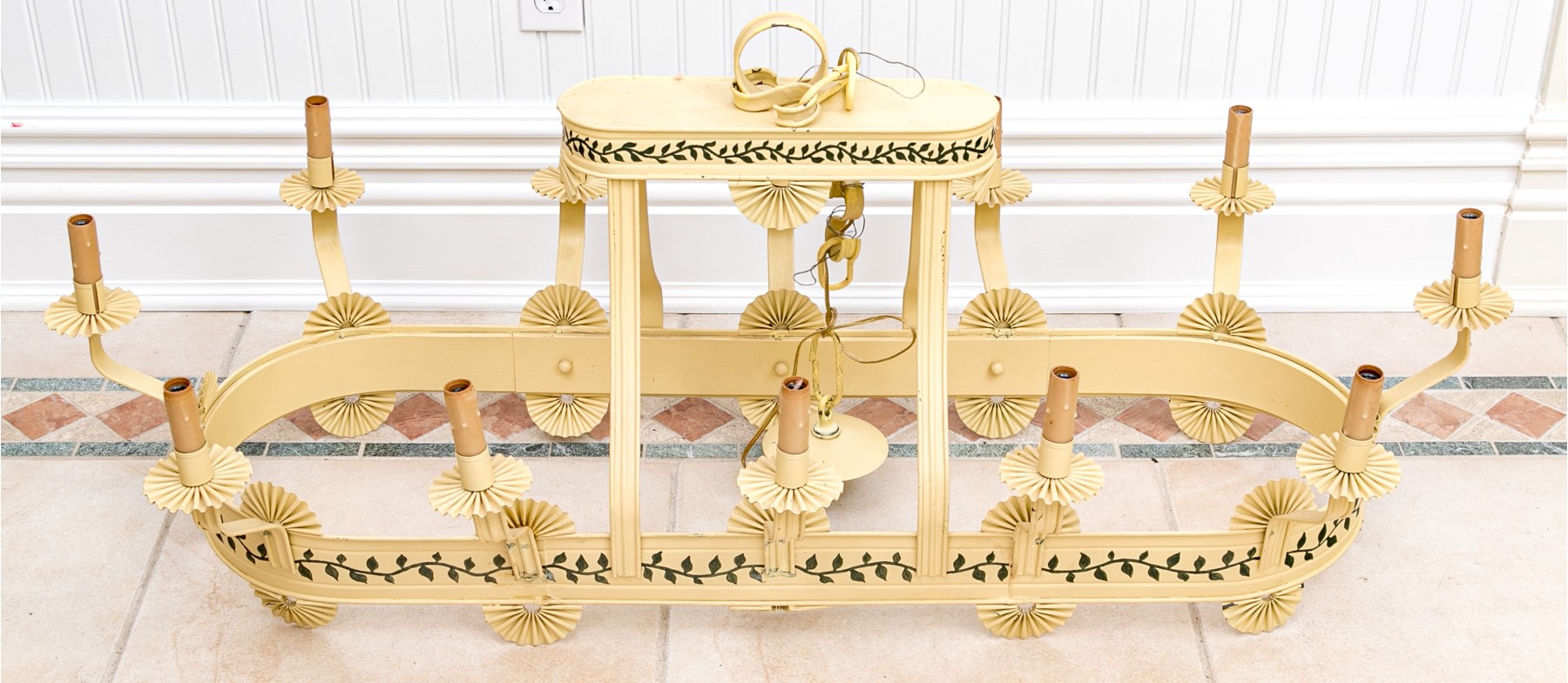 Vintage tole chandelier featuring an oval form with 12 surrounding lights. It is painted in yellow with green vine and leaf decoration. Each light is adorned with a pleated fan bobeche around the collar