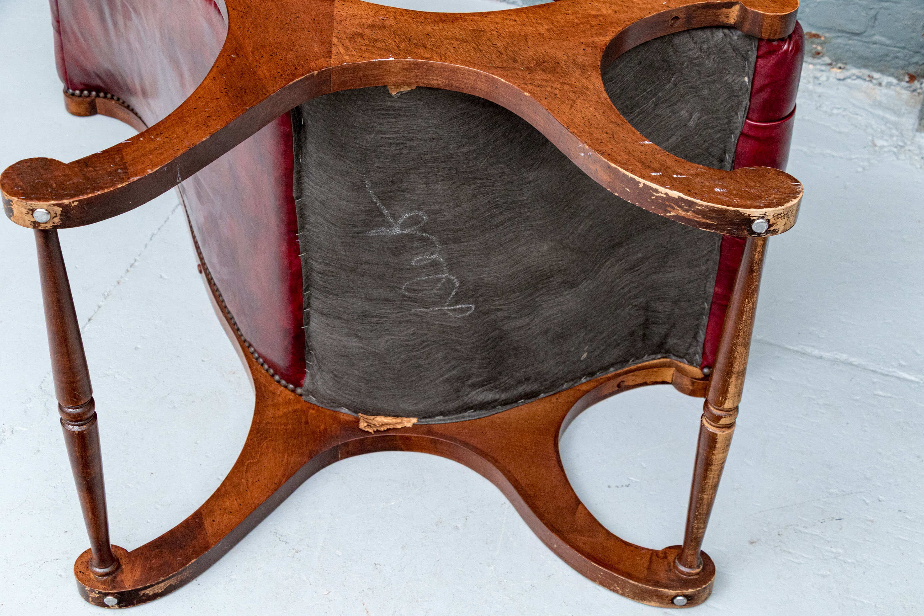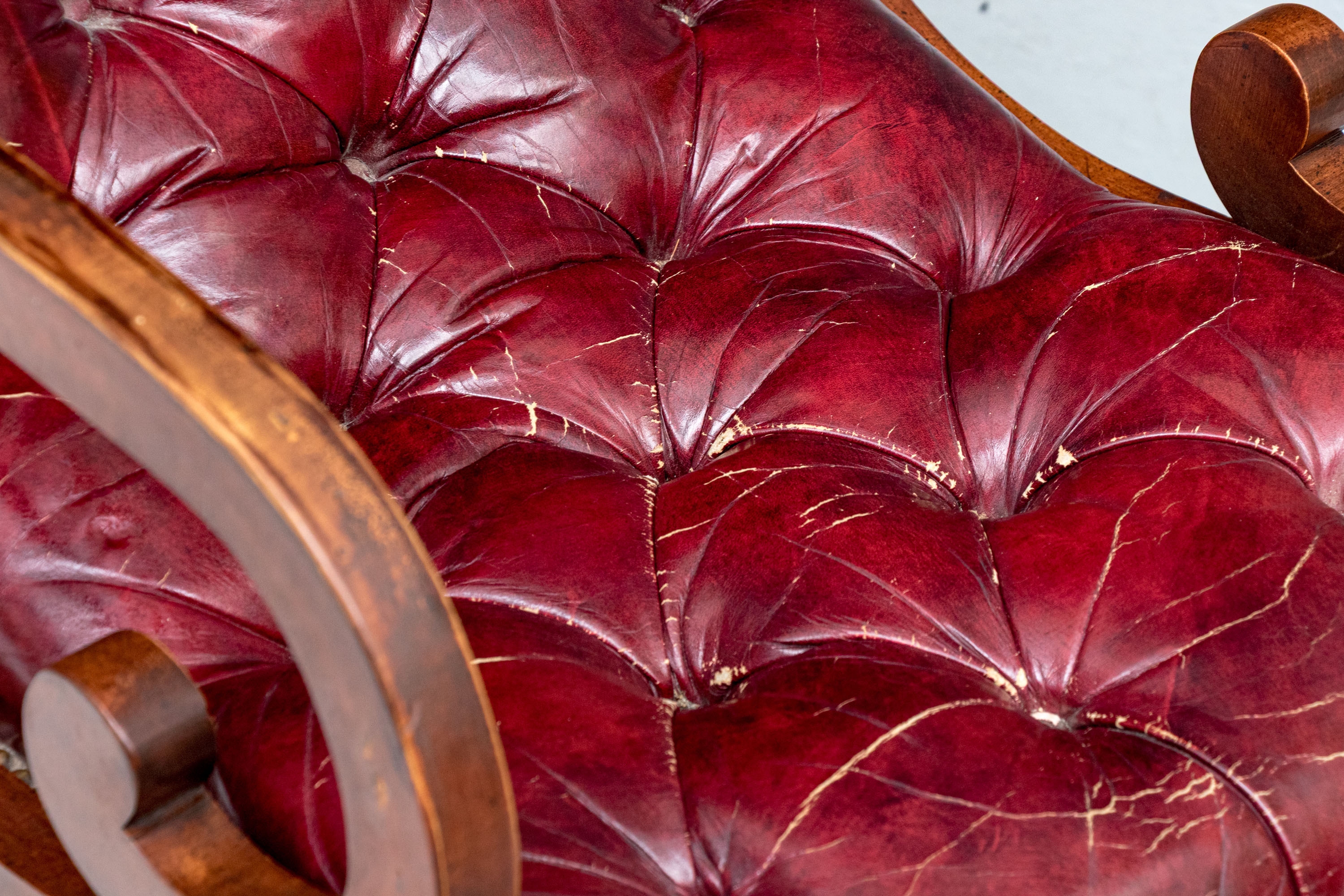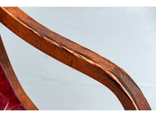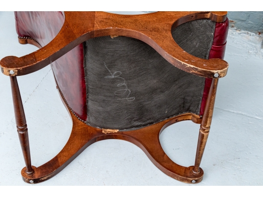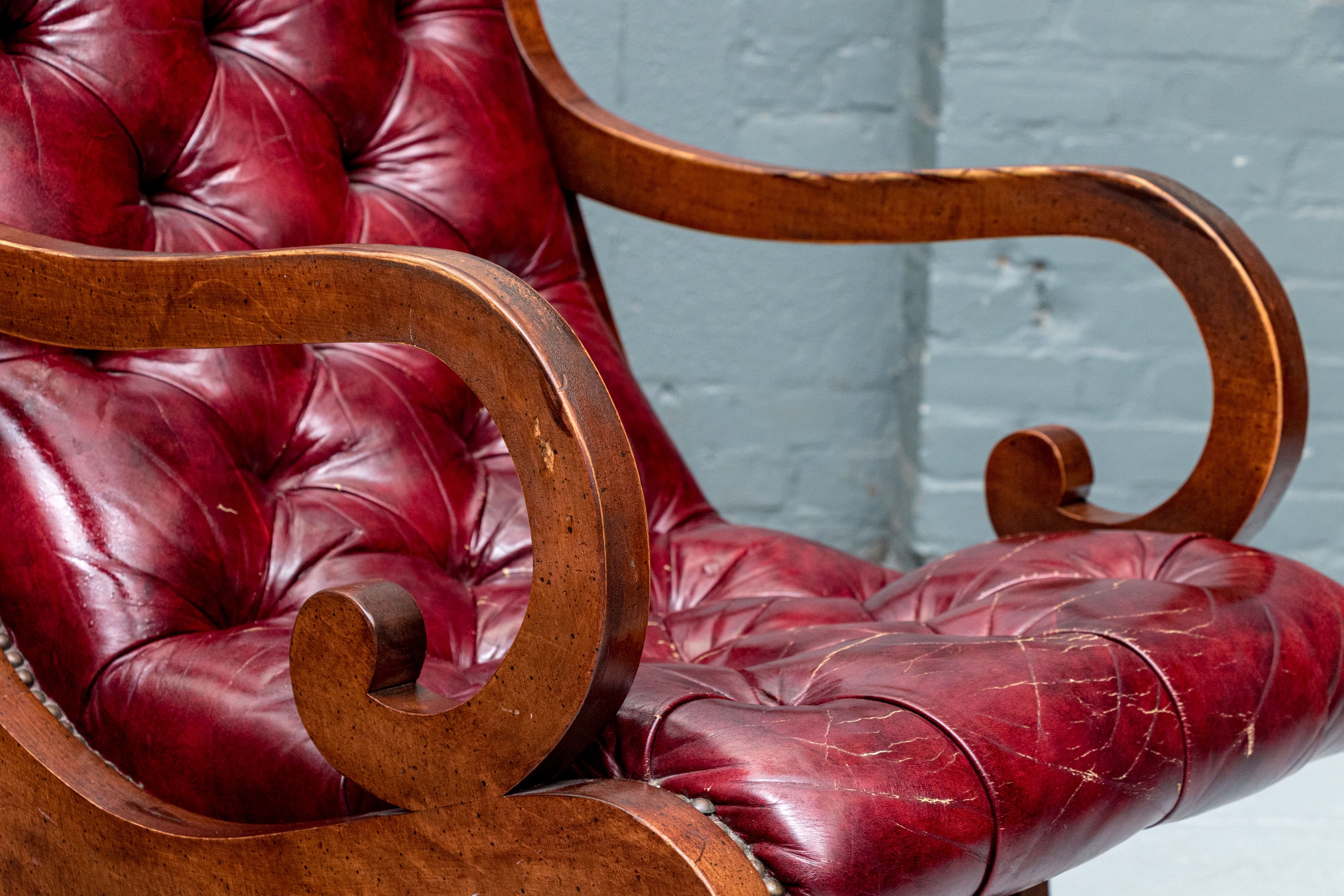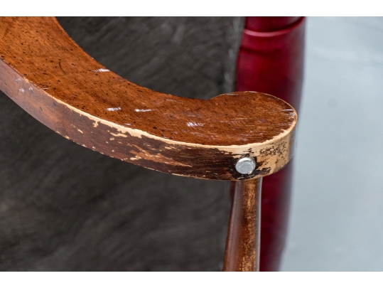 Condition: wear and alligatoring to finish to arms, cracking/wear/splits to leather, old repair to armrest. Please see photos for details of condition.