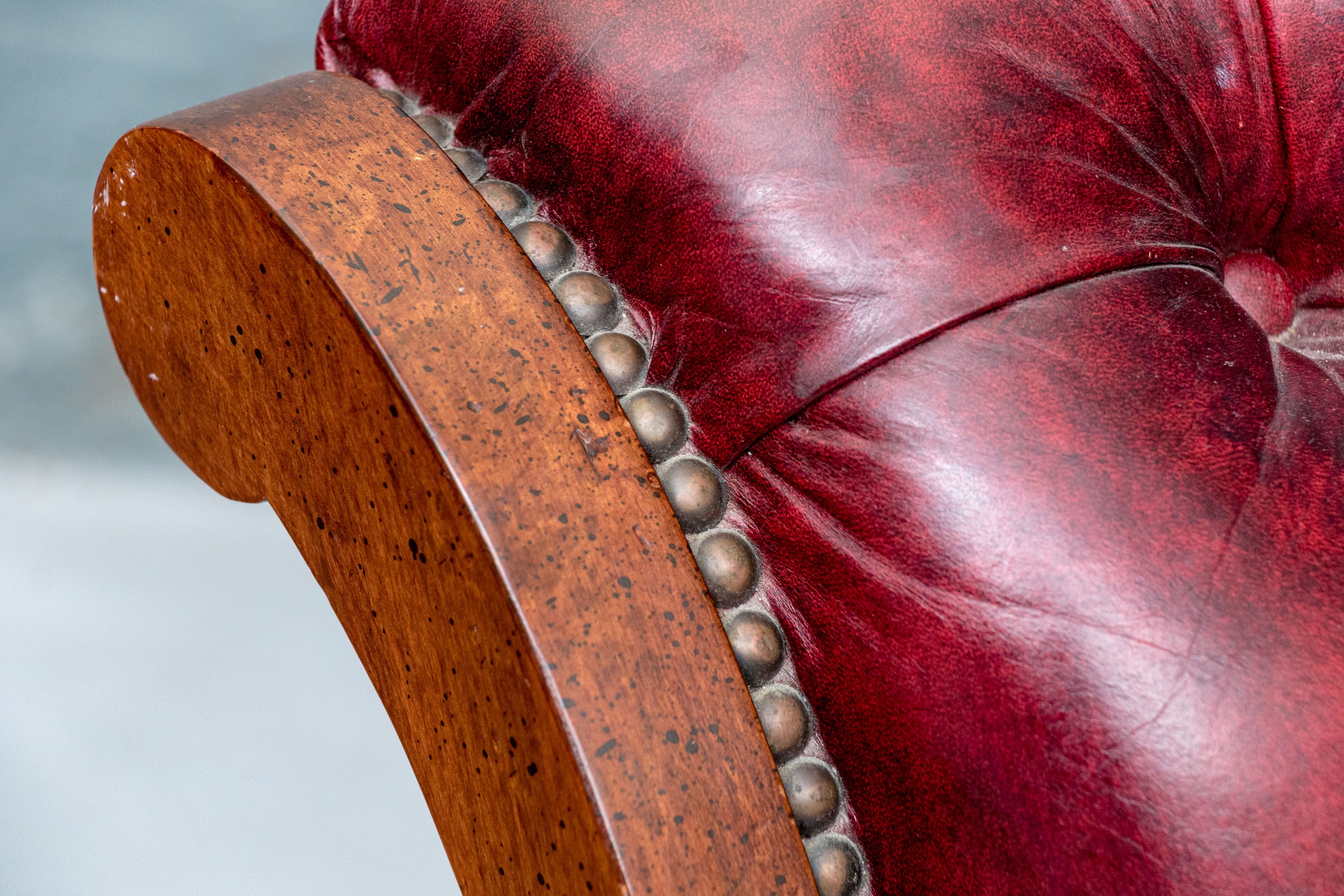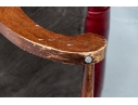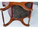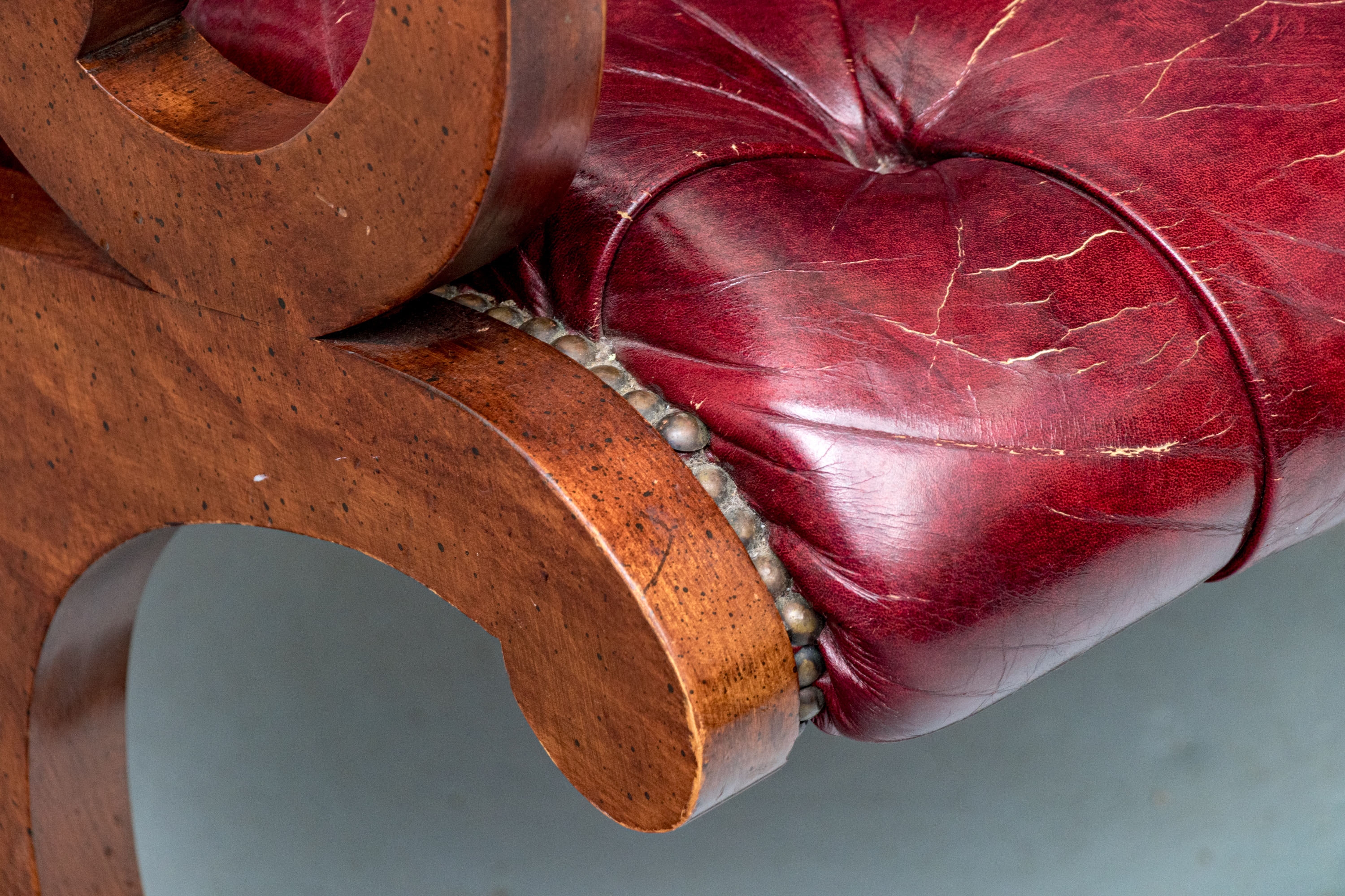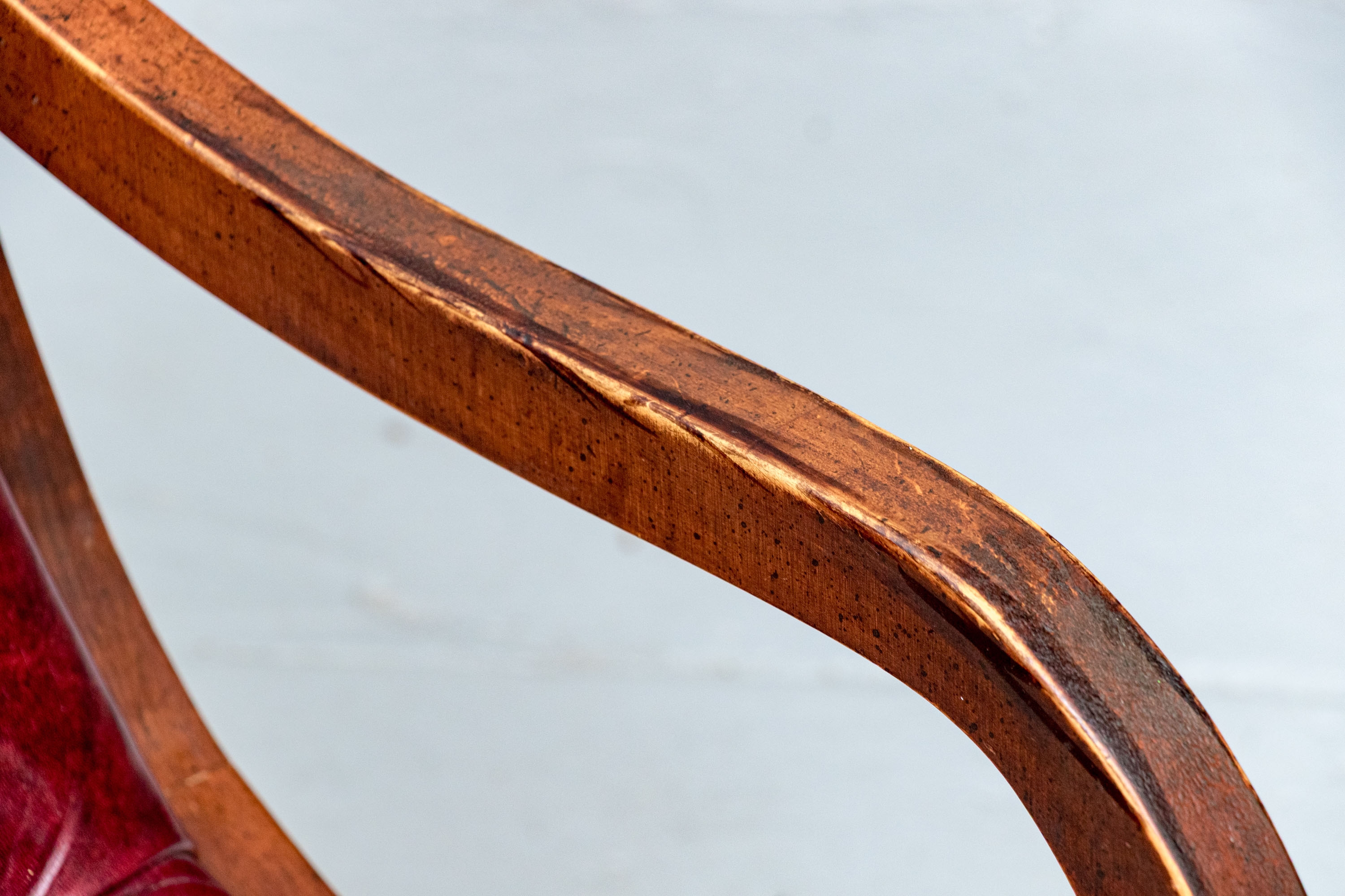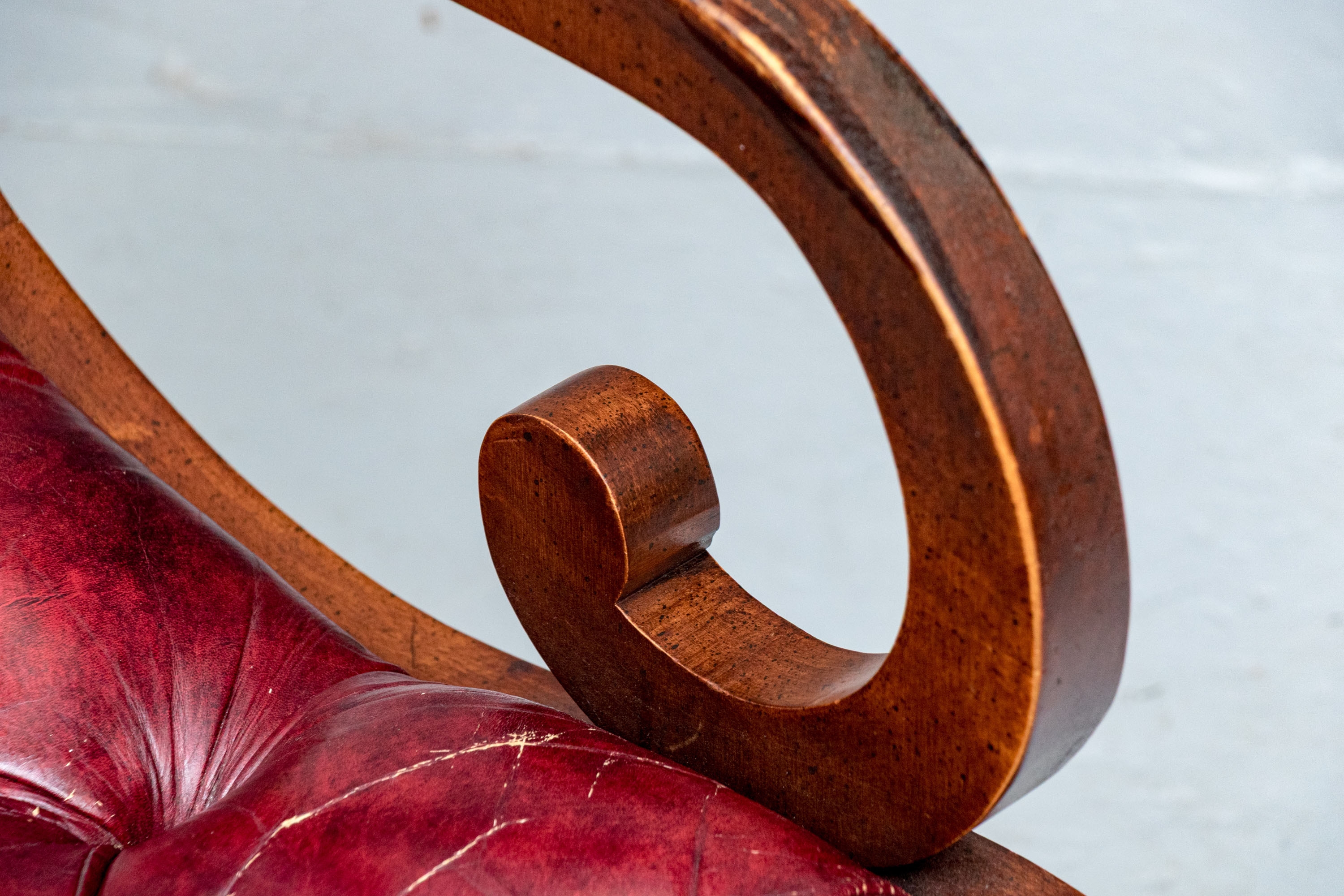 Condition: wear and alligatoring to finish to arms, cracking/wear/splits to leather, old repair to armrest. Please see photos for details of condition.
