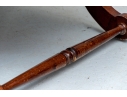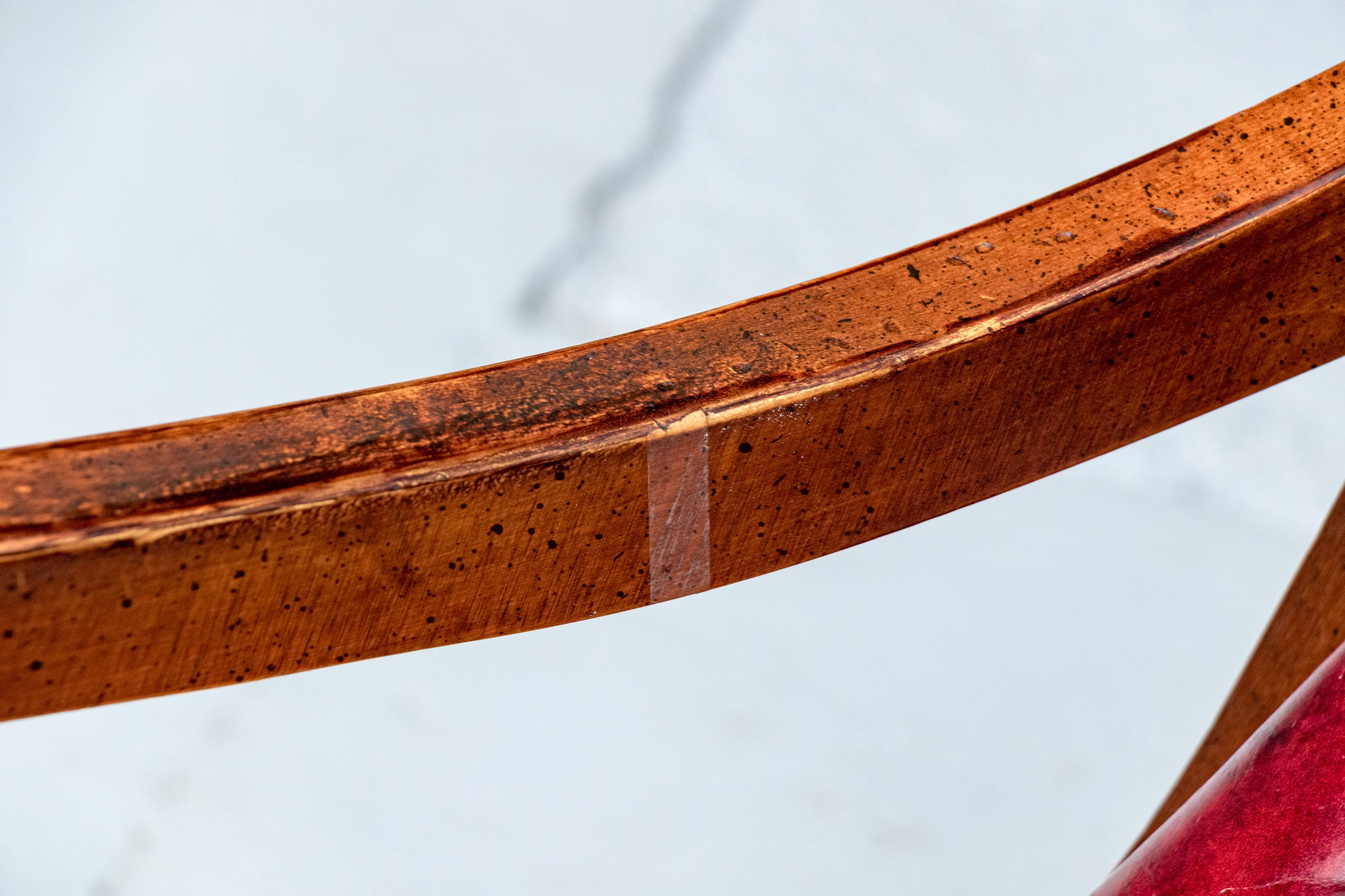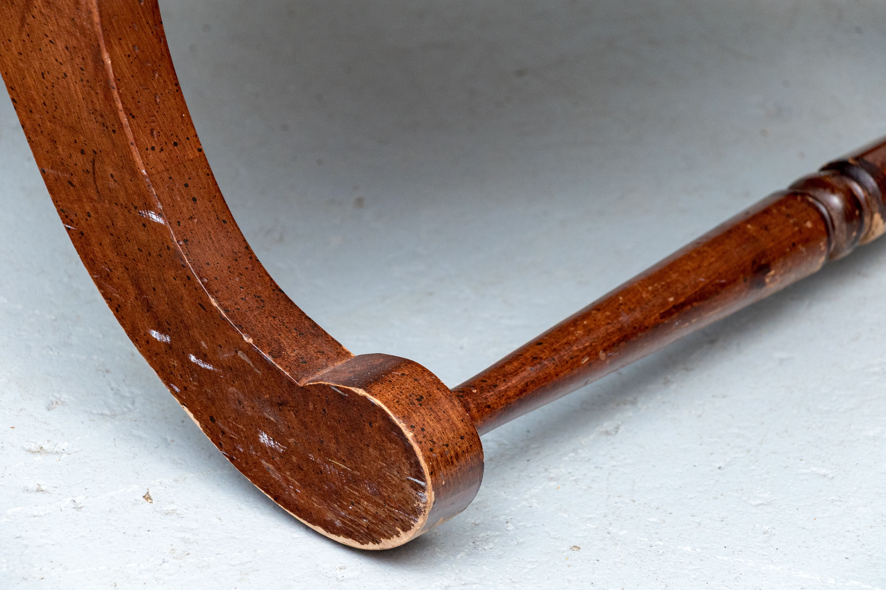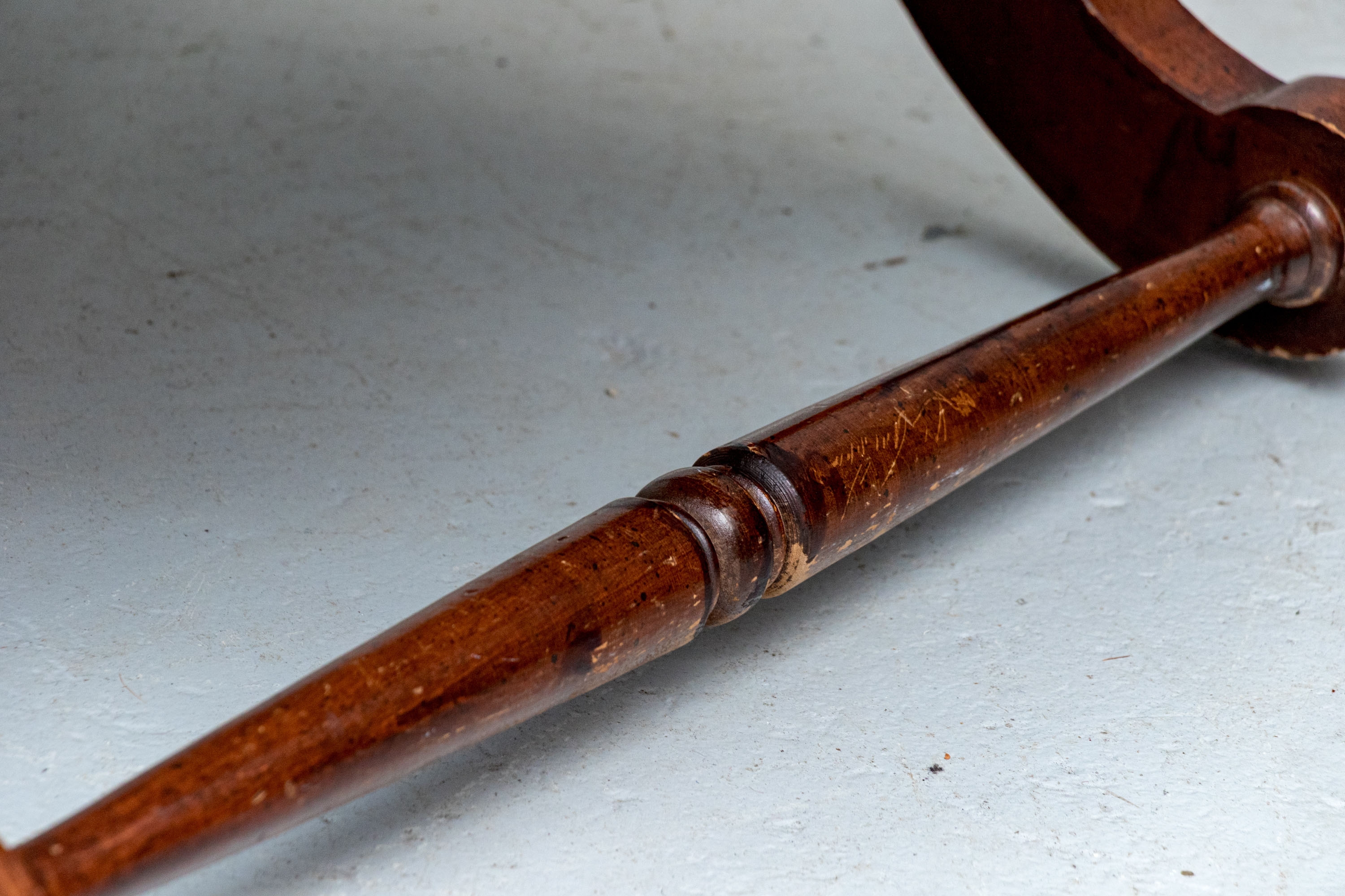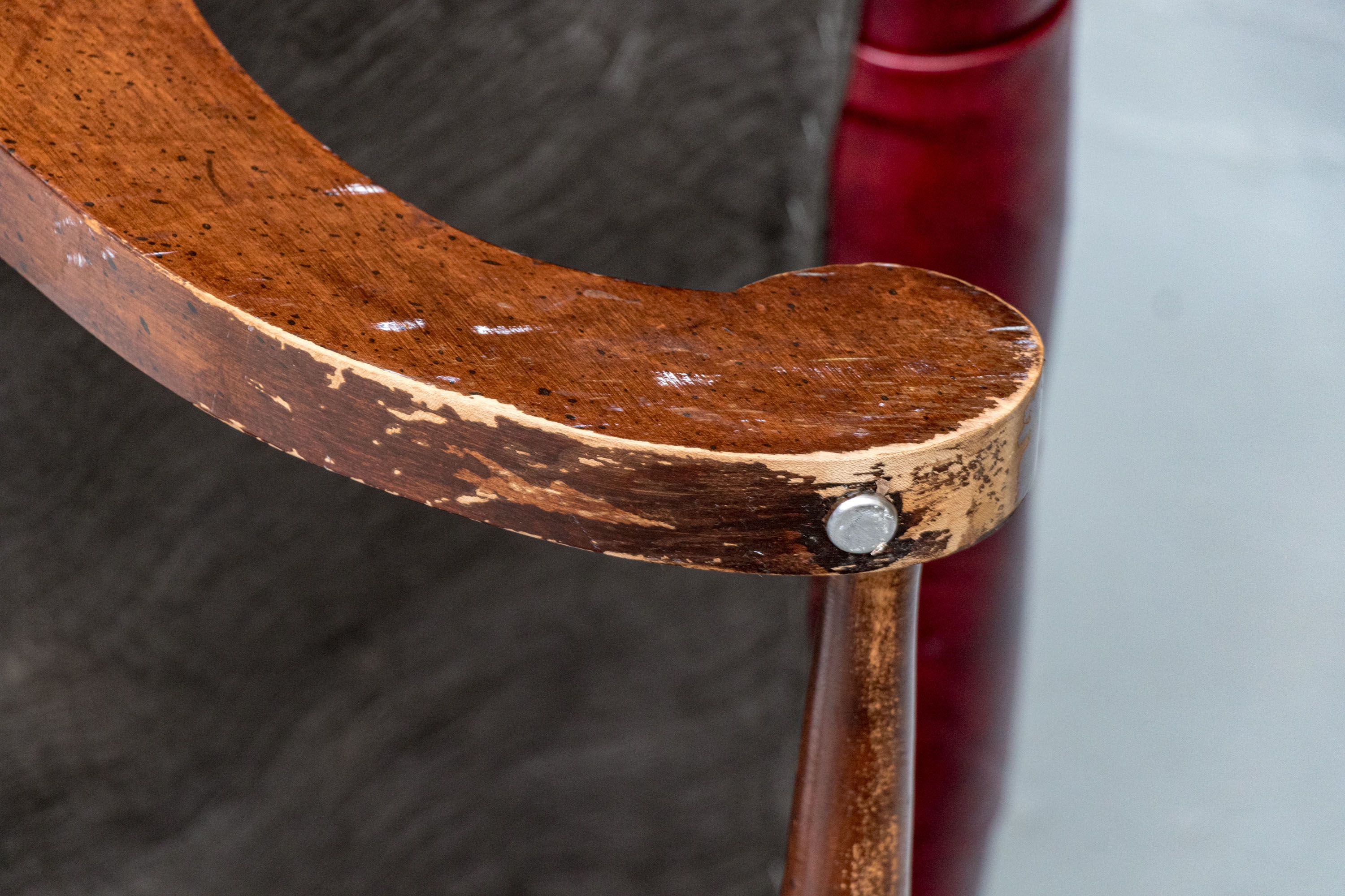 Condition: wear and alligatoring to finish to arms, cracking/wear/splits to leather, old repair to armrest. Please see photos for details of condition.