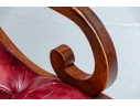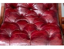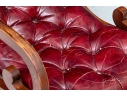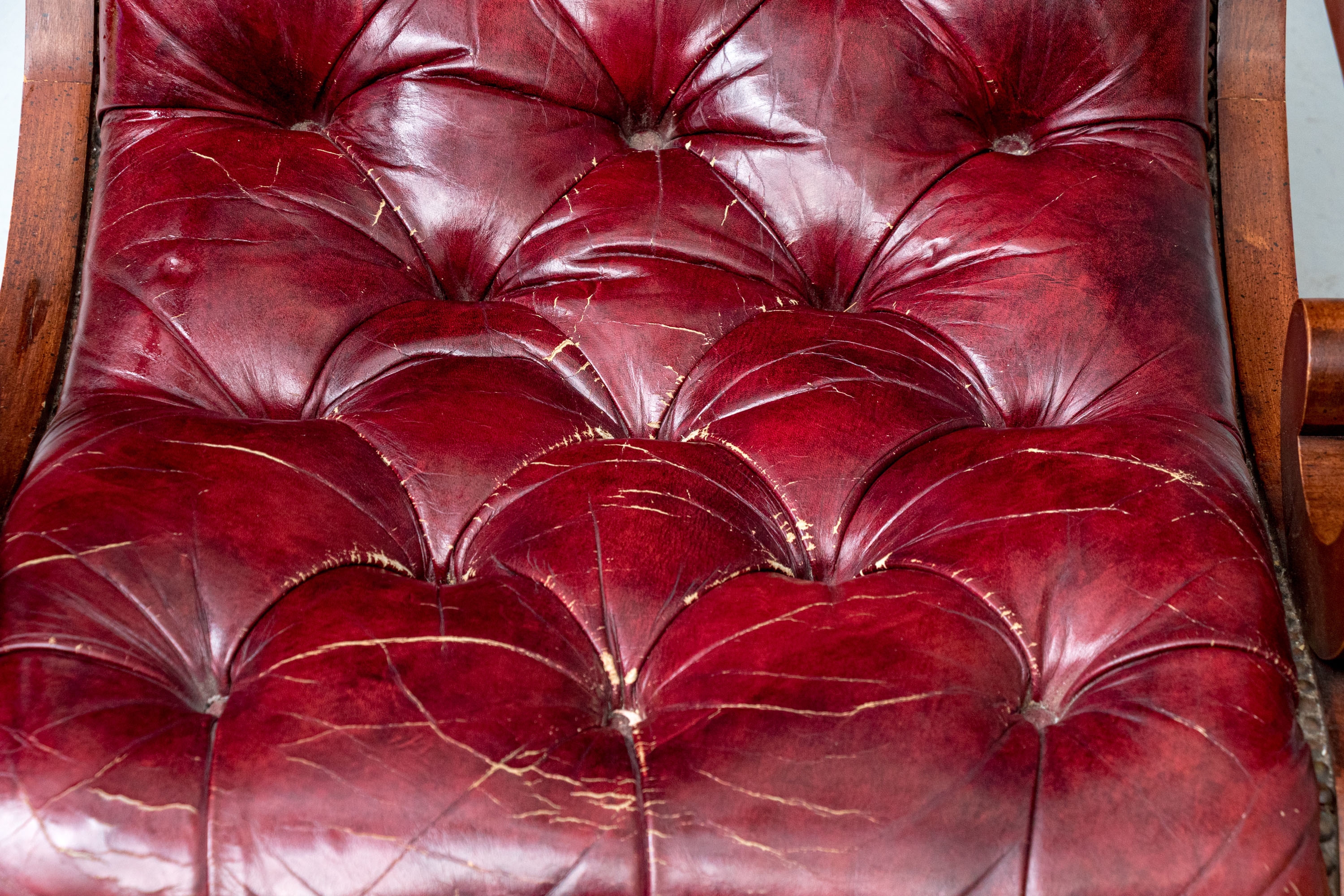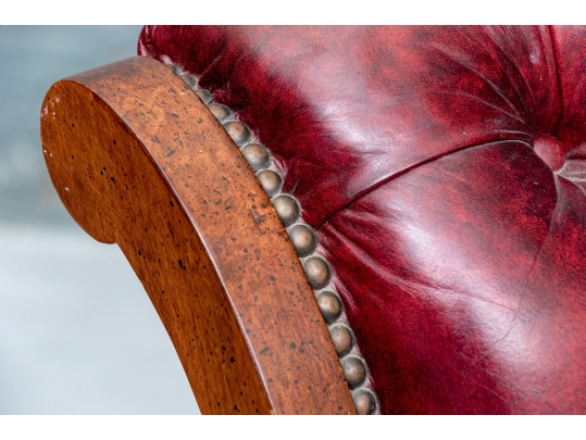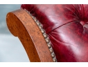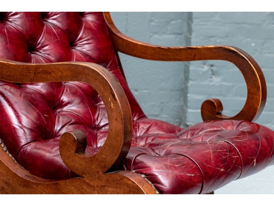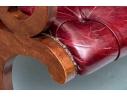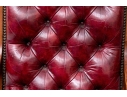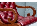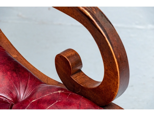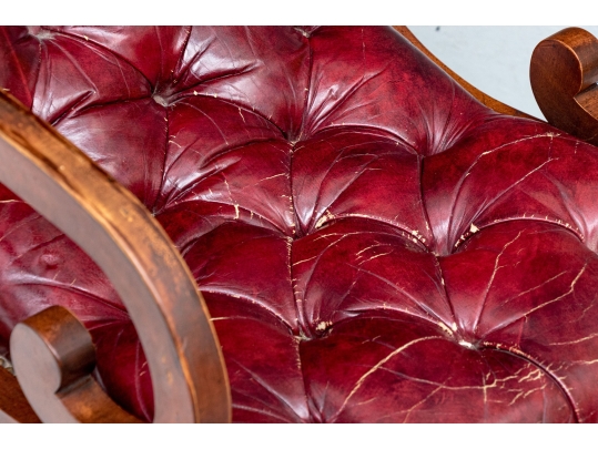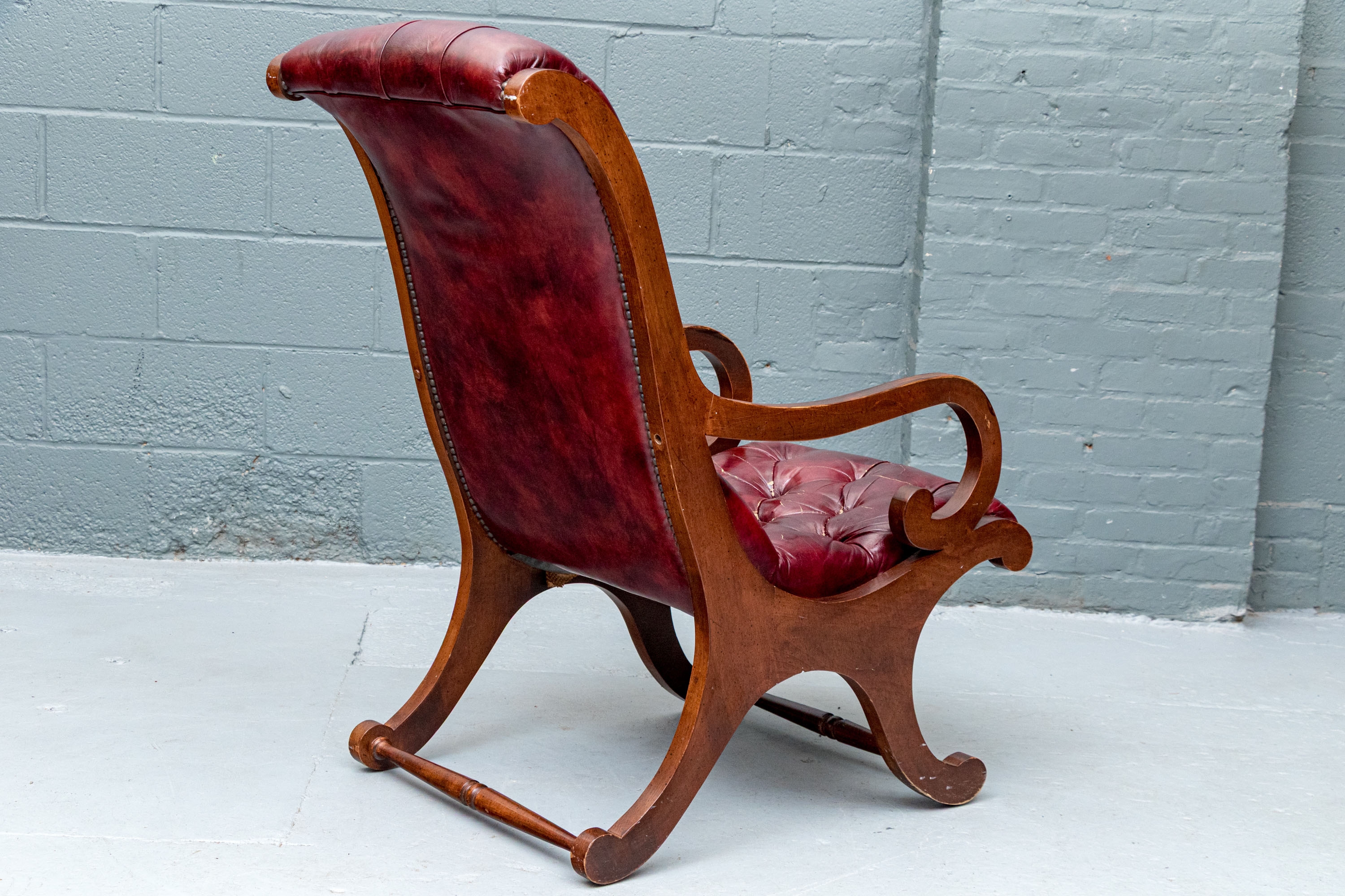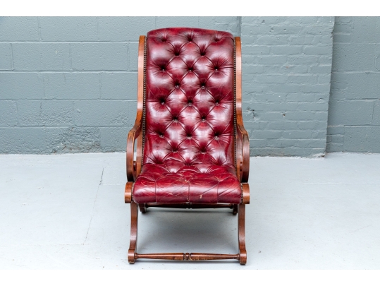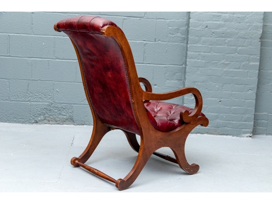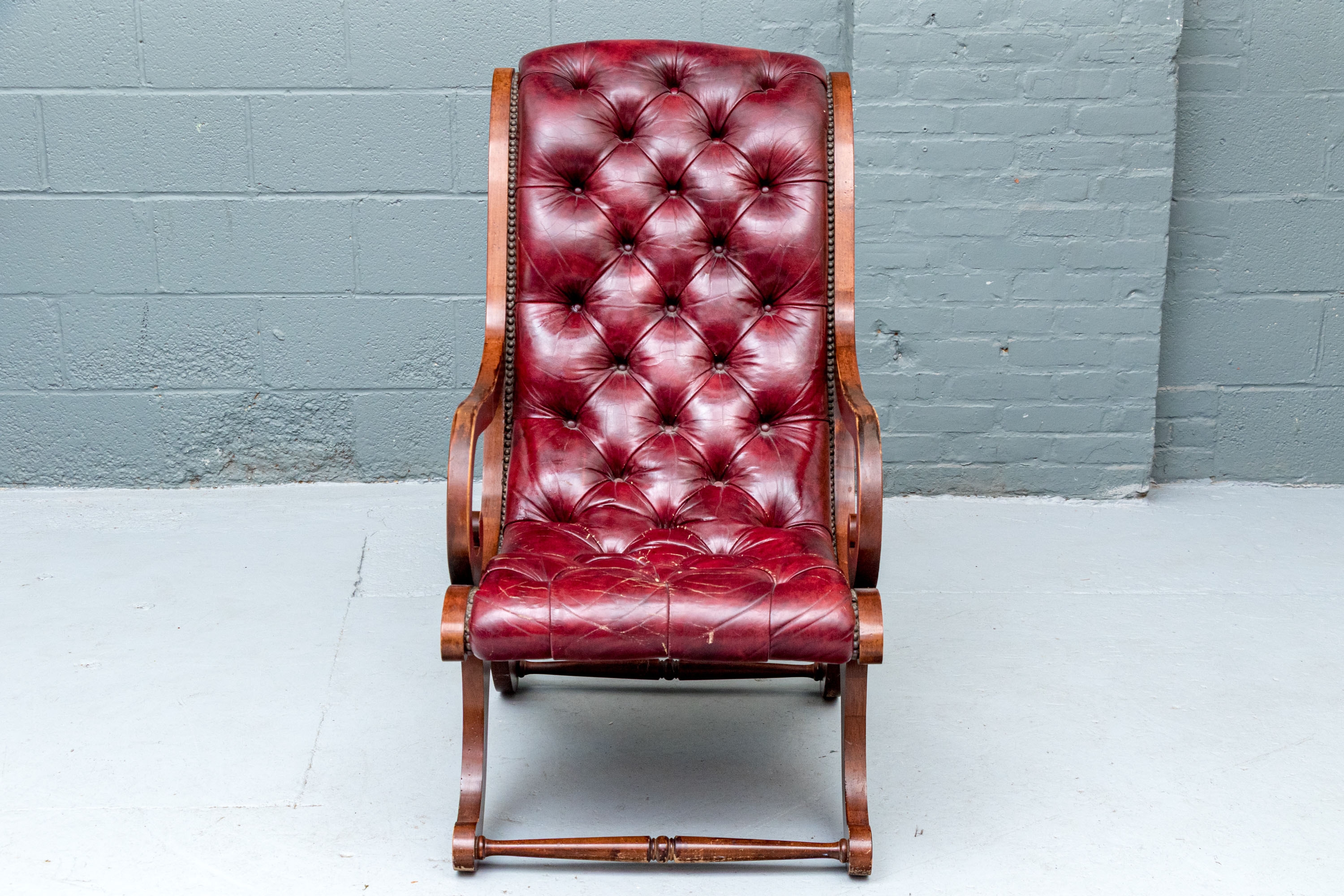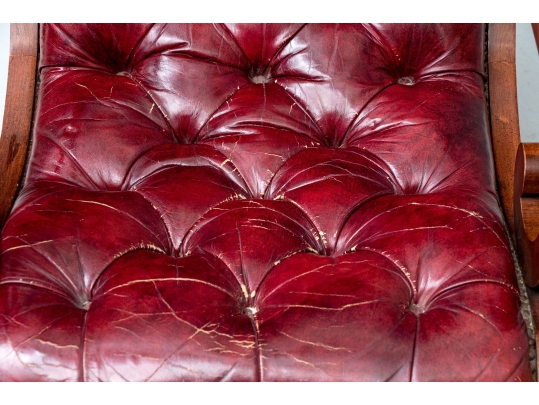 Vintage Chesterfield lolling or sleigh chair characterized by deep button-tufted leather upholstery, low-slung seat, brass tack decoration, deep scrolling arms and resting upon turned stretchers with a shaped foot.