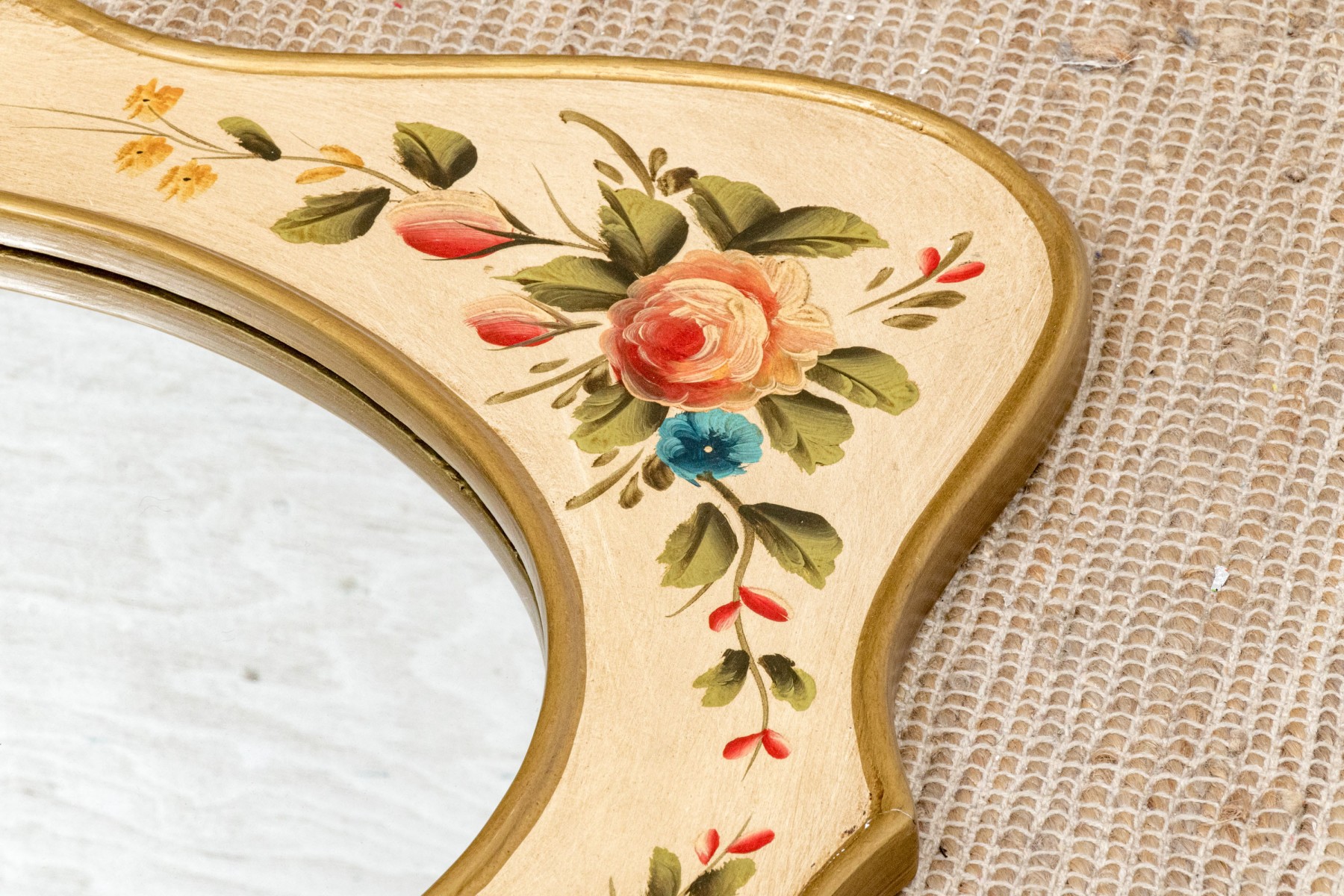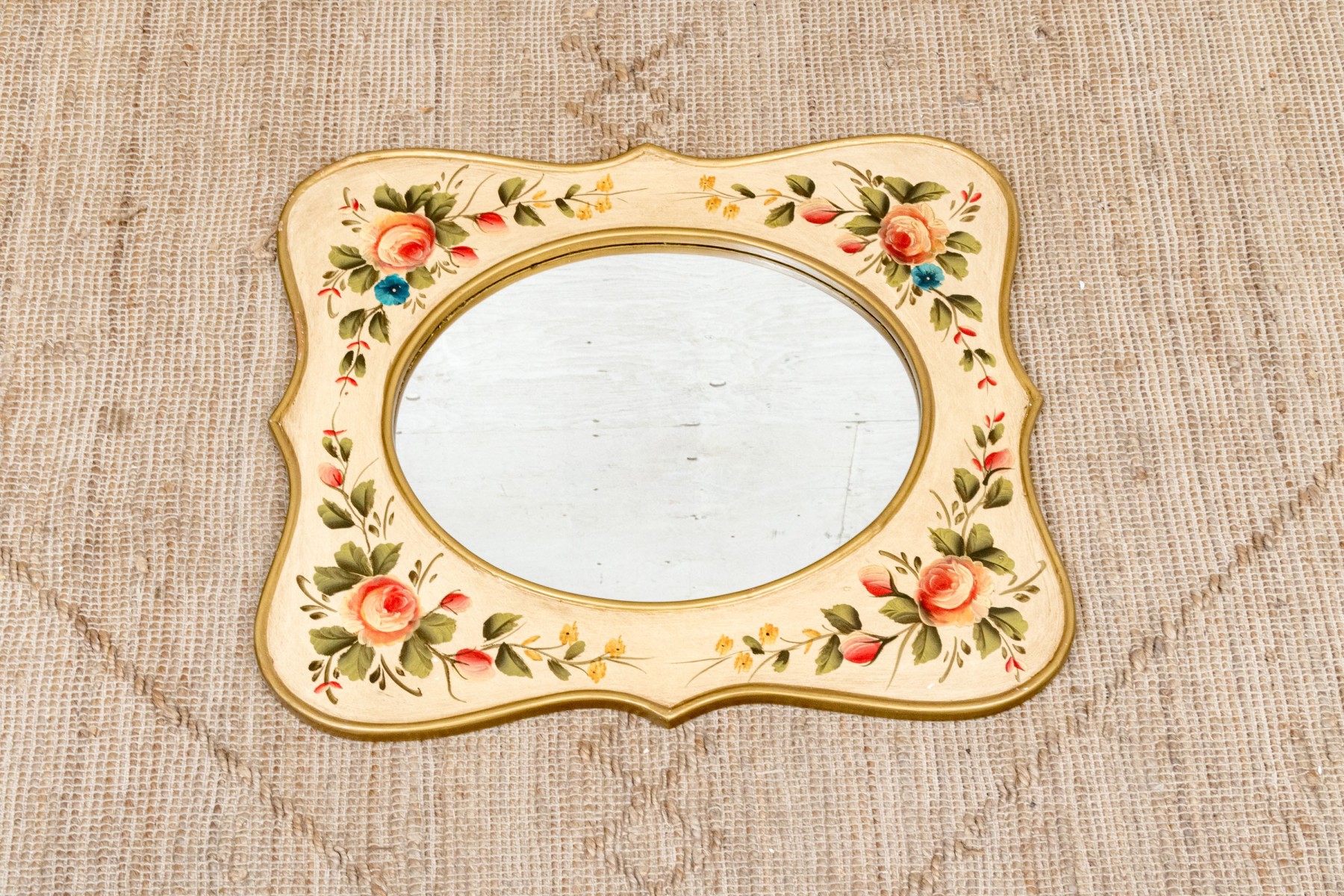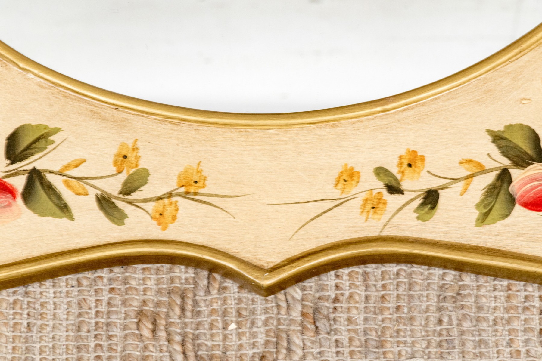 A serpentine shaped mirror with gilt edges and painted with pink roses and yellow flowers on the off- white surround.