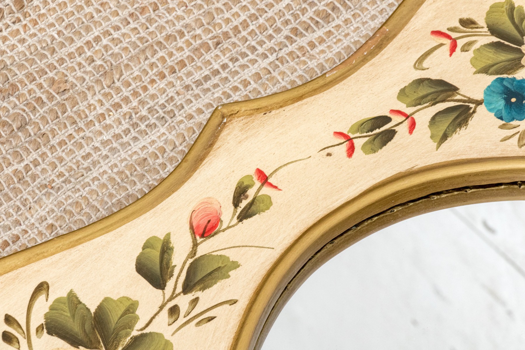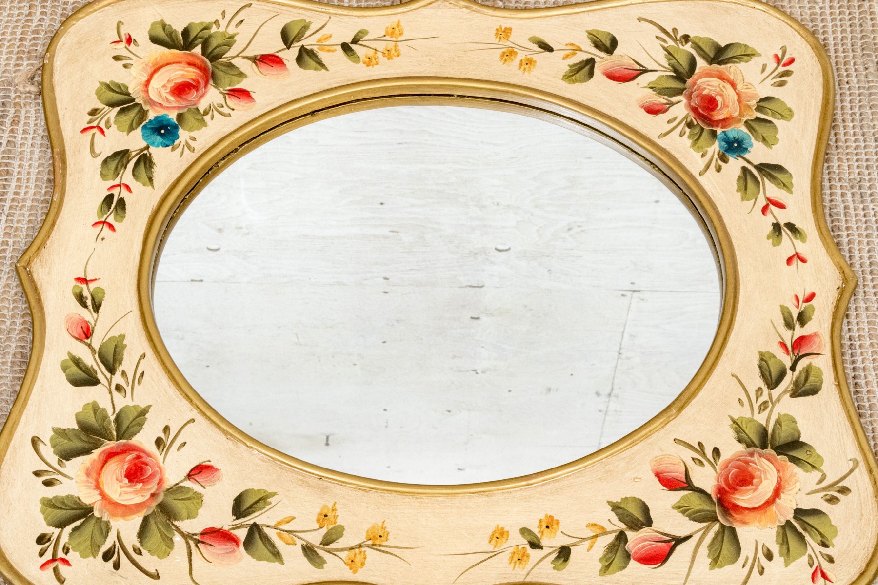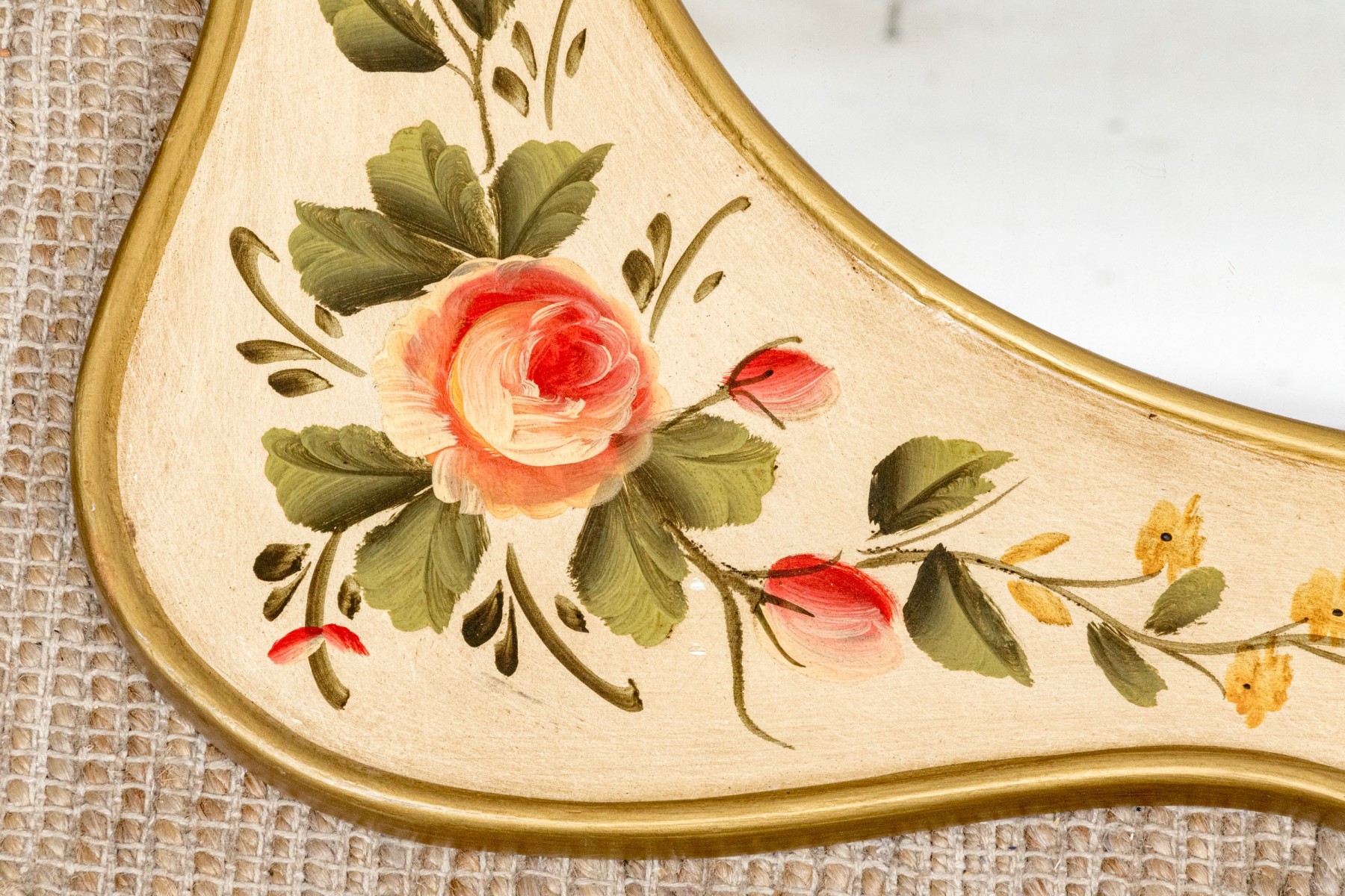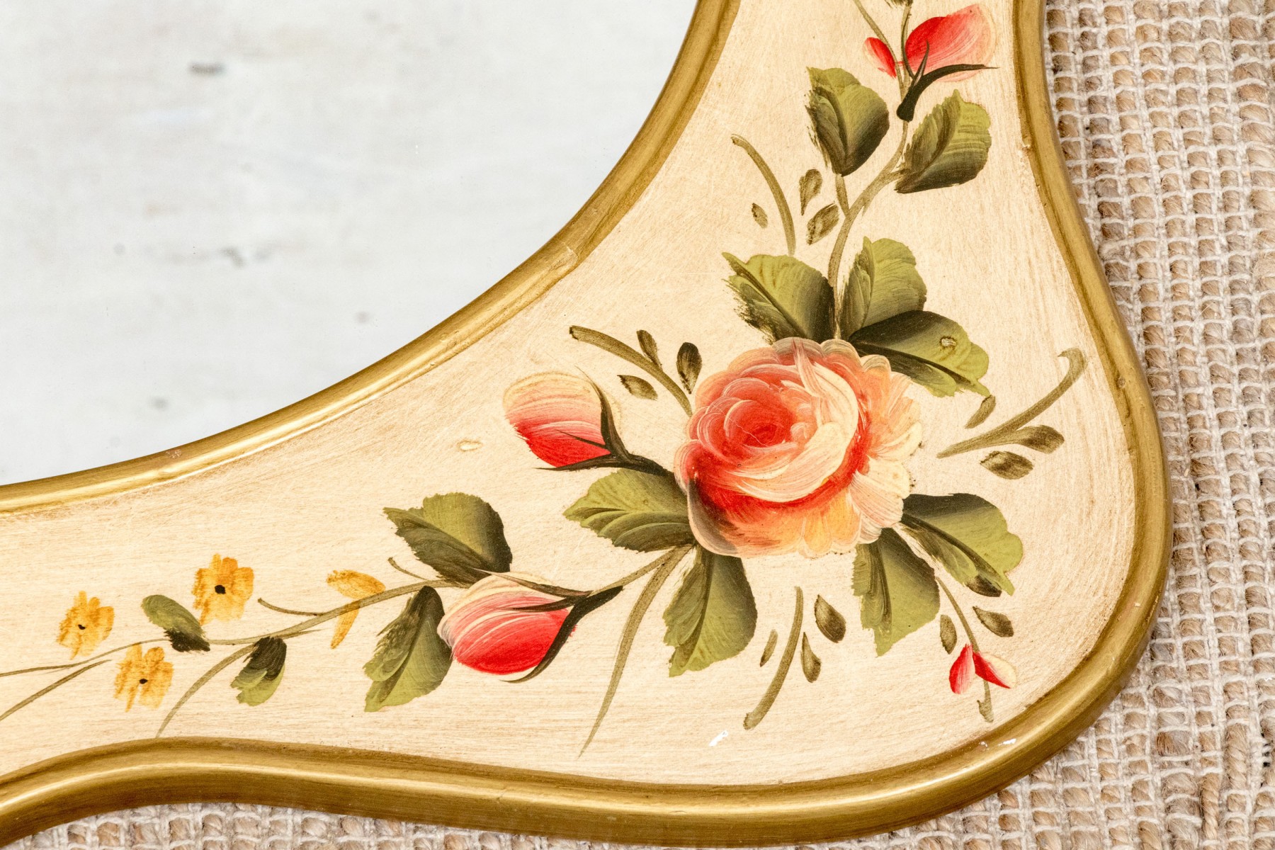 A serpentine shaped mirror with gilt edges and painted with pink roses and yellow flowers on the off- white surround.