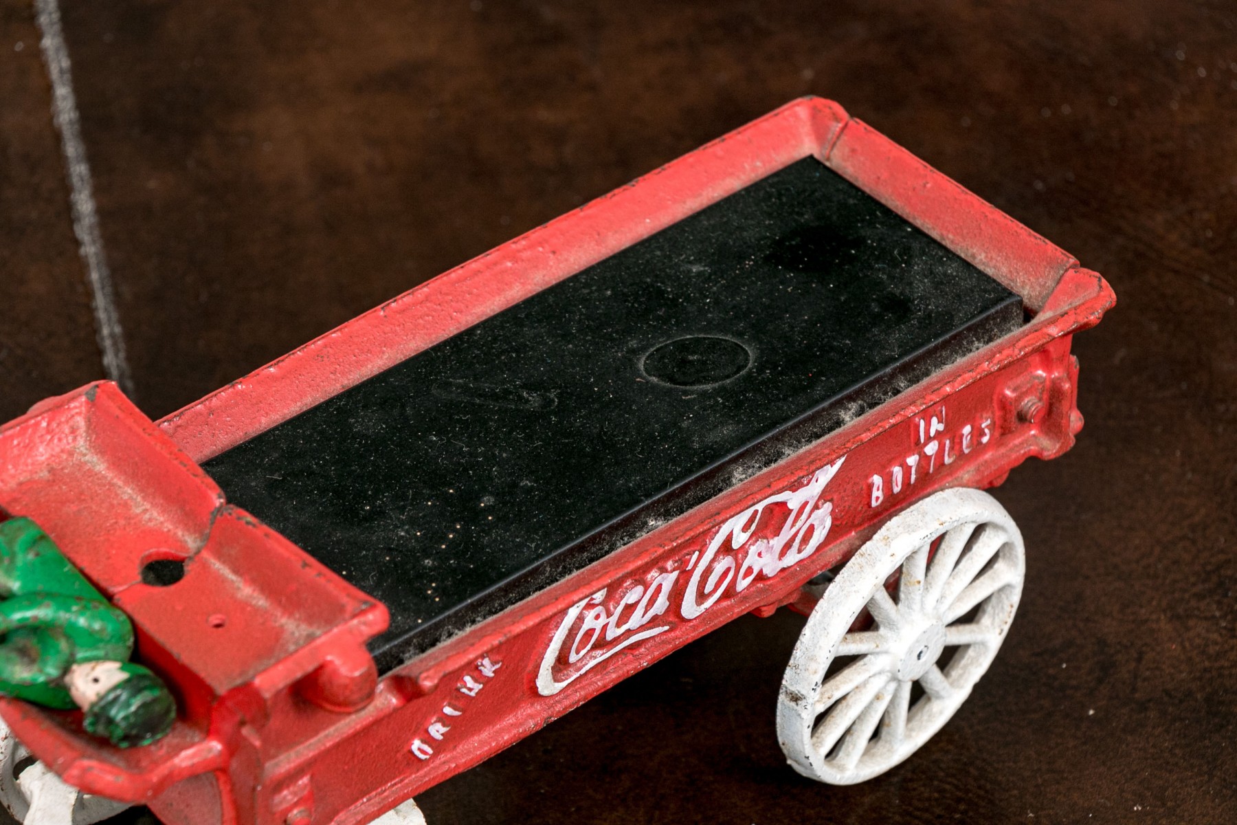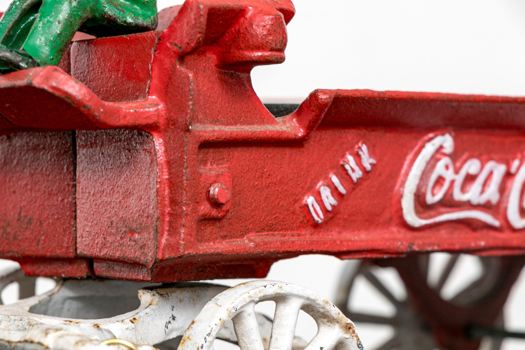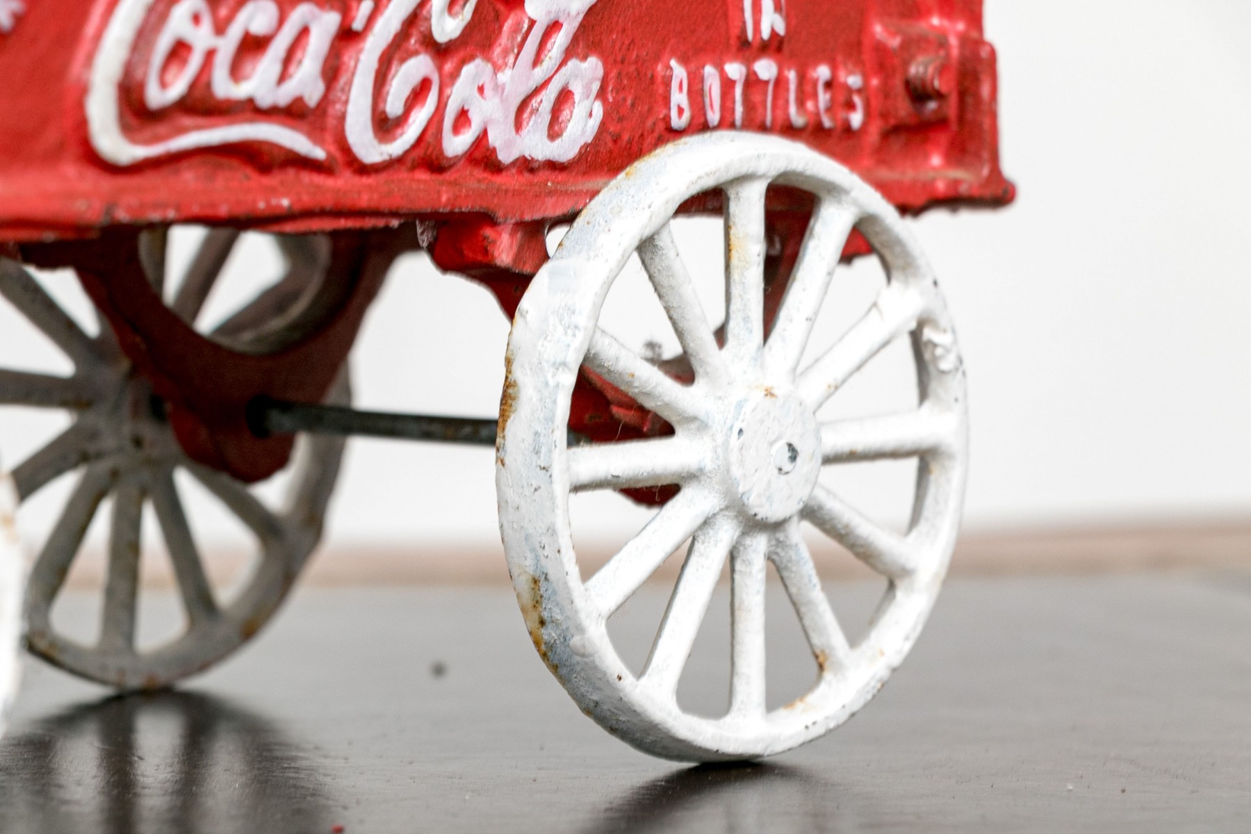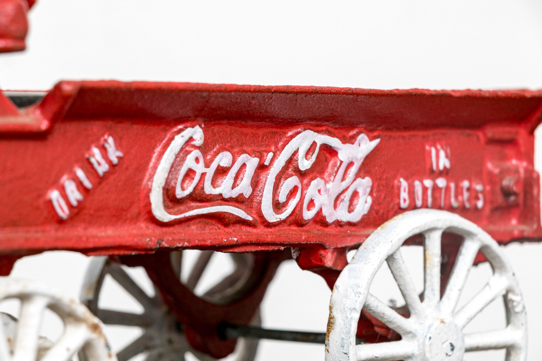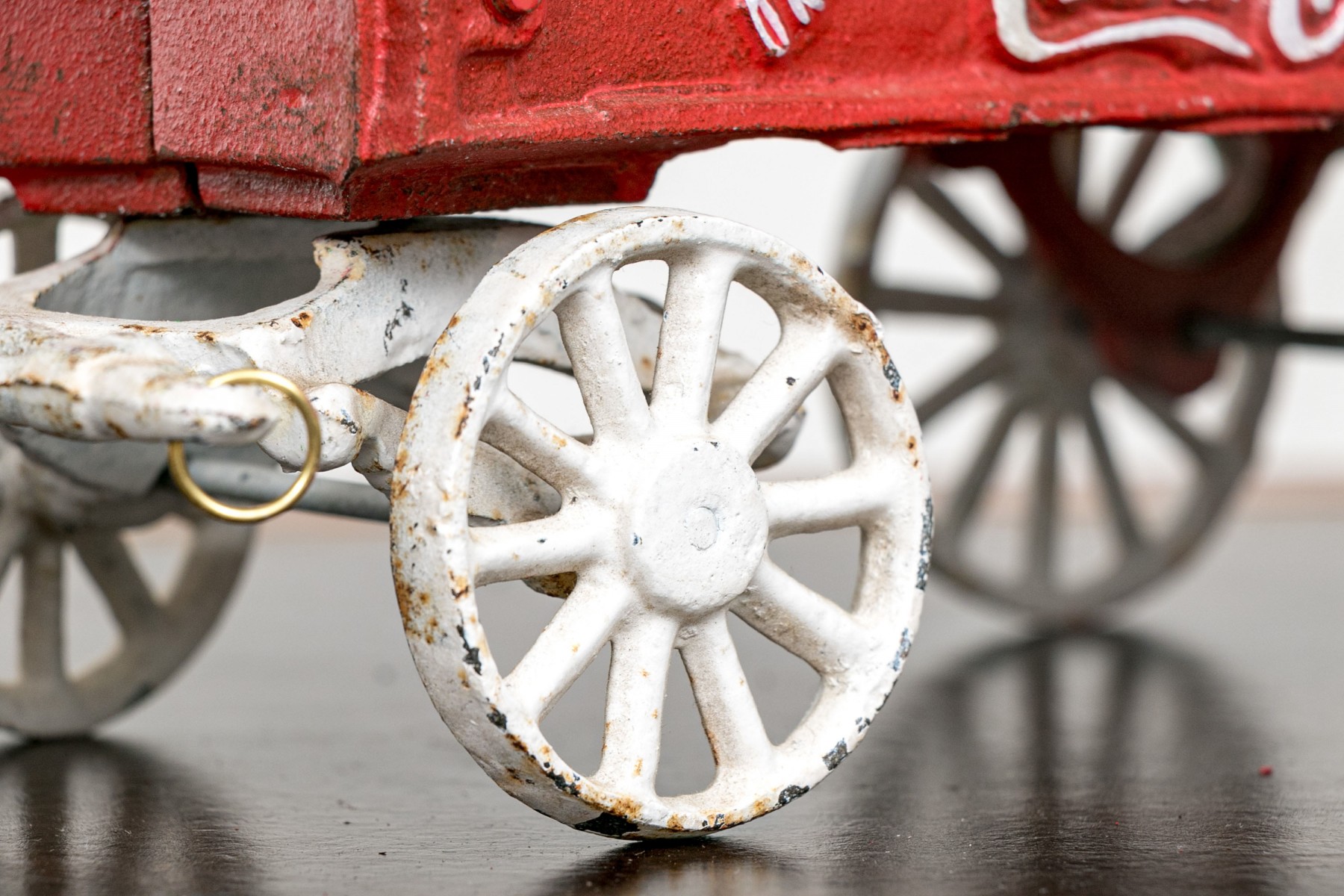 With the long red finished pull cart with white finished "Coca Cola" cast and paint finished to the side of the cart. The cart on four wheels with a driver dressed in green holding a rope that connects the two traditional horses on a white harness.