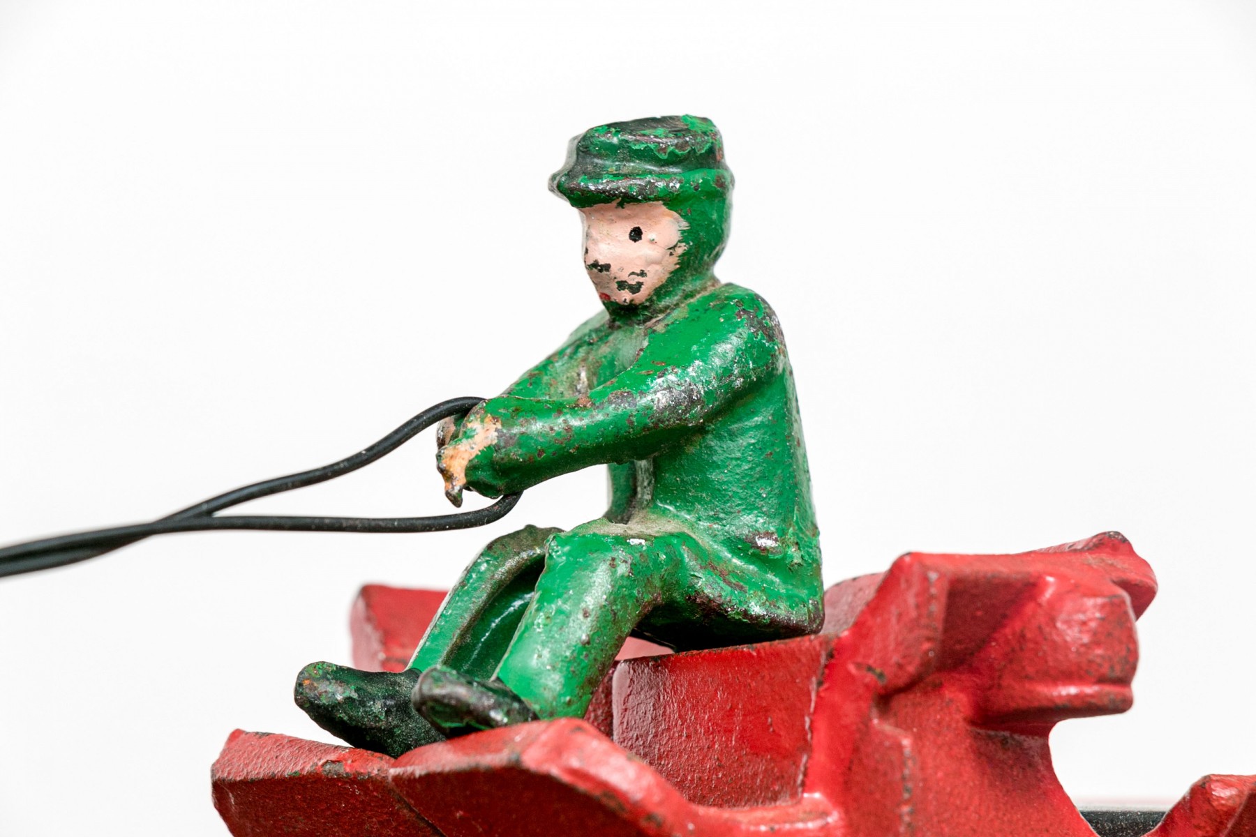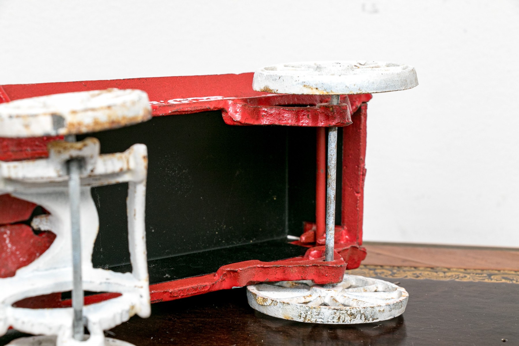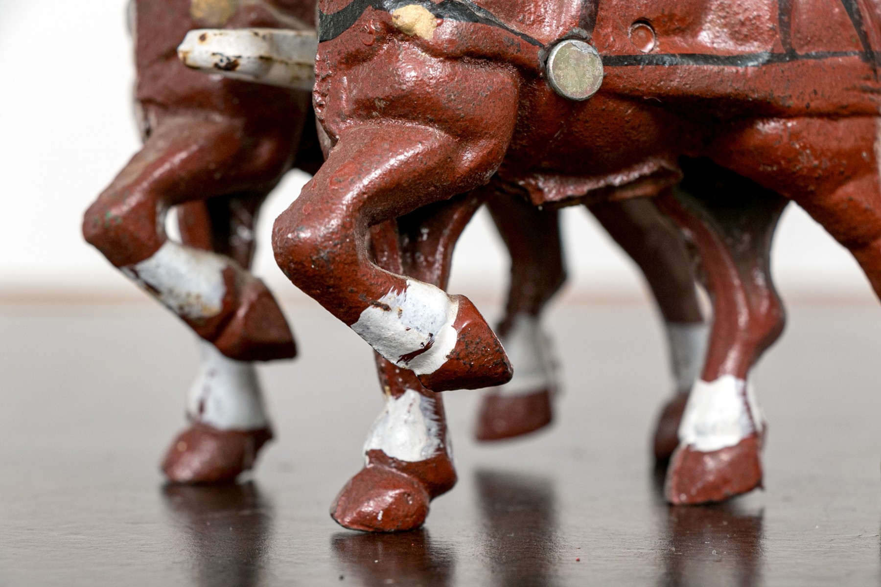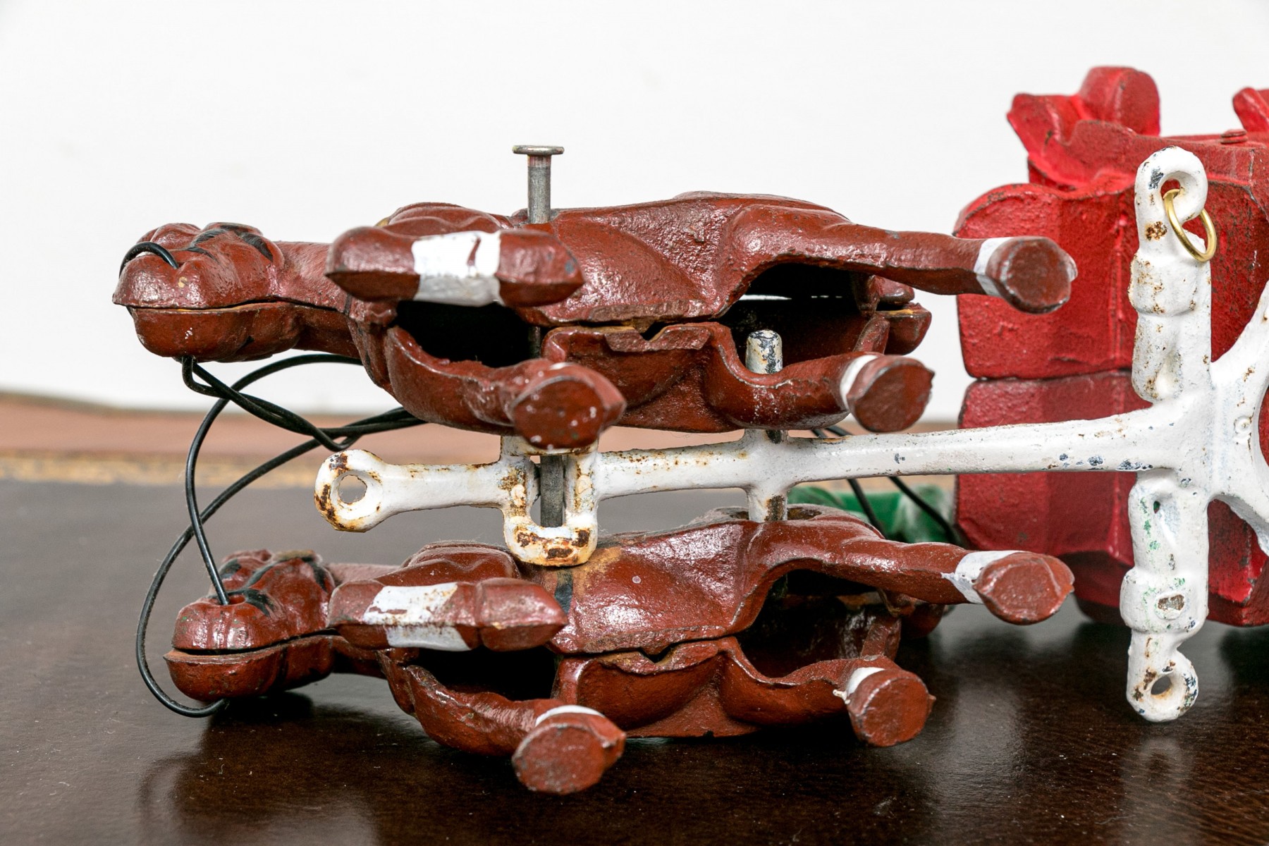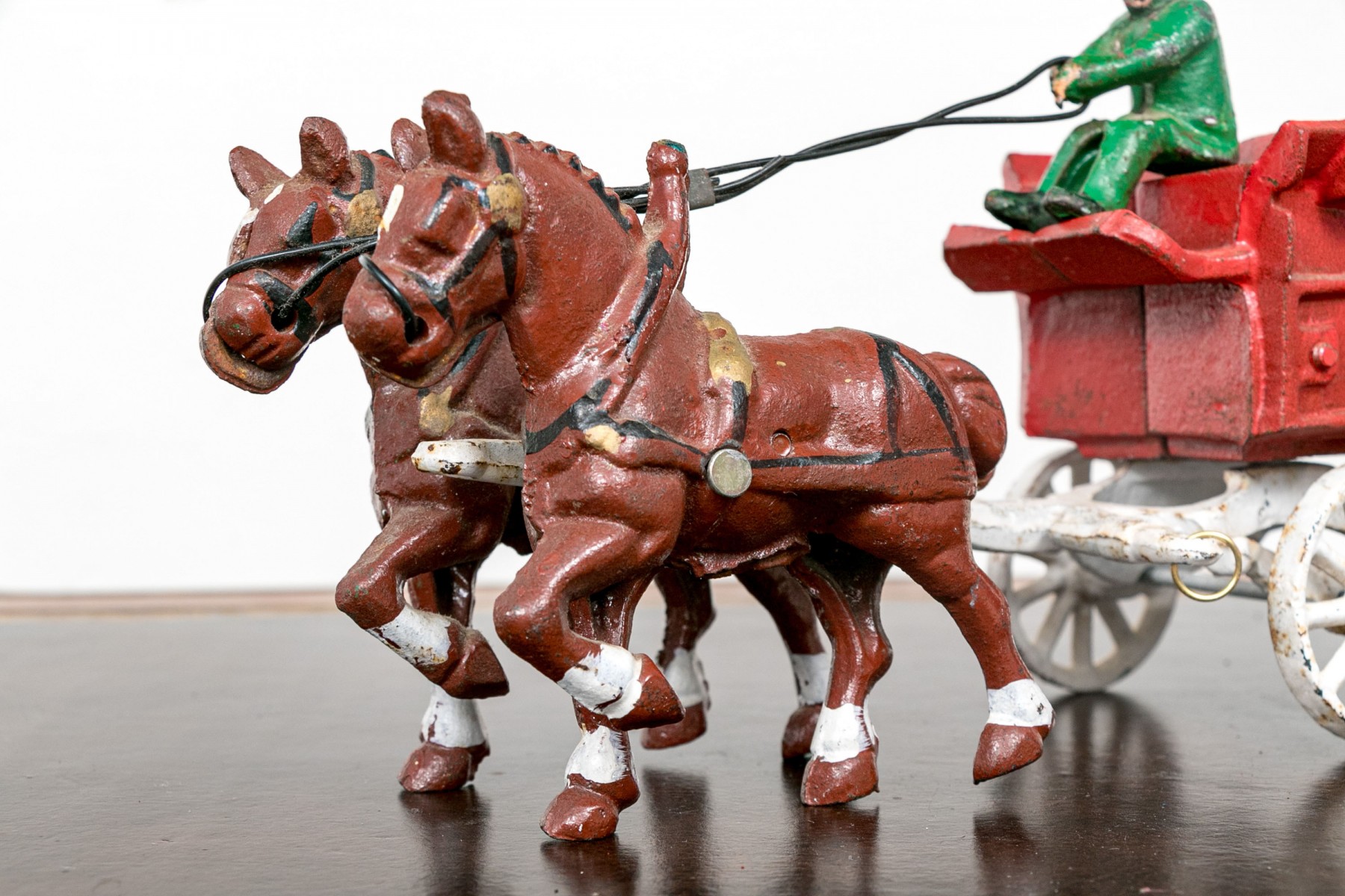With the long red finished pull cart with white finished "Coca Cola" cast and paint finished to the side of the cart. The cart on four wheels with a driver dressed in green holding a rope that connects the two traditional horses on a white harness.