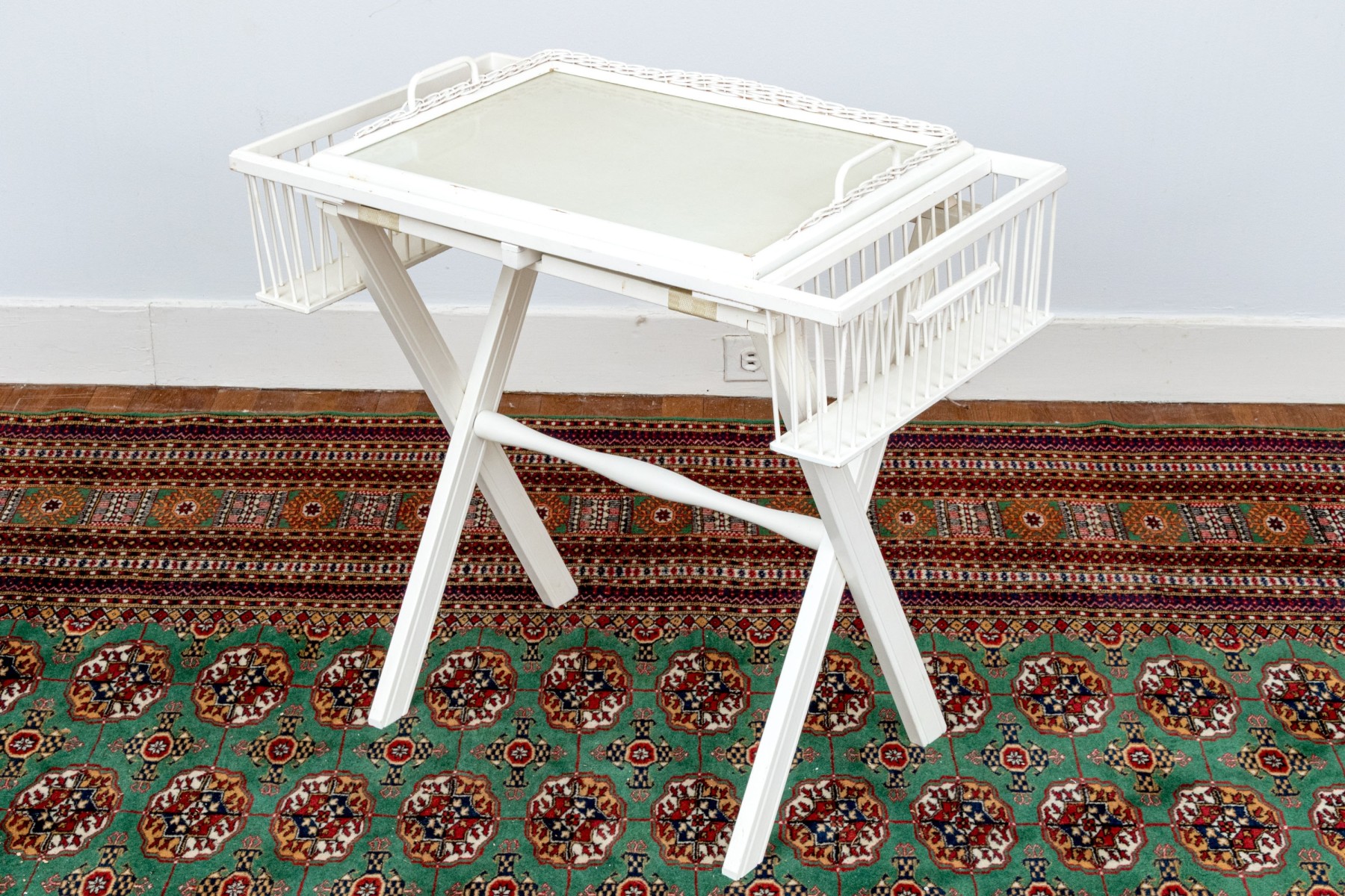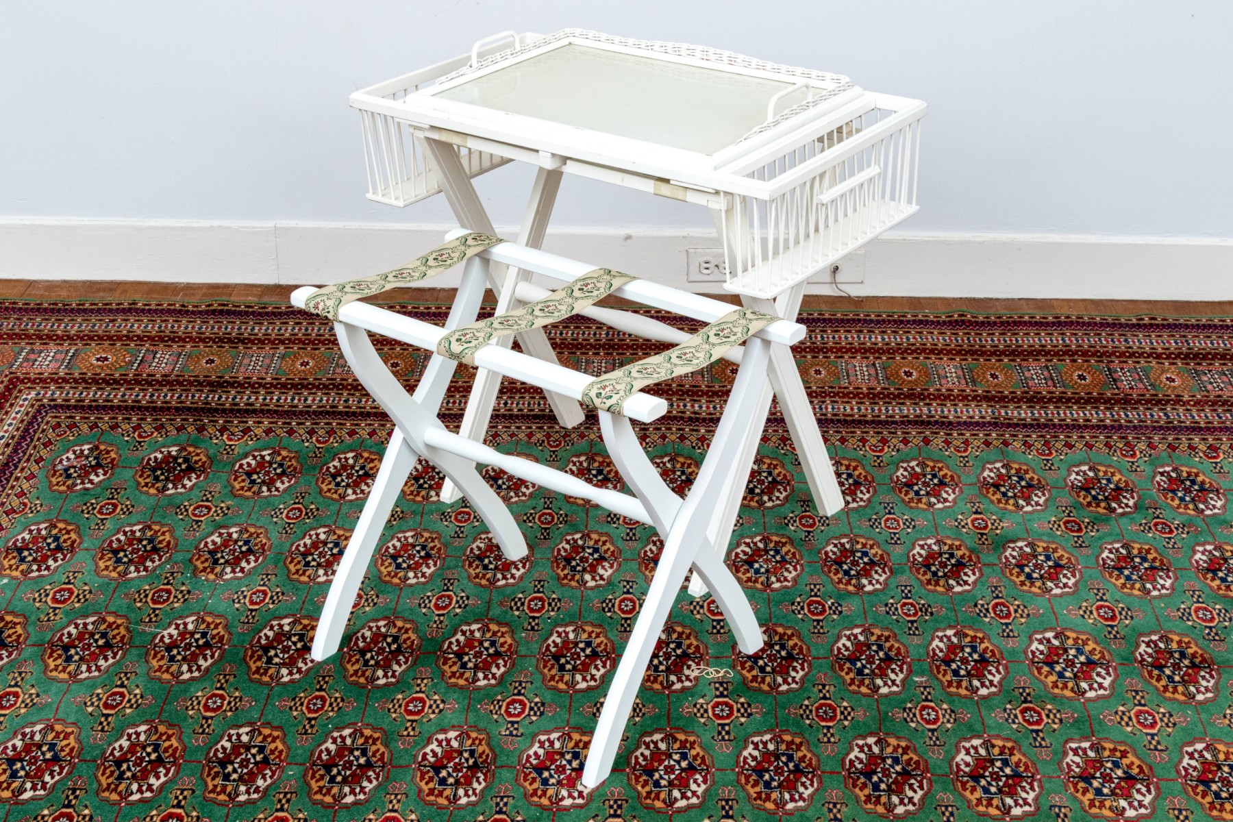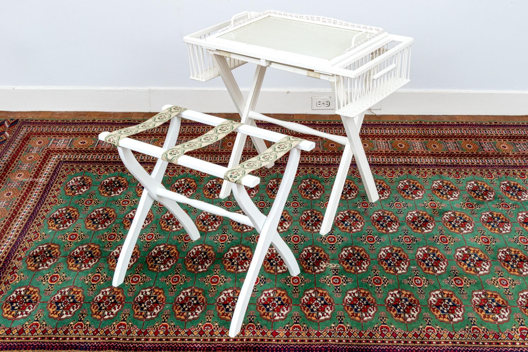 An elegant vintage luggage rack affixed with three straps. Accompanied by a collapsible table with tray top and twin compartments on the sides.