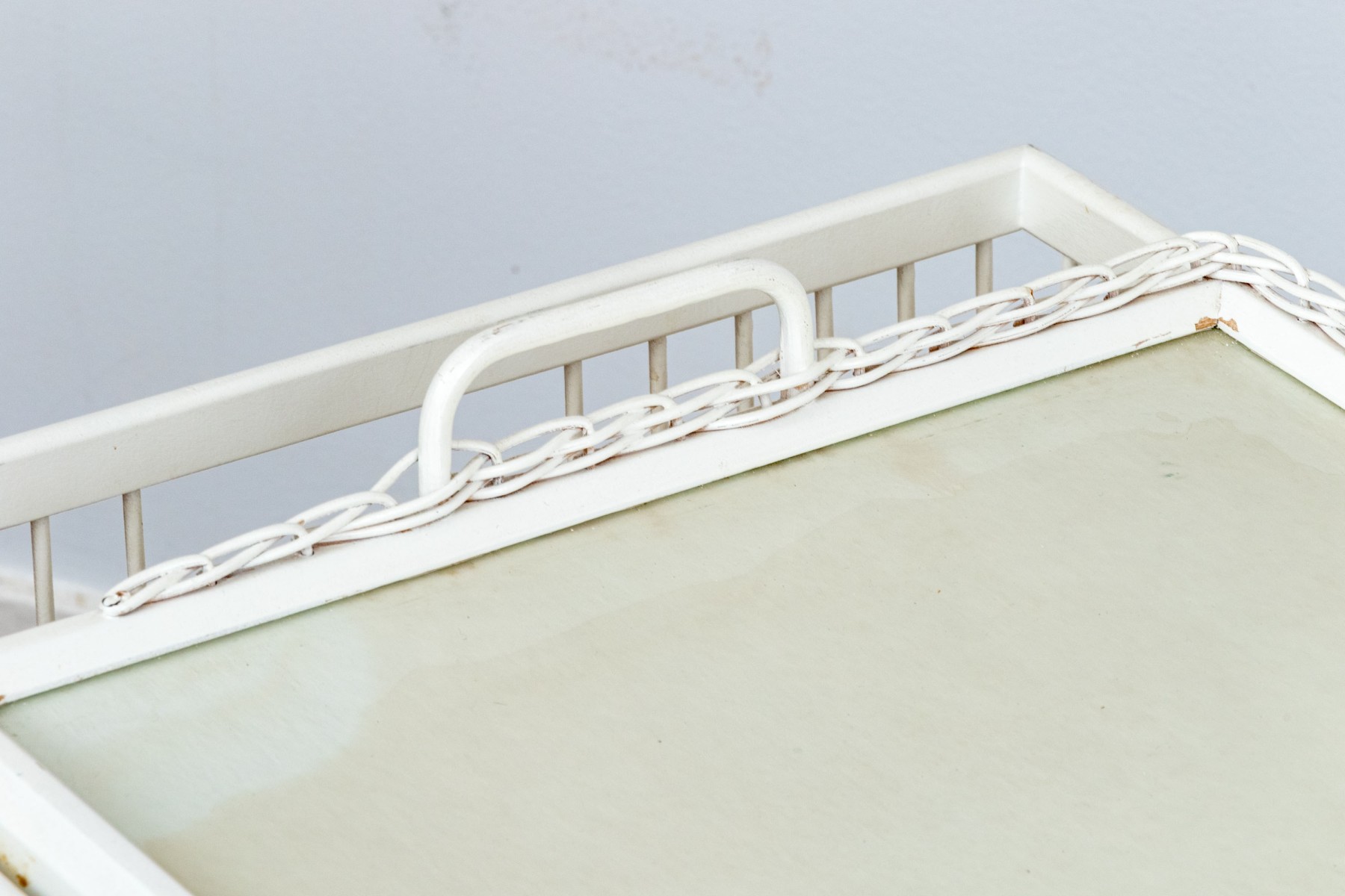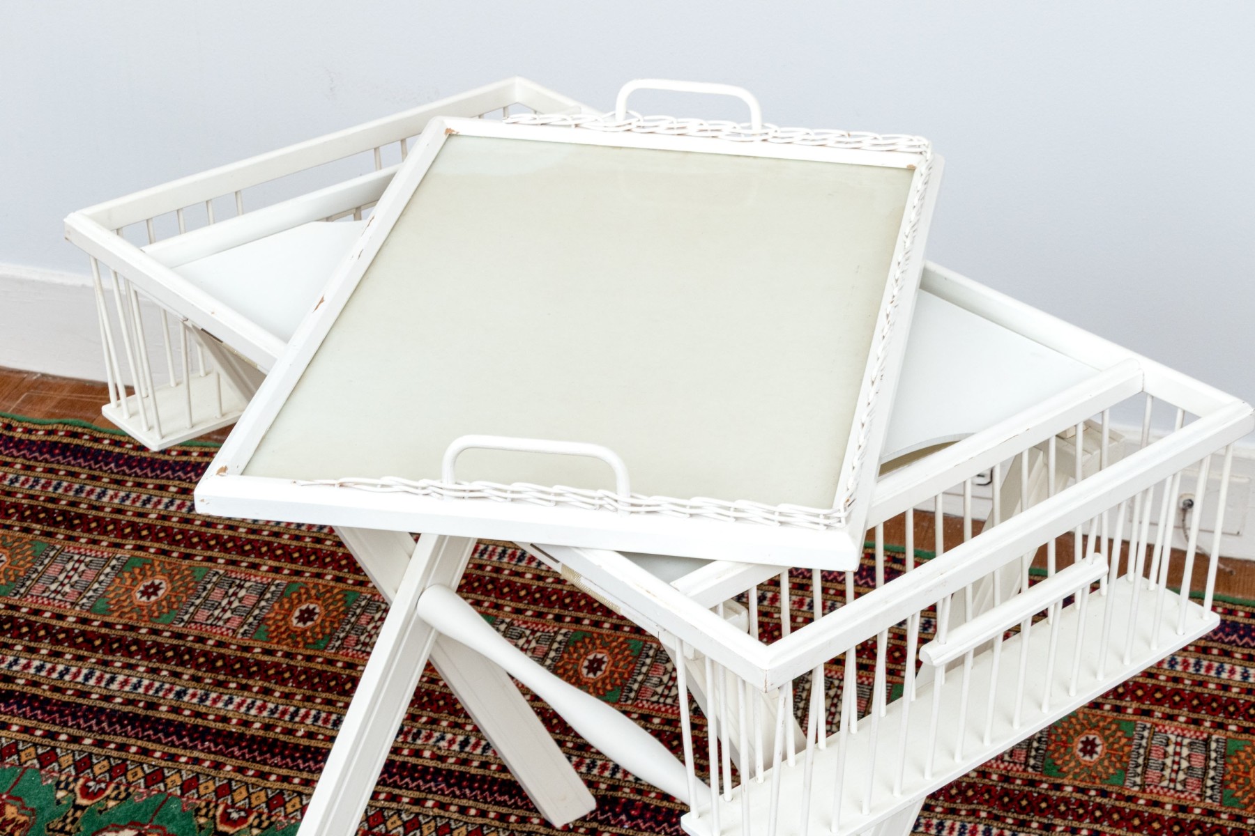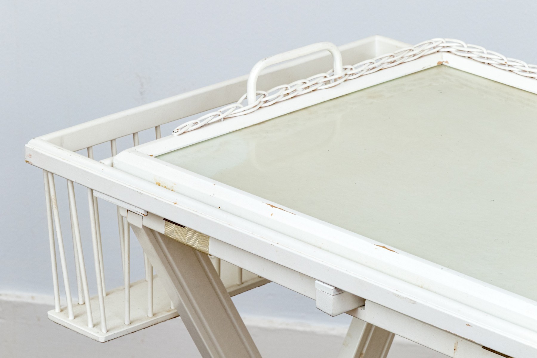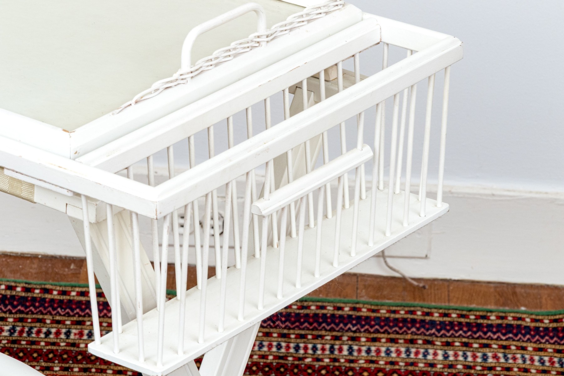 An elegant vintage luggage rack affixed with three straps. Accompanied by a collapsible table with tray top and twin compartments on the sides.
