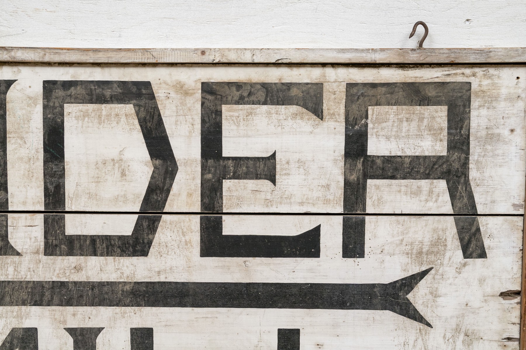 Constructed with panels and painted white with black lettering on both sides. Hooks on the top for hanging.
