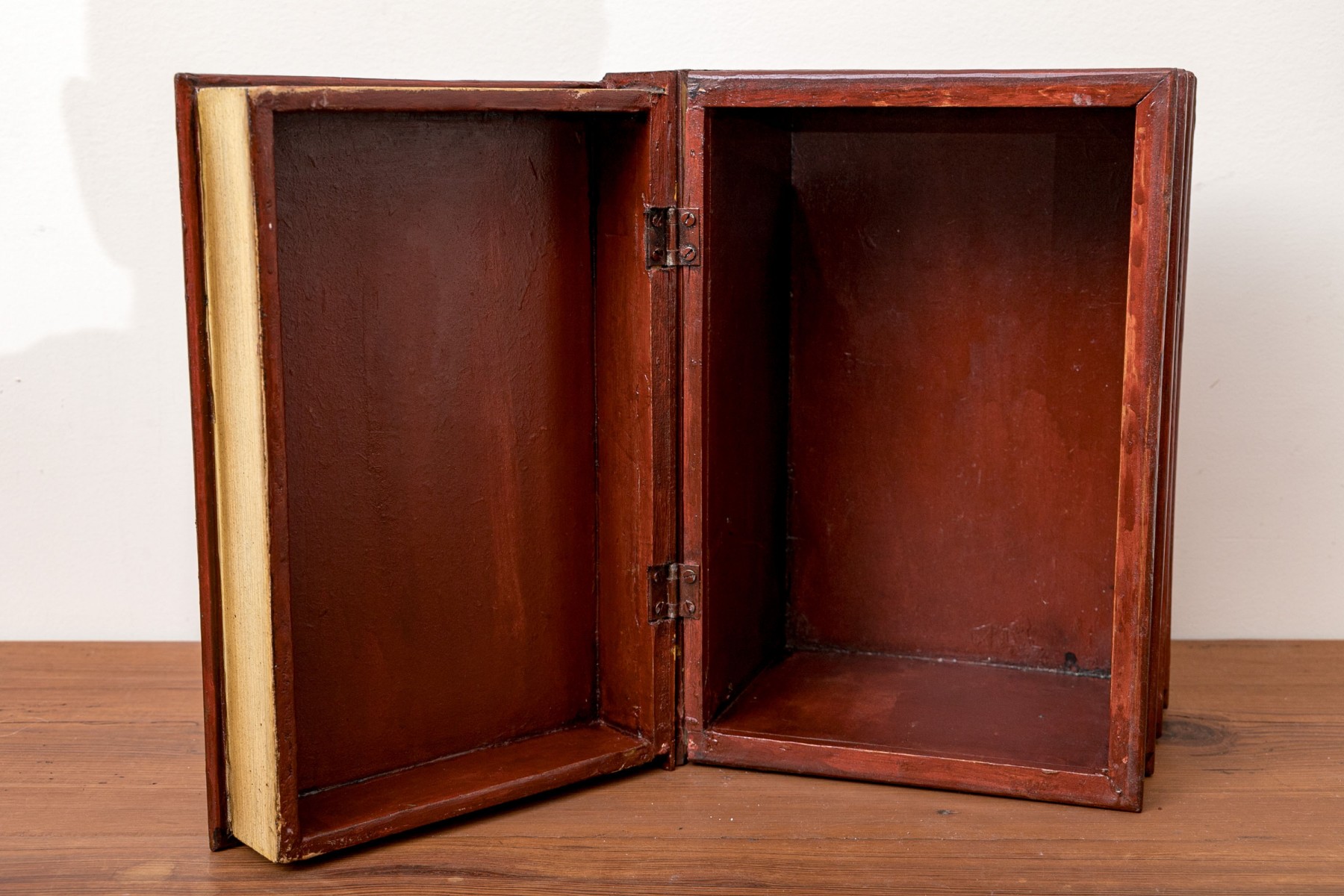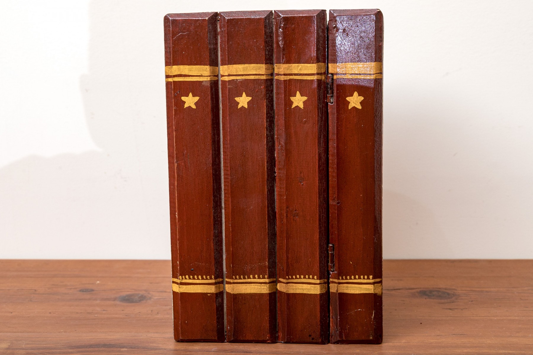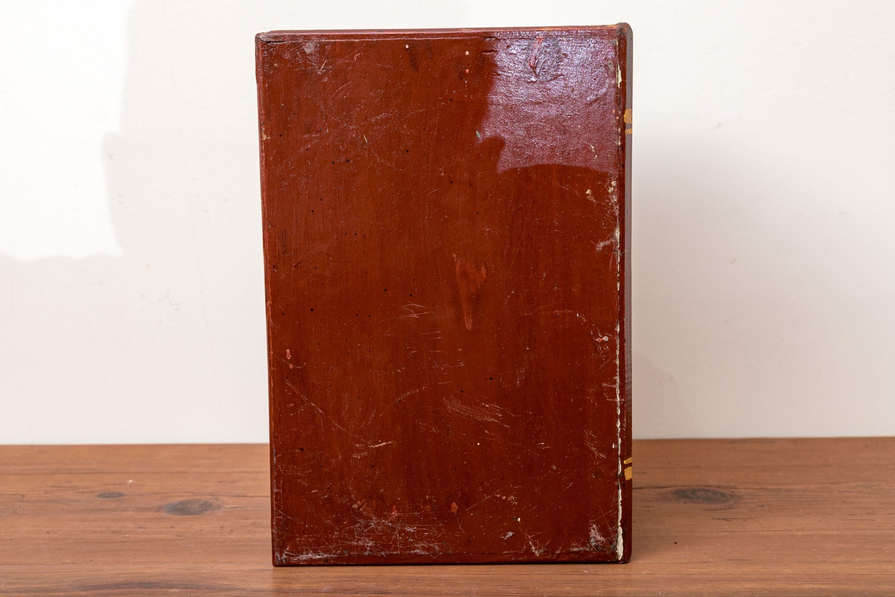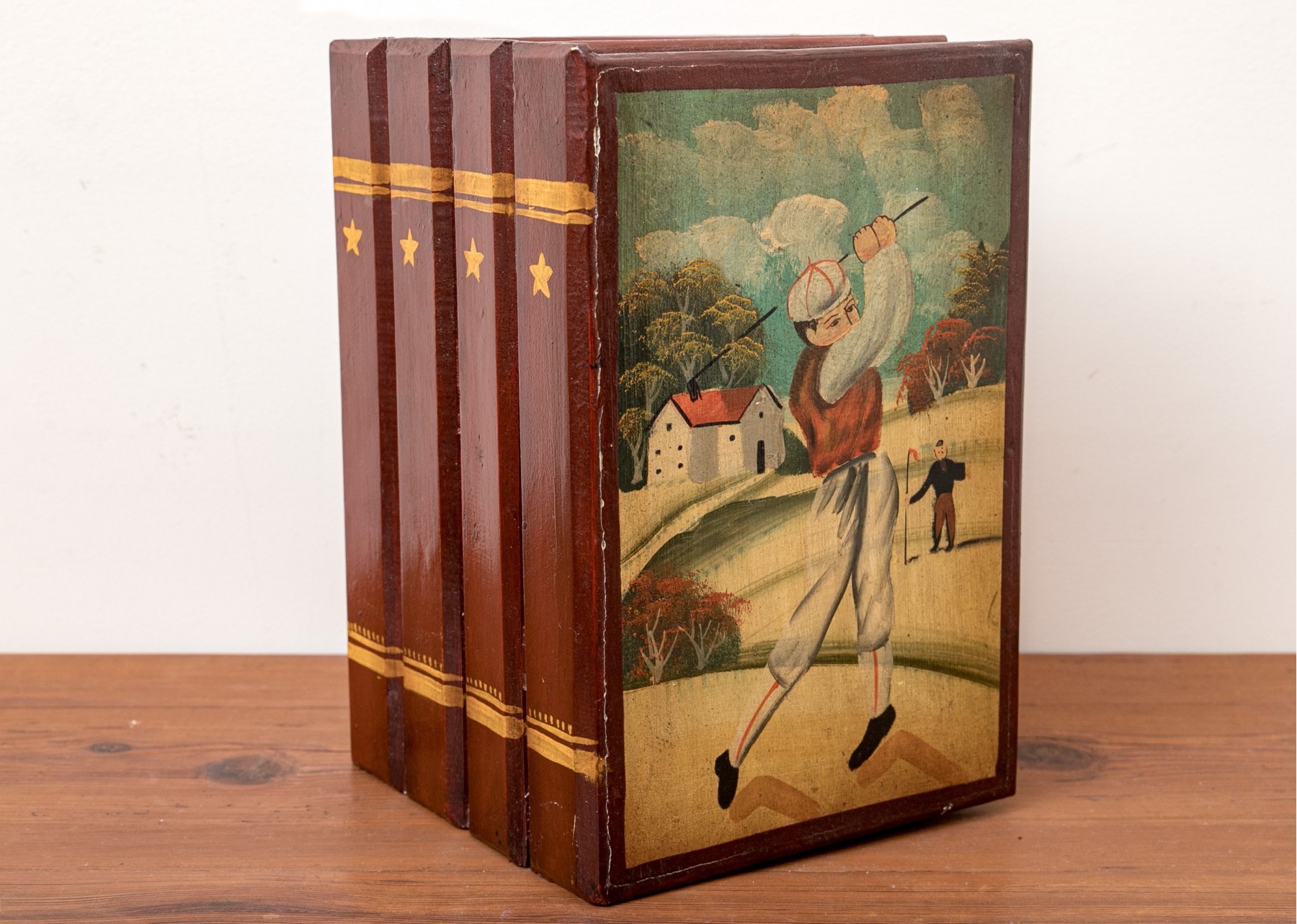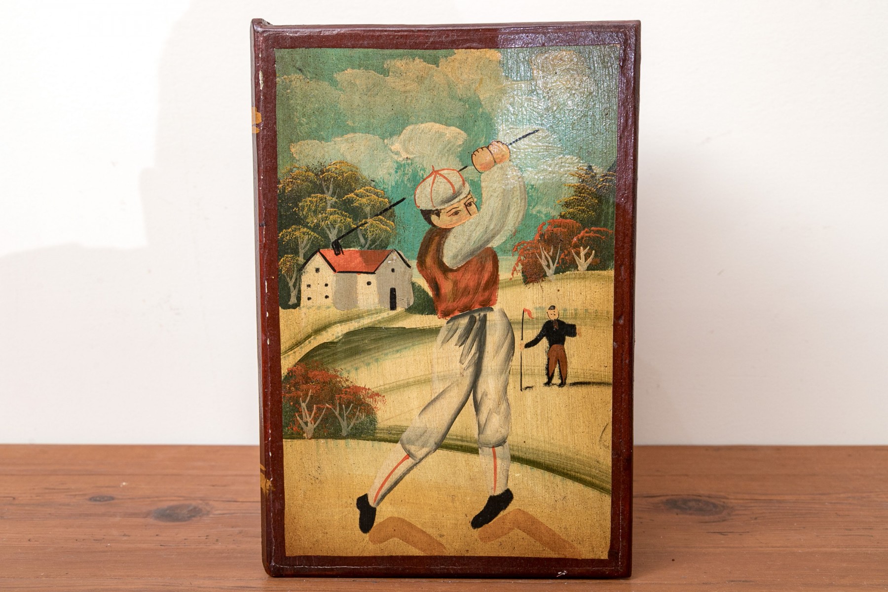 Vintage painted wooden book-form tabletop chest. Giving the appearance of four stacked, red books, the front cover bears a painted image of an early 20th century golf scene. The lid opens to reveal storage compartment.