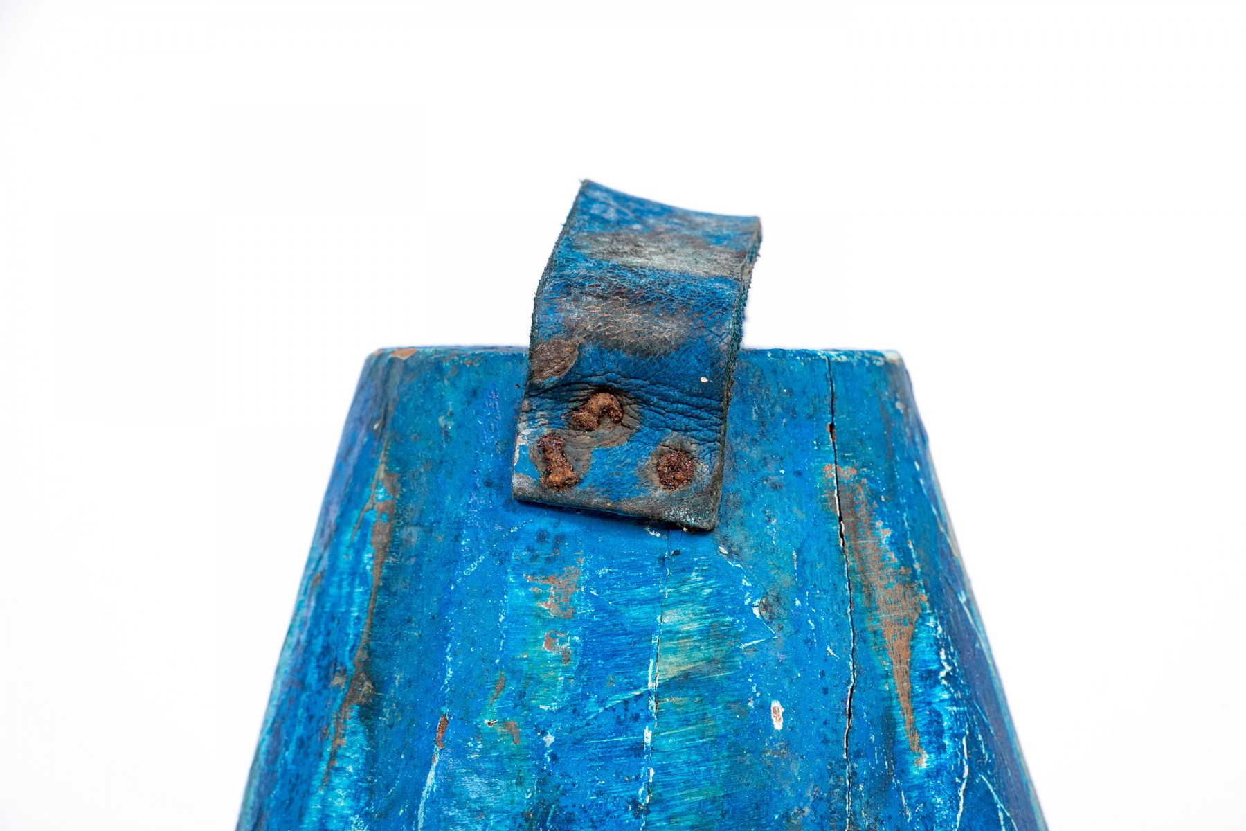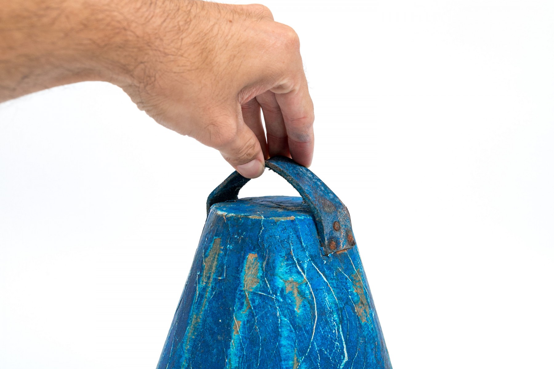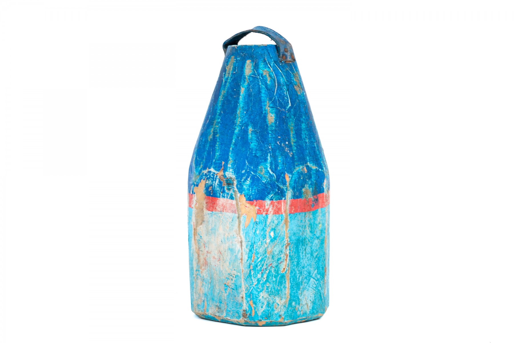 A faceted shape painted two- tone blue with a red stripe and a leather strap on the top.