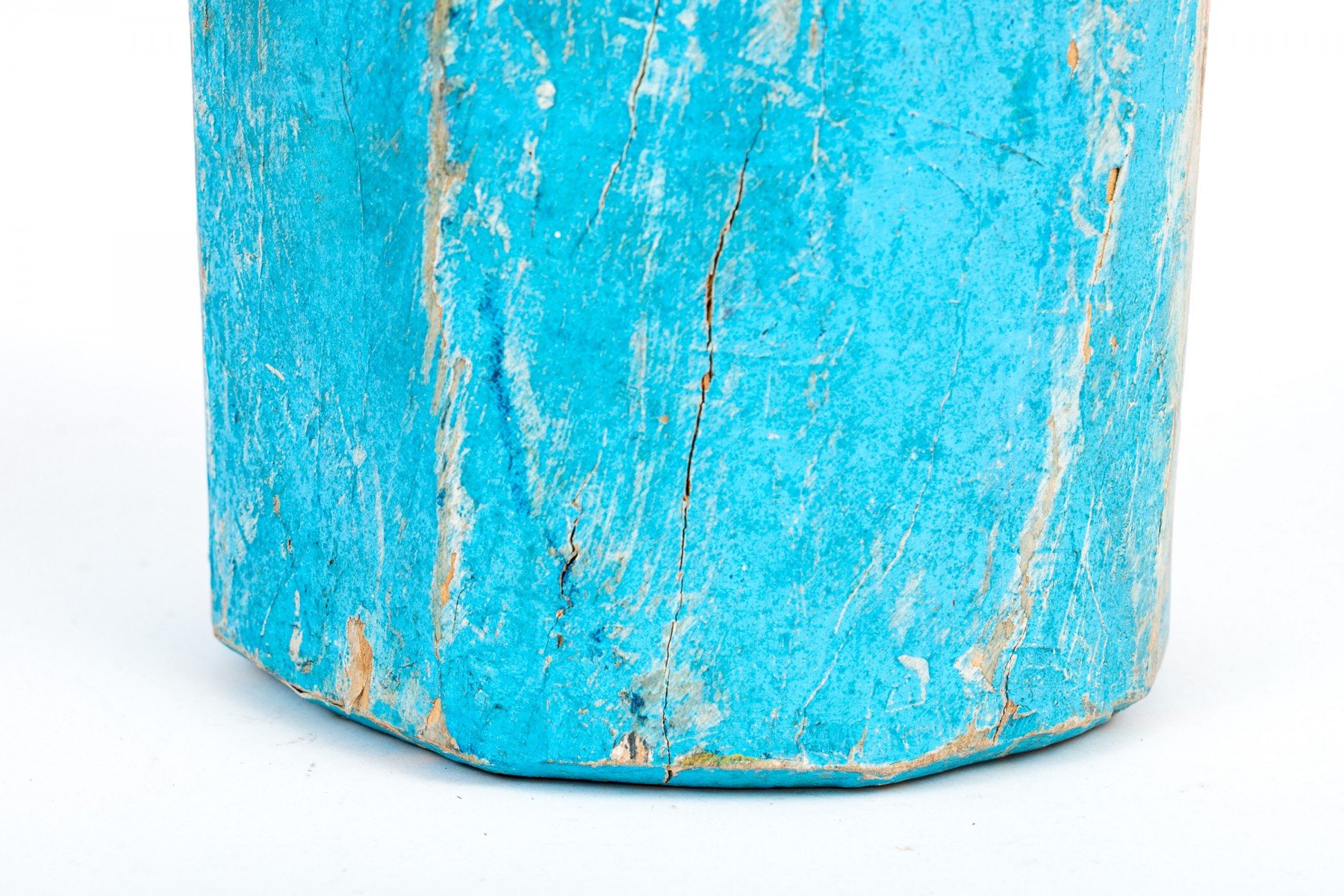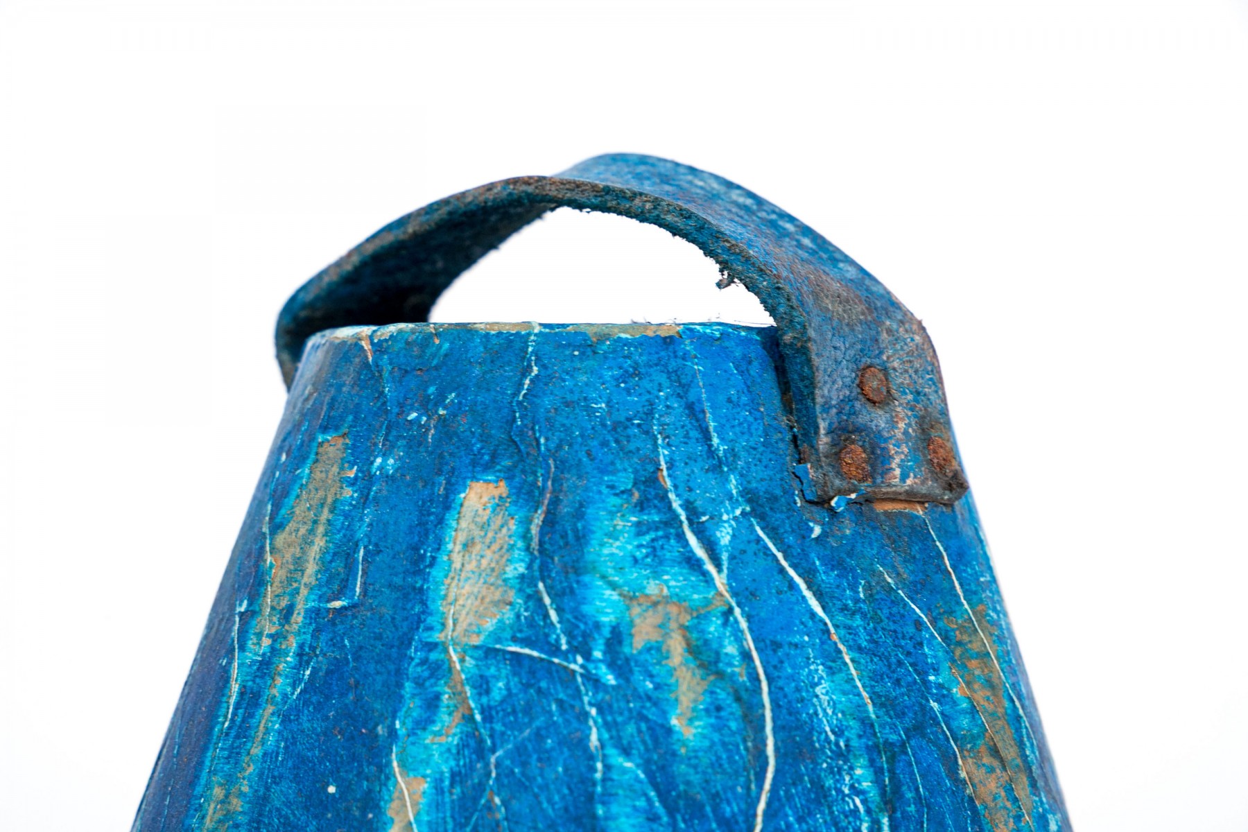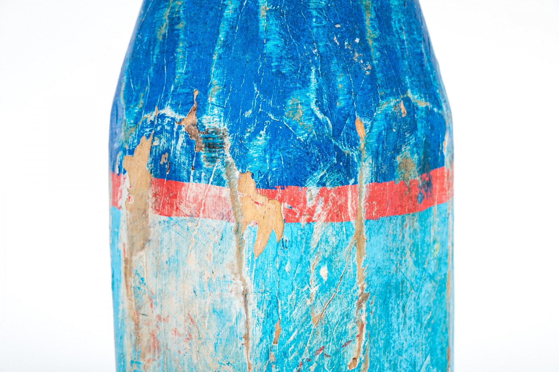 A faceted shape painted two- tone blue with a red stripe and a leather strap on the top.