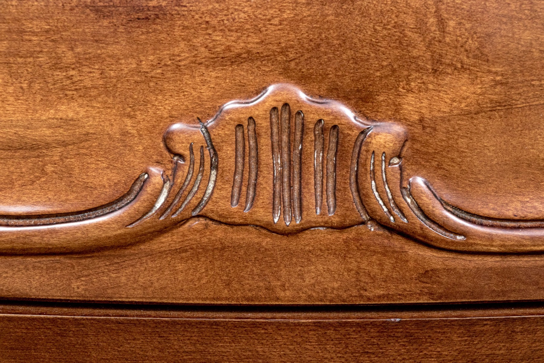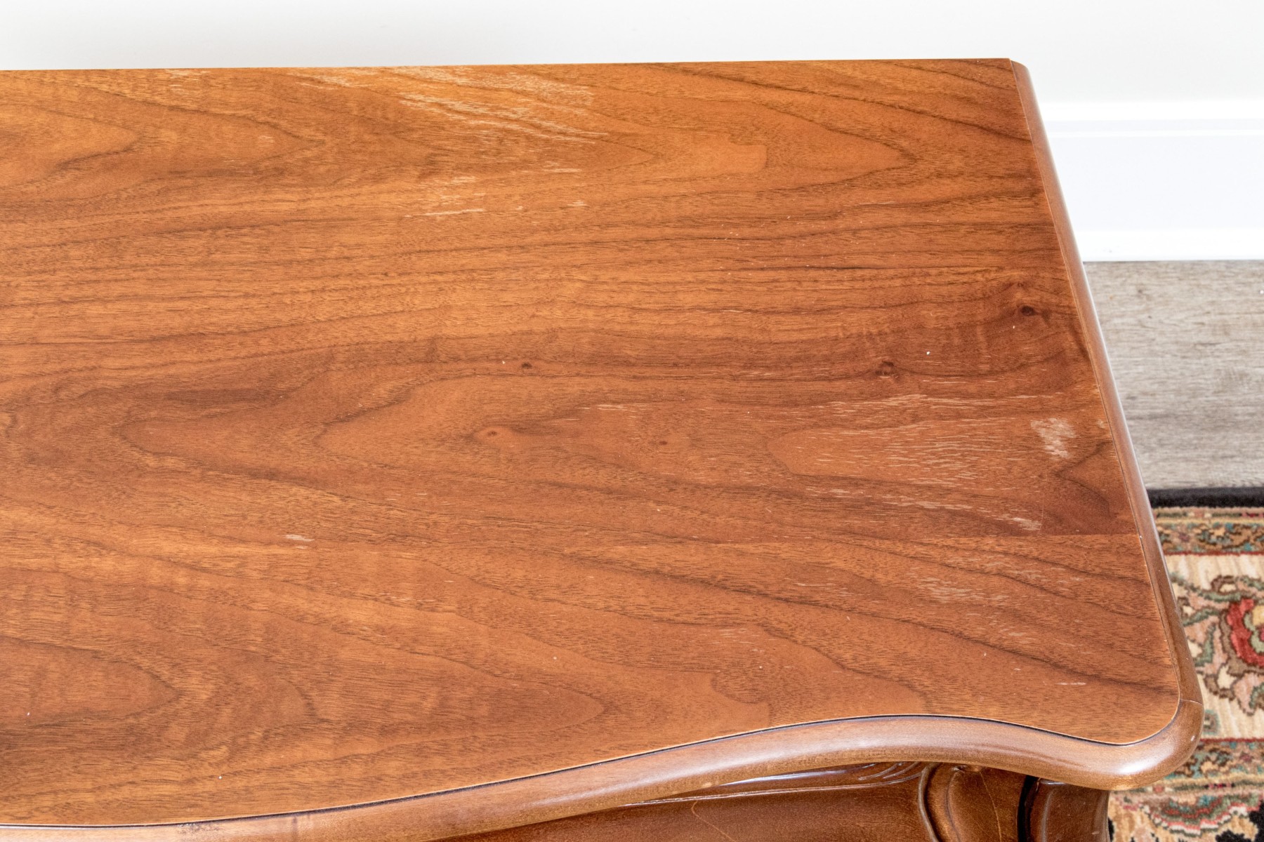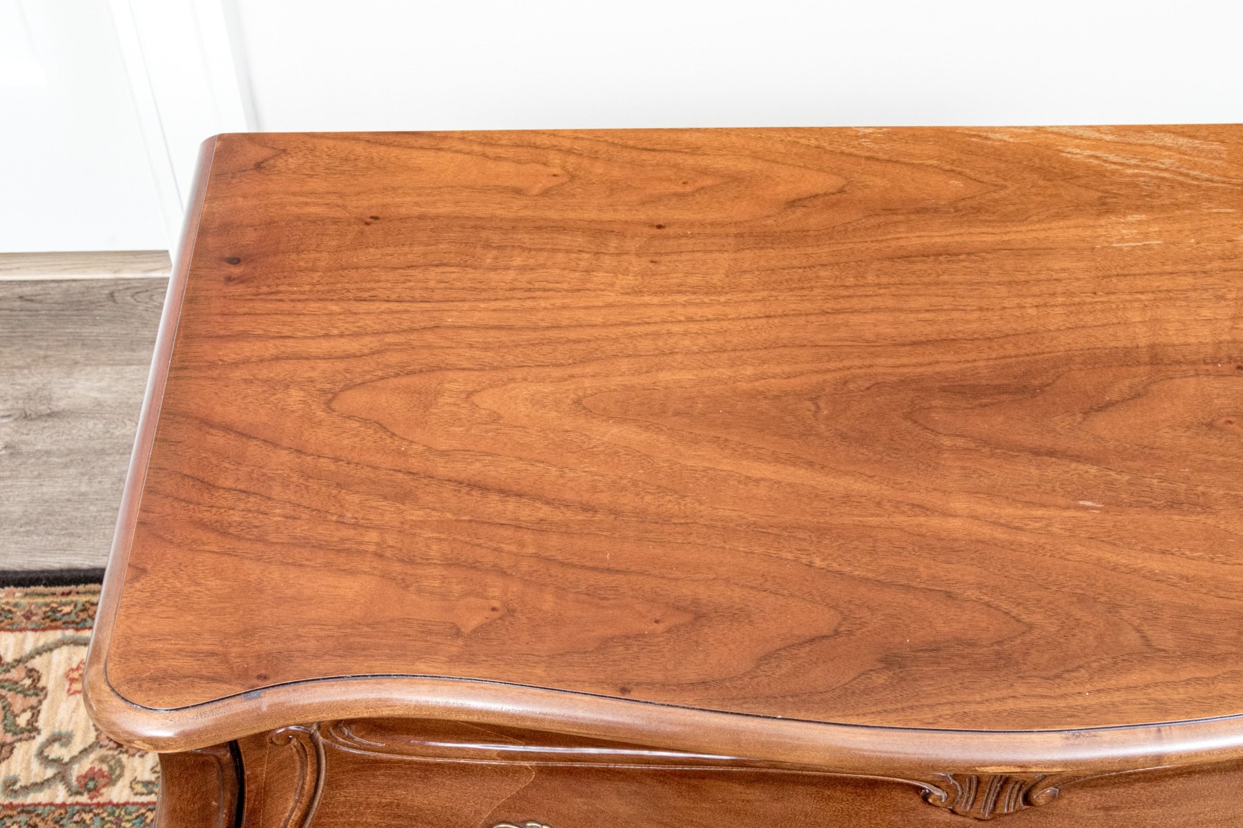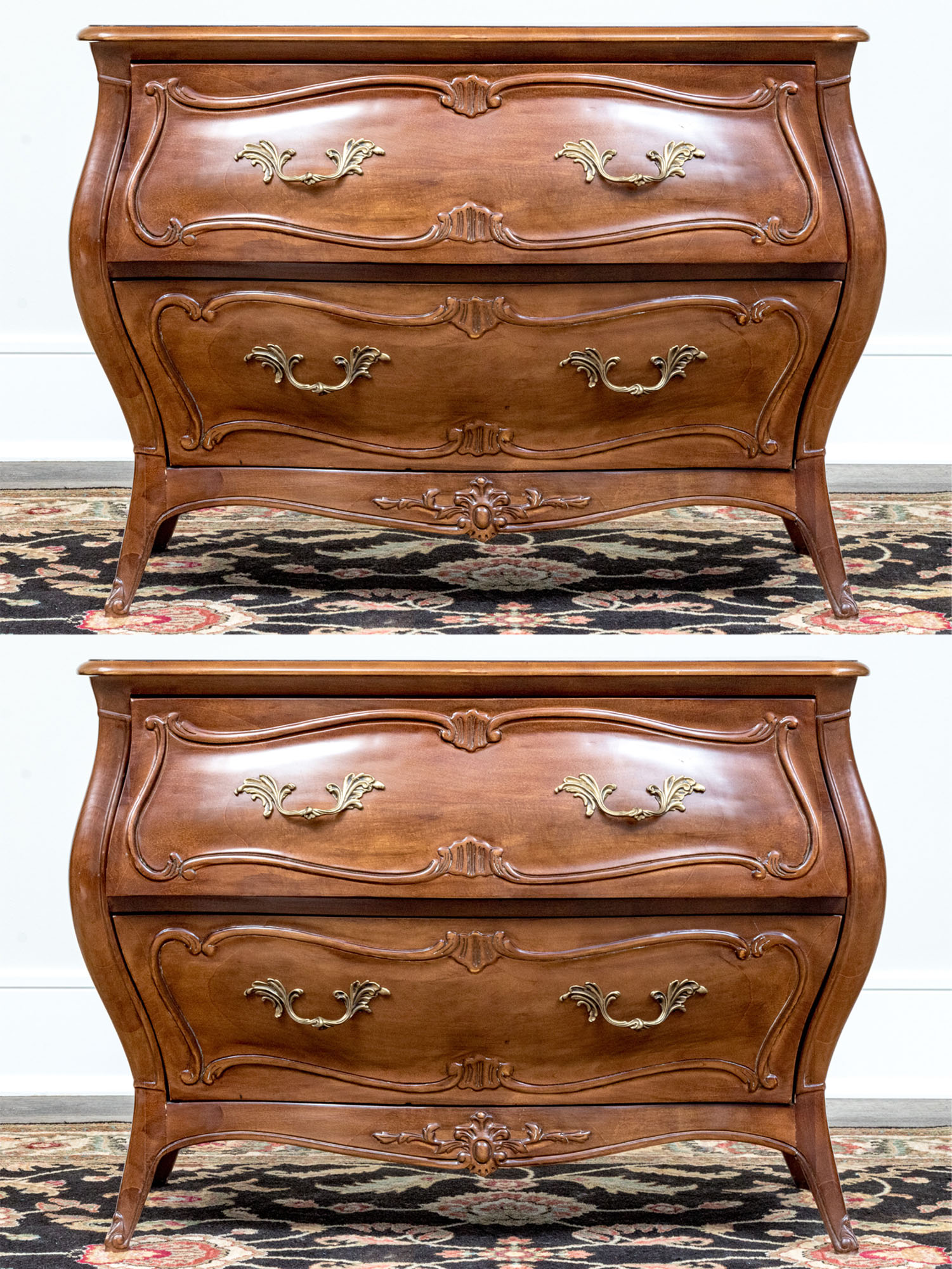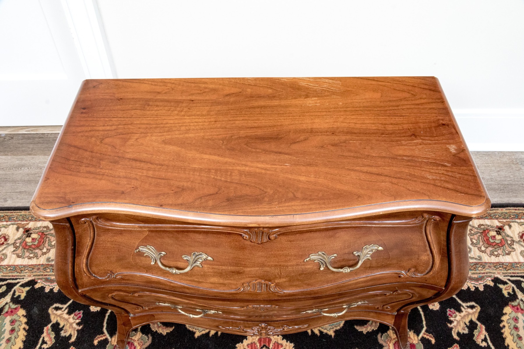 A fabulous vintage pair of Henredon Louis XV style walnut finished bedside chests, each supported on four short splayed legs, the elegant bombe form and curved body is surmounted with rectangular tops with classical scalloped fronts. Each bedside chest boasts two drawers, each with ornate brass hardware. and a wonderful overall visual aesthetic.