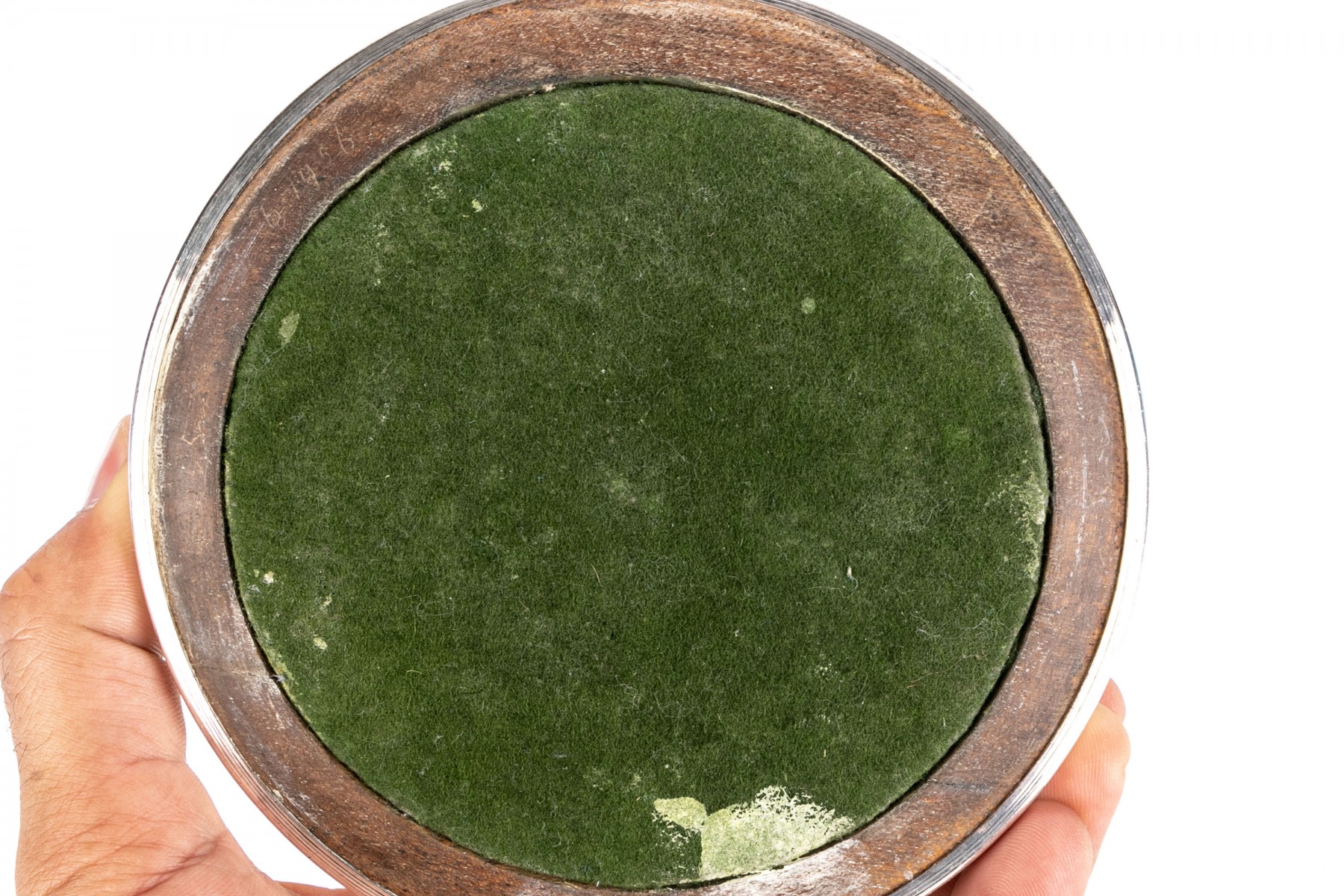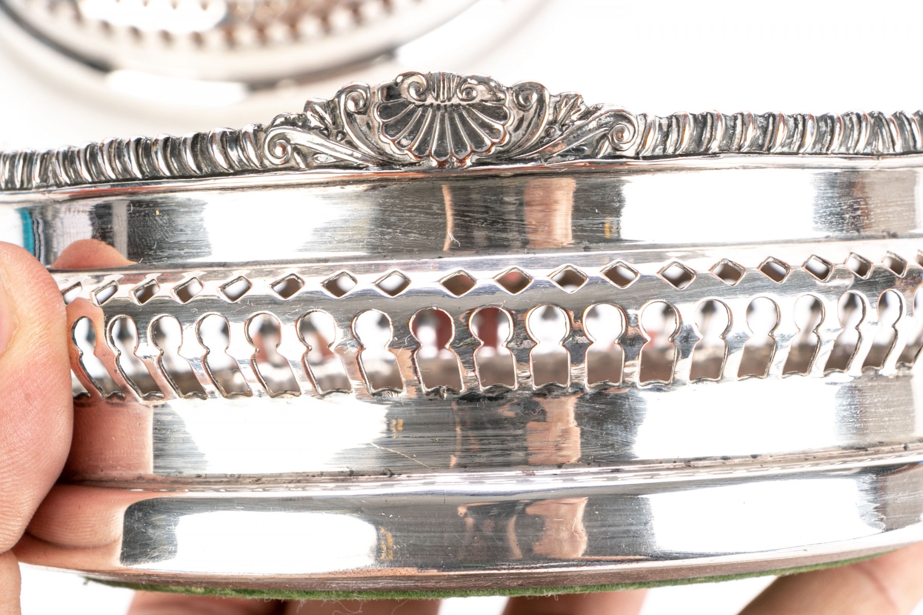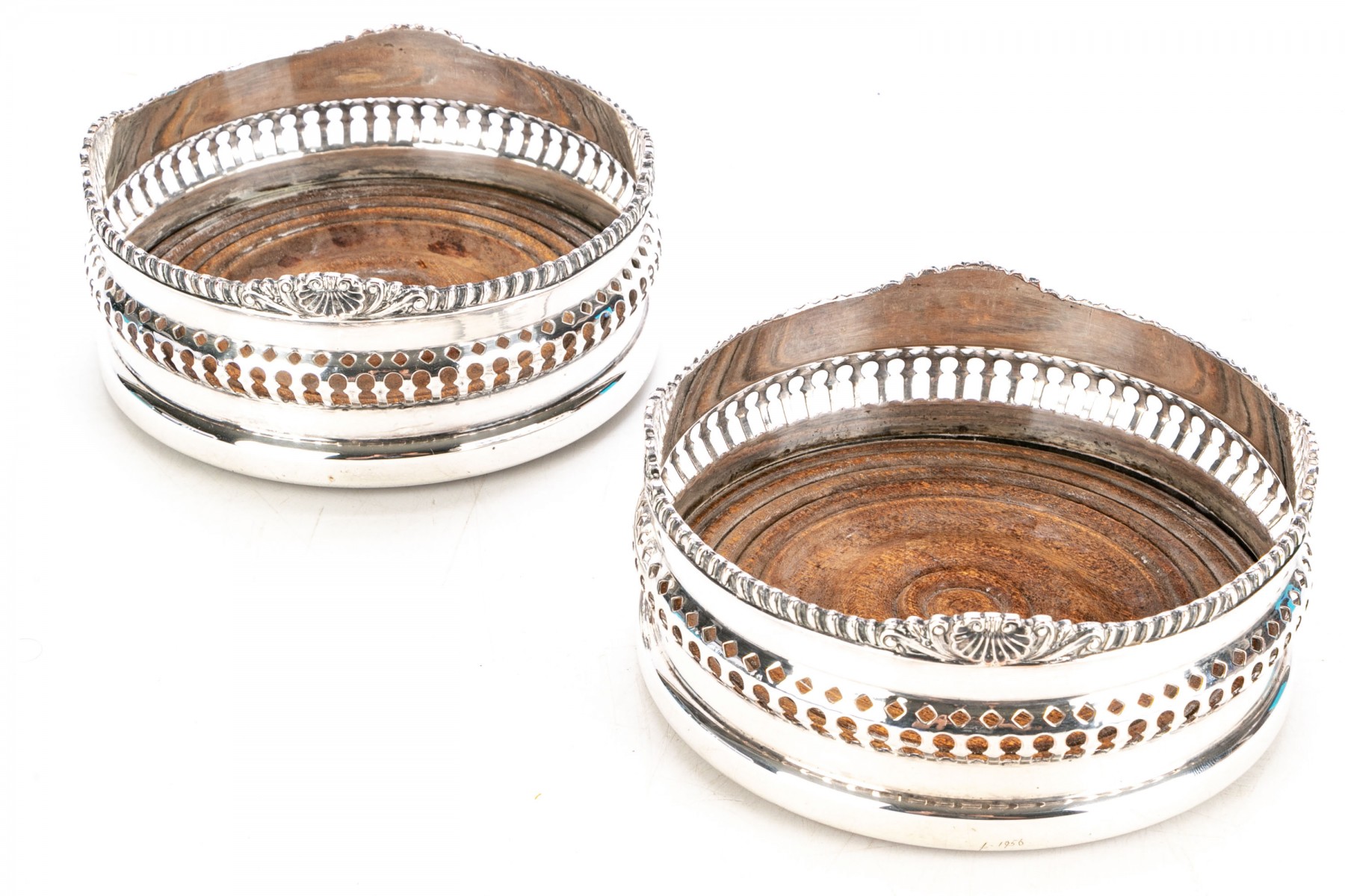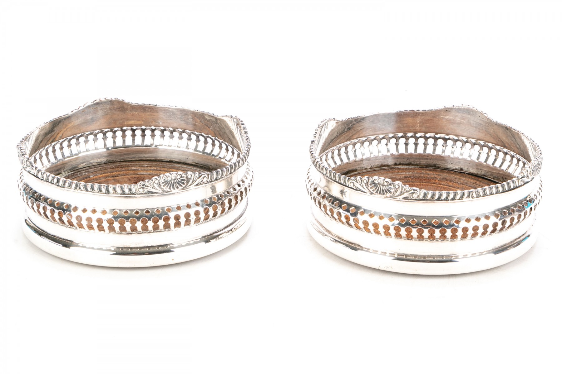Vintage pair of silver plate pierced bottle coasters. Scrolled rim with shell embellishment. Pierced sides over a reeded wooden base. Dated 1956.
