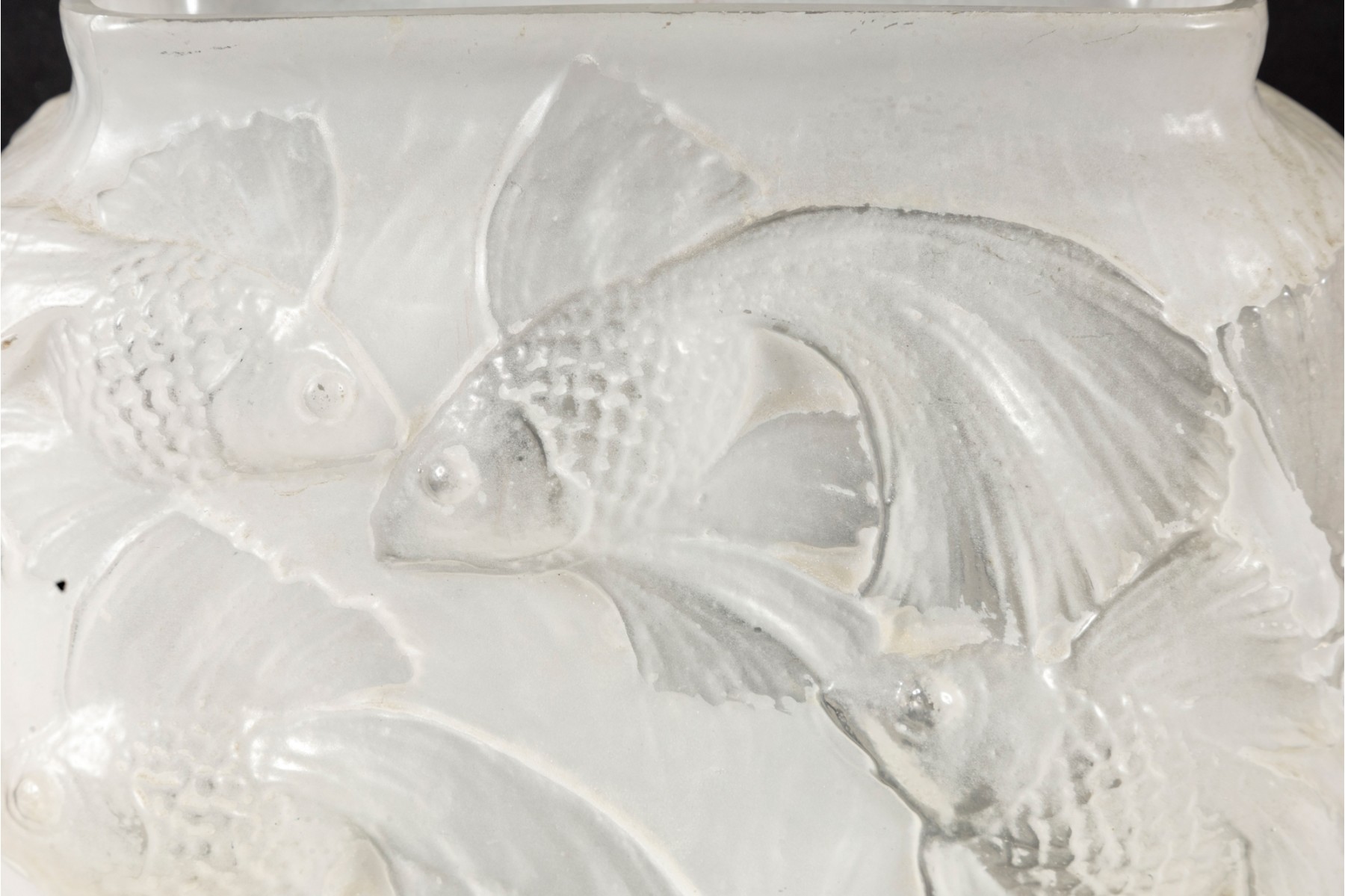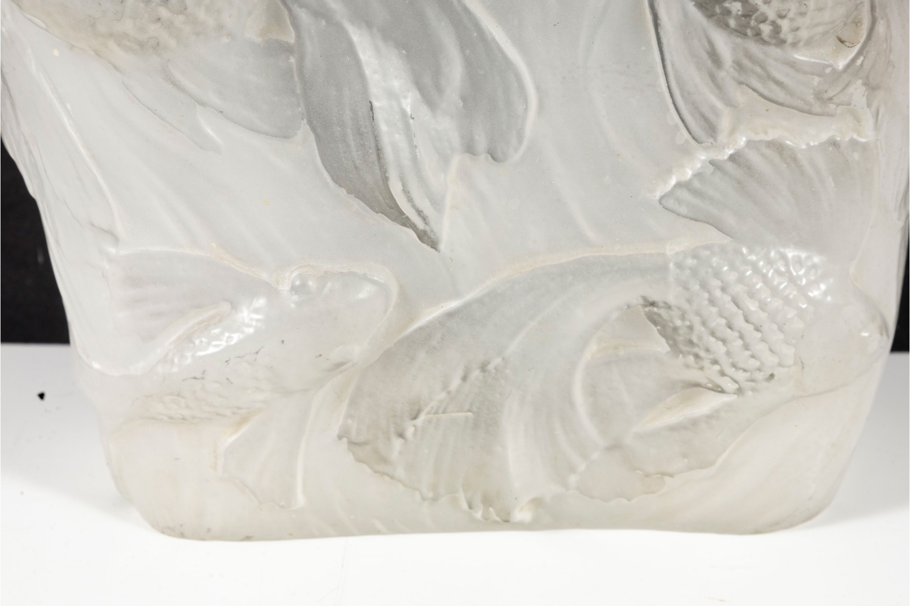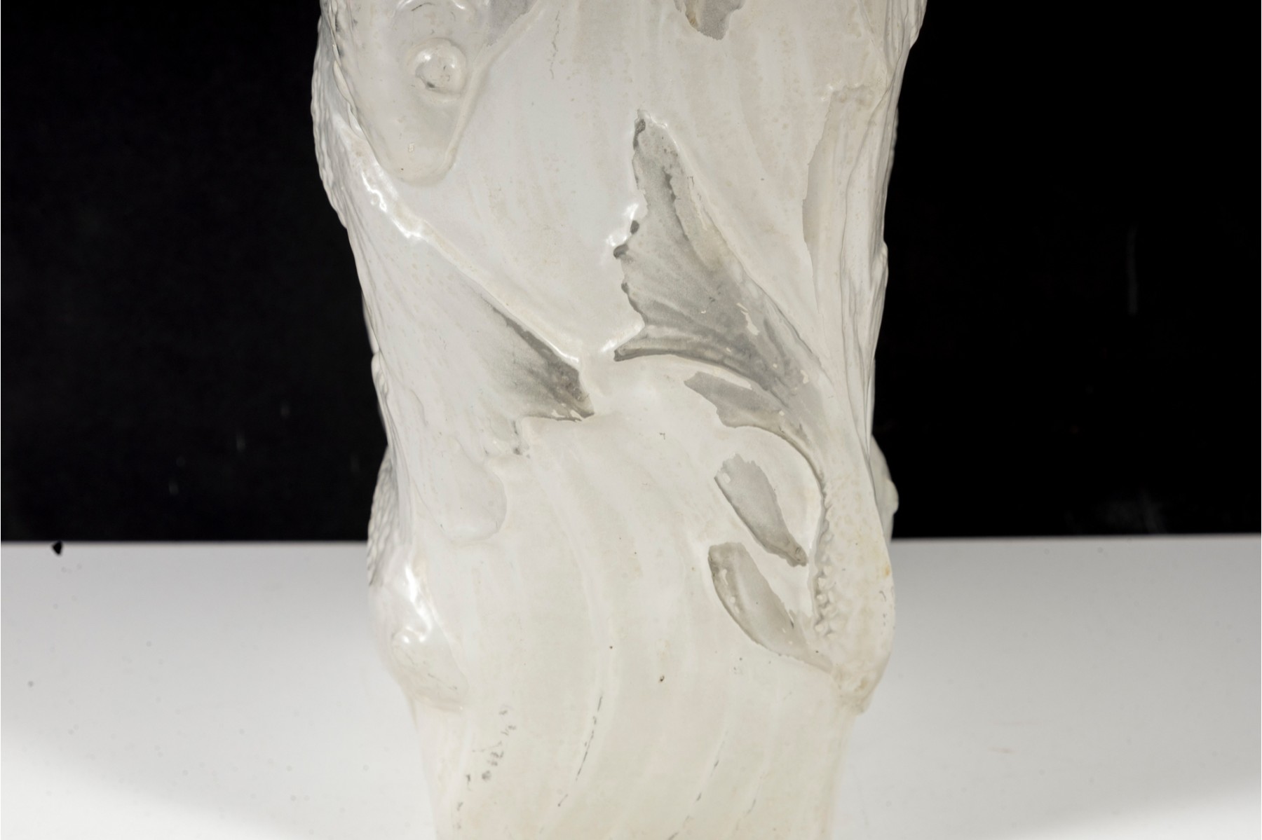In the mid-20th century, Phoenix Glass released this Koi fish relief planter mold in a variety of tints and colors. Shown here is a variant in white, perfect for neutral decor.