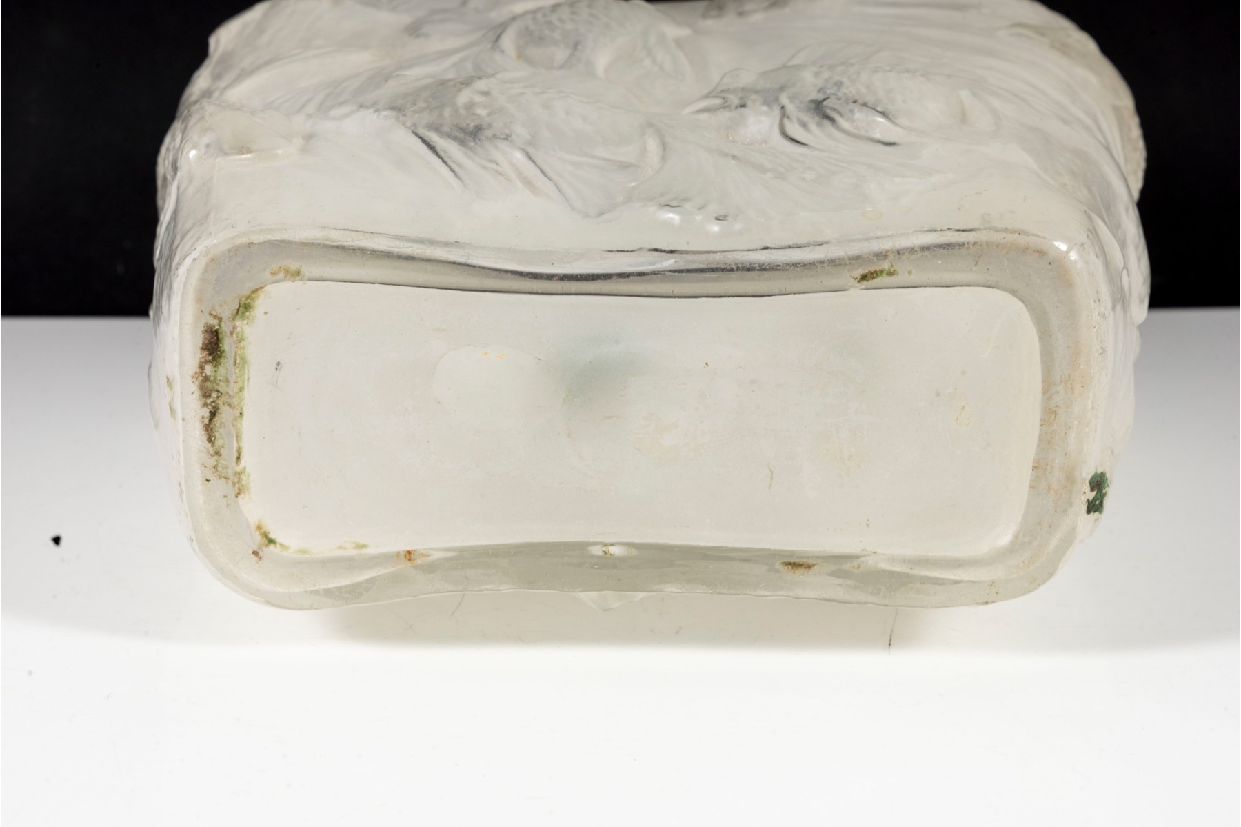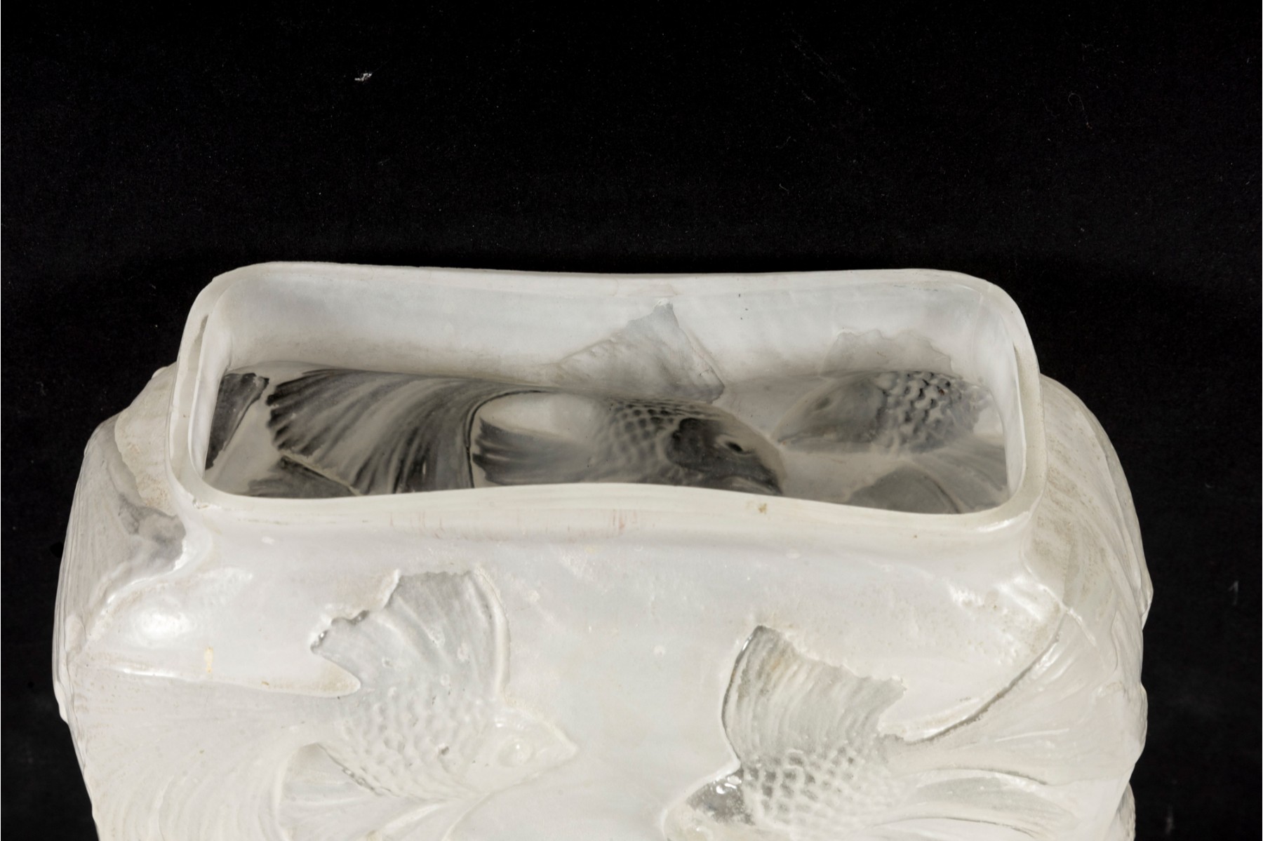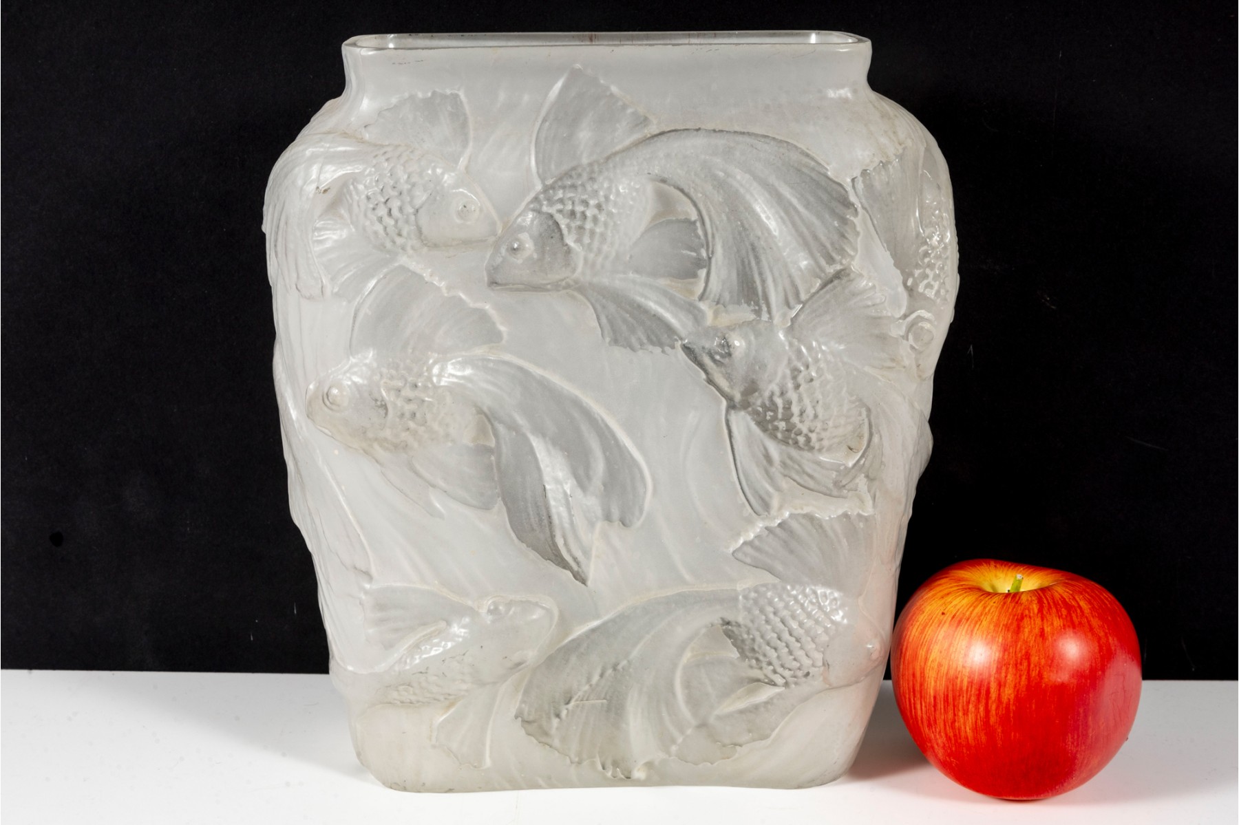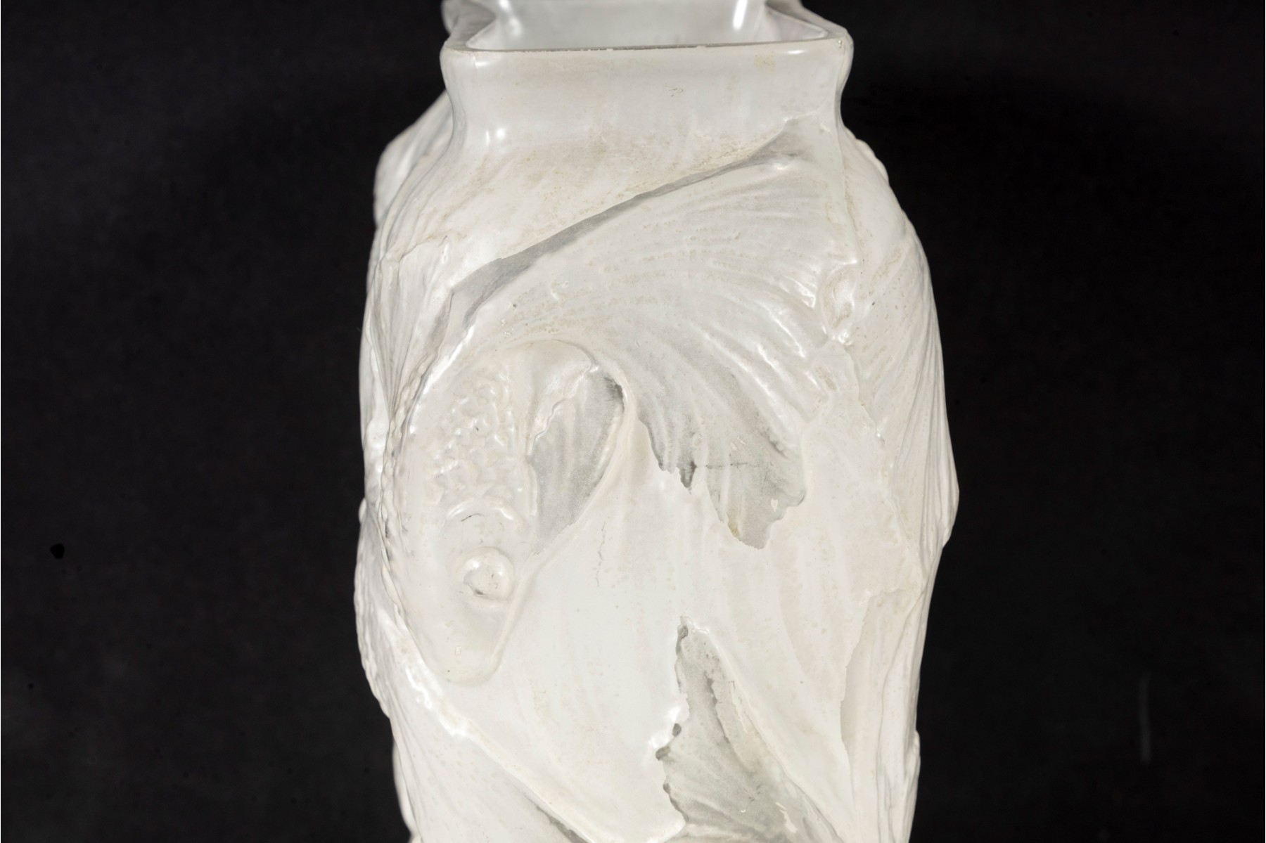 In the mid-20th century, Phoenix Glass released this Koi fish relief planter mold in a variety of tints and colors. Shown here is a variant in white, perfect for neutral decor.