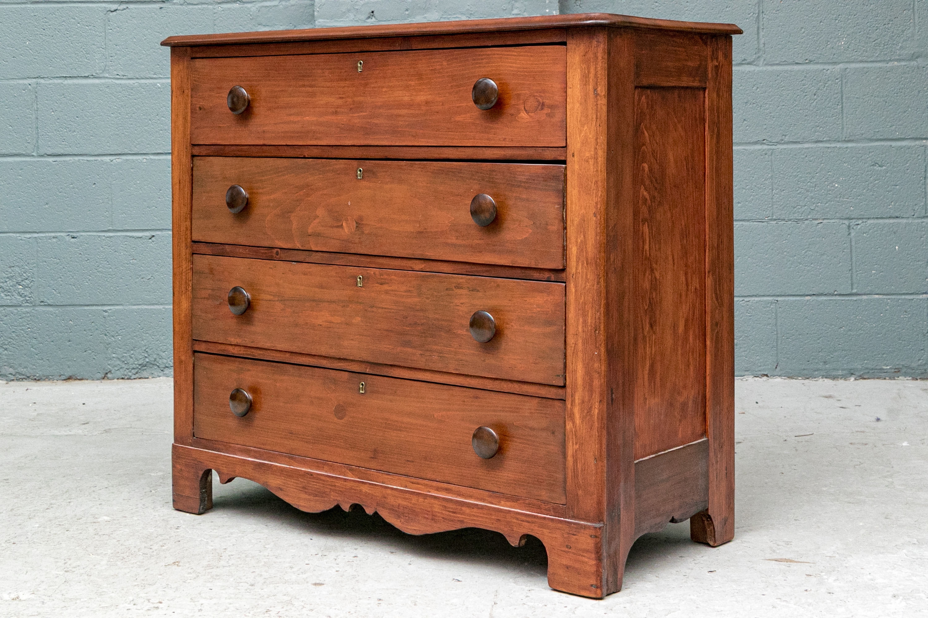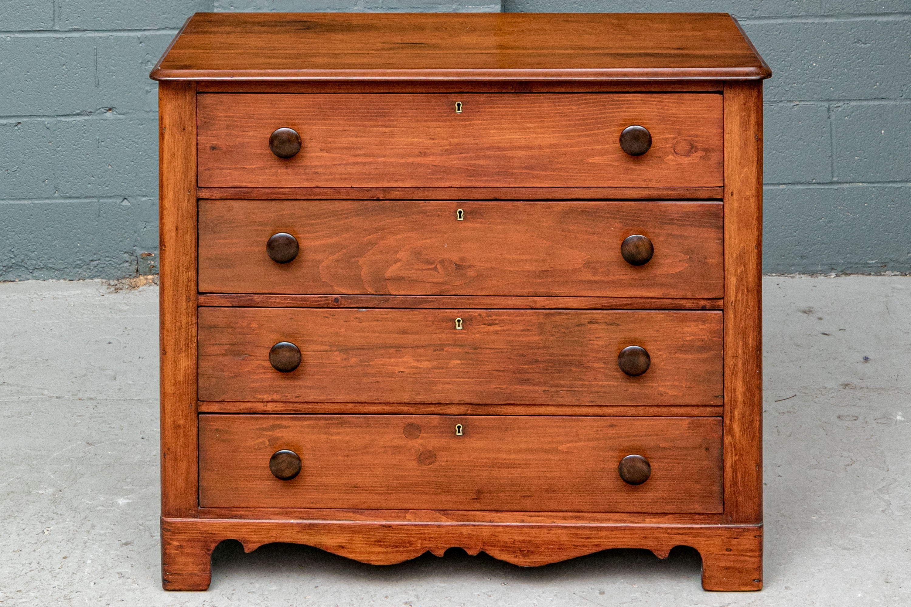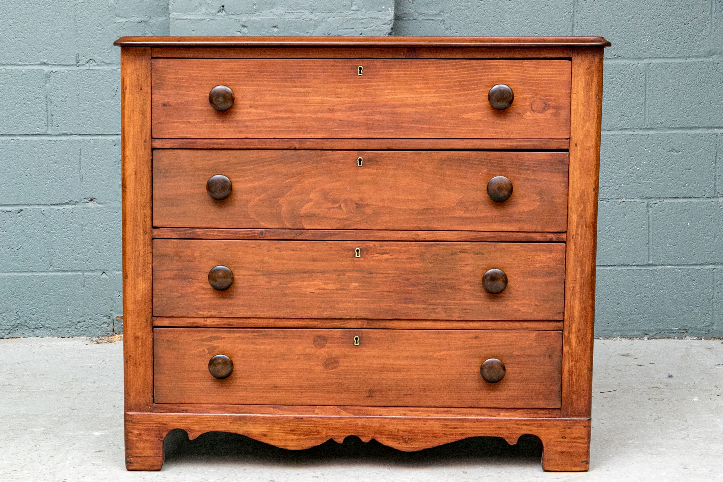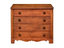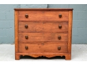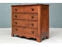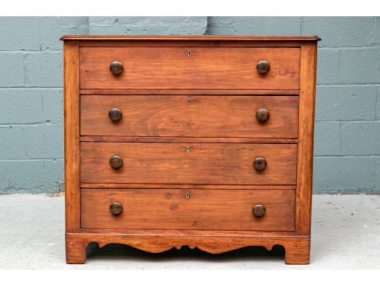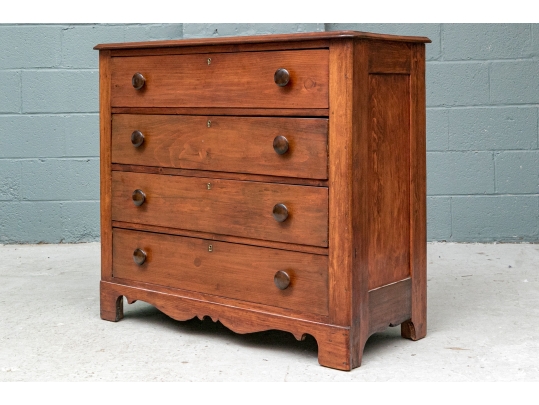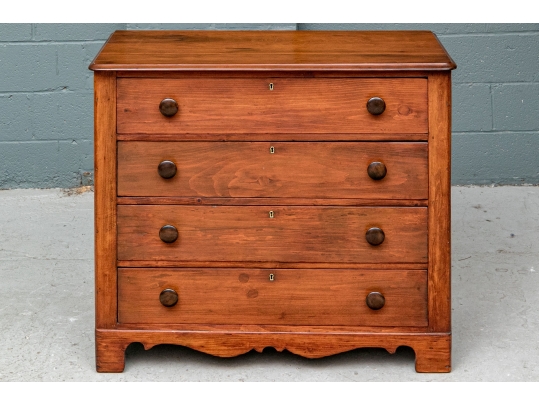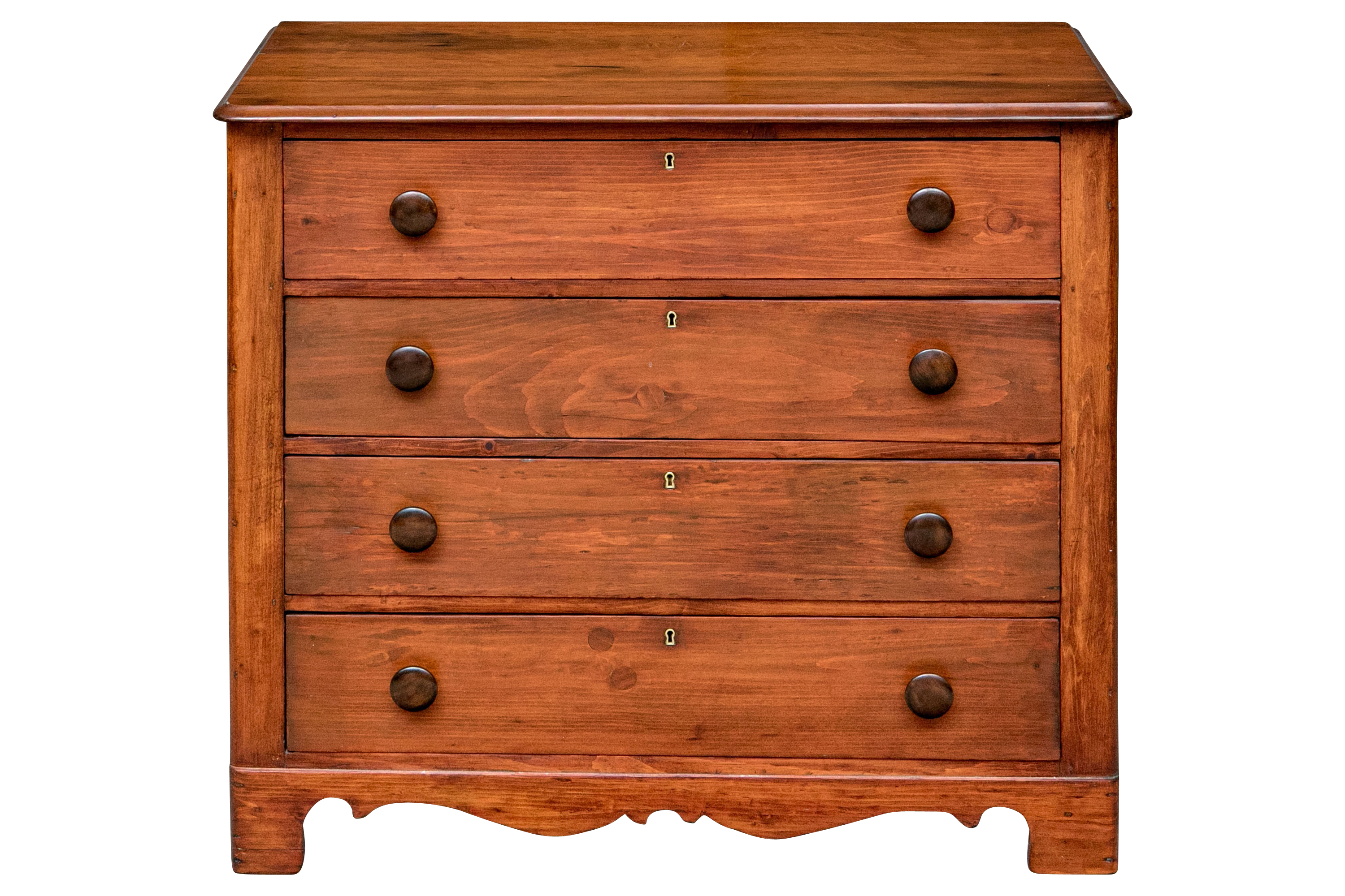 A pine chest with carved top edge and four long drawers with knob pulls. Brass key holes (lacking a key). Recessed sides and raised on a finely carved scalloped skirt rail front and sides.