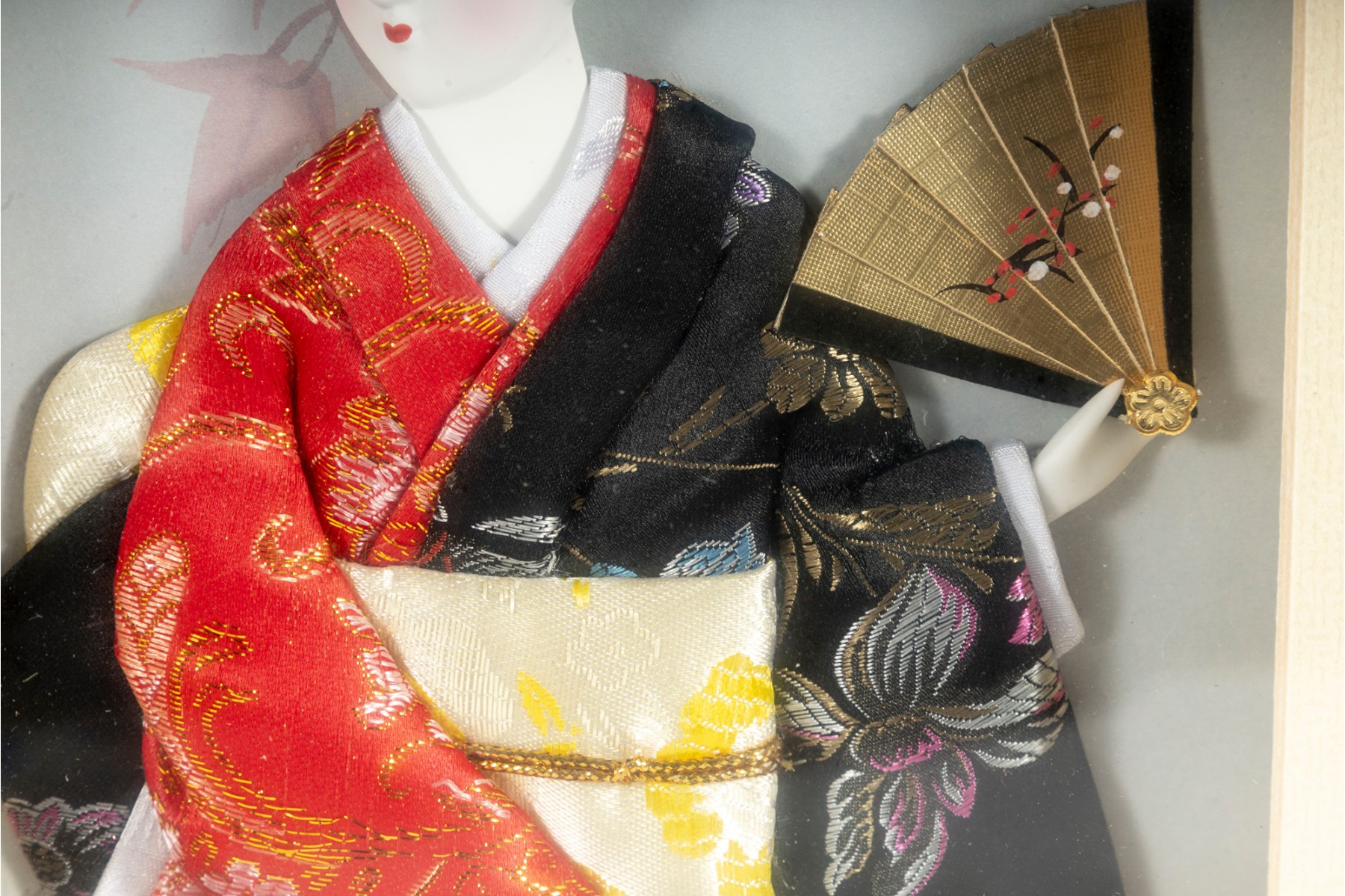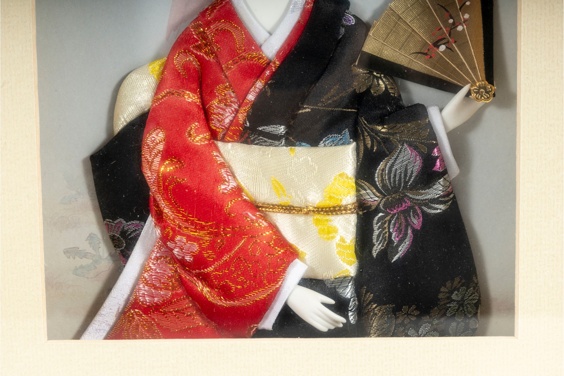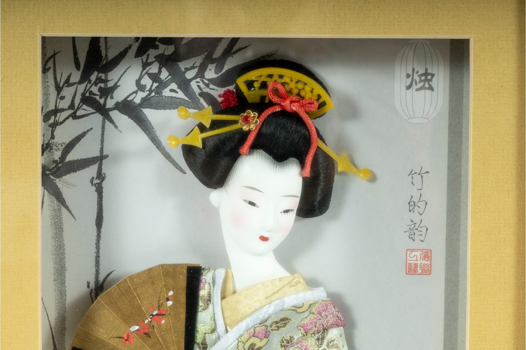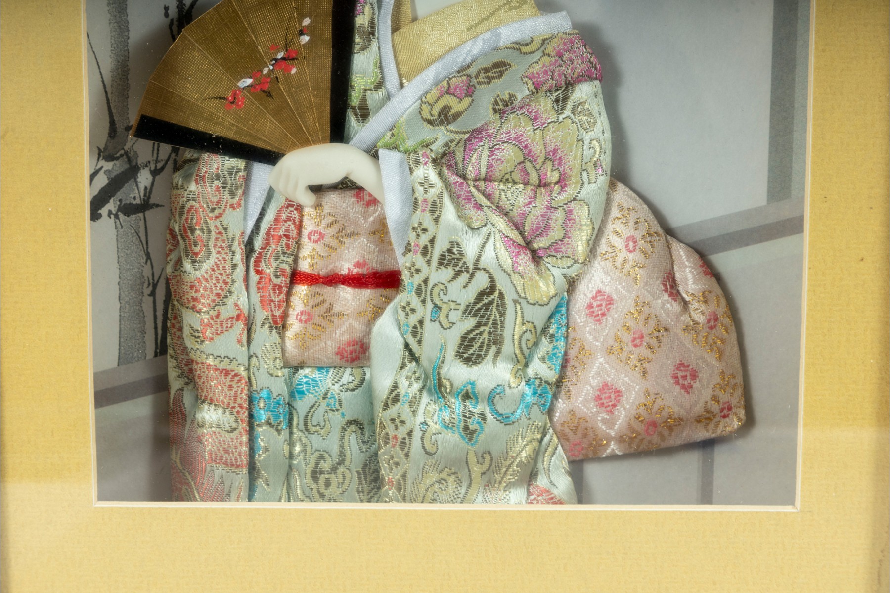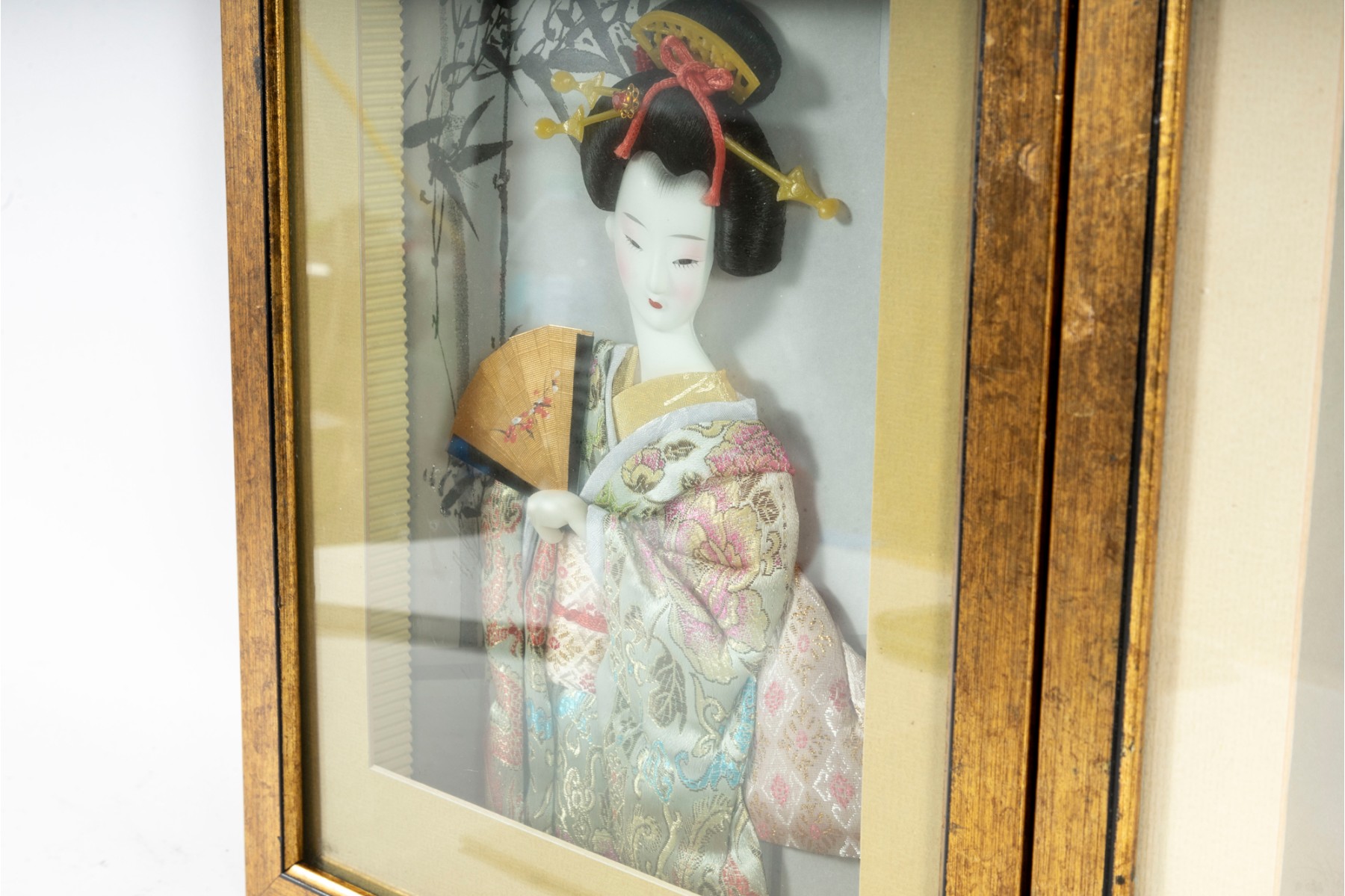 Each piece features intricately designed porcelain Geisha figures, adorned with fabric kimonos that showcase a rich array of colors and patterns with delicate textures of the fabric, providing depth and dimension. The Geishas are complemented by meticulously crafted faux hair headdresses, adding an authentic touch to their appearance. Displayed within shadowboxes, these artworks create a captivating sense of depth and intrigue, making them ideal for collectors of Asian art or those who appreciate unique, handcrafted pieces.