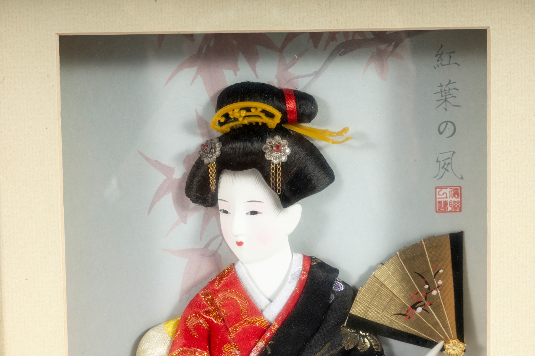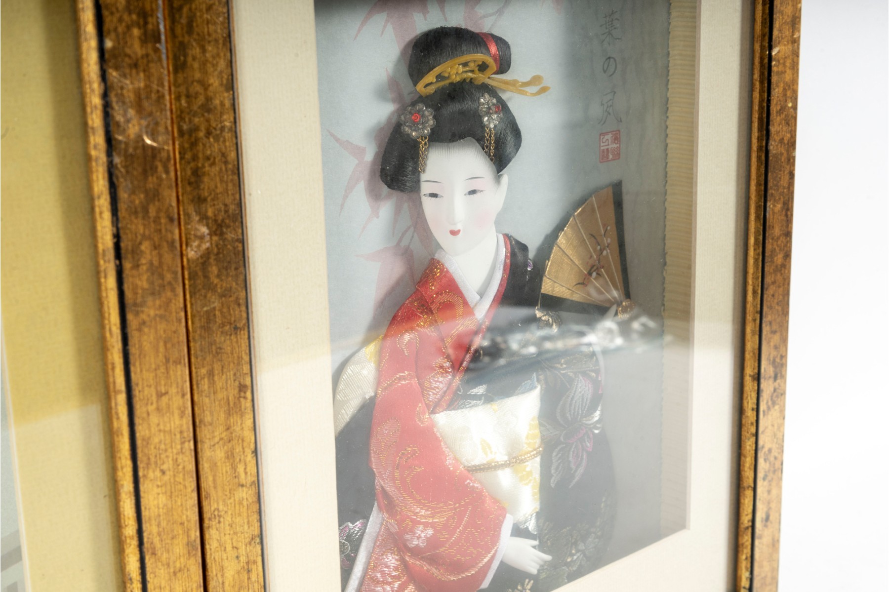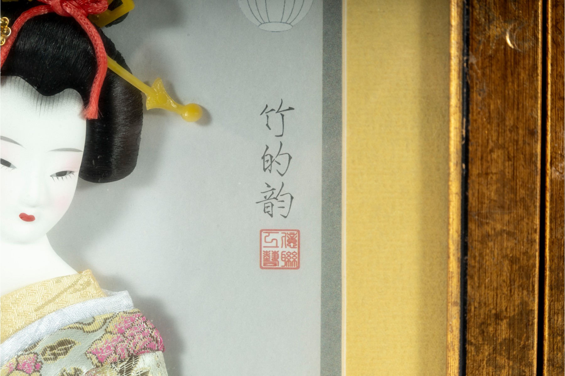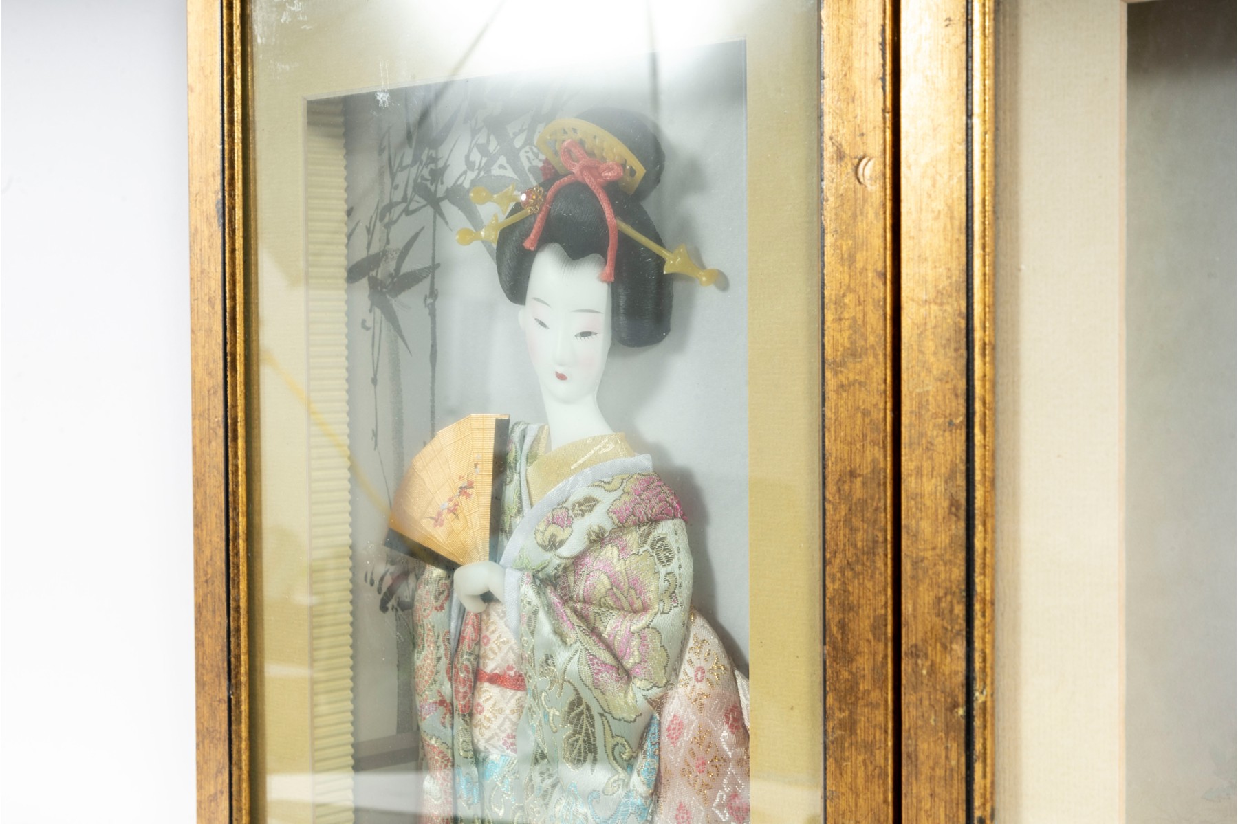 Each piece features intricately designed porcelain Geisha figures, adorned with fabric kimonos that showcase a rich array of colors and patterns with delicate textures of the fabric, providing depth and dimension. The Geishas are complemented by meticulously crafted faux hair headdresses, adding an authentic touch to their appearance. Displayed within shadowboxes, these artworks create a captivating sense of depth and intrigue, making them ideal for collectors of Asian art or those who appreciate unique, handcrafted pieces.