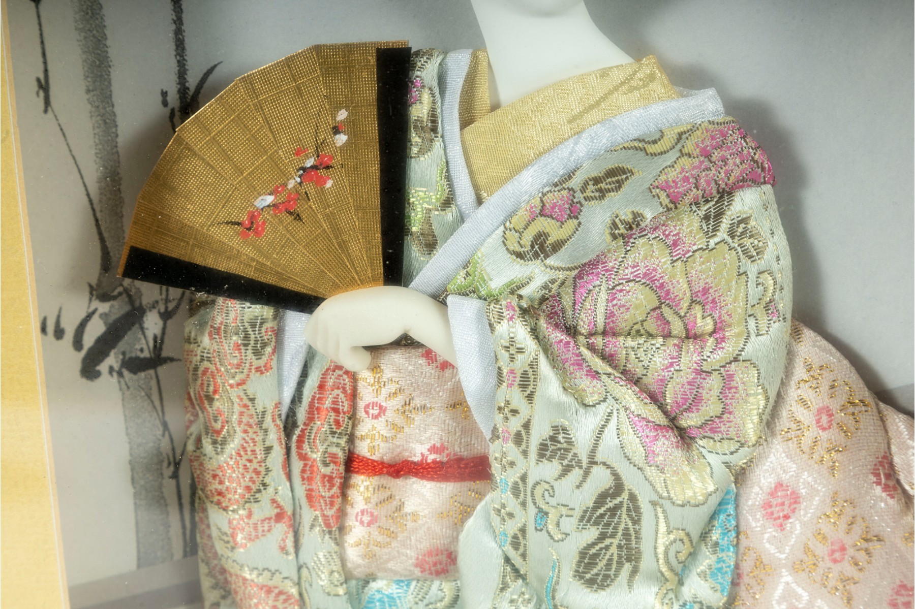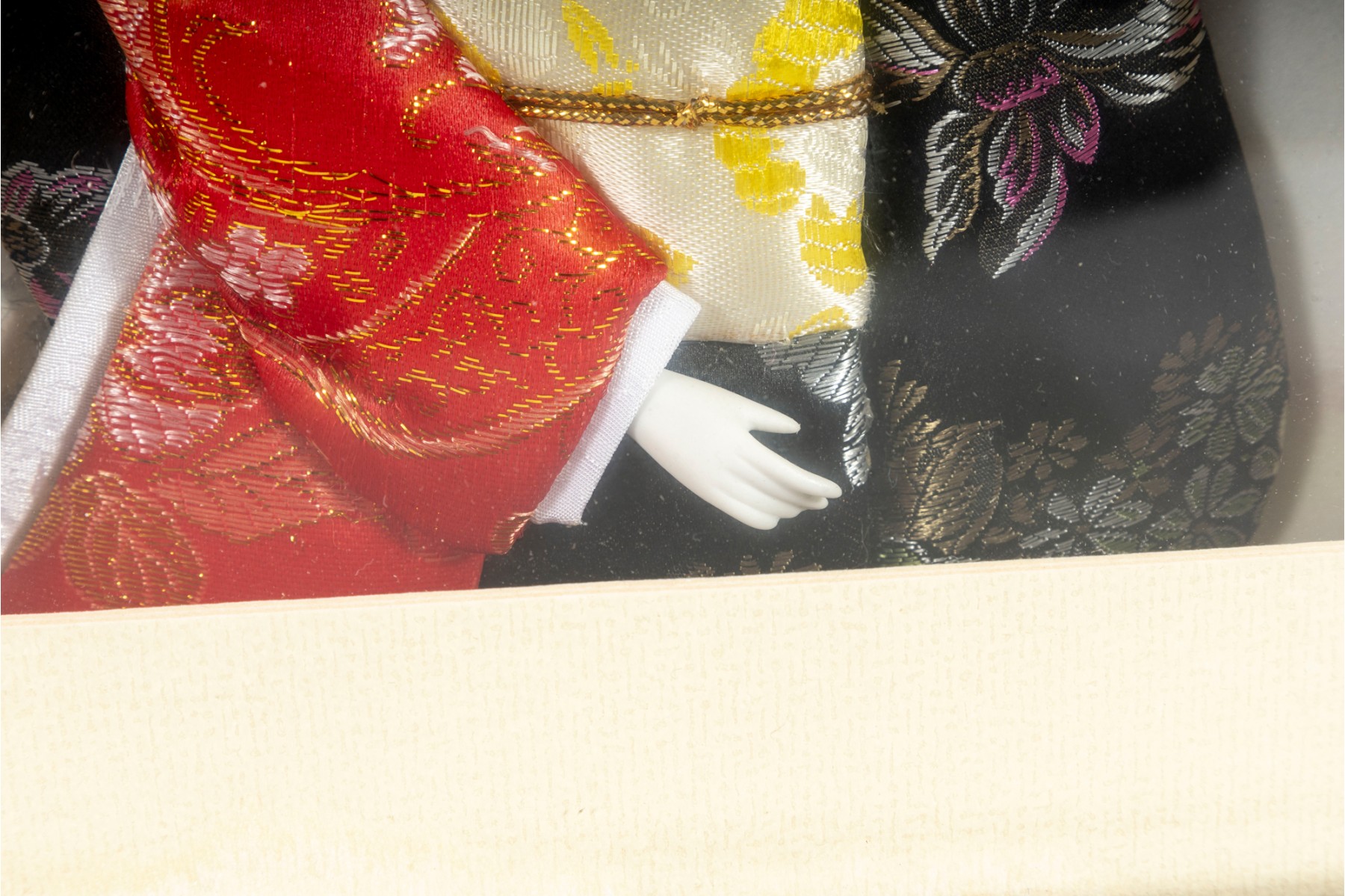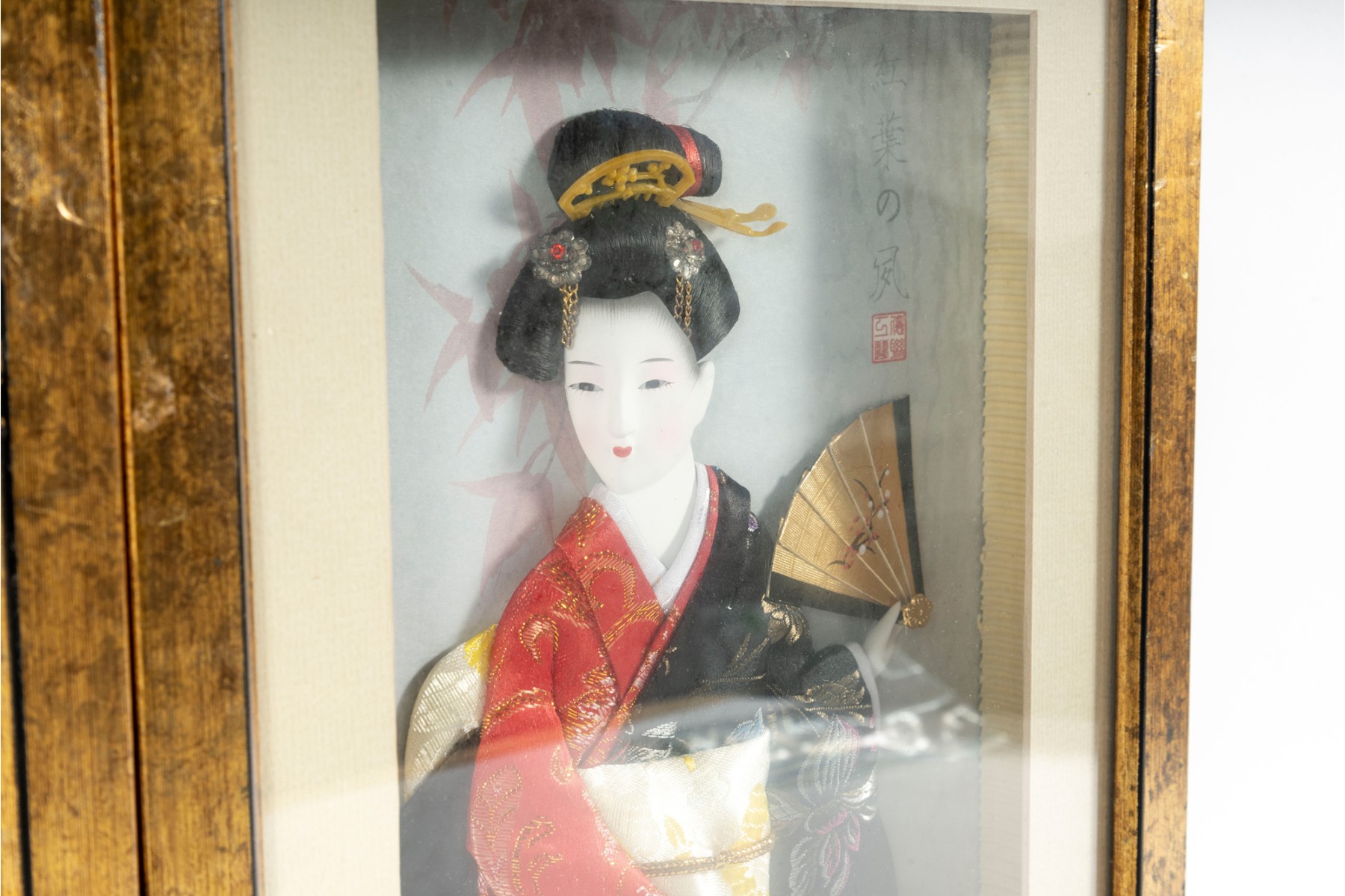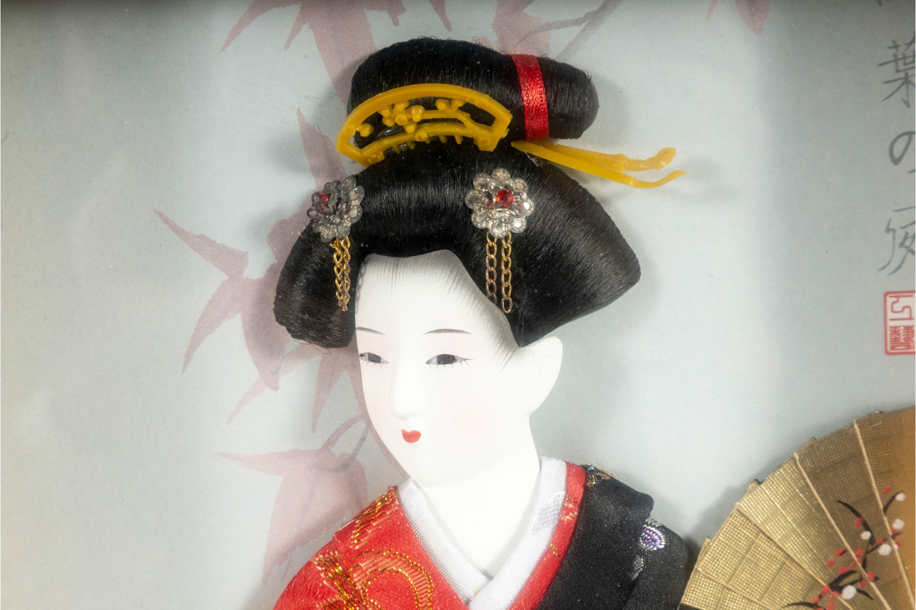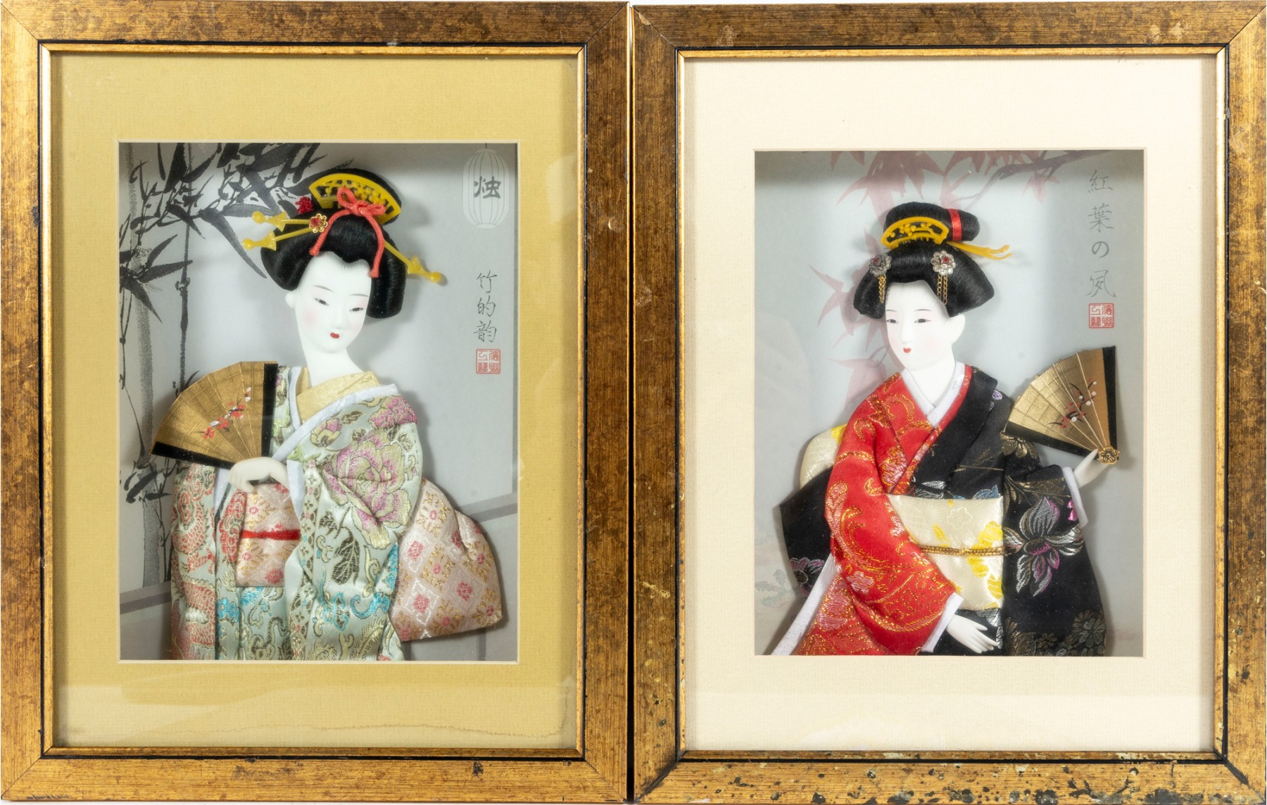 Each piece features intricately designed porcelain Geisha figures, adorned with fabric kimonos that showcase a rich array of colors and patterns with delicate textures of the fabric, providing depth and dimension. The Geishas are complemented by meticulously crafted faux hair headdresses, adding an authentic touch to their appearance. Displayed within shadowboxes, these artworks create a captivating sense of depth and intrigue, making them ideal for collectors of Asian art or those who appreciate unique, handcrafted pieces.