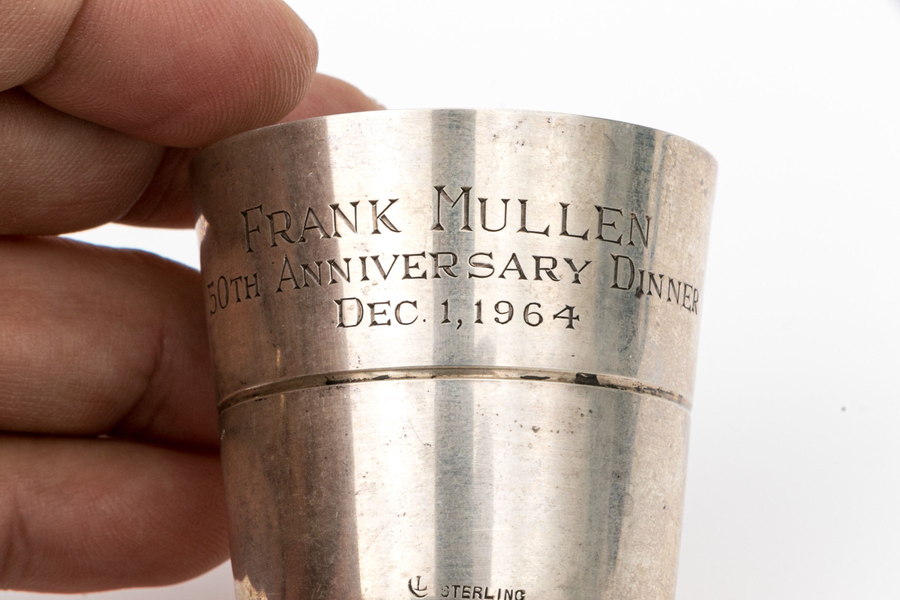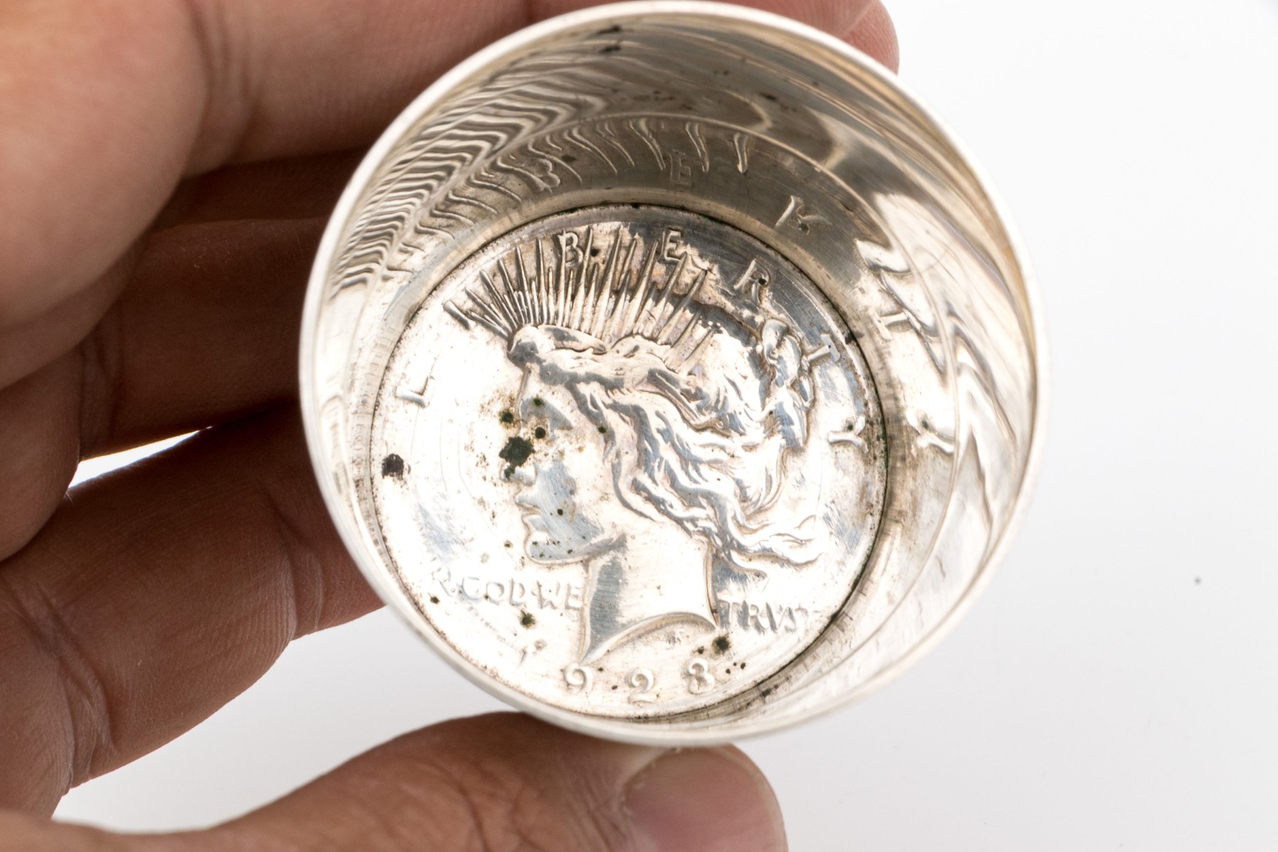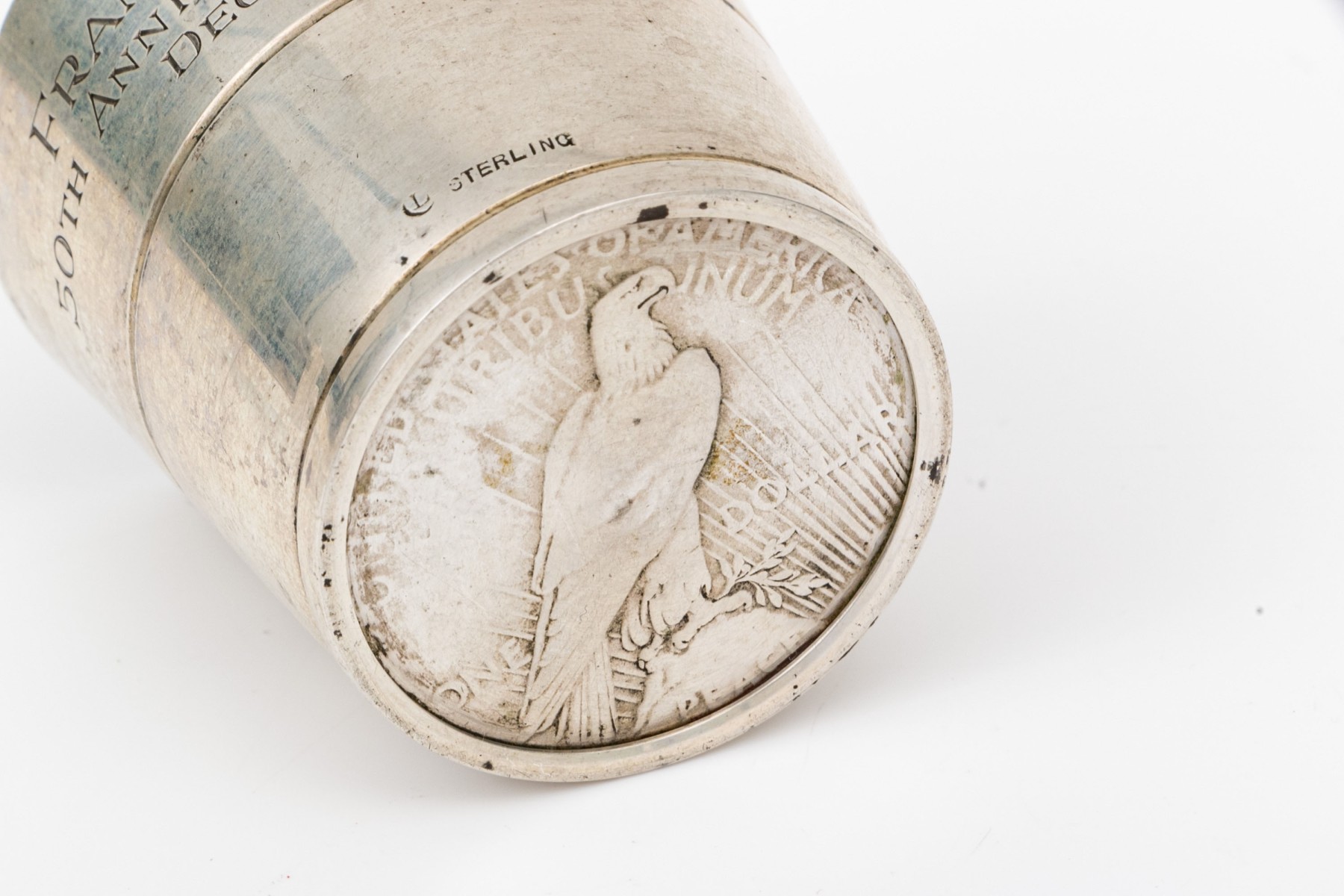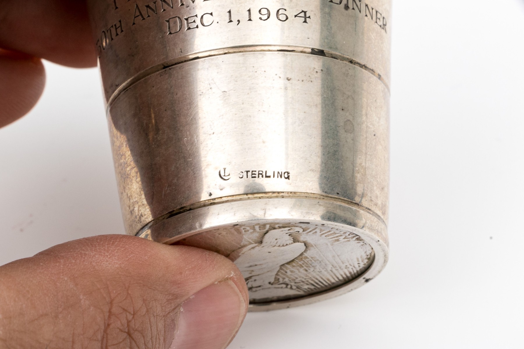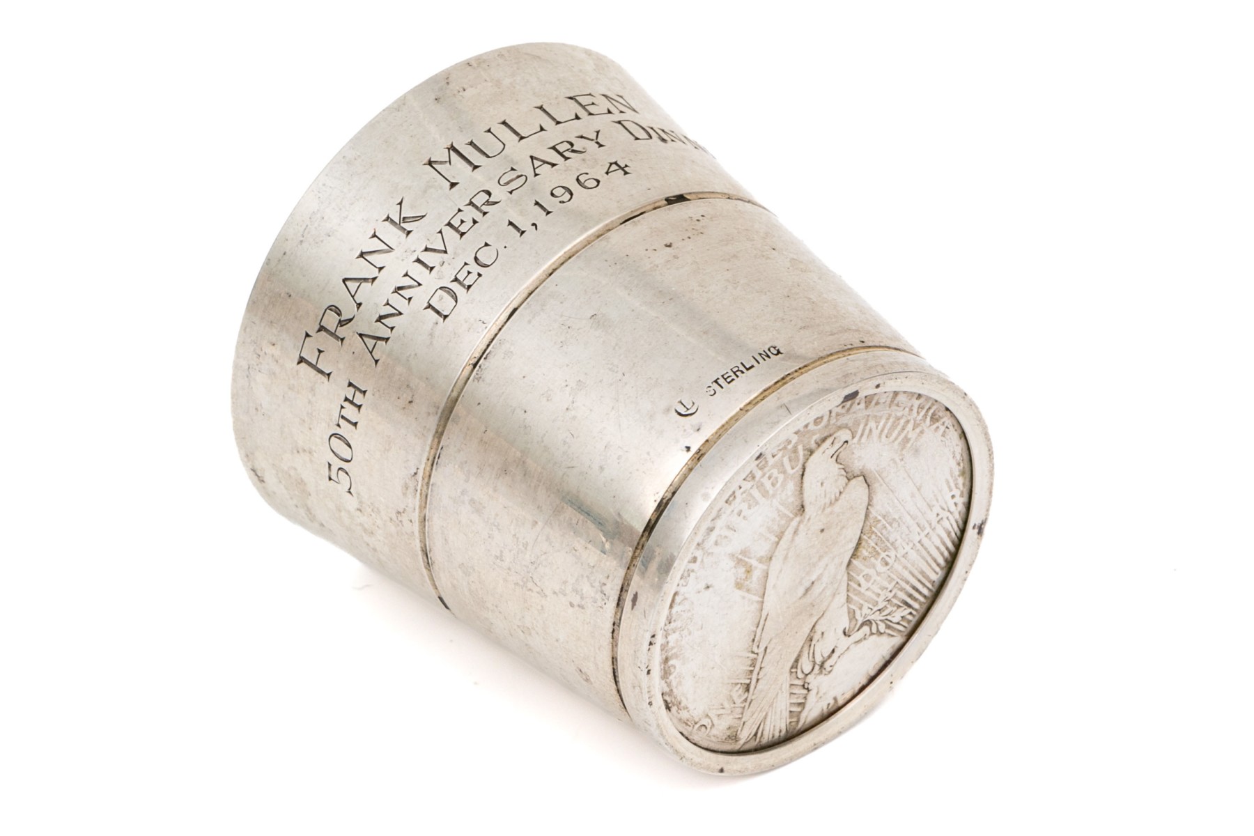 Engraved and dated 1964. The base is set with a 1928 Liberty silver dollar coin.
