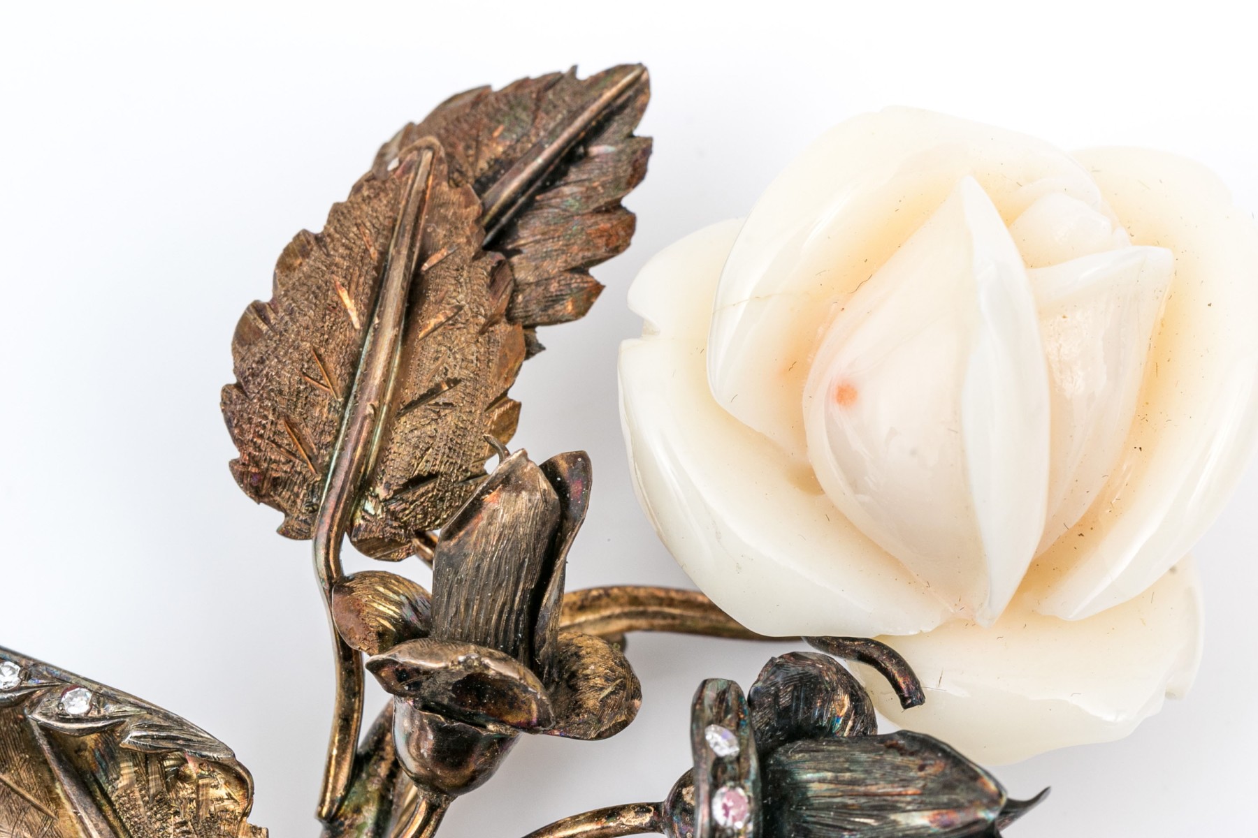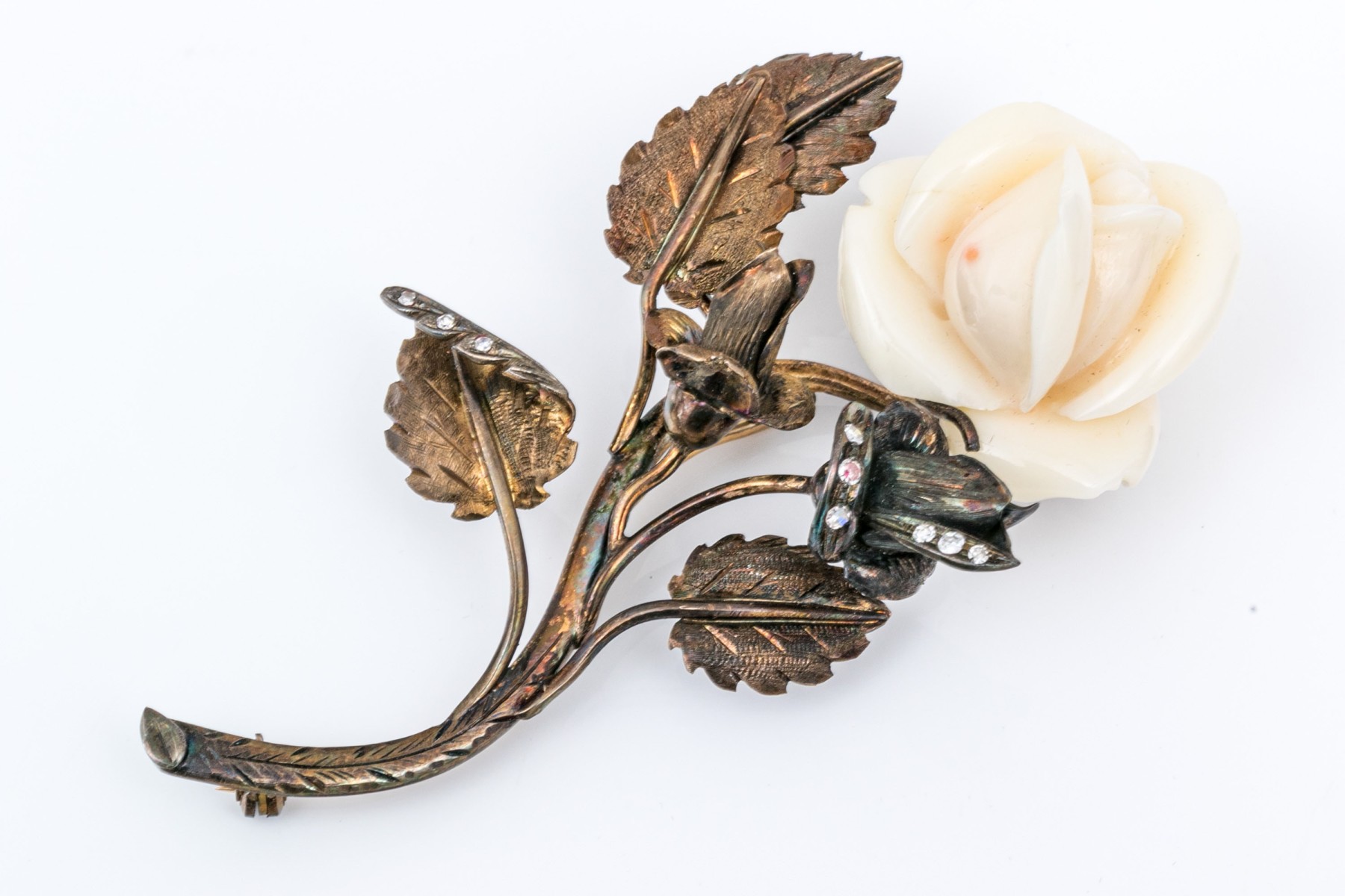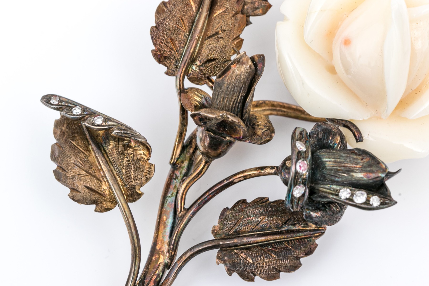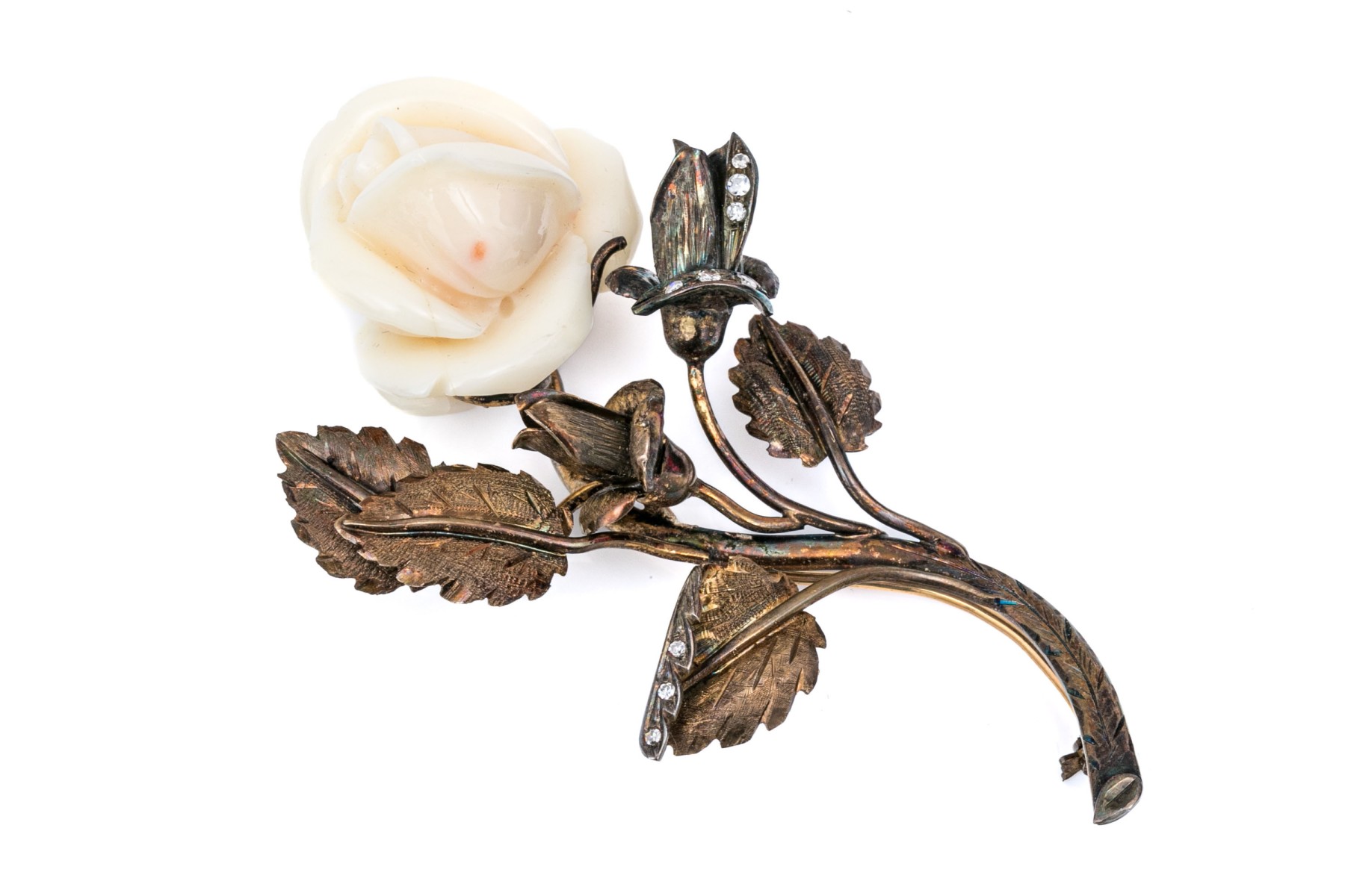 Vintage pretty large yellow gold filled carved coral rose motif brooch with diamonds, app. 0.09 TCW
