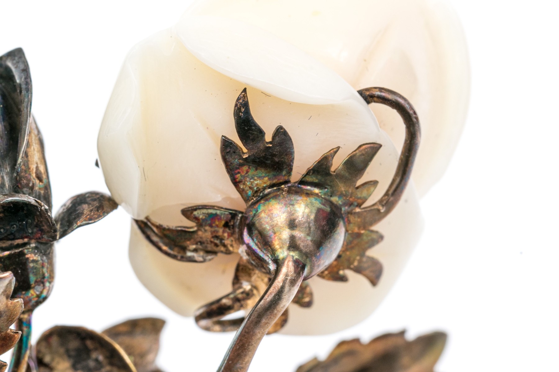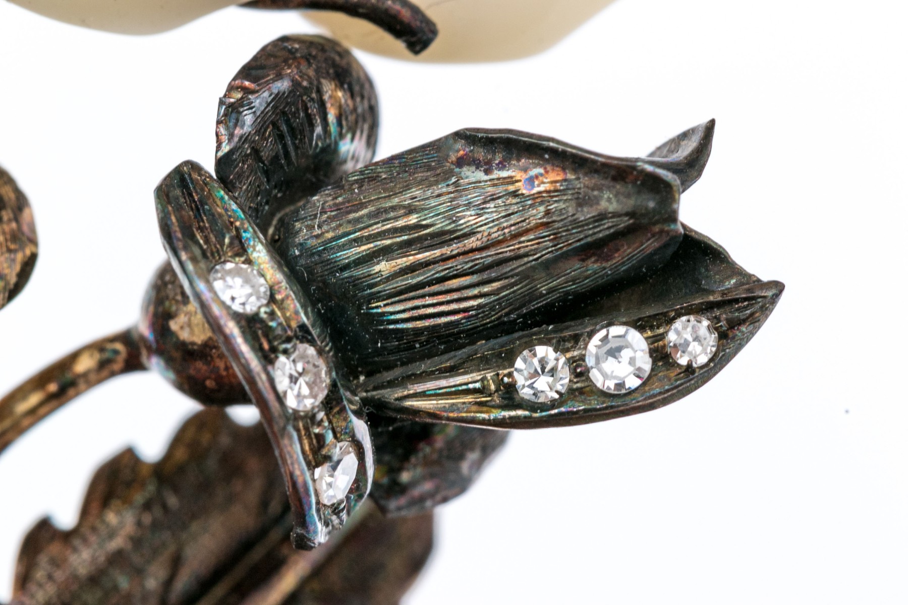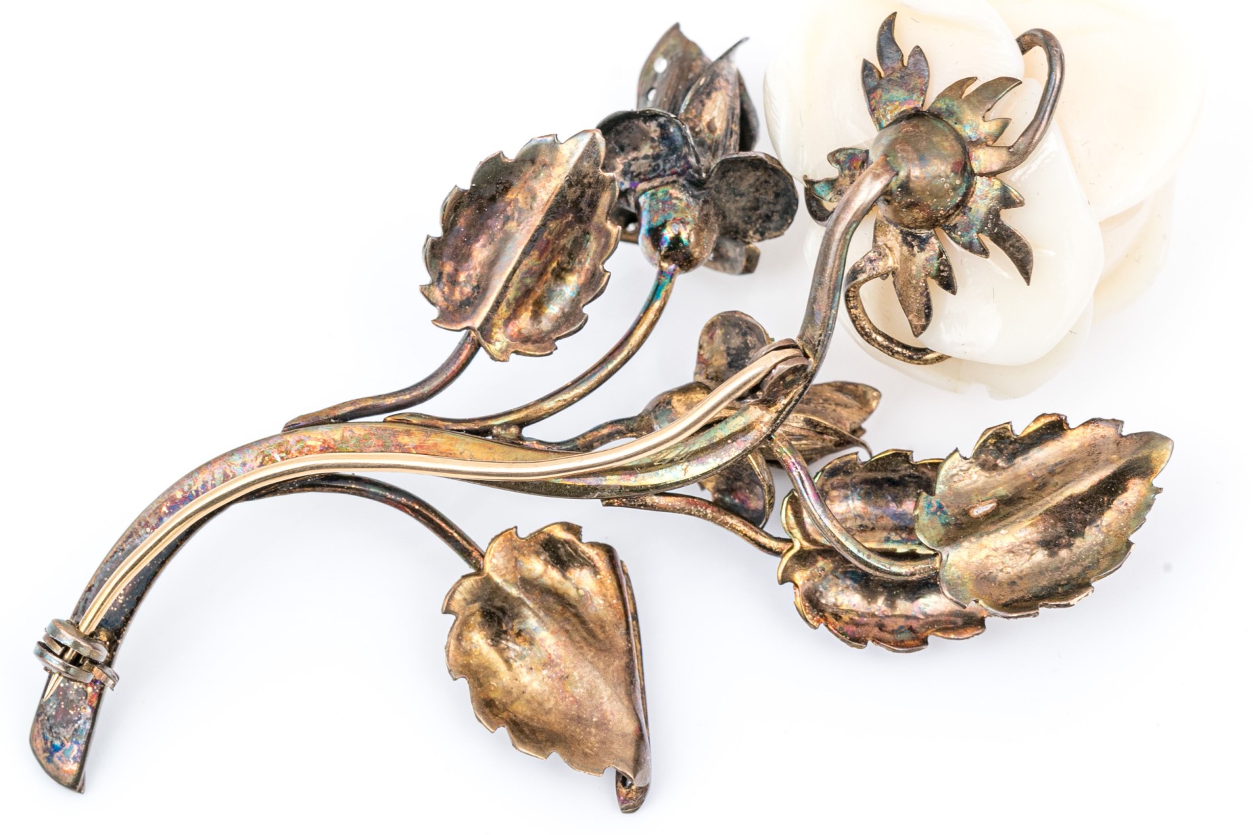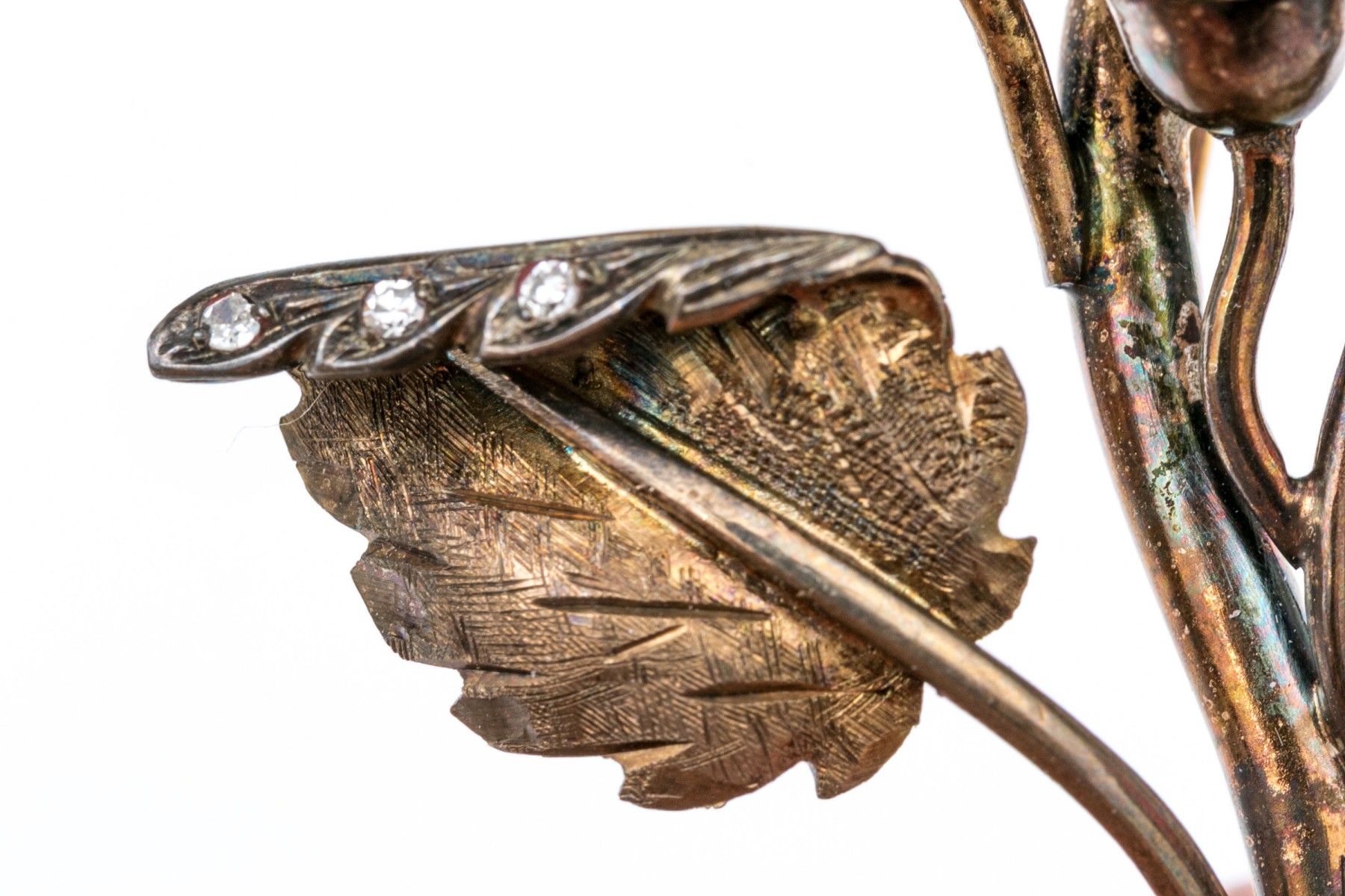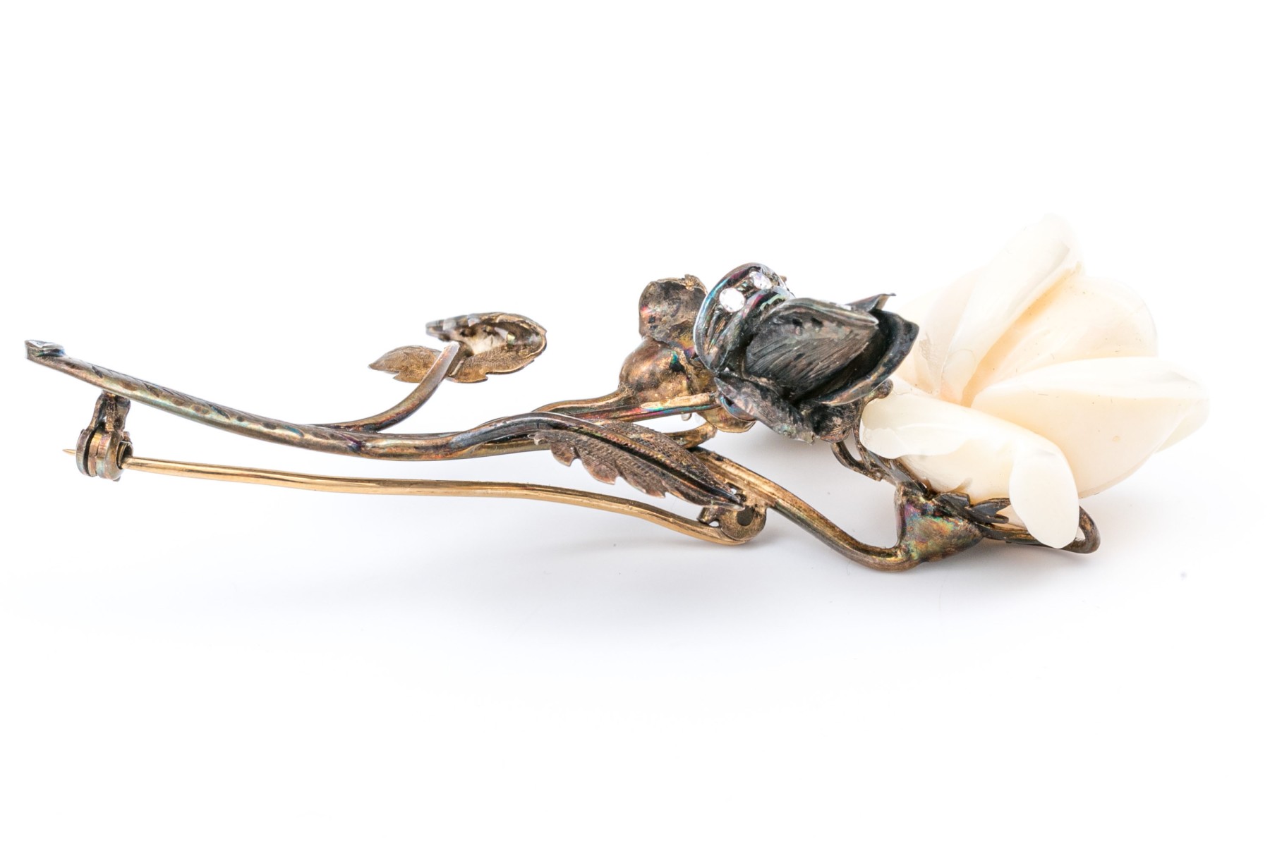 Vintage pretty large yellow gold filled carved coral rose motif brooch with diamonds, app. 0.09 TCW