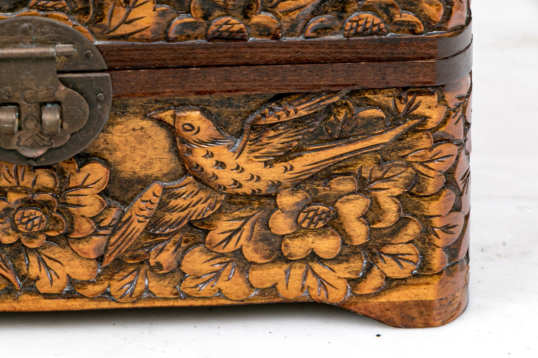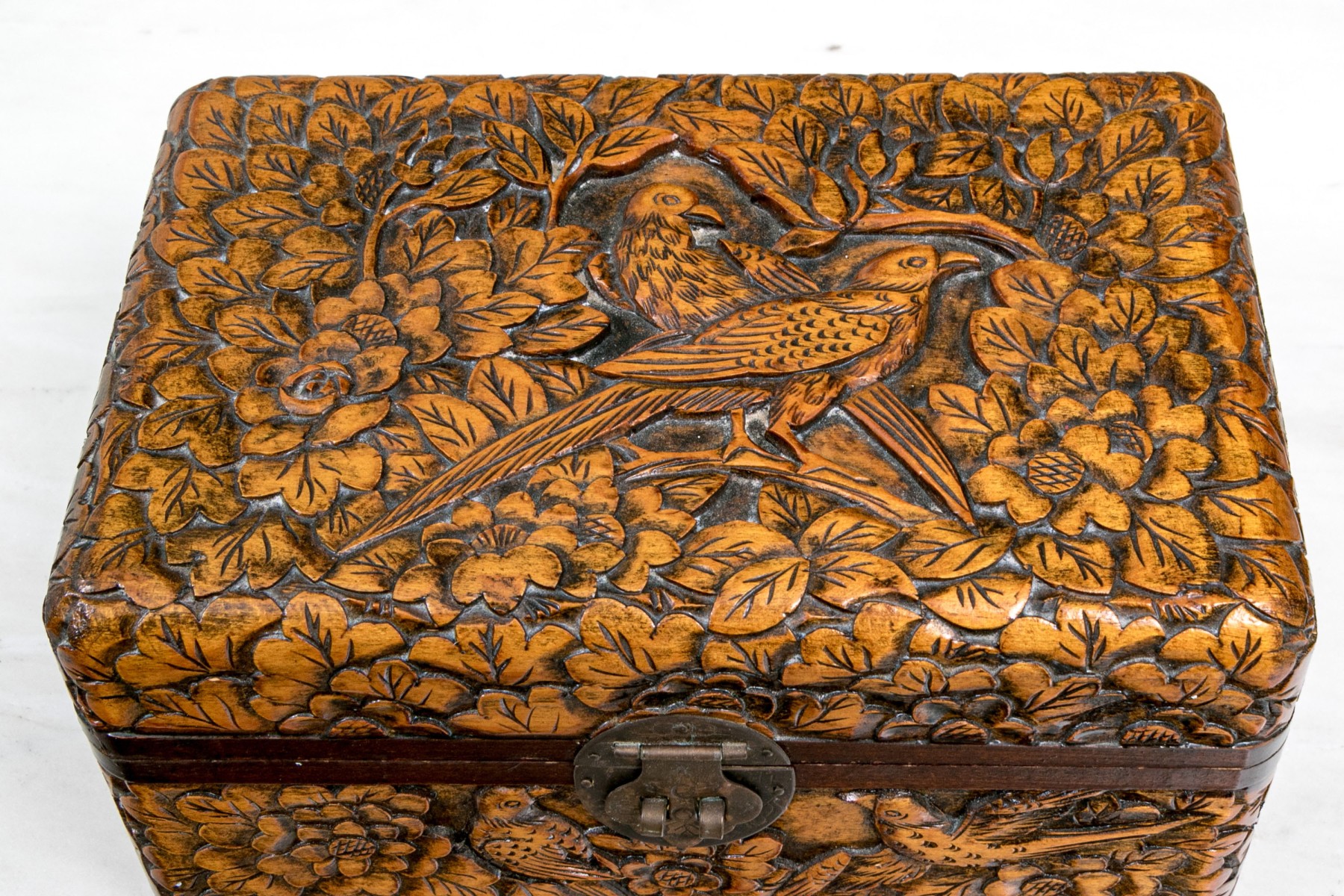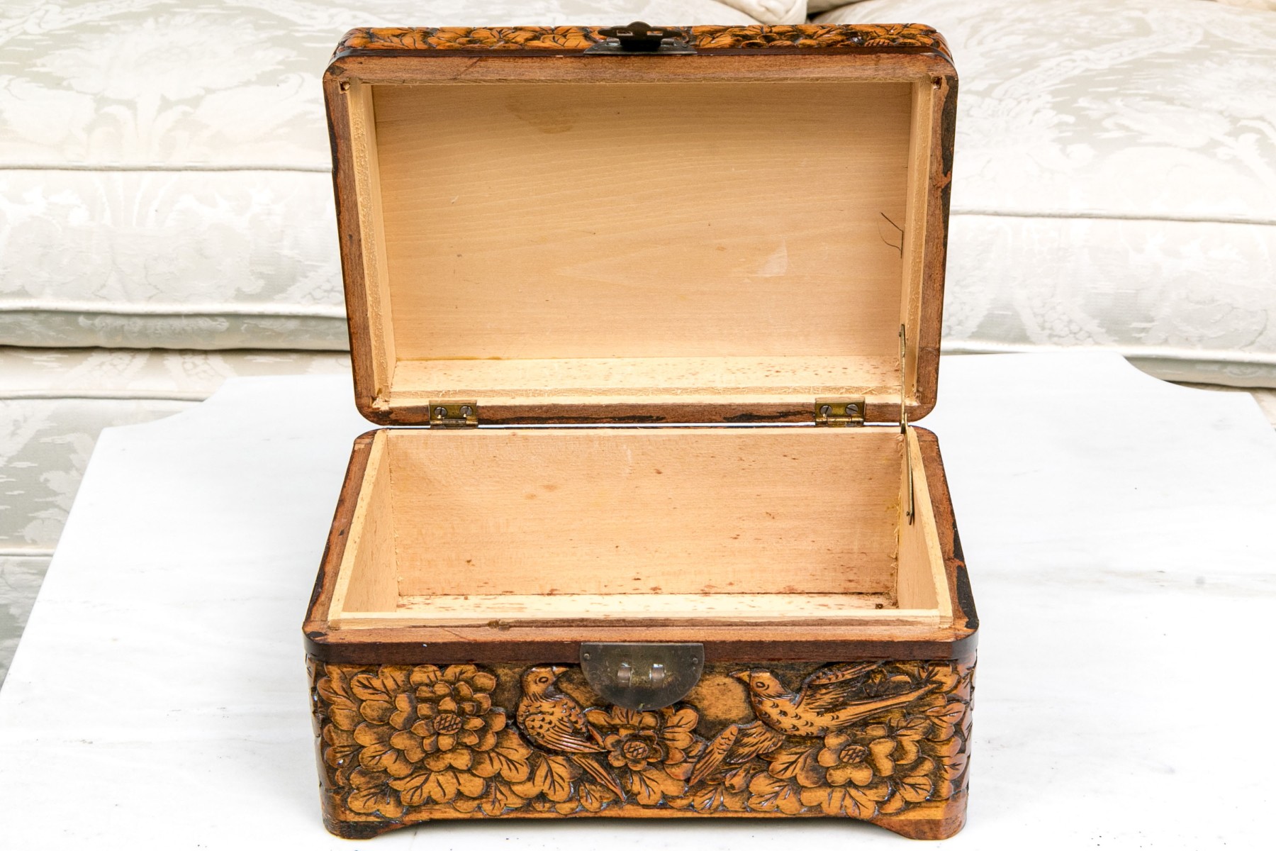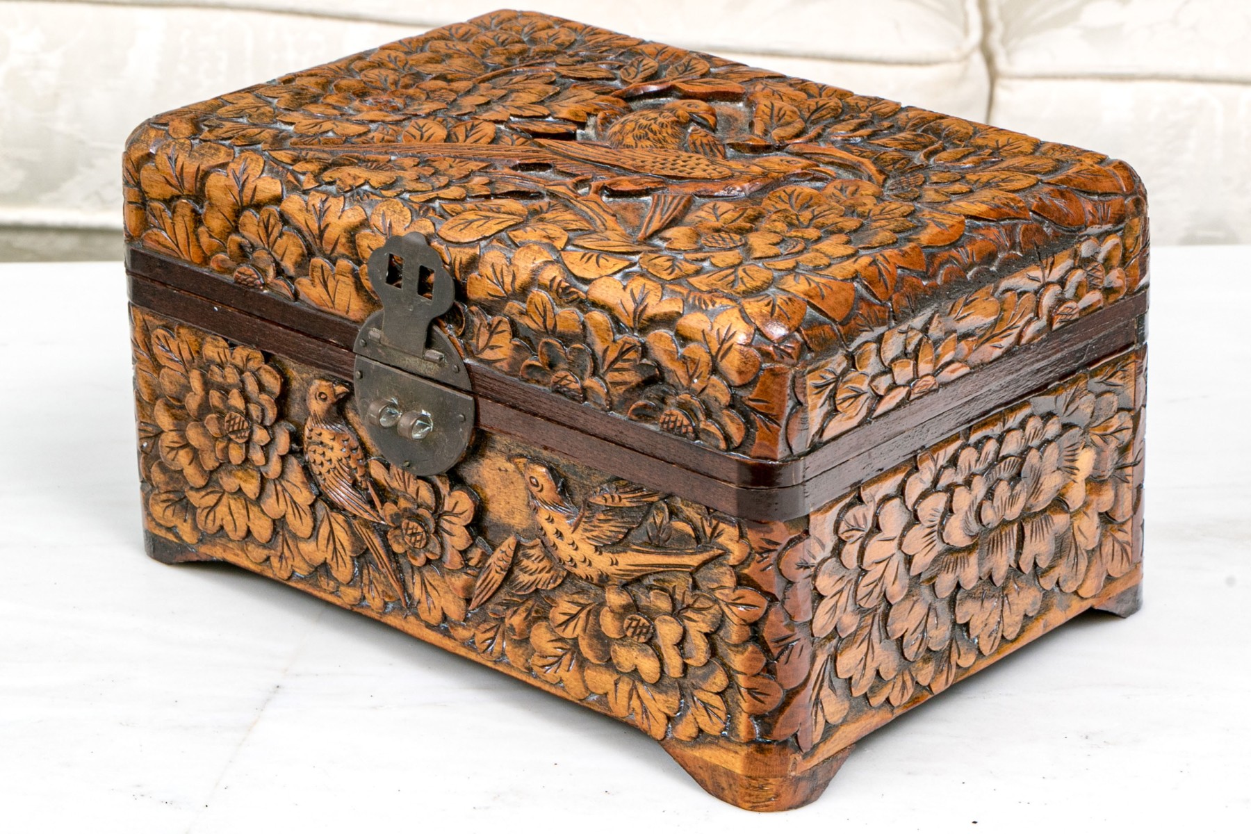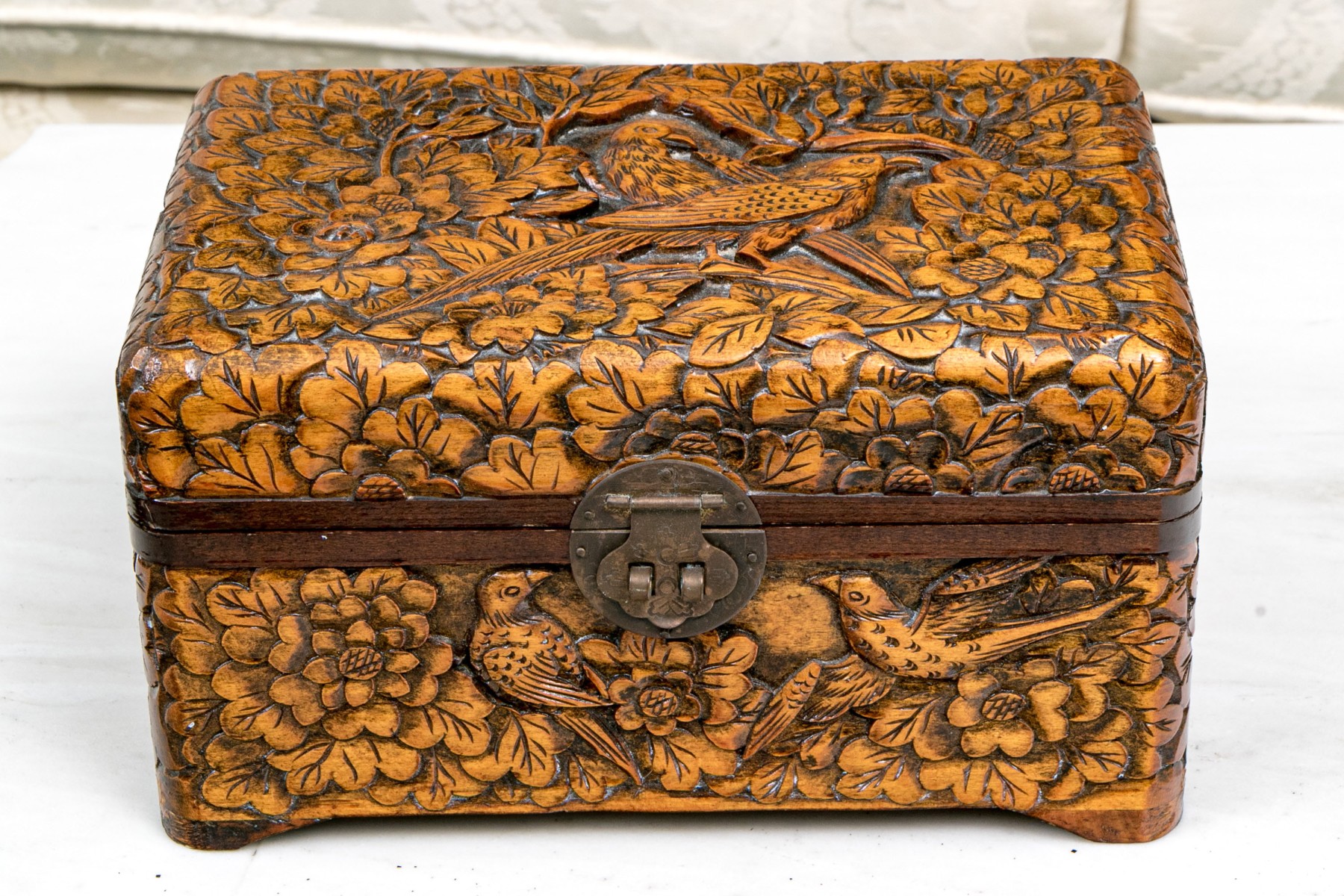 The carved and finished wooden box has a hinged lid.