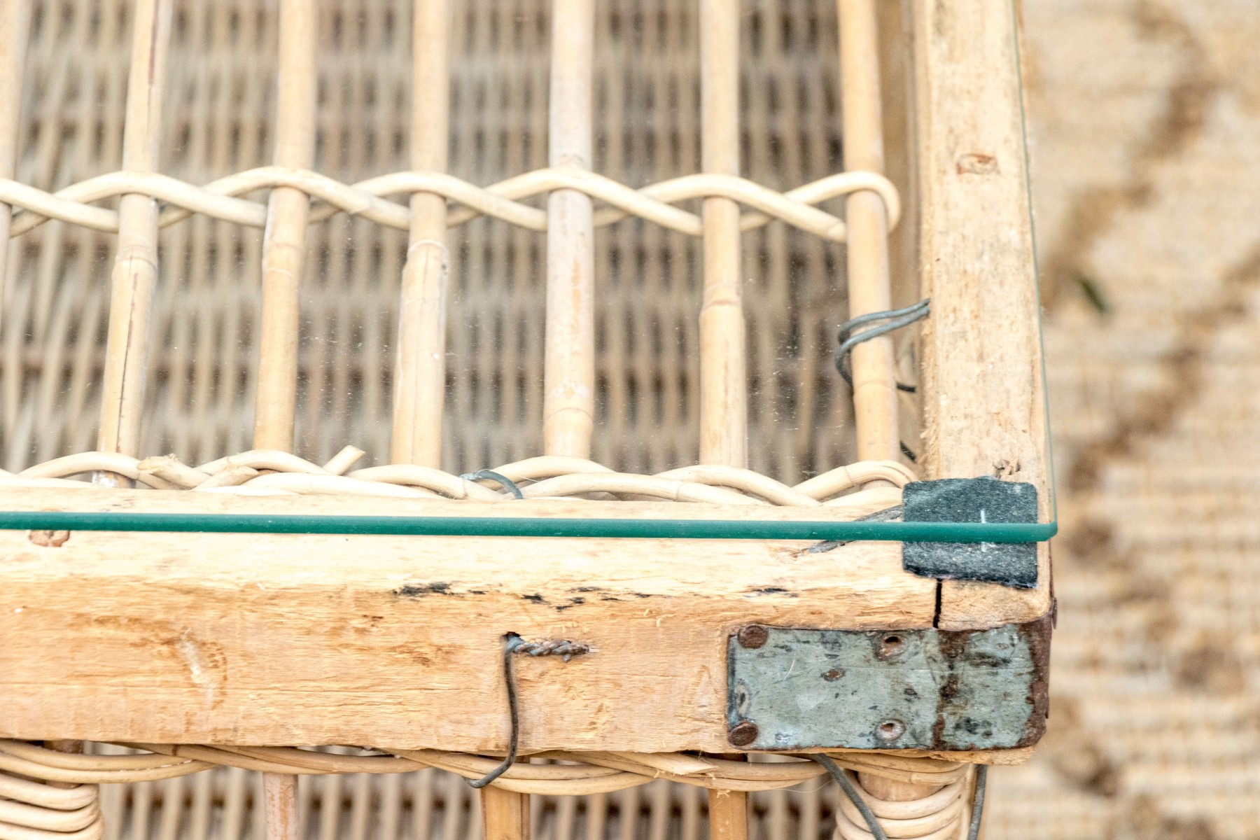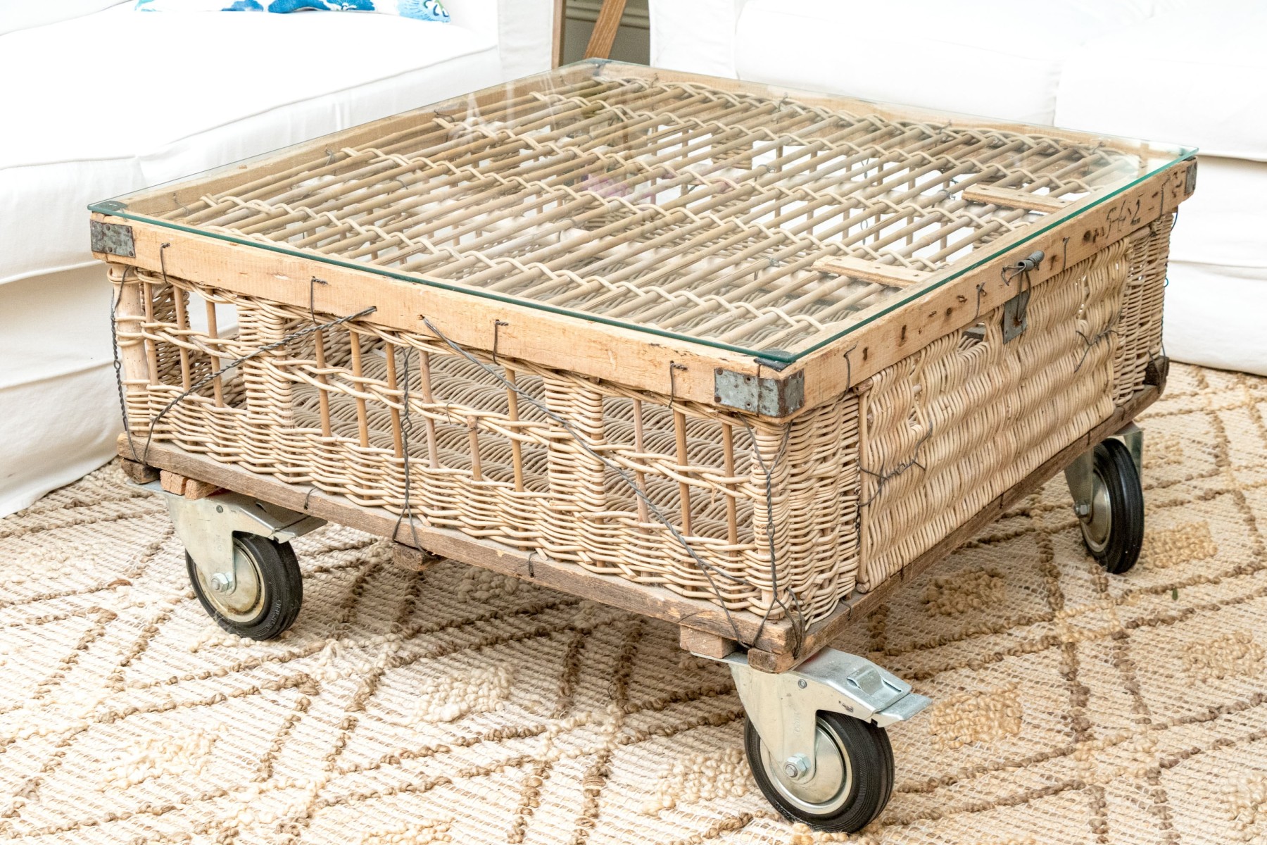 A fantastic, nonconventional vintage rattan and bamboo cage form table with glass top and four large caster wheels for mobility.