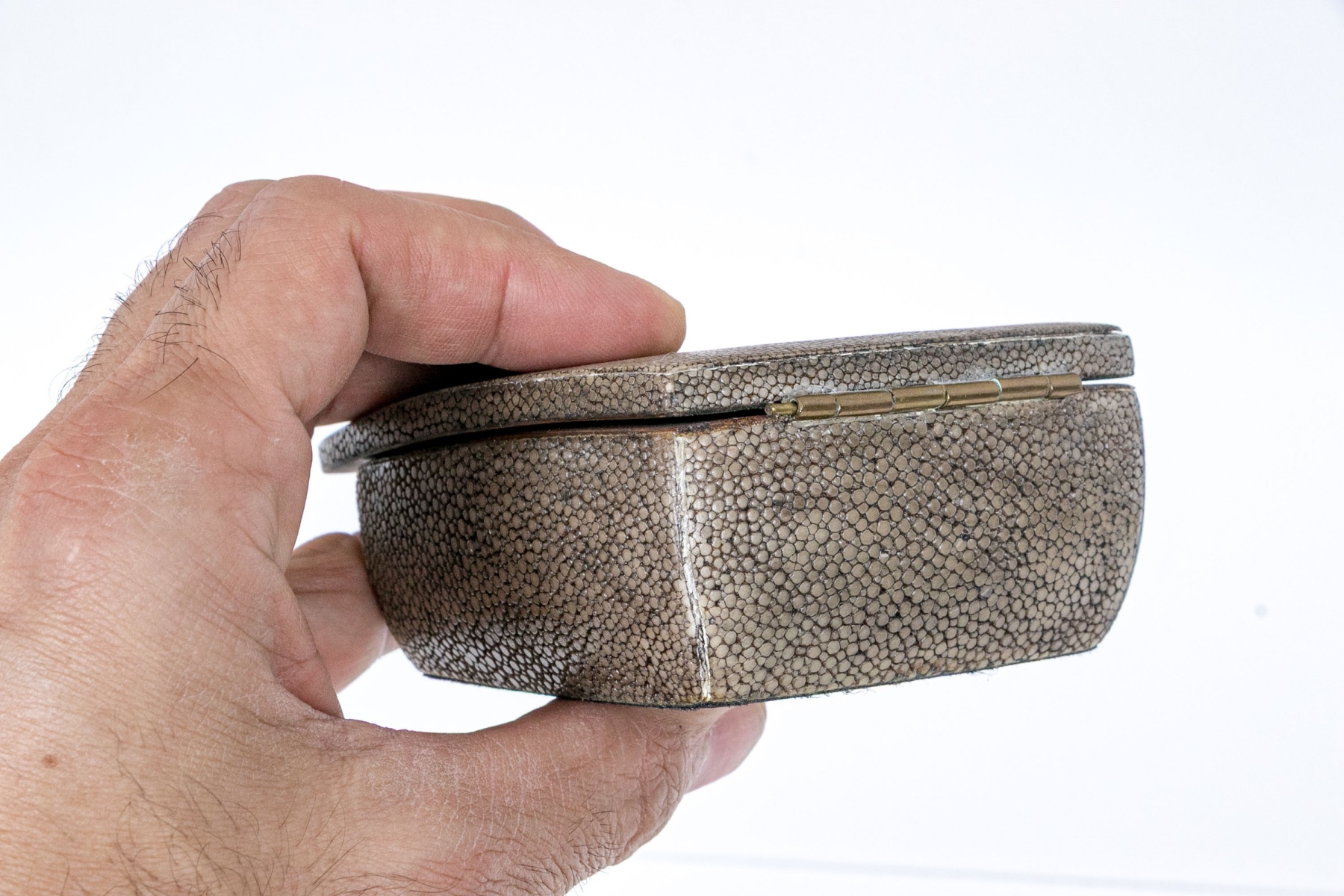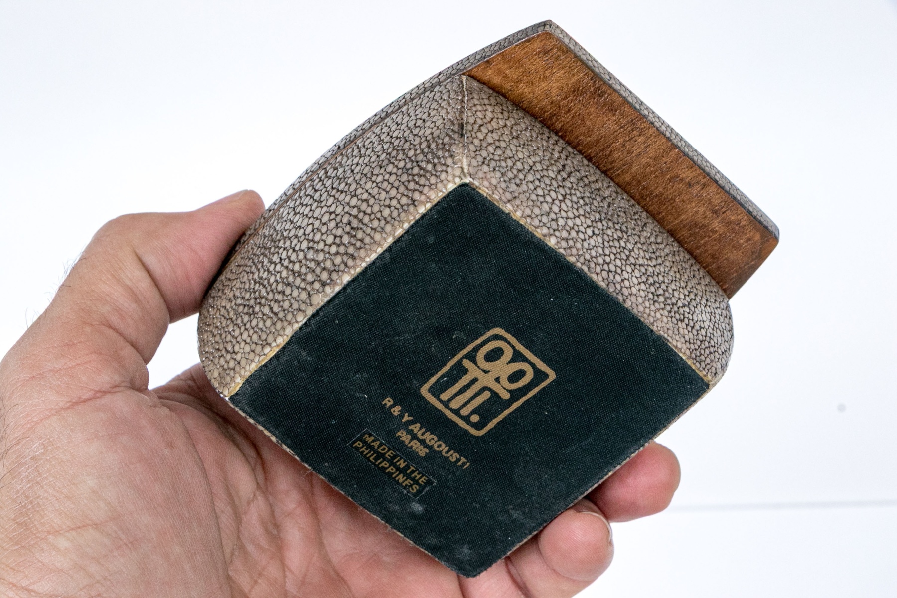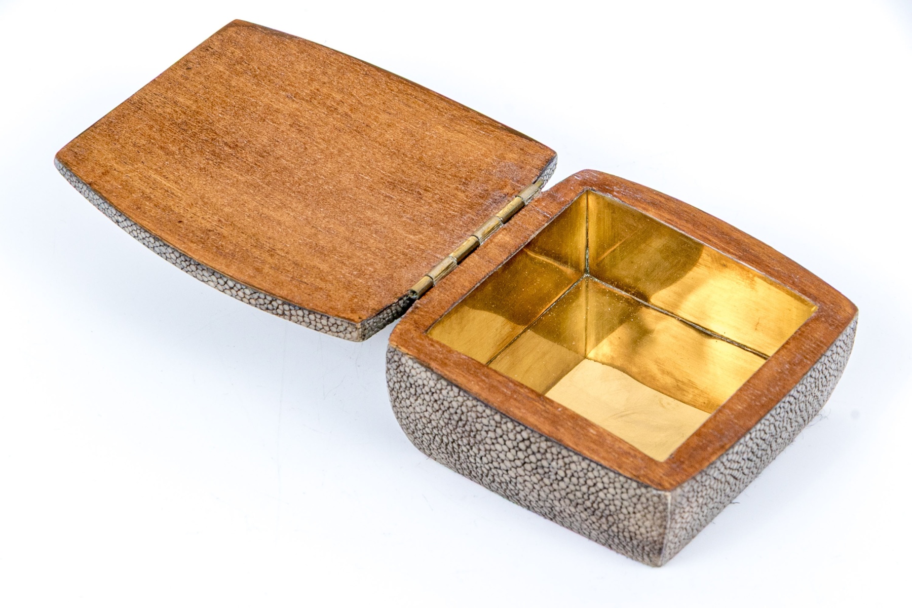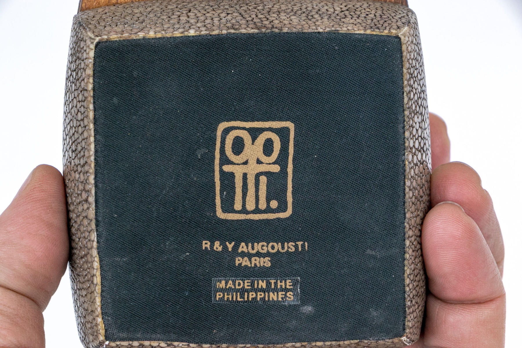 Made in the Philippines. A small gray shagreen covered wooden box with golden metal lining and an extended hinged lid.