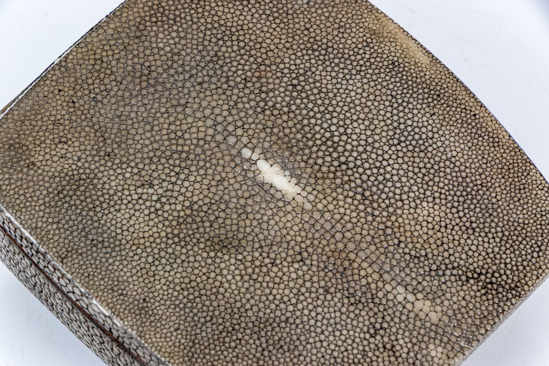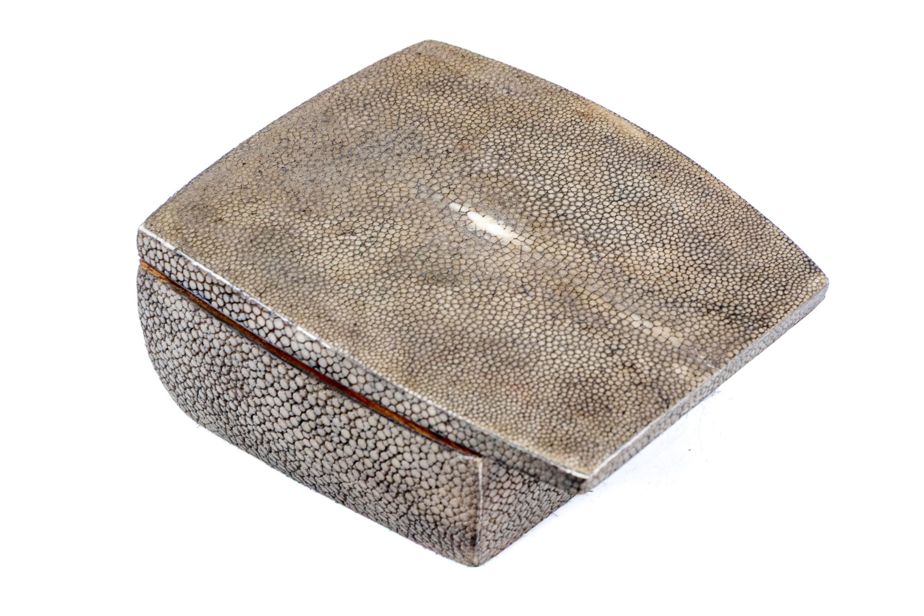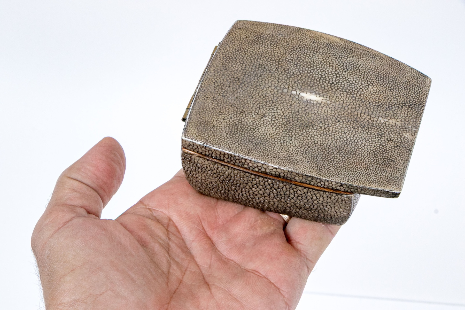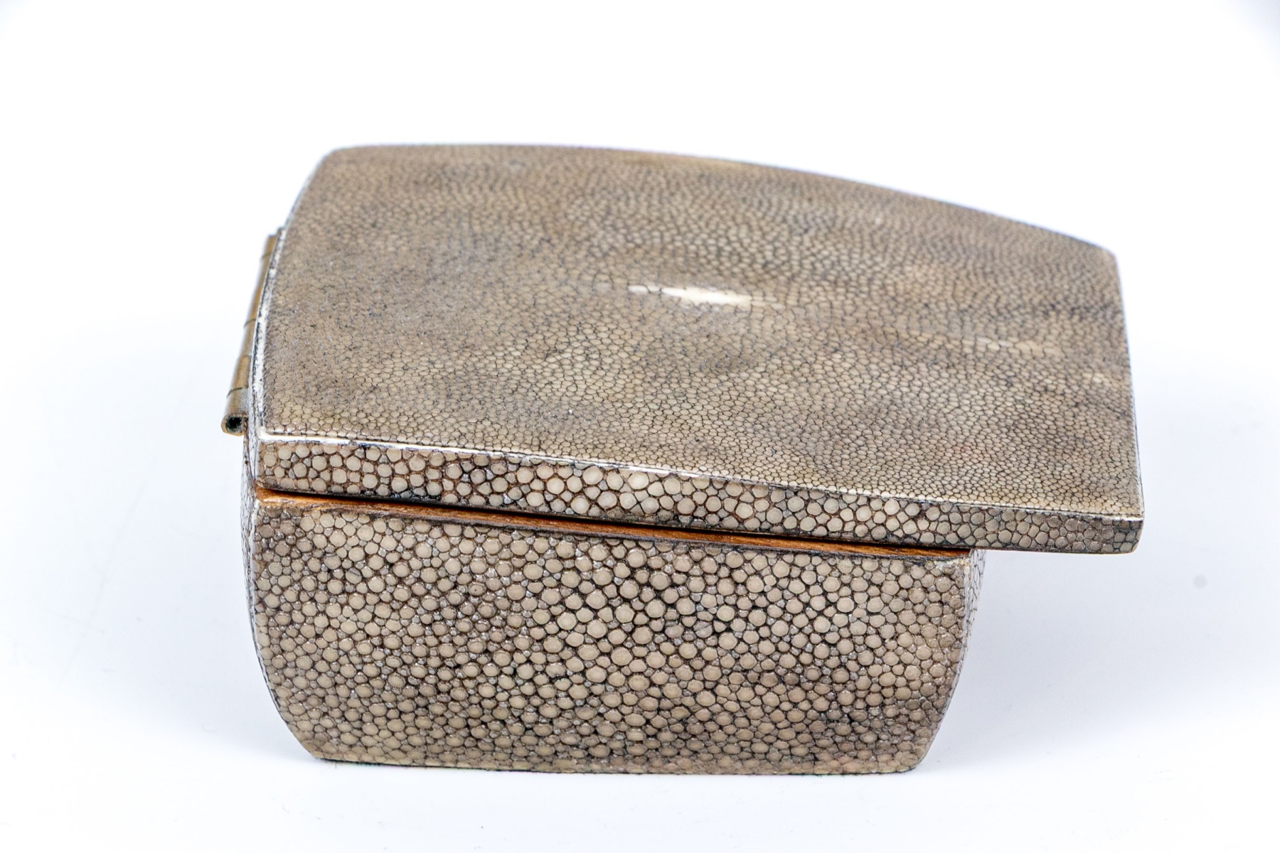 Made in the Philippines. A small gray shagreen covered wooden box with golden metal lining and an extended hinged lid.