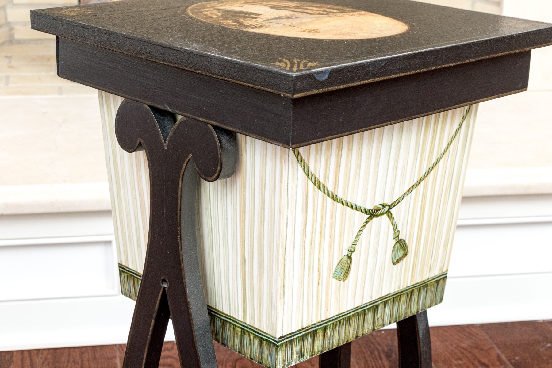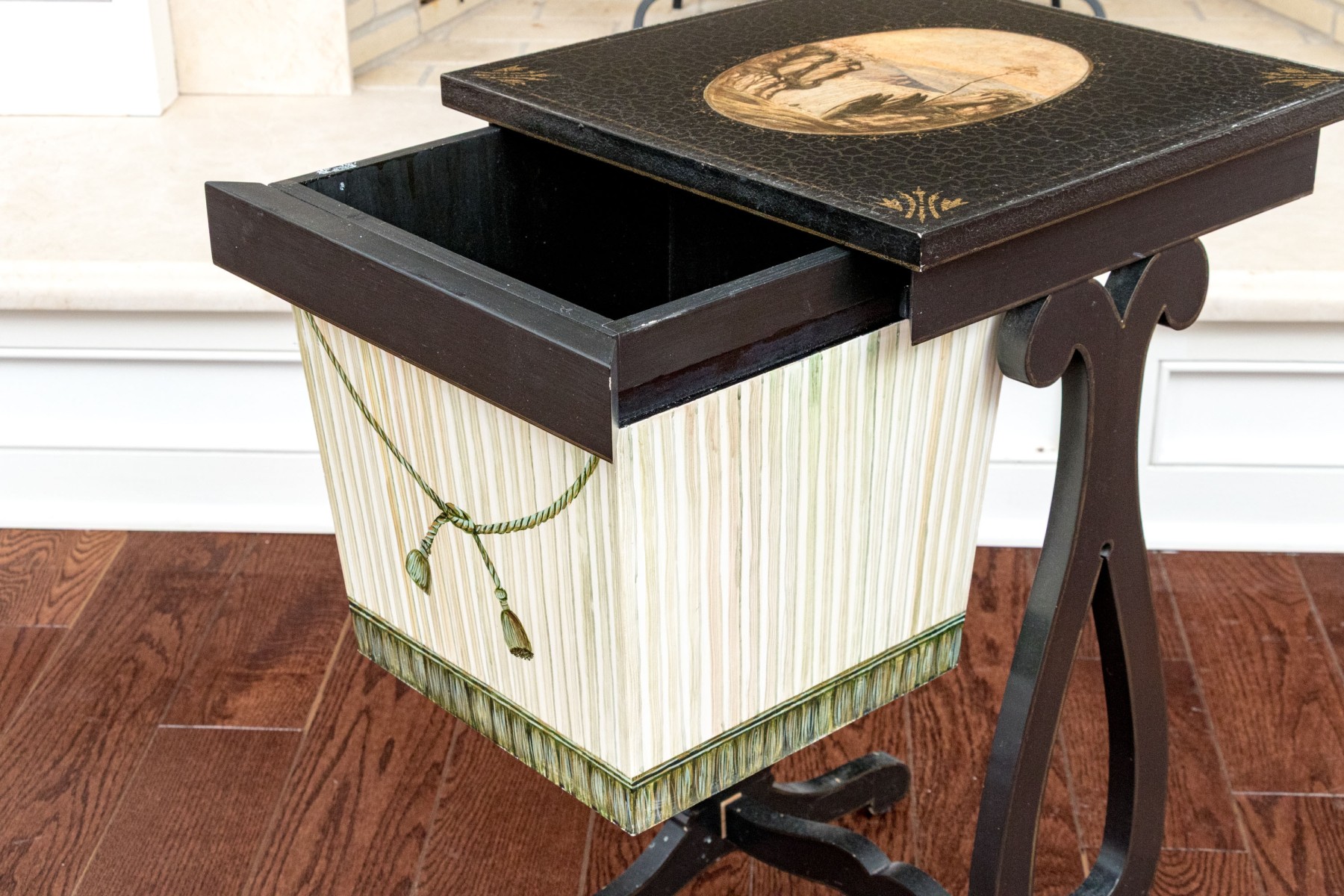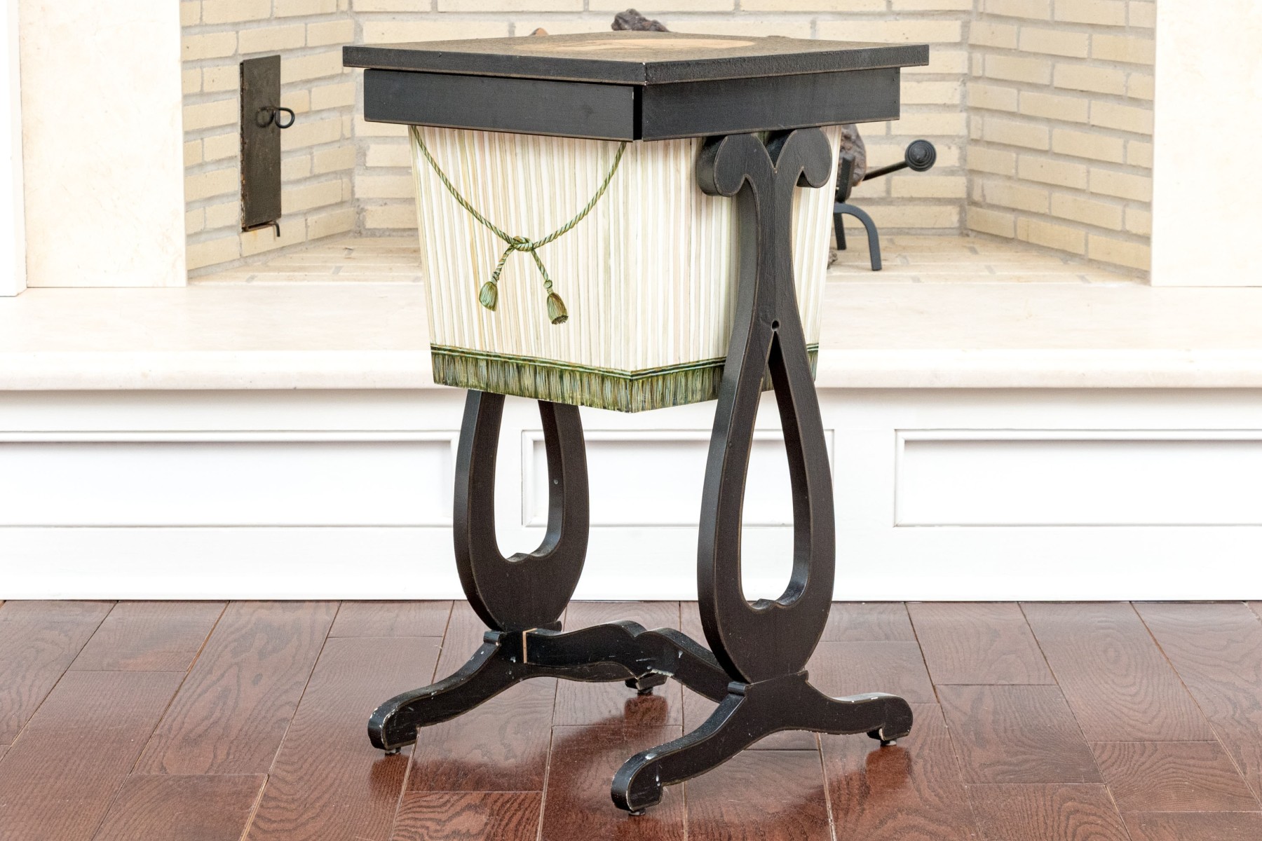 A delightful vintage Regency style sewing side table showcasing a square black crackle finished top with a hand-painted oval central reserve depicting a waterfall. The table features a white and green painted basket with a slide-out opening, detailed with trompe l'oeil ribbing and a green tassel garland across the front. Raised on elegant lyre form trestle legs with a double-curved stretcher.