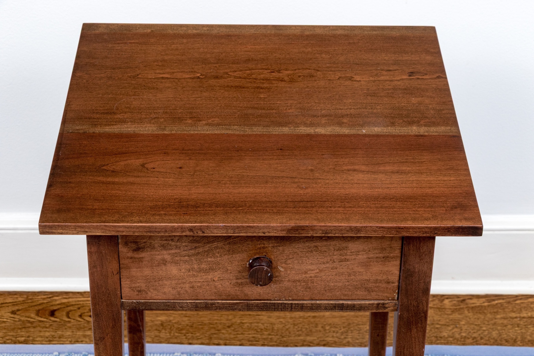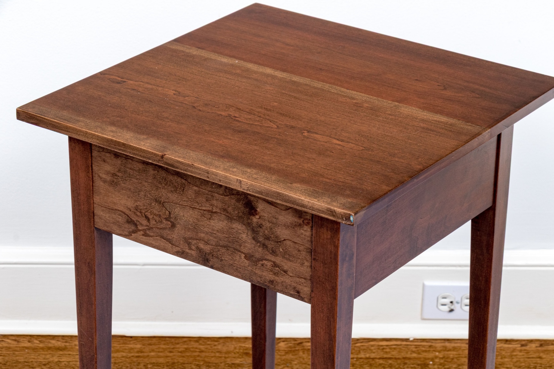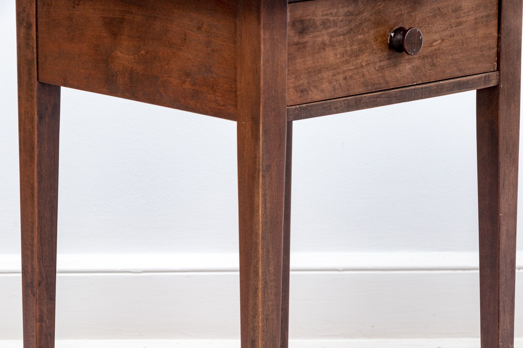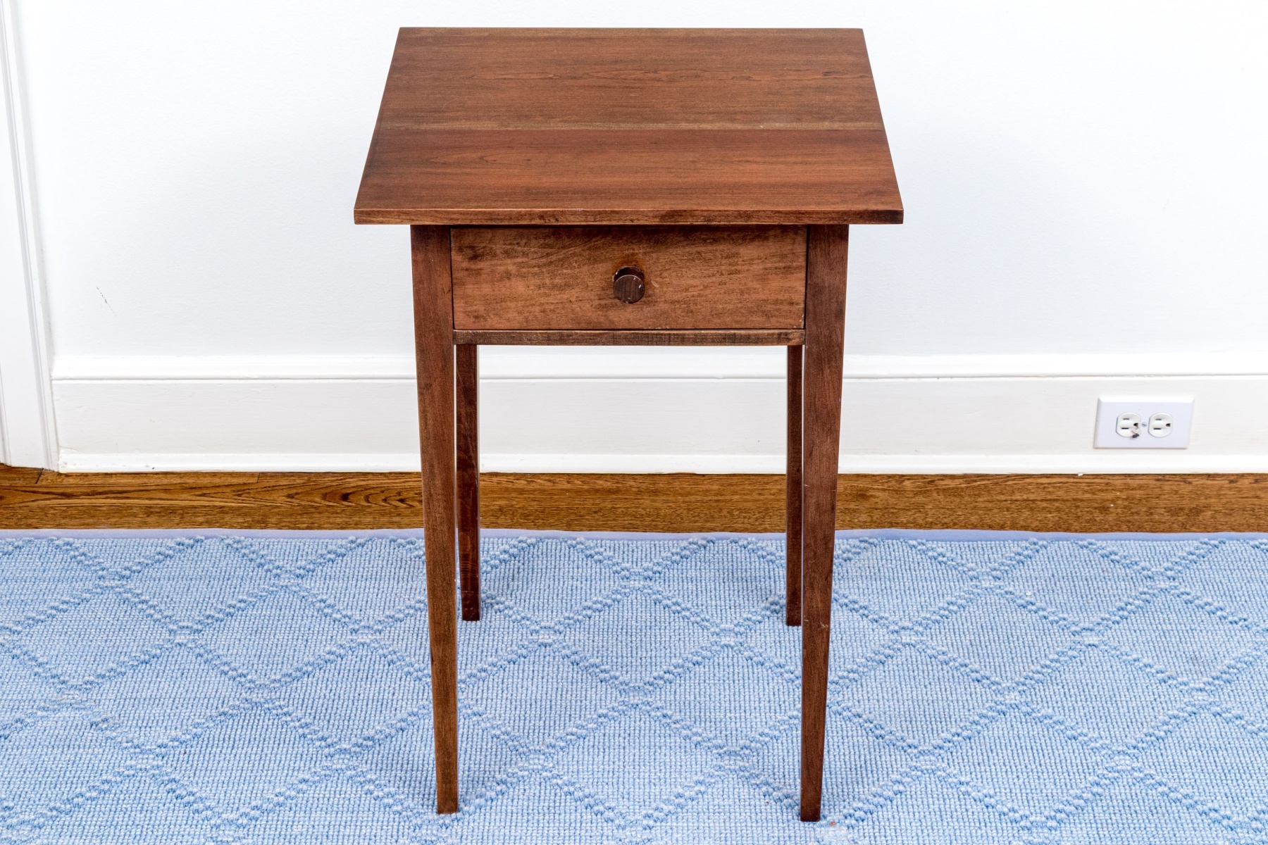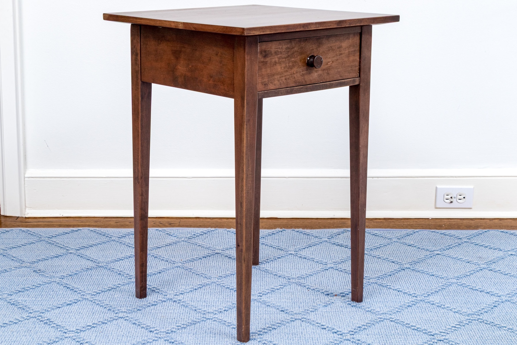 A gorgeous vintage reproduction stand in a rich, medium-dark brown finish. The end table features a simple square top over a single dovetail drawer with a circular knob. Raised on classic straight and tapered legs.