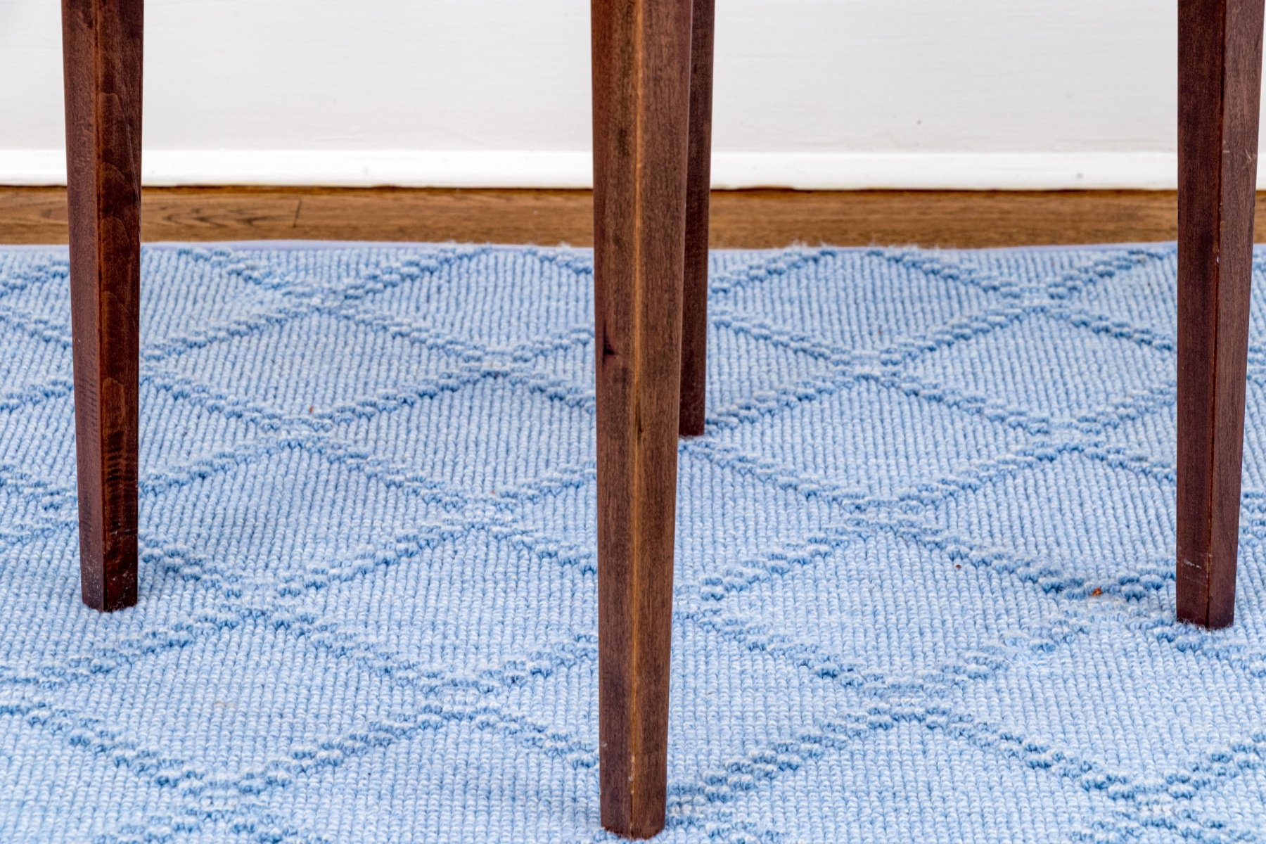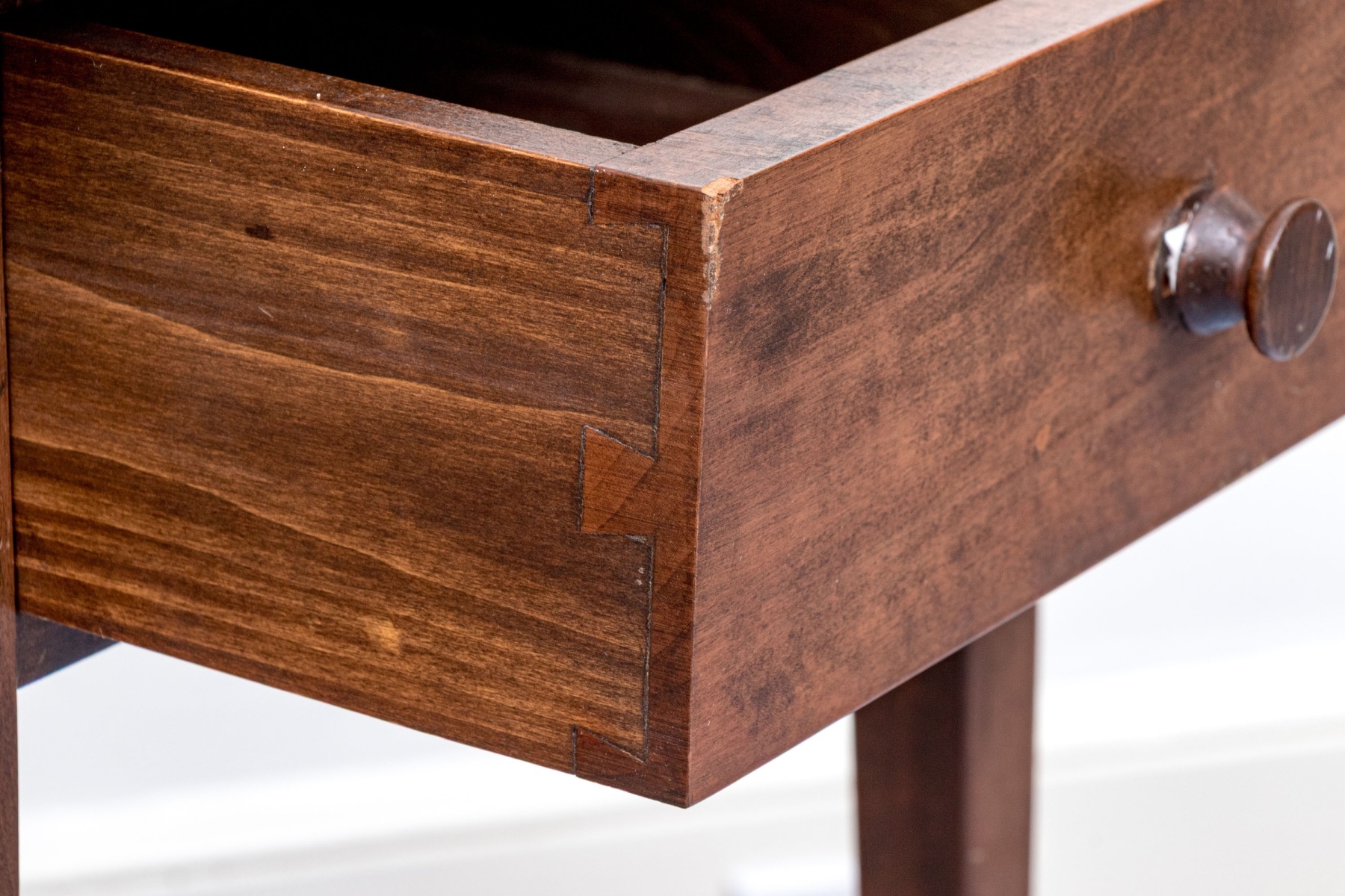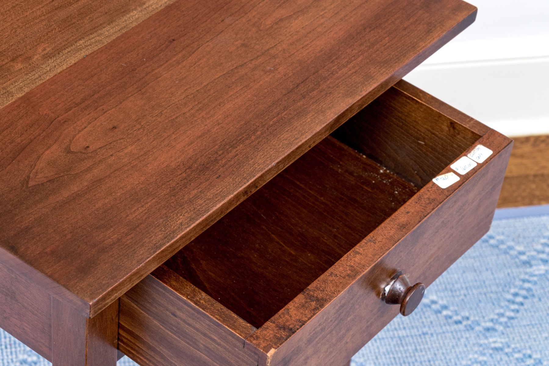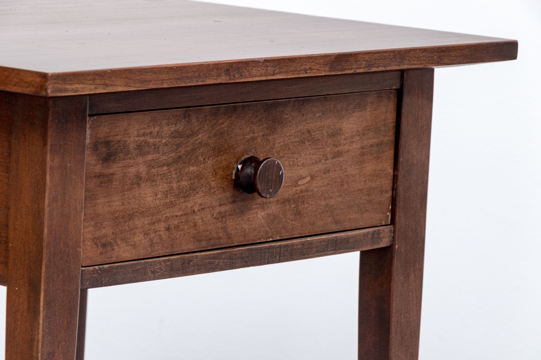 The knob has come loose of the drawer and needs to be re-glued. A faded band on the back end of the table top with some finish wear but overall in good form.