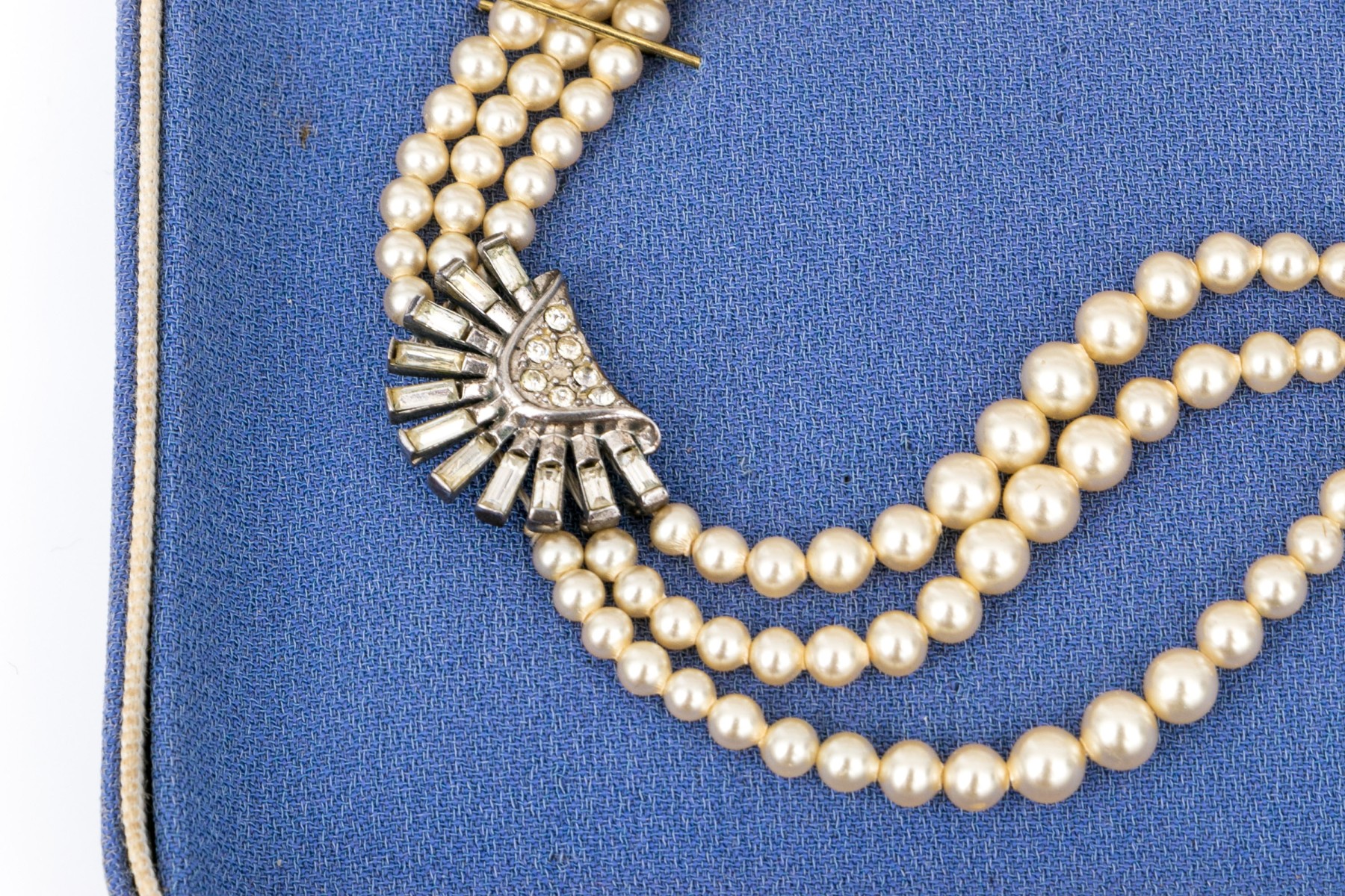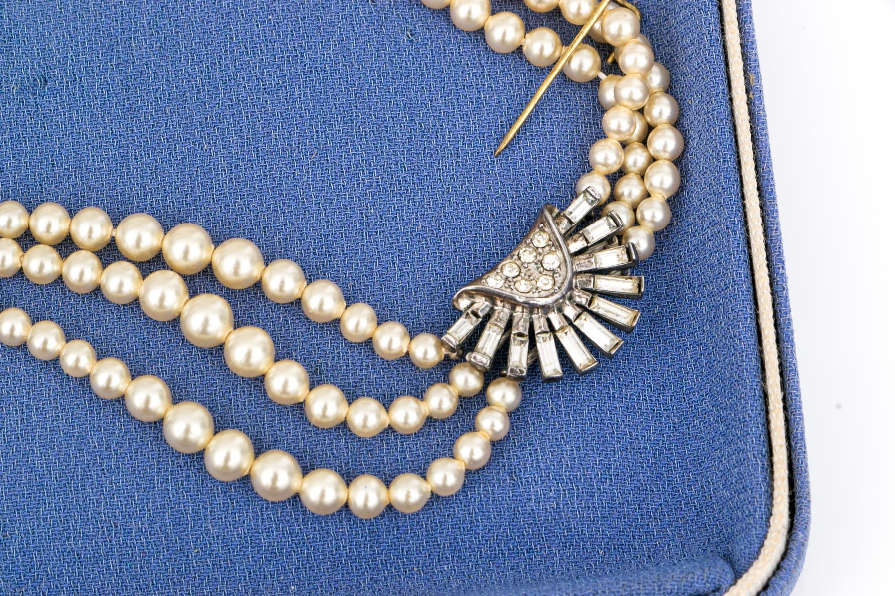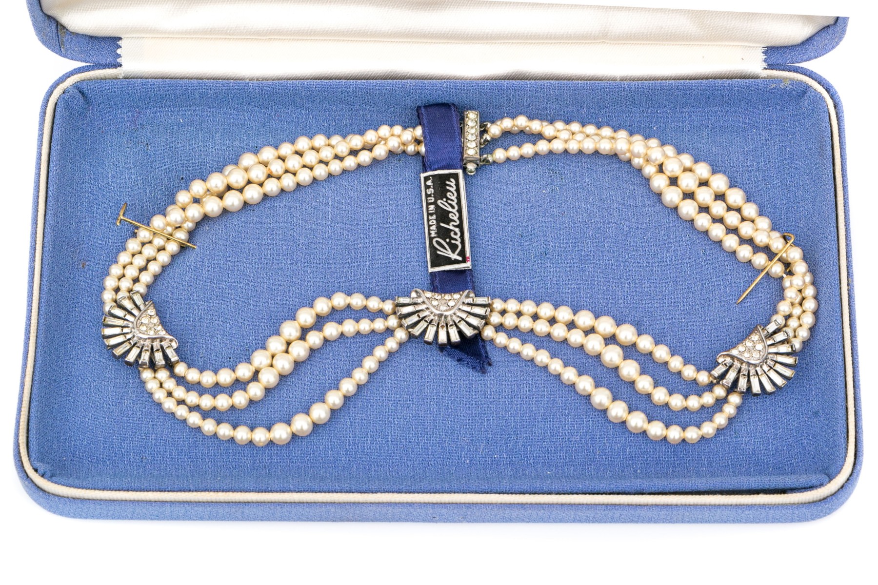 The three faux pearl strands set with fan shaped elements marked sterling and with faux diamonds. With the original tag and boxed.