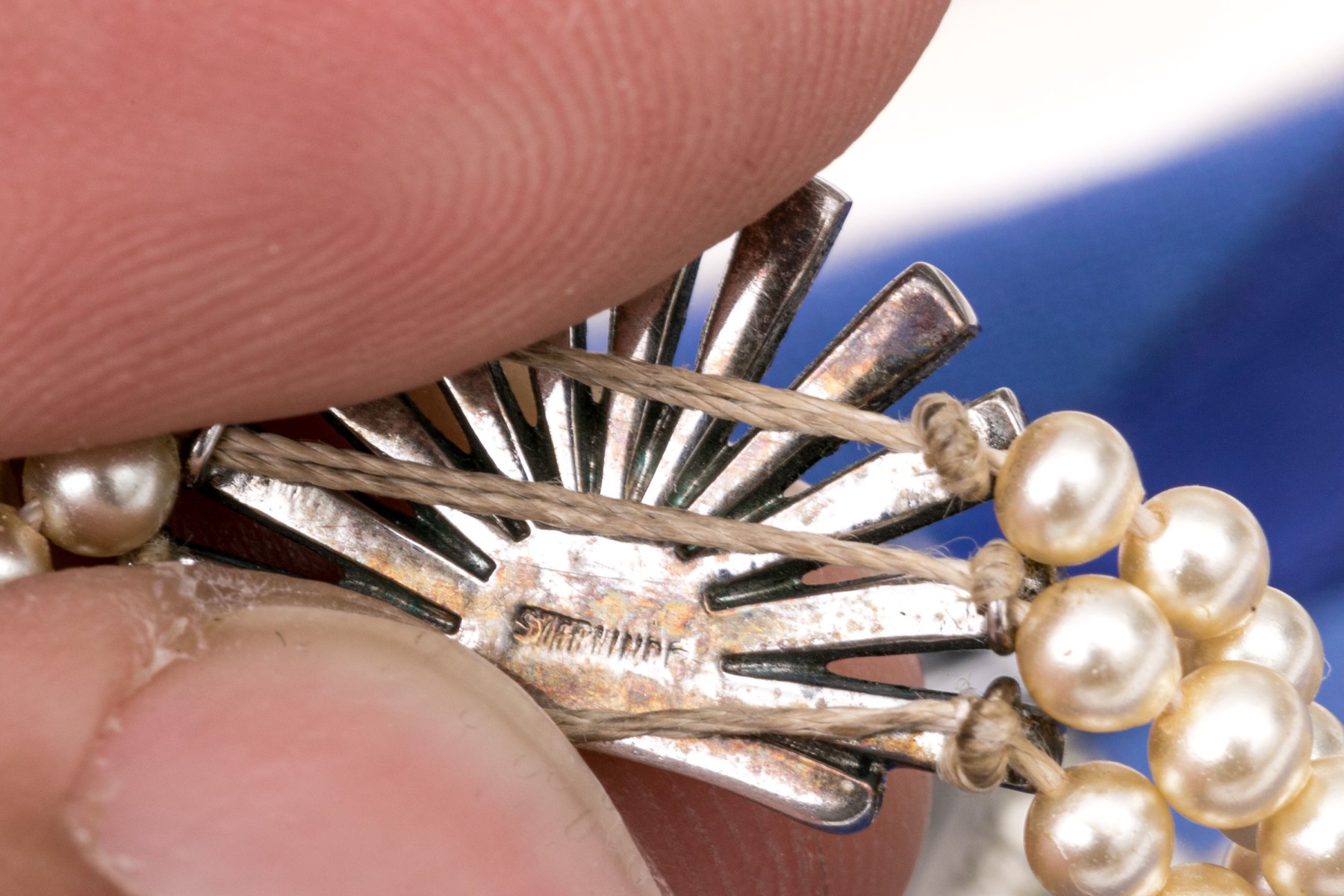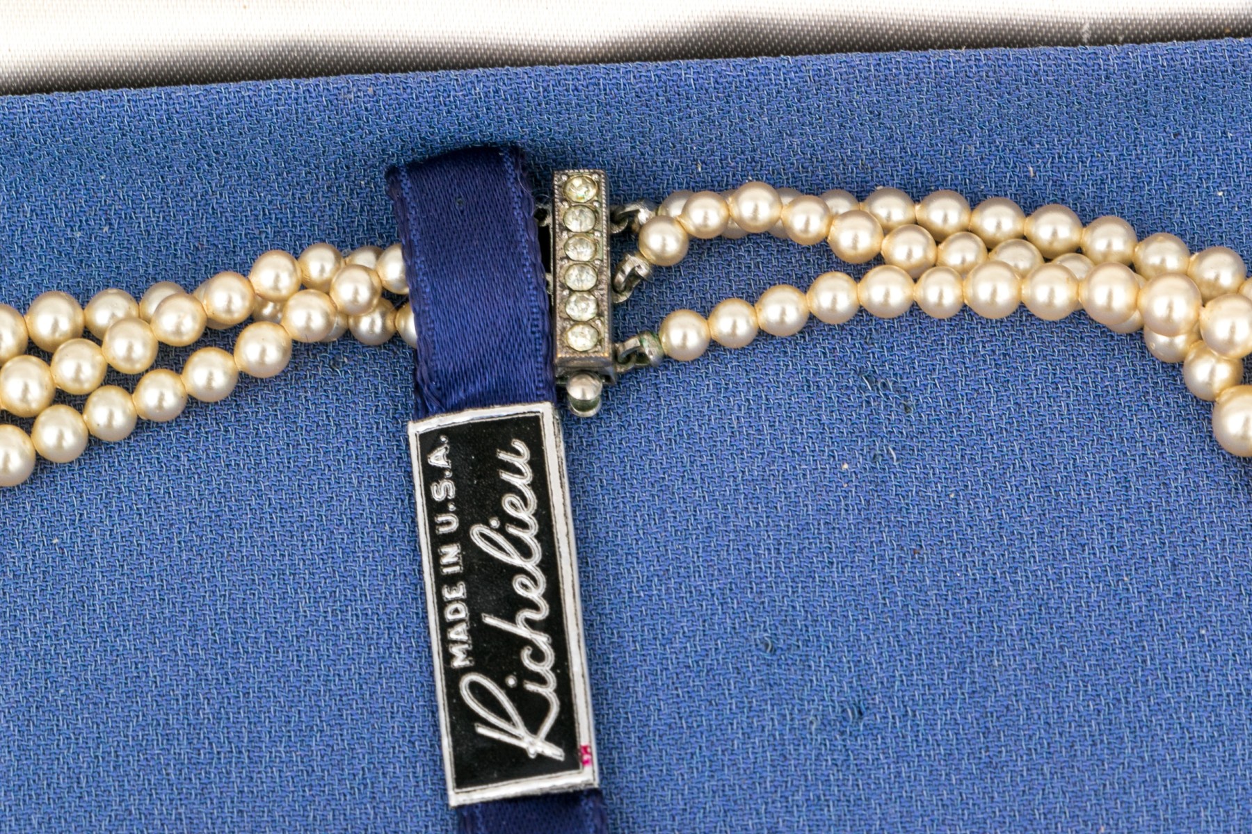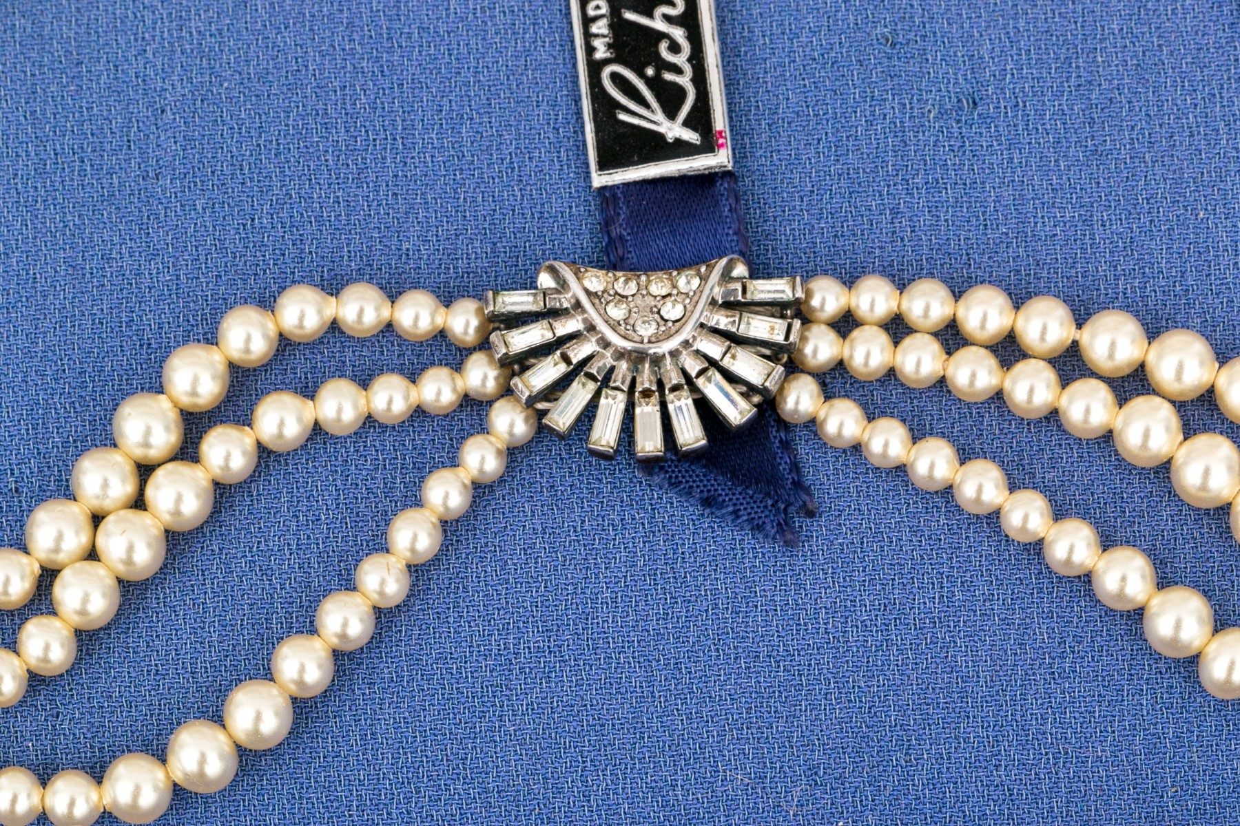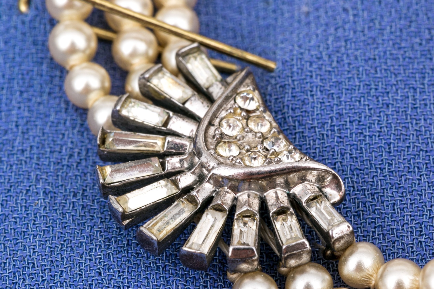 The three faux pearl strands set with fan shaped elements marked sterling and with faux diamonds. With the original tag and boxed.