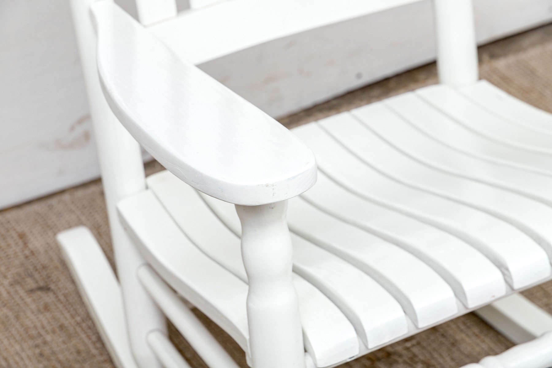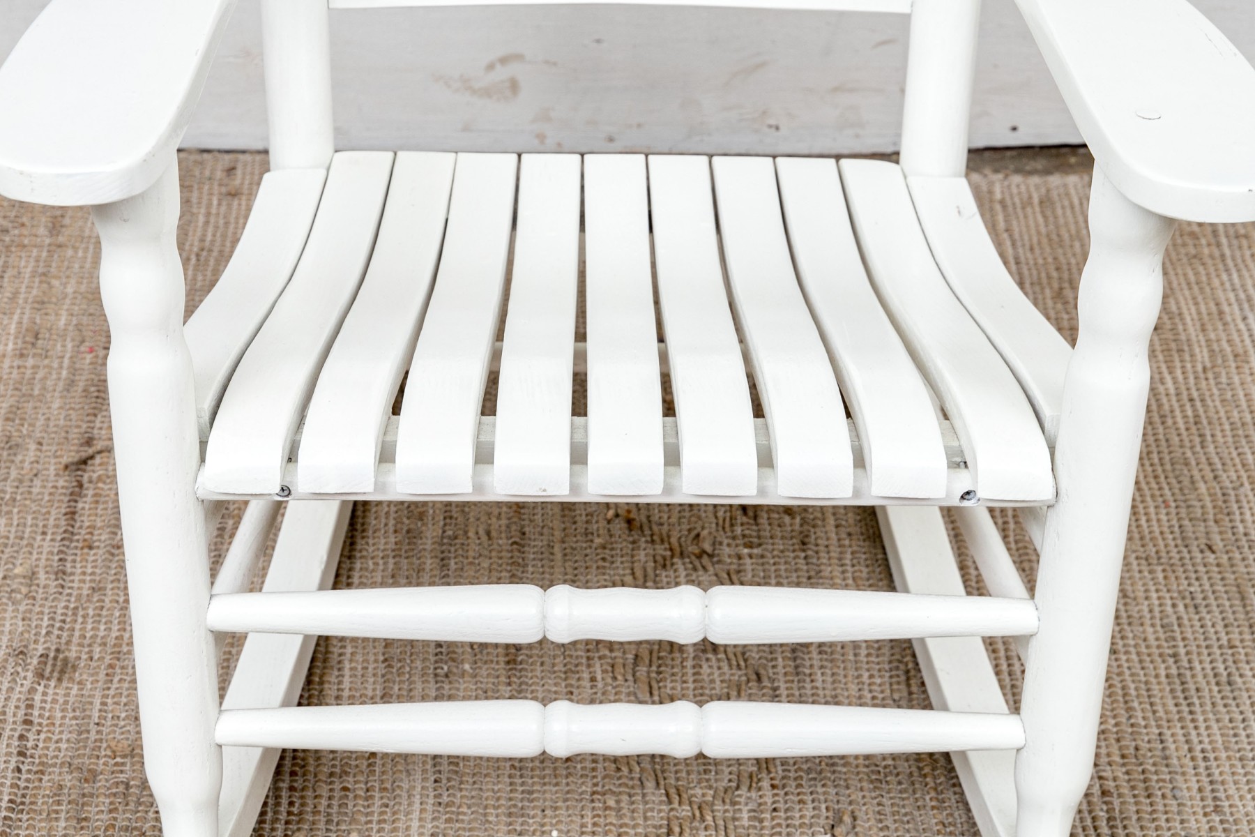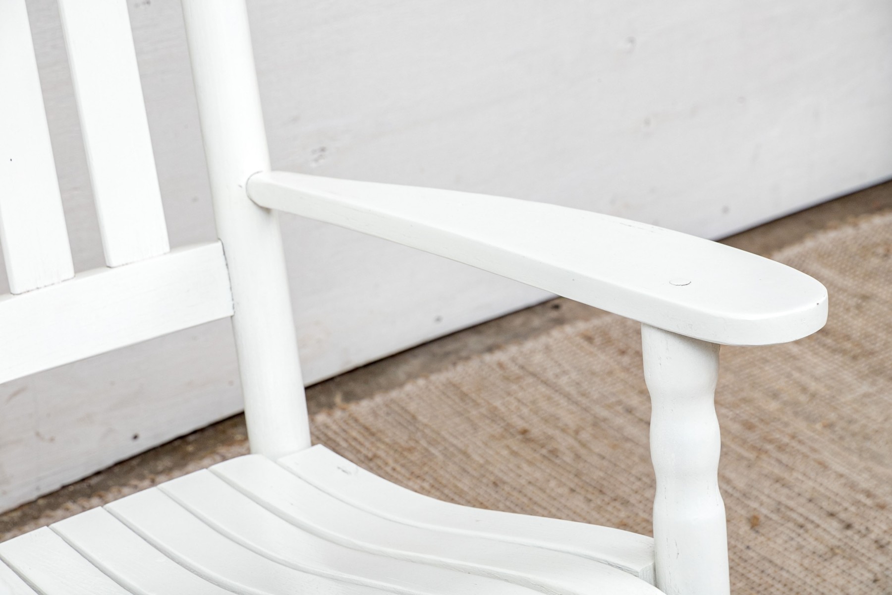 An ample sized rocker with slat back and turned arm supports. Raised on legs with double front and side stretchers, in a lustrous white paint.
