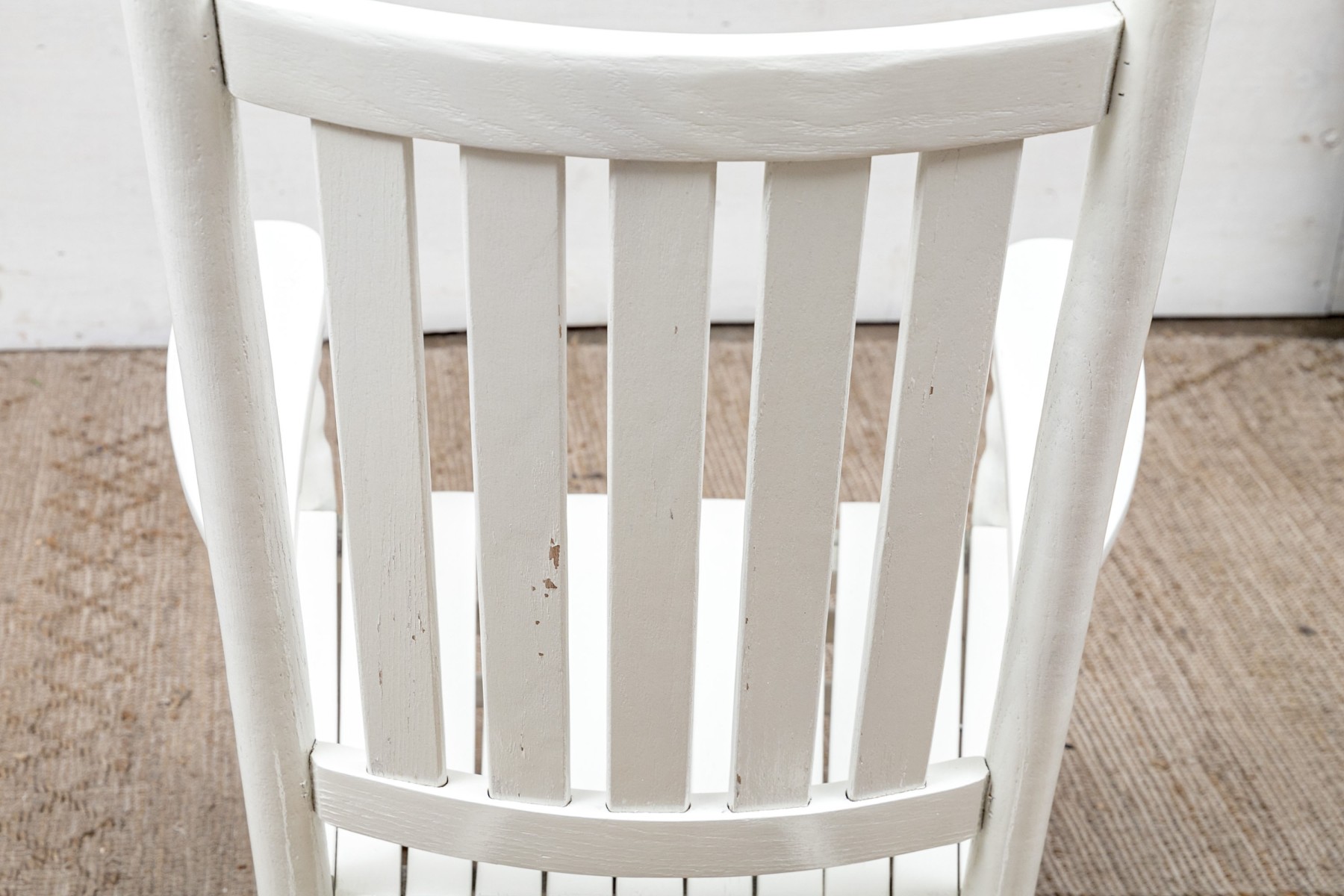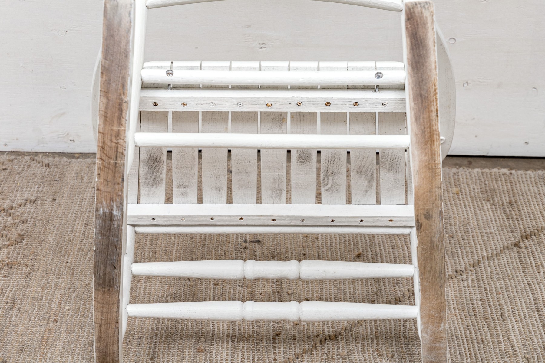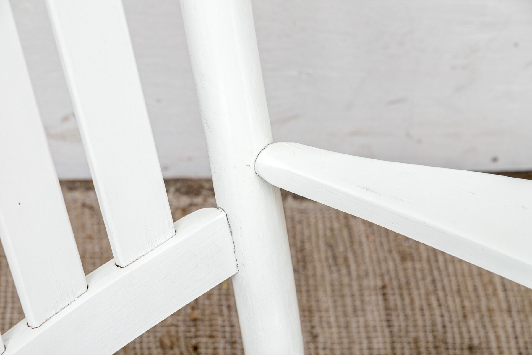 An ample sized rocker with slat back and turned arm supports. Raised on legs with double front and side stretchers, in a lustrous white paint.