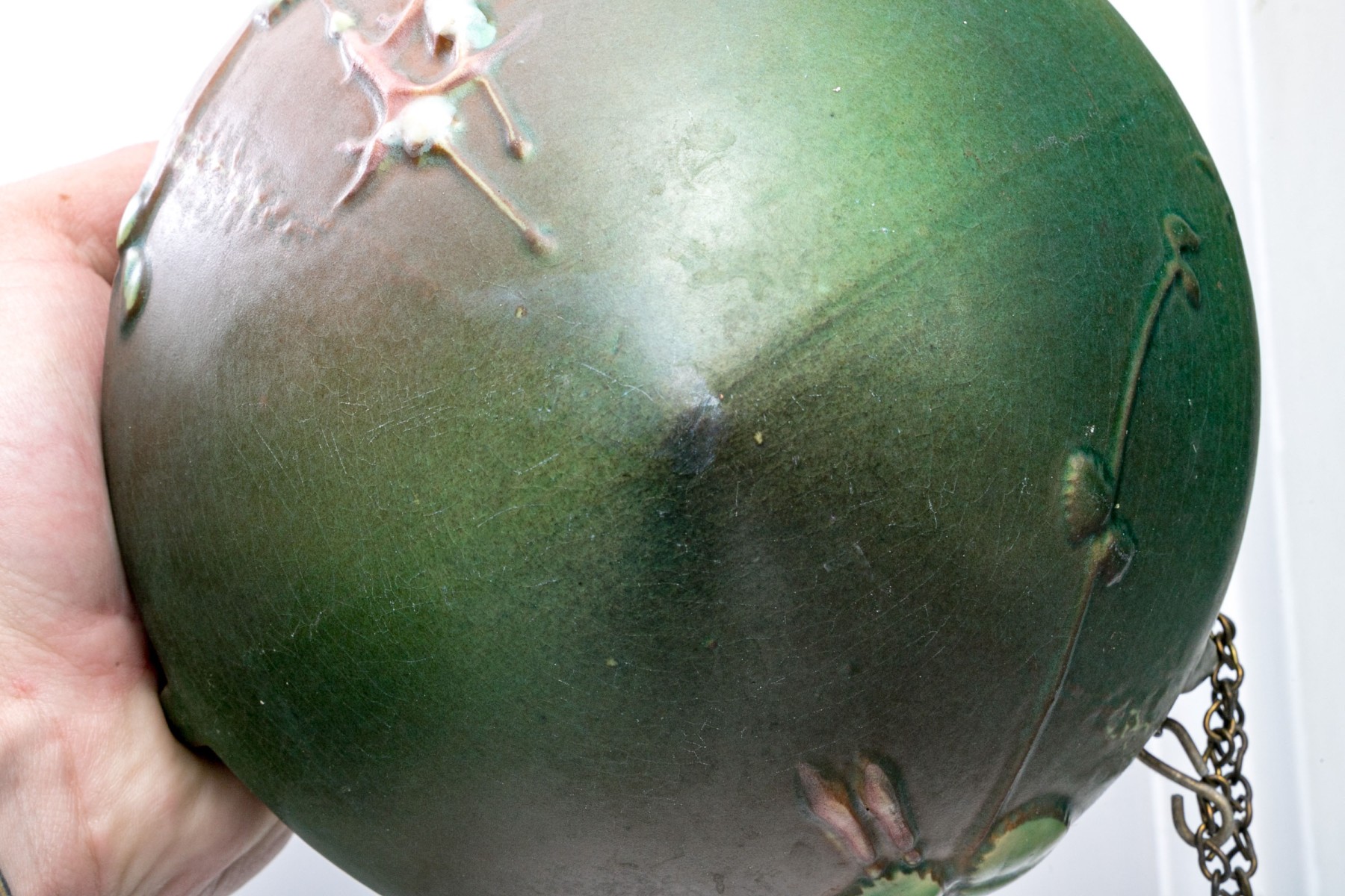 The spade form bowl with wonderful naturalistic moulded and glazed branch and foliate motifs in relief. The cylindrical neck with three moulded loop handles where the chain to hang is strung through.