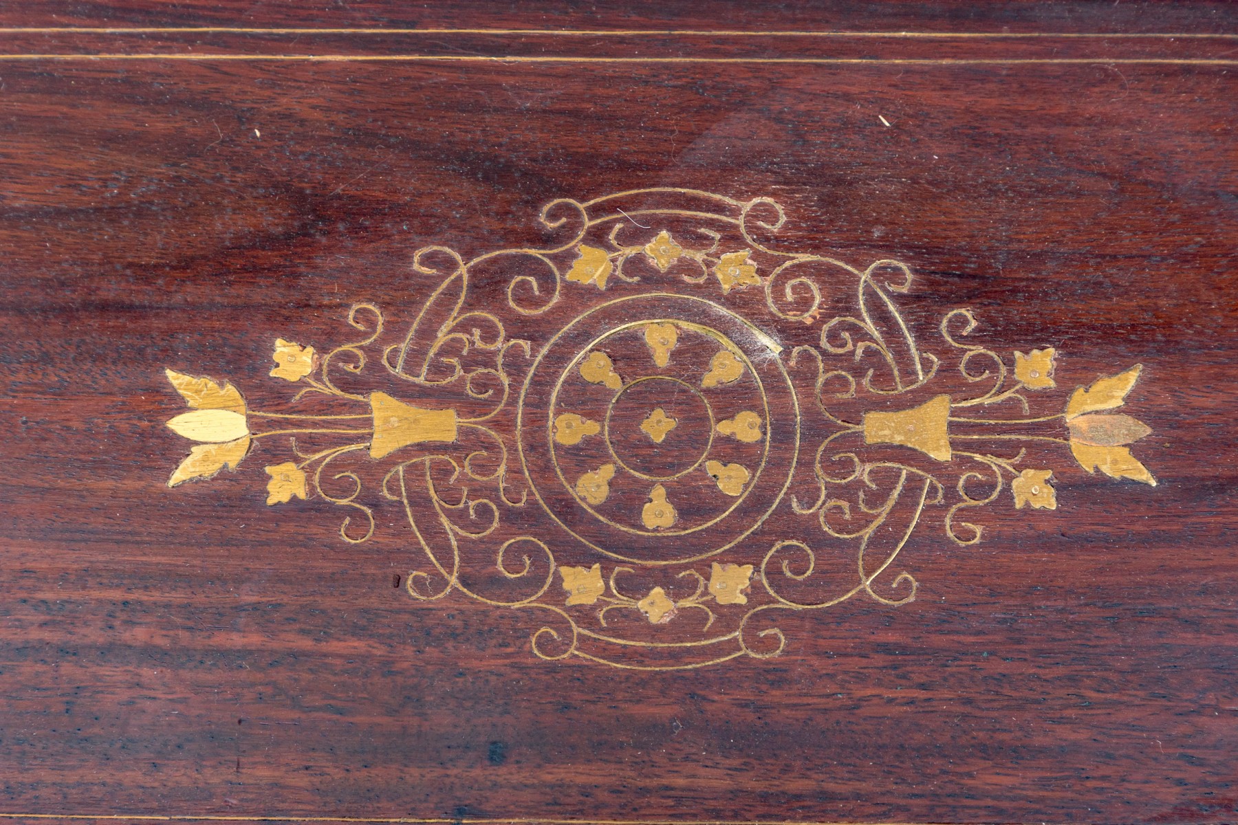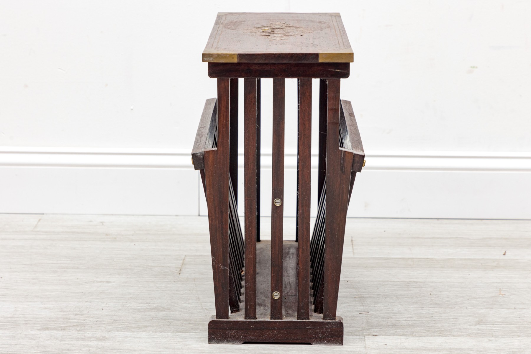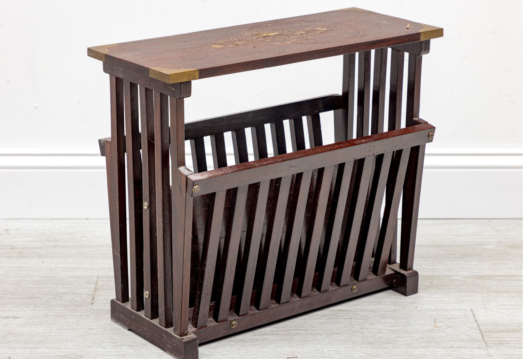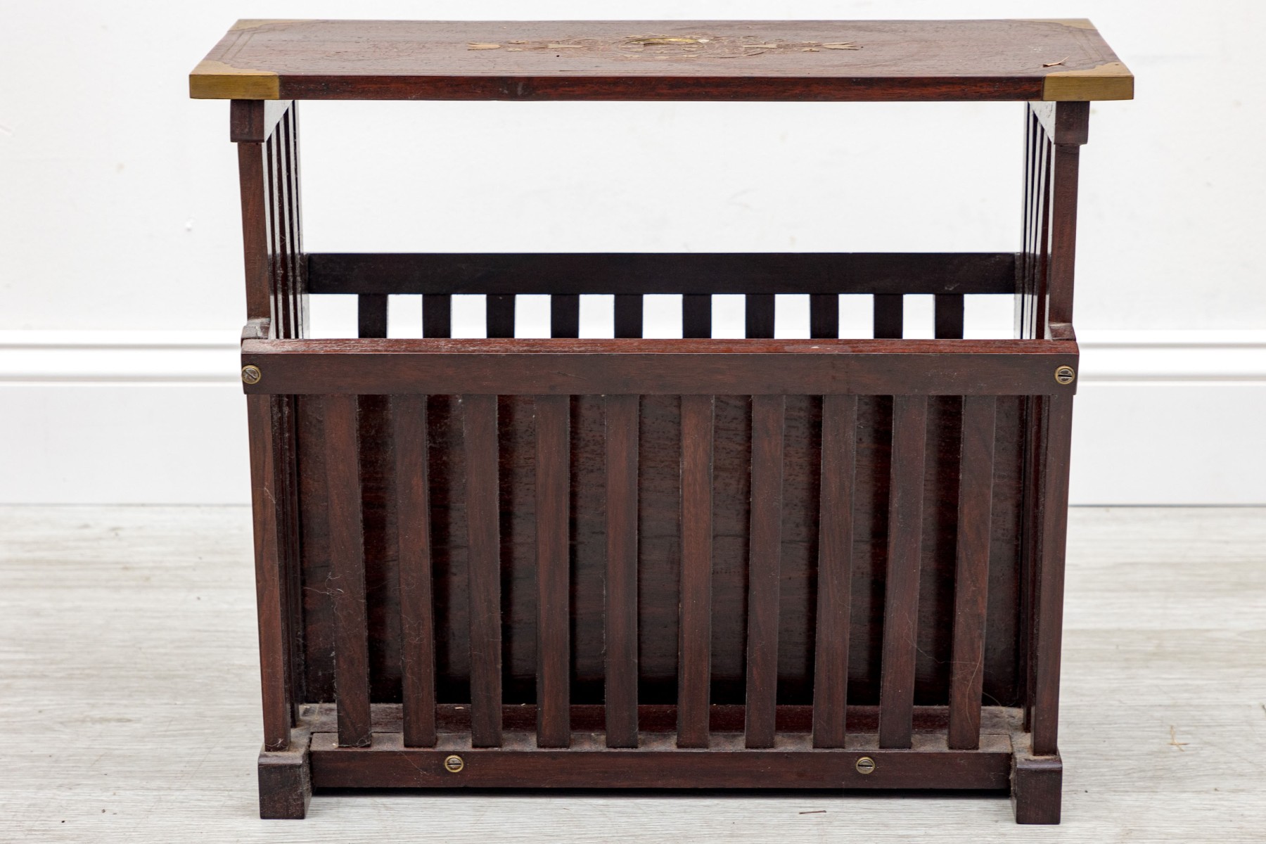 A beautiful and robust rosewood magazine rack embellished with brass-work inlays in the form of a floral center medallion and corner protectors.