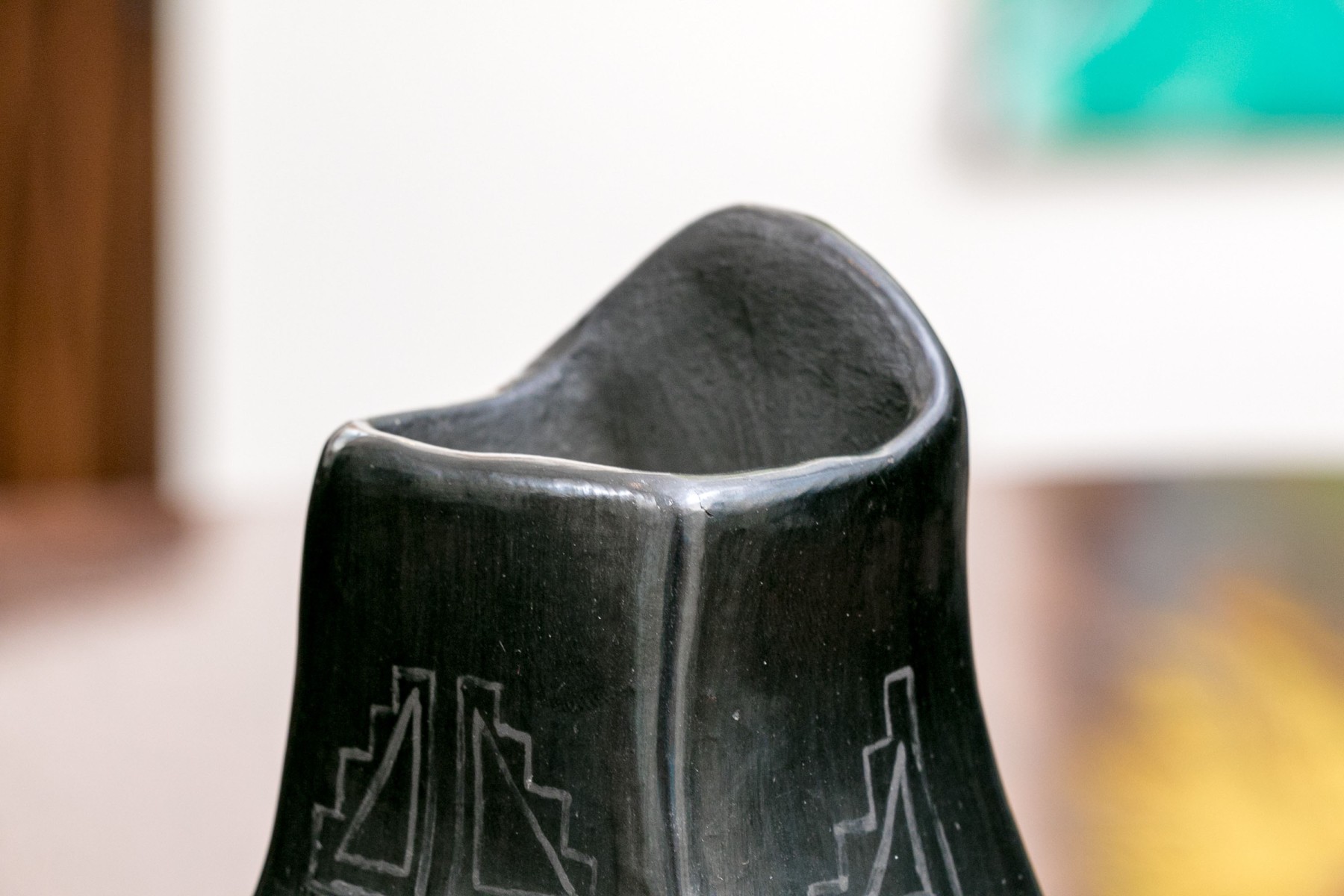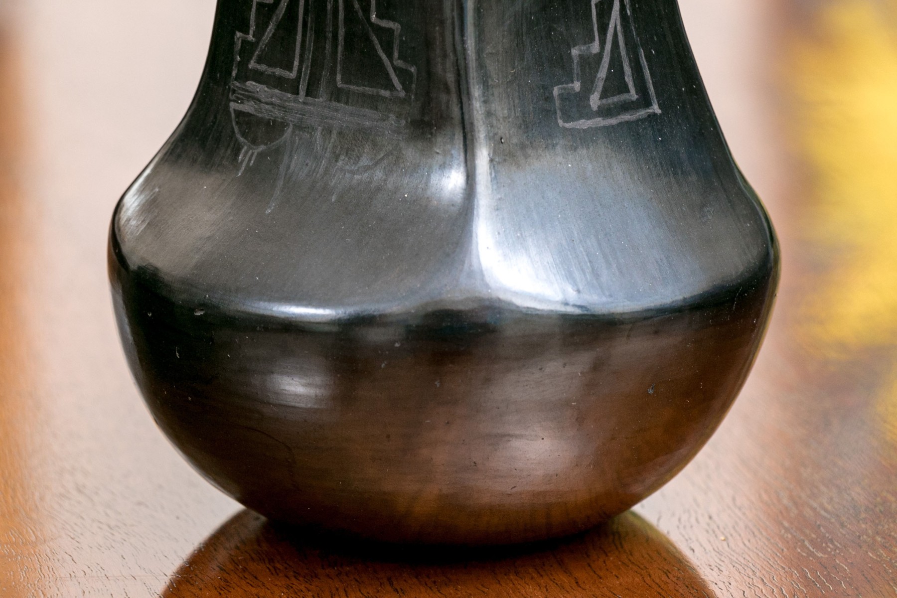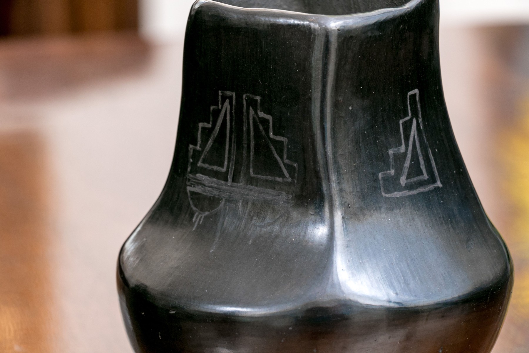 A black glazed pottery vase with etchings in geometric designs. Signed underfoot indistinctly.