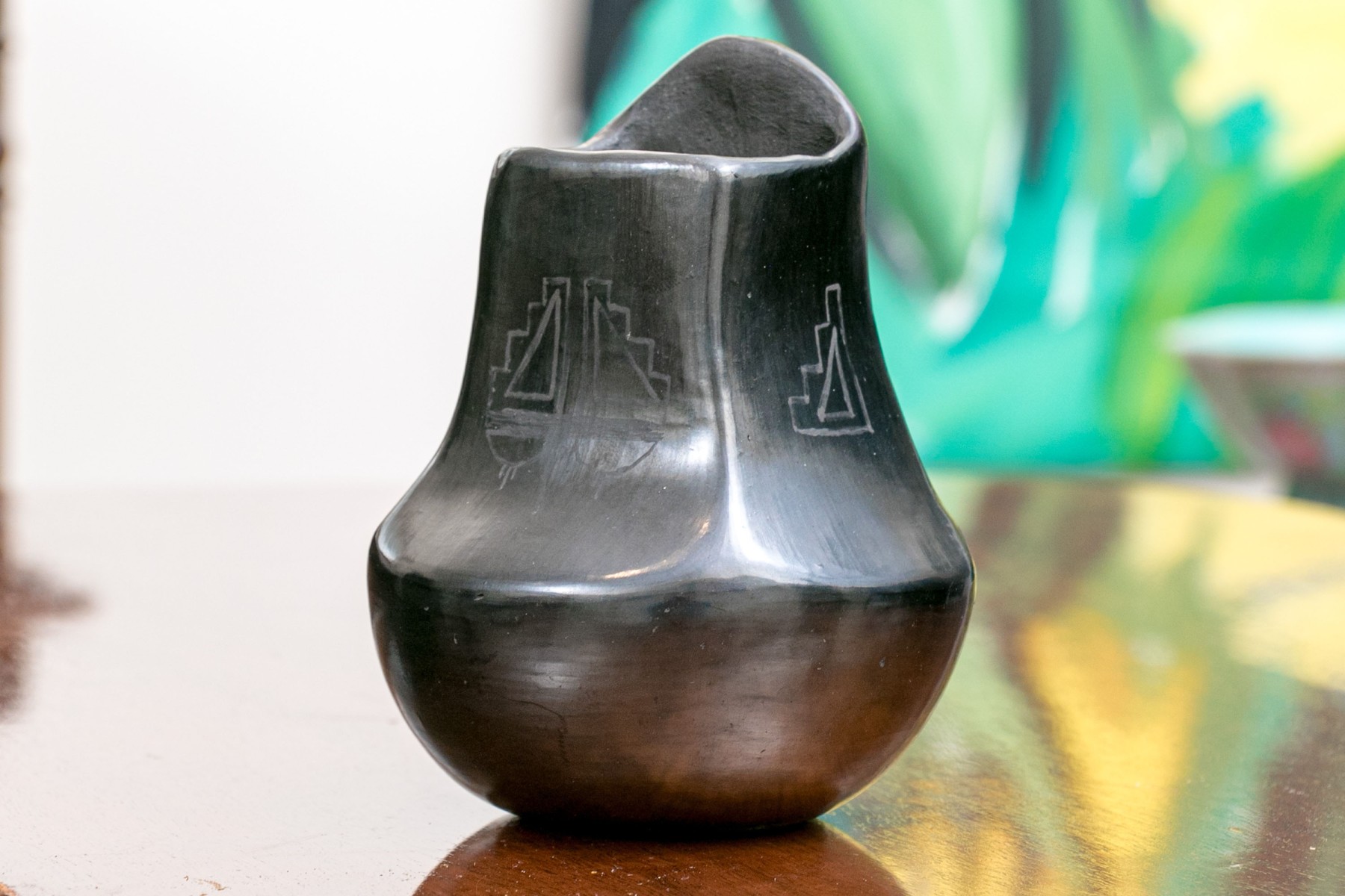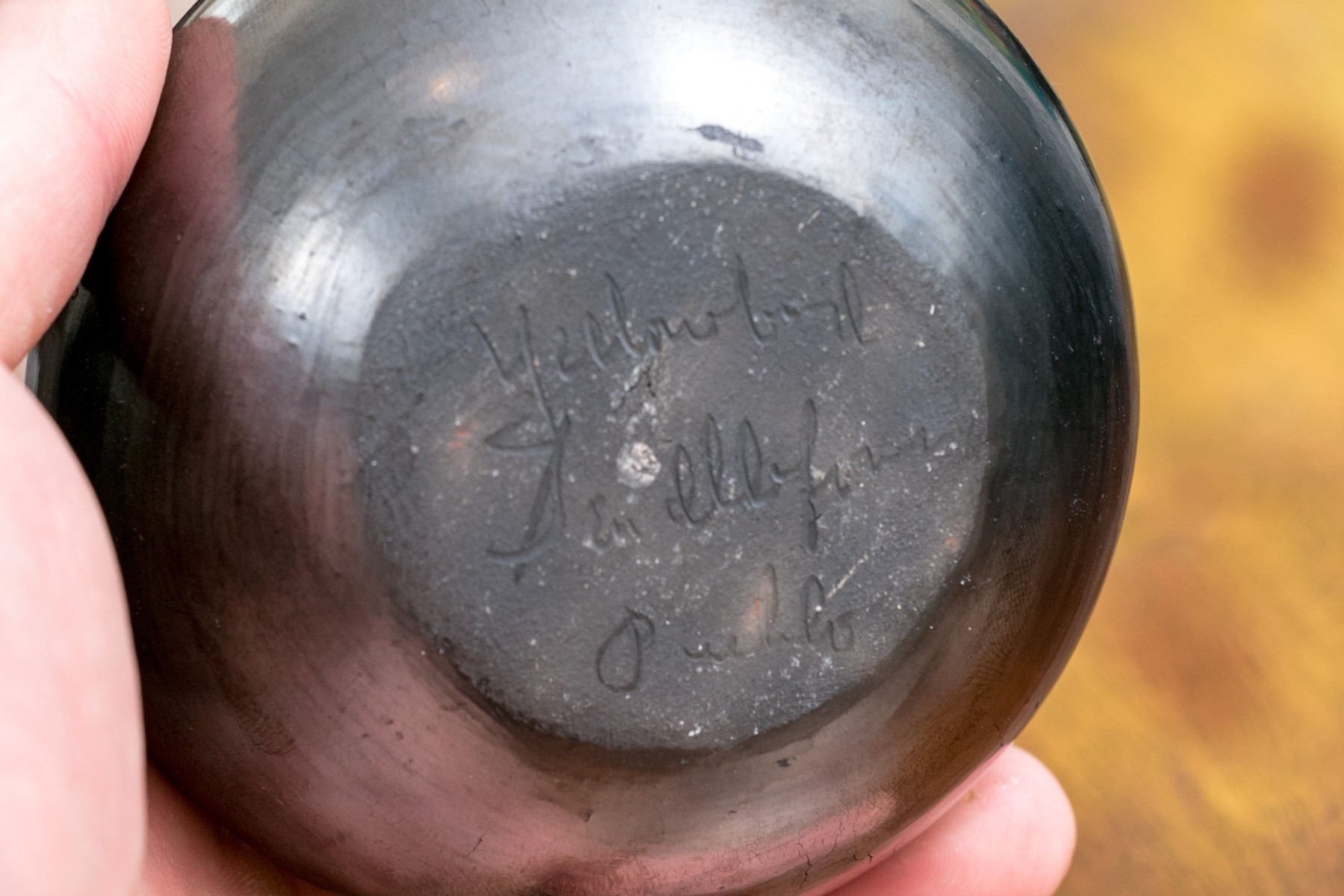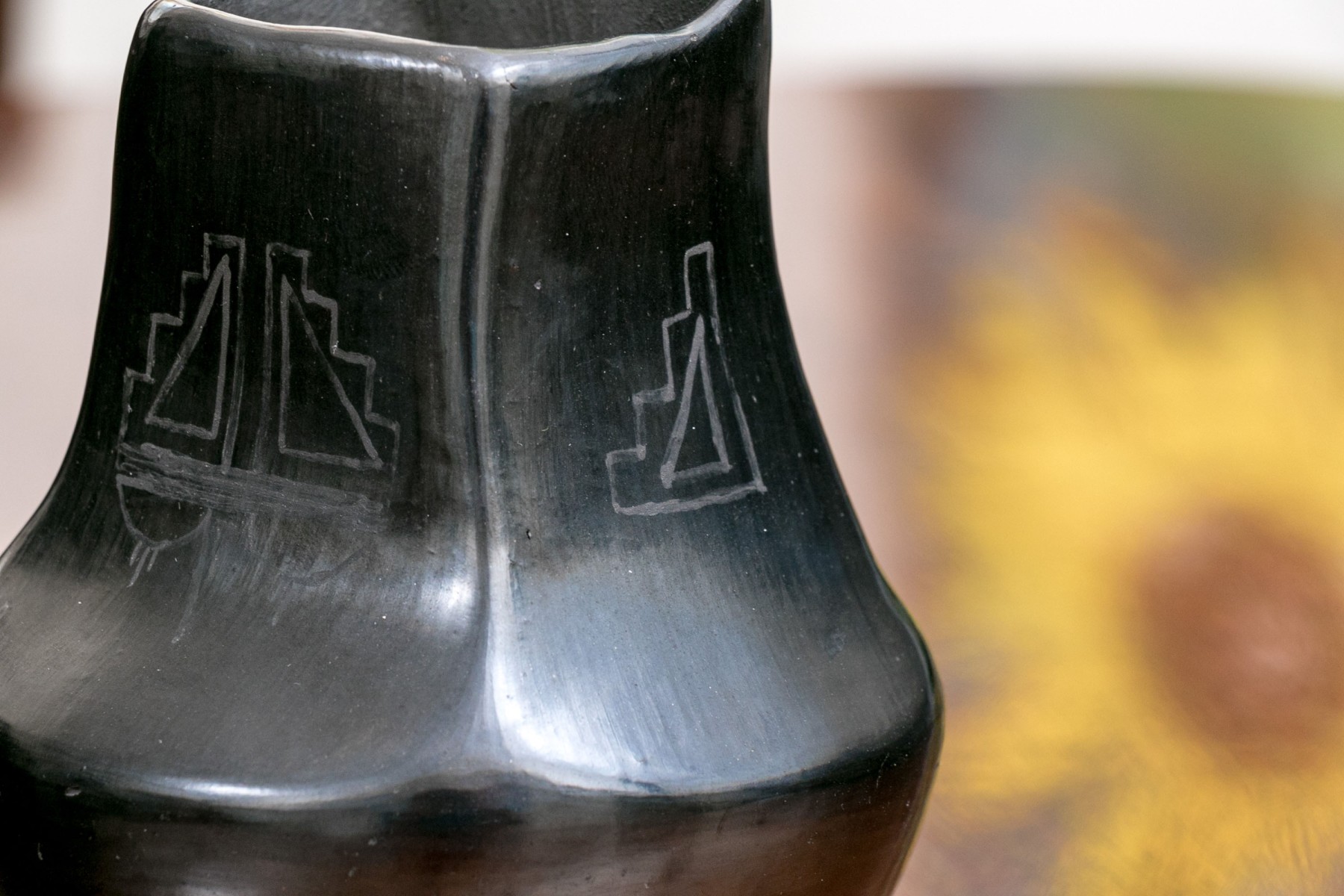 A black glazed pottery vase with etchings in geometric designs. Signed underfoot indistinctly.