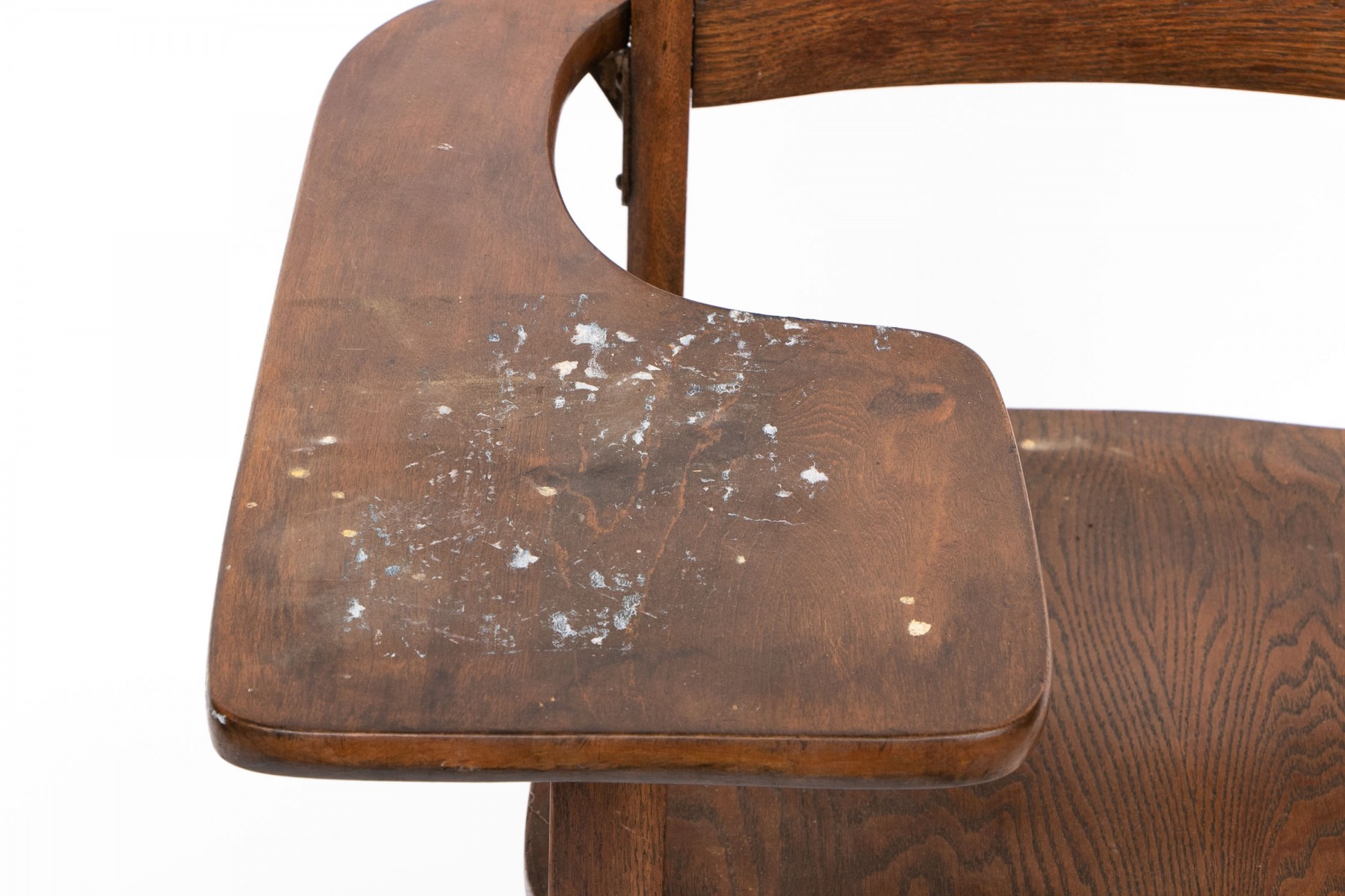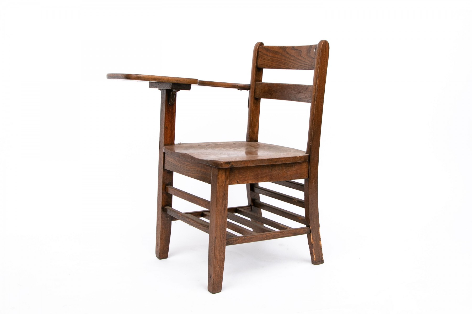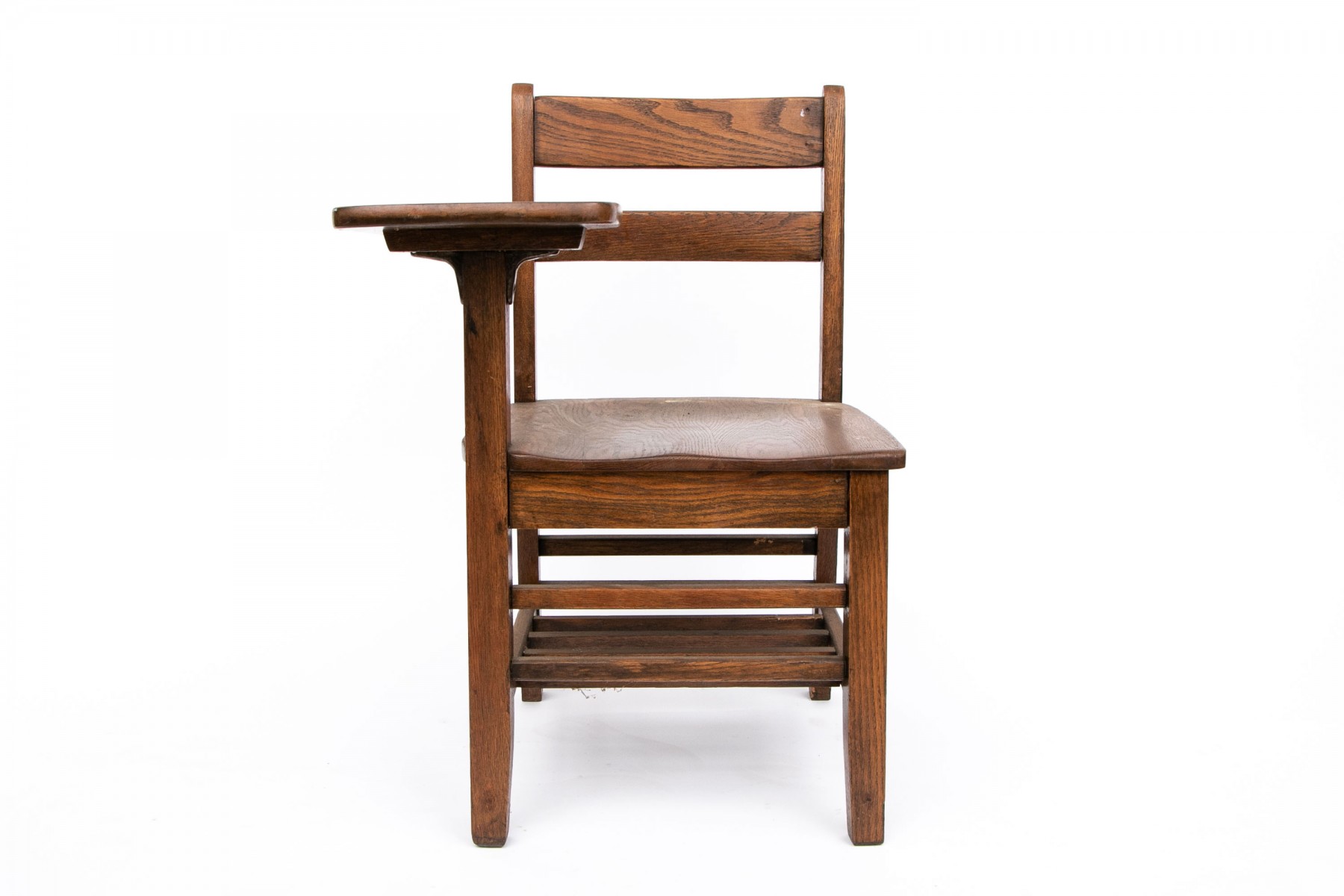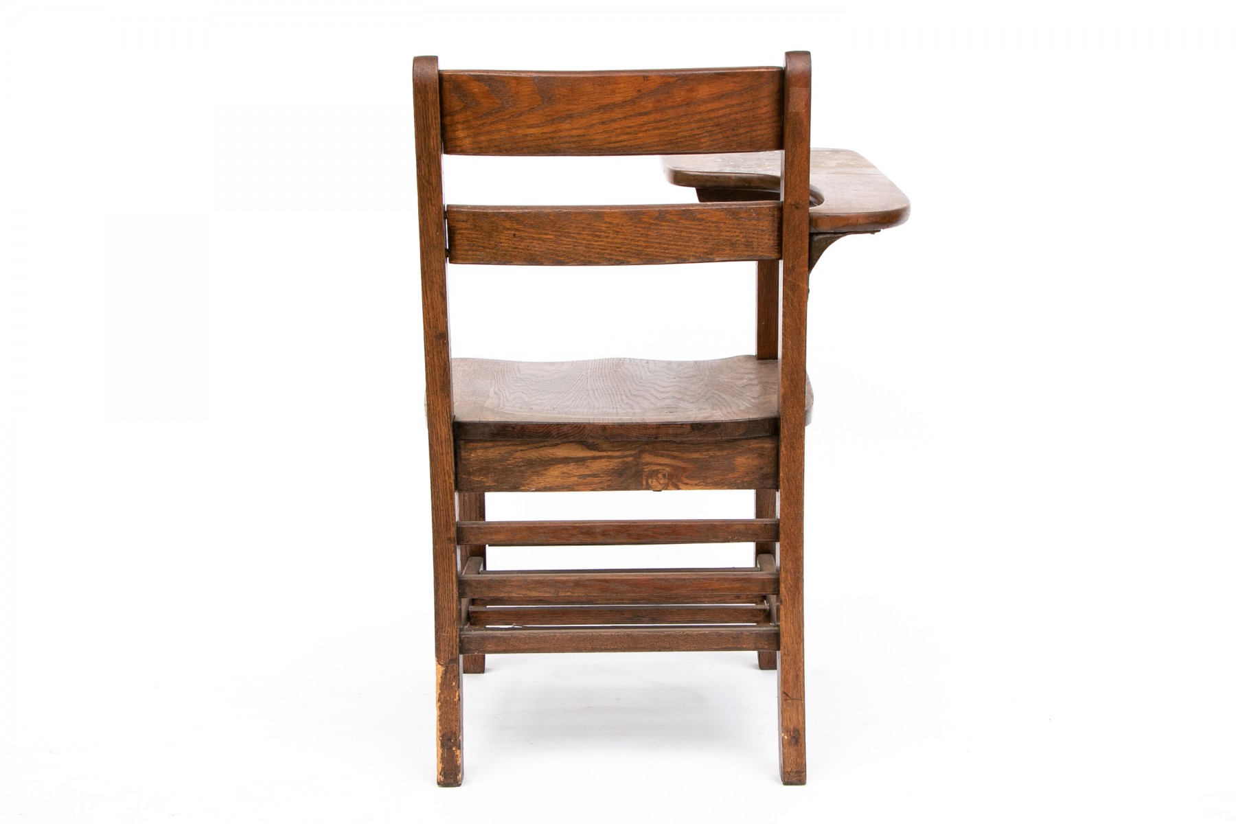 A vintage classroom desk, with two horizontal slats flanked by two post at back, above a shaped seat with attached desk at right side, supported on four splayed legs with double stretcher and book rack.