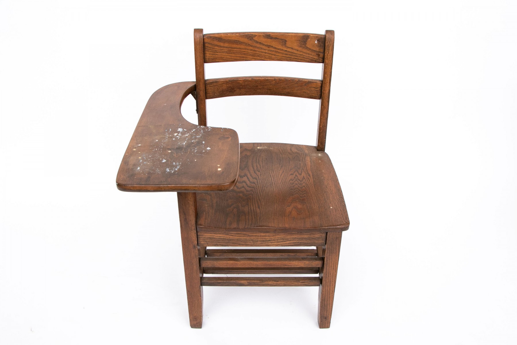 Overall good vintage condition with expected signs of age use including wear to desk top's stained finish and a slight wobble that only adds character.