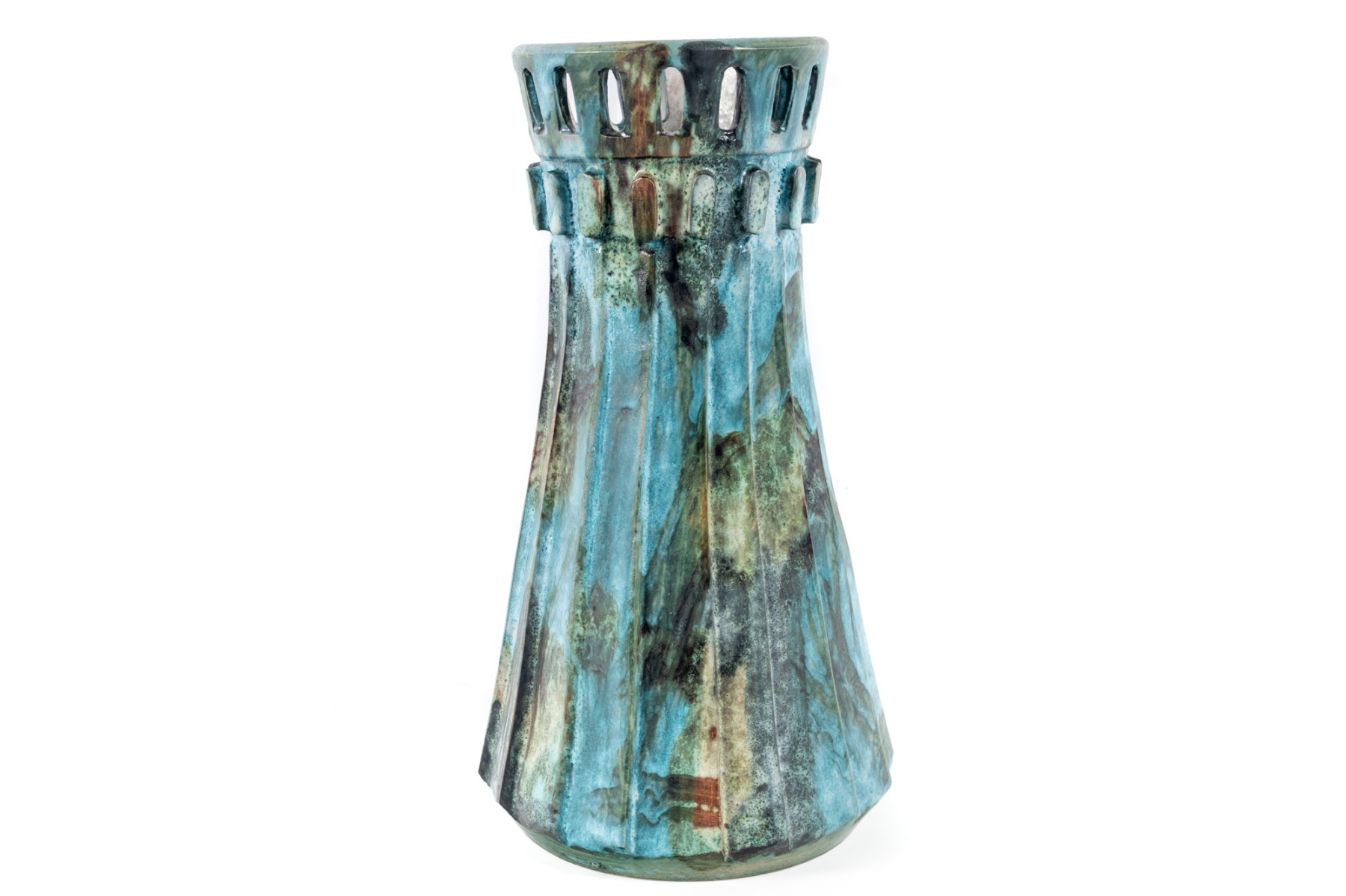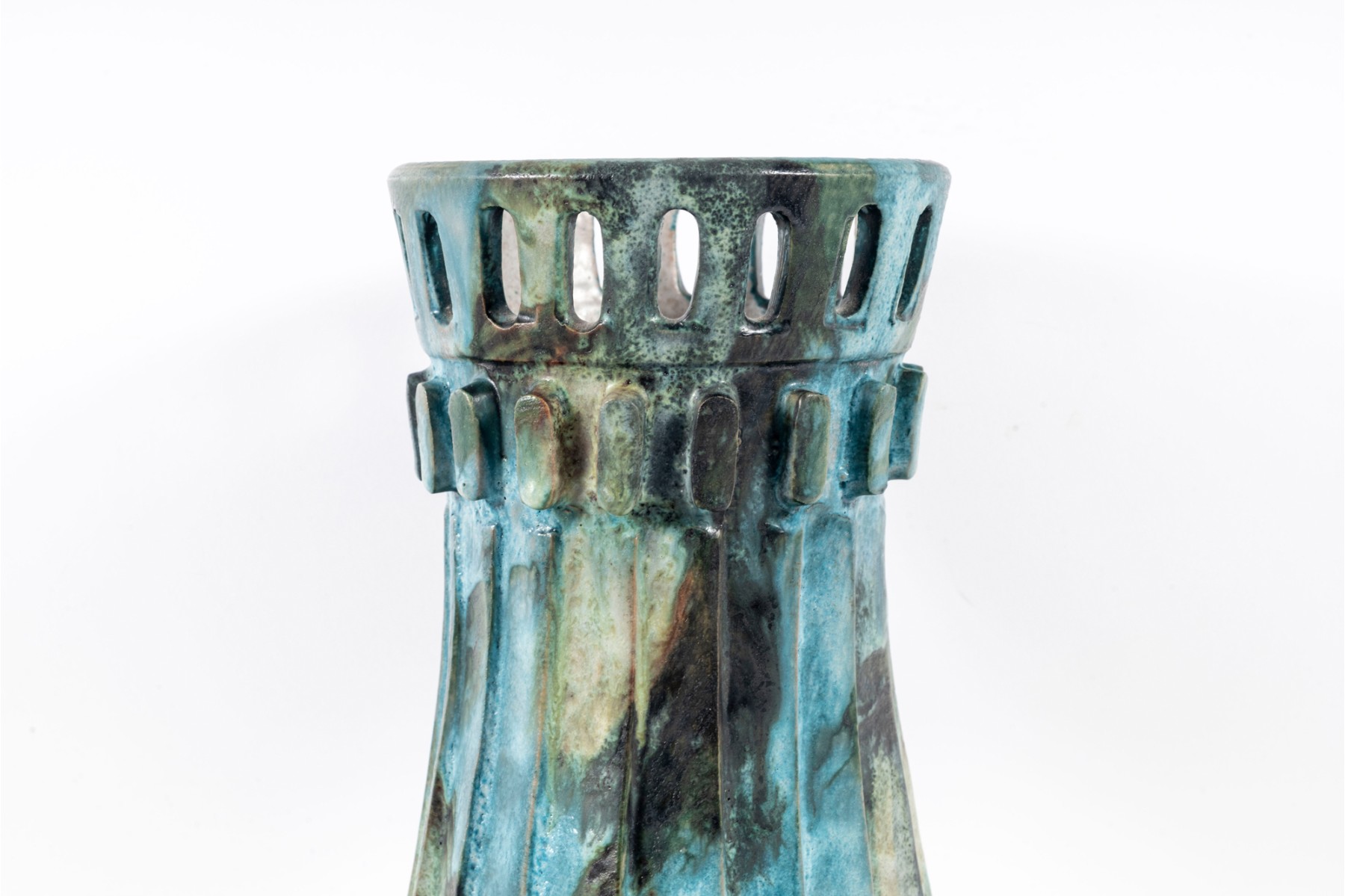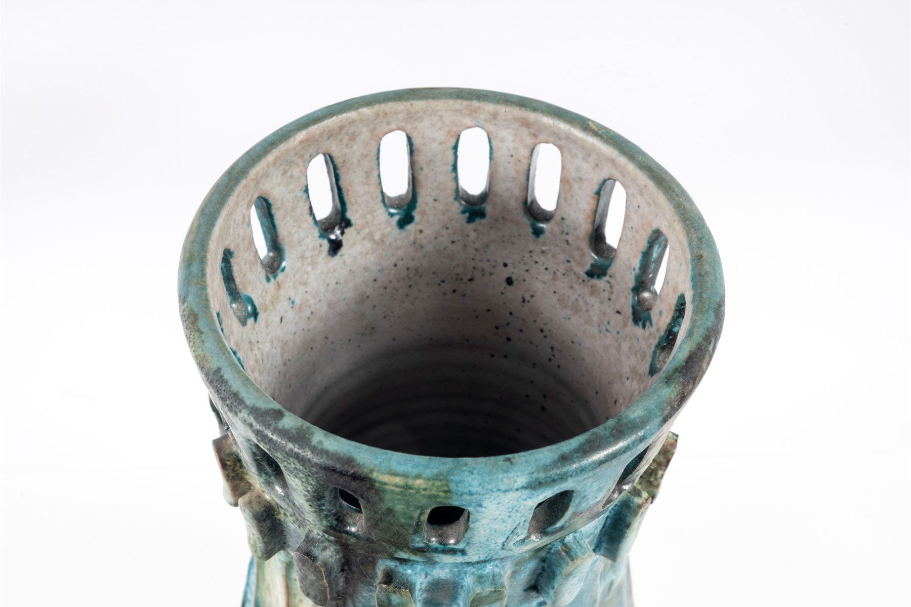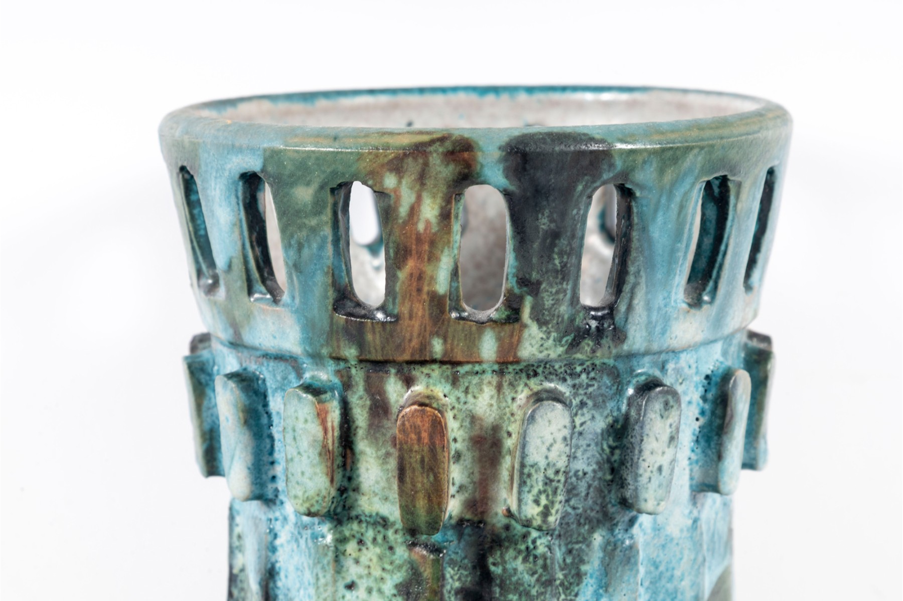 A vintage ceramic “Sea Garden” Vase by Italian potter Alvino Bagni, denoted by an earthy exterior glaze and pierced trim details.