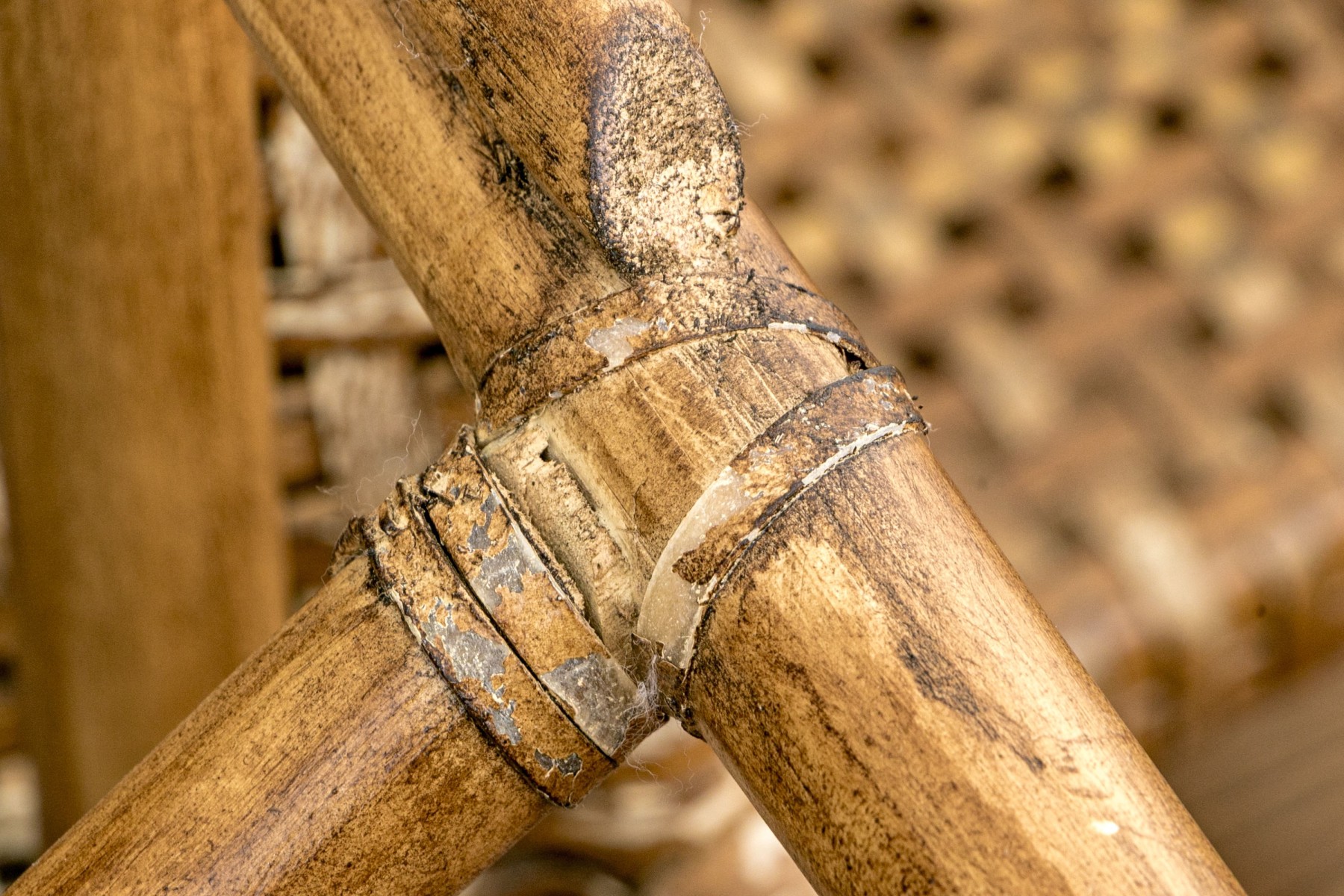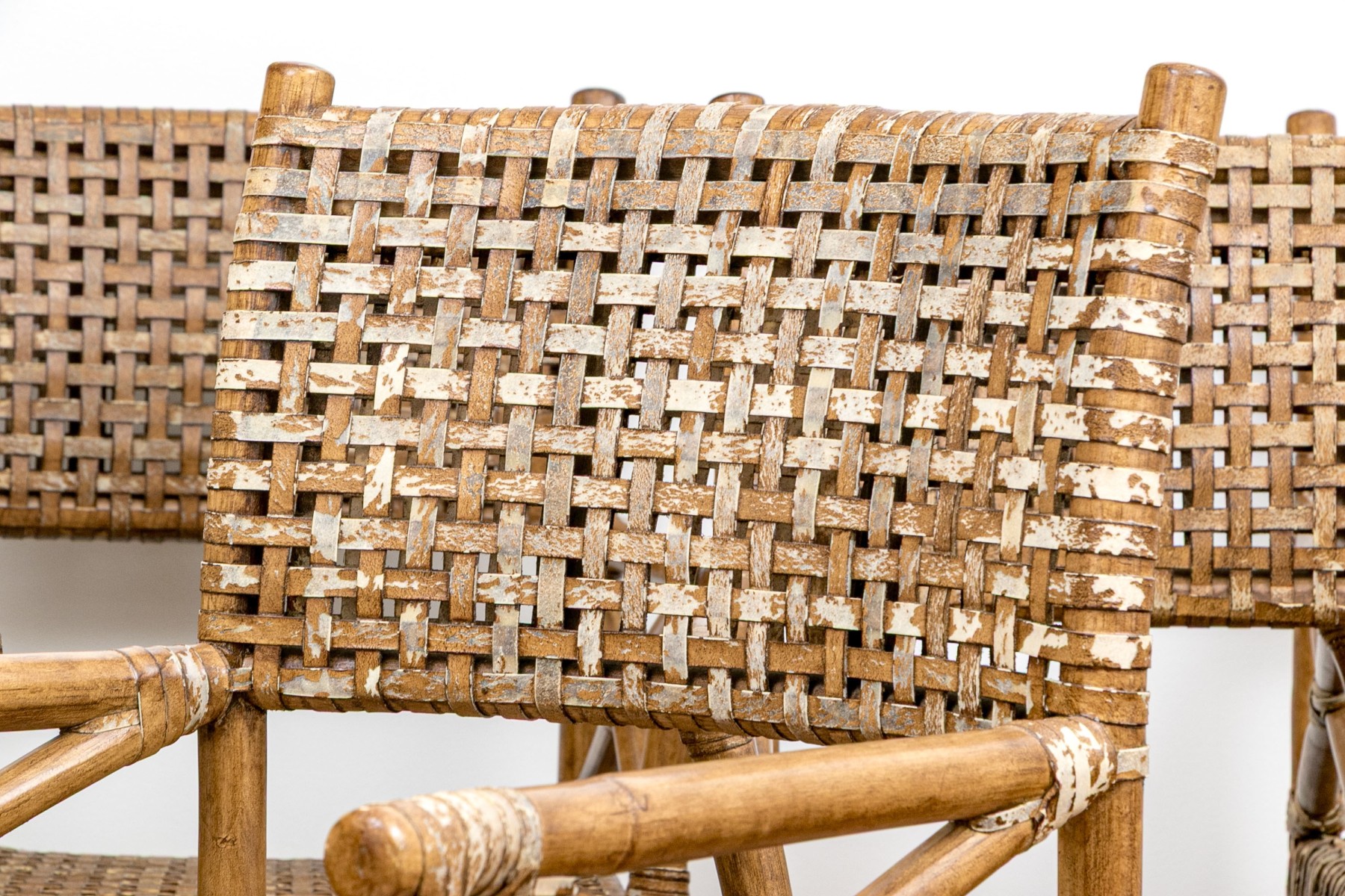 Each armchair is of lightweight, sturdy bamboo construction with rattan binding. Frame with two arms each on four legs each with X form stretcher supports for structure. With leather woven seats and seat backs.