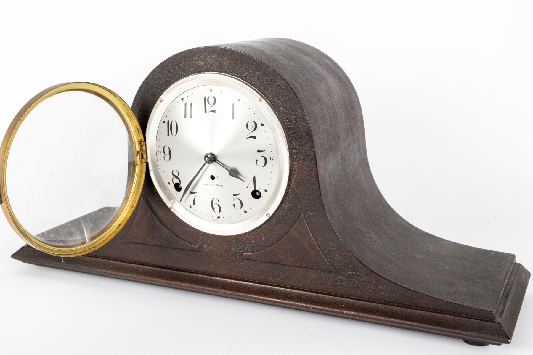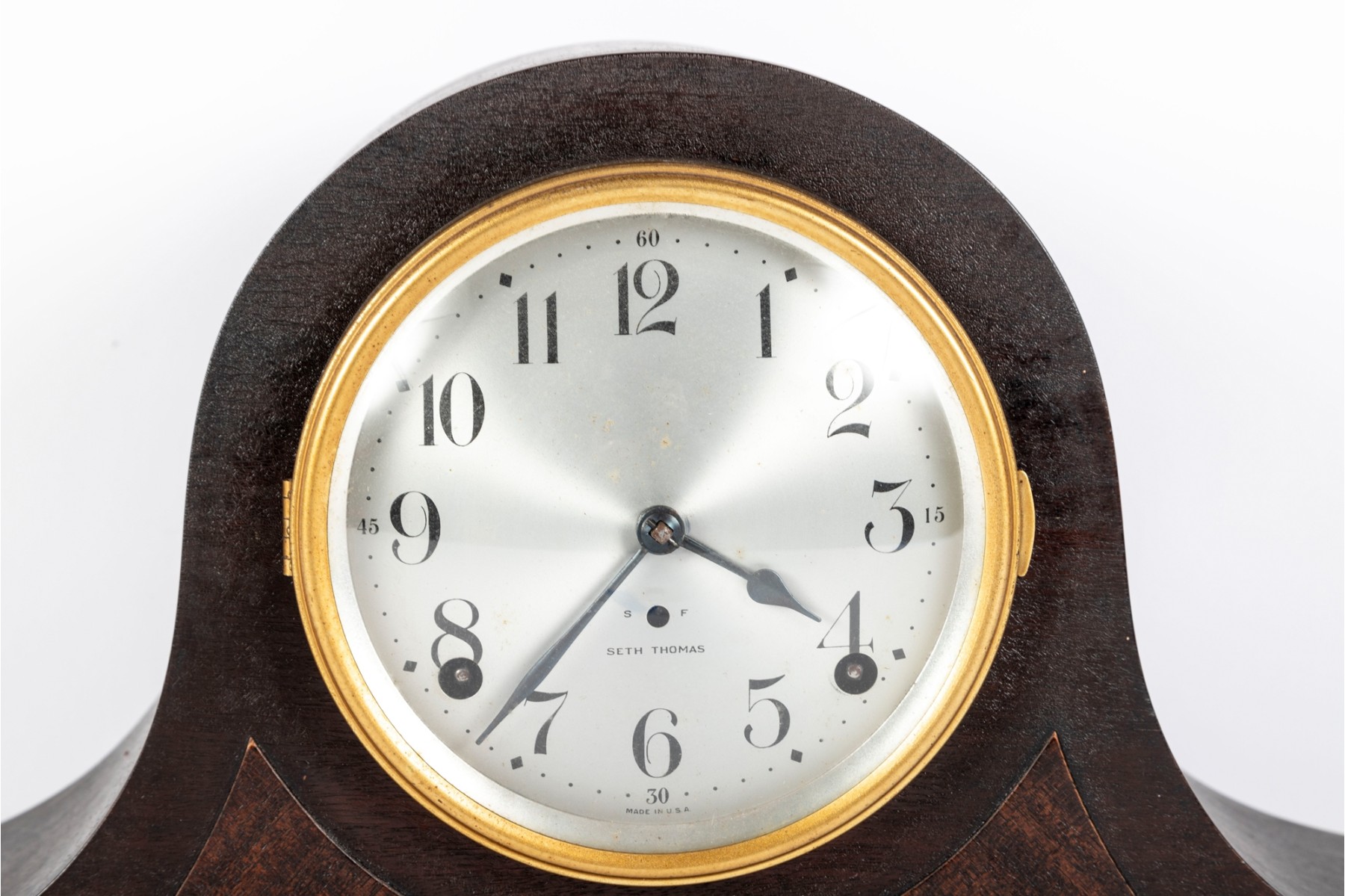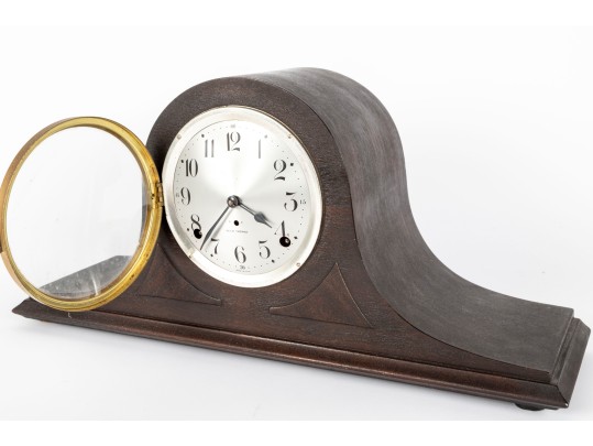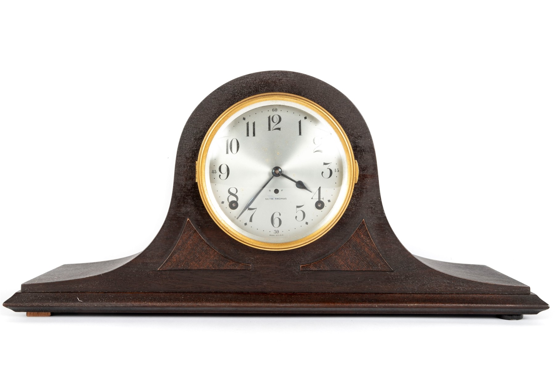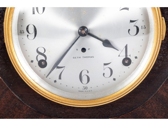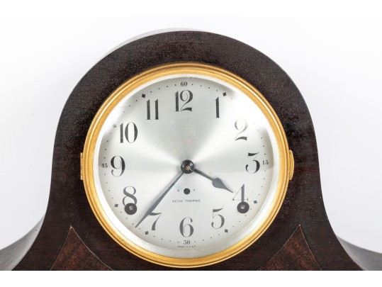 Vintage Seth Thomas Tambour 8-day mantel clock with a classic hump-back wood case design. No key included.