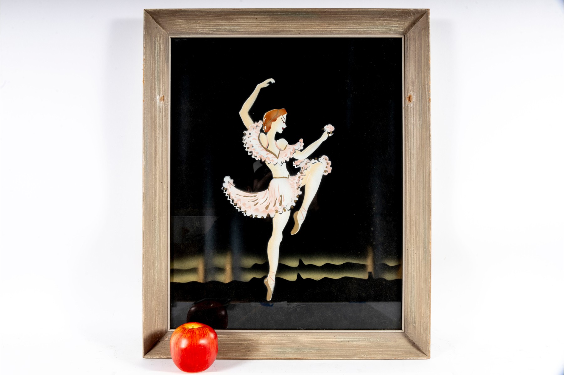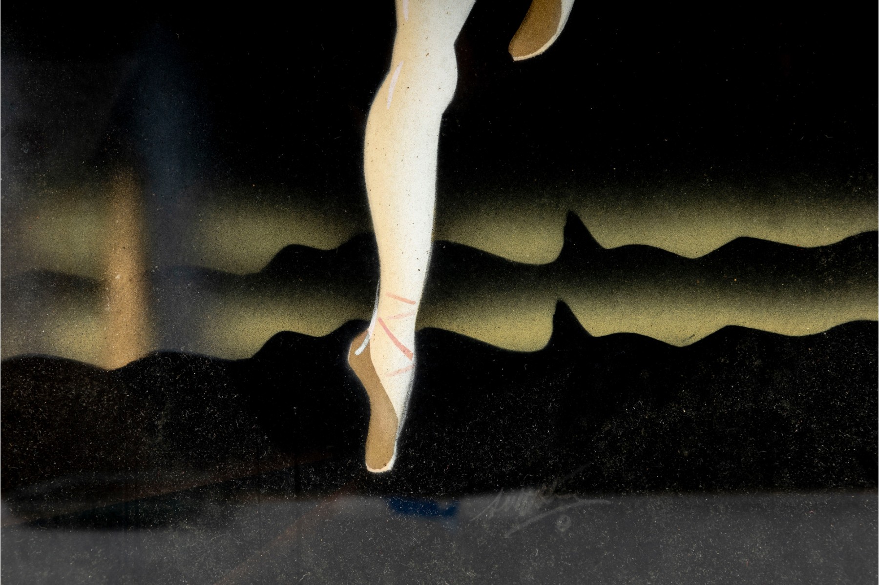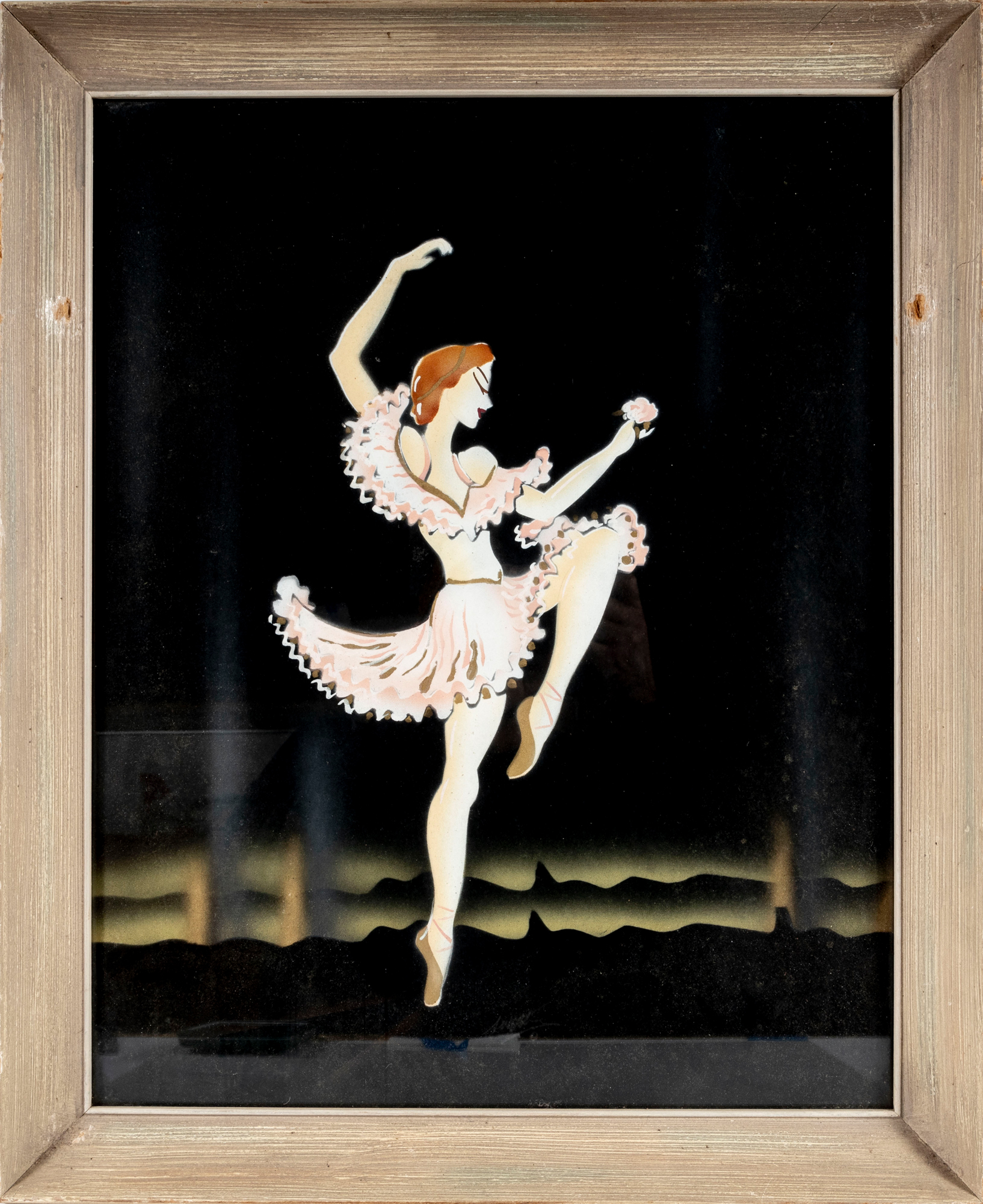 An indistinctly signed art deco ballerina painting, circa 20th century. The ballerina, poised in a fluid dance position, is rendered with clean lines and bold, stylized shapes that evoke both movement and flow. The artwork is presented in a light wood frame and faced with glass.