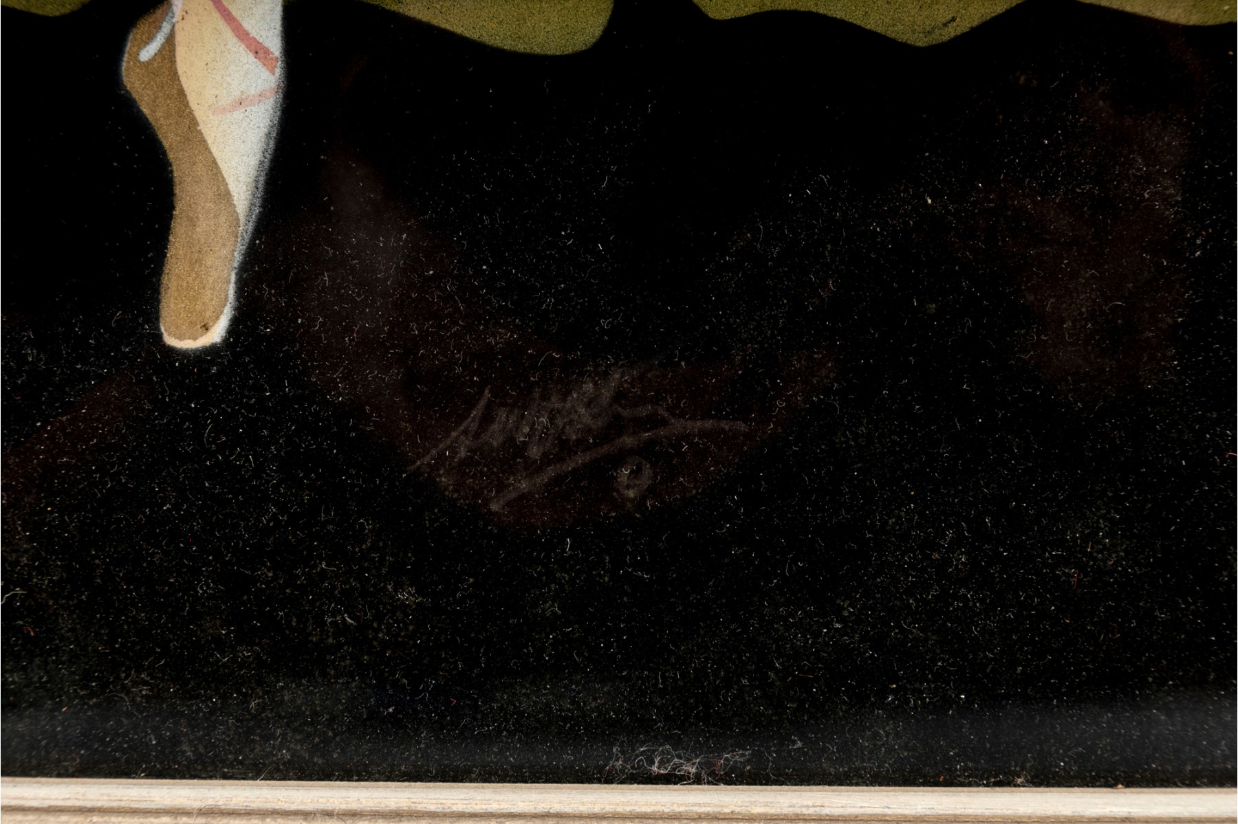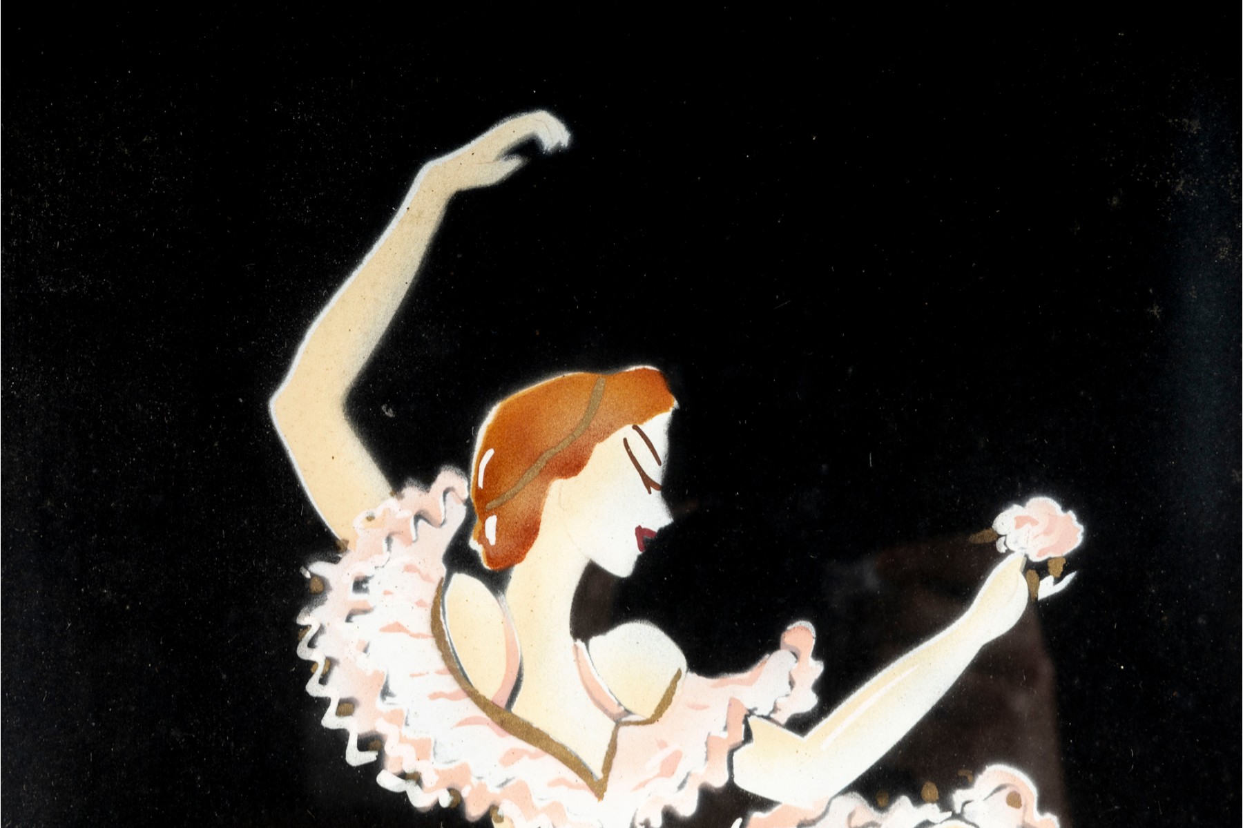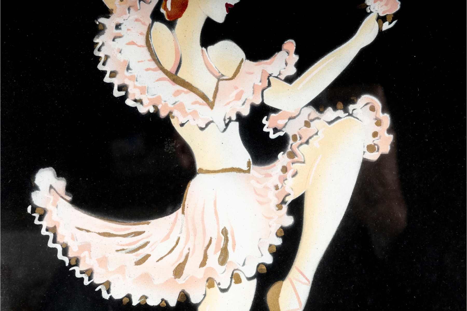 An indistinctly signed art deco ballerina painting, circa 20th century. The ballerina, poised in a fluid dance position, is rendered with clean lines and bold, stylized shapes that evoke both movement and flow. The artwork is presented in a light wood frame and faced with glass.