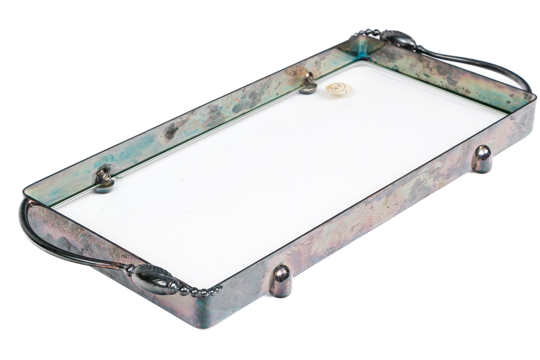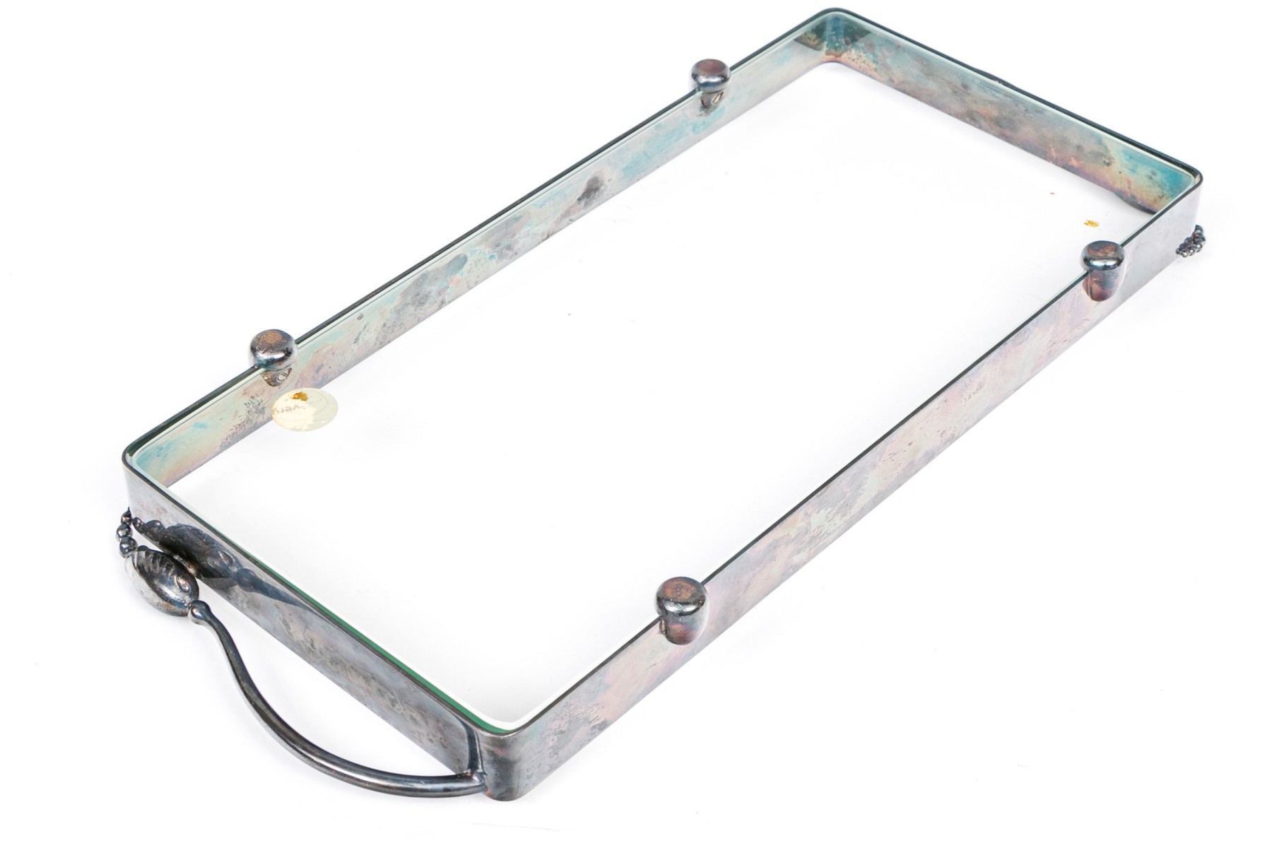 A delightful vintage serving tray exuding Danish and Art Nouveau charm, showcasing a clear glass bottom and a silverplated rectangular frame with gently rounded corners. Adorned with opposing handles detailed by textural bud and beaded ends, and raised with stylish bumpers along the sides over rounded feet.